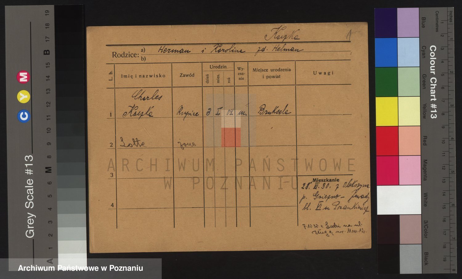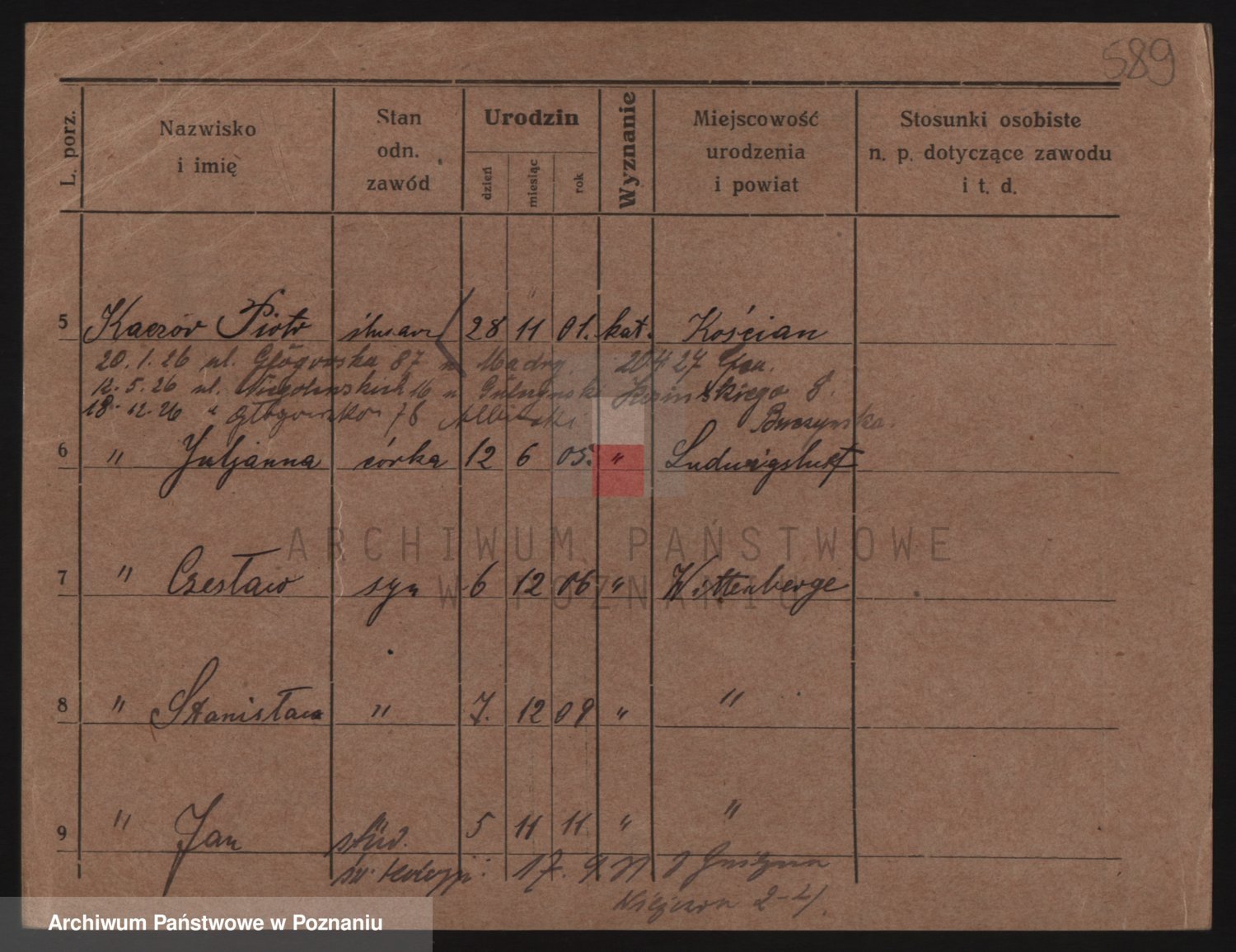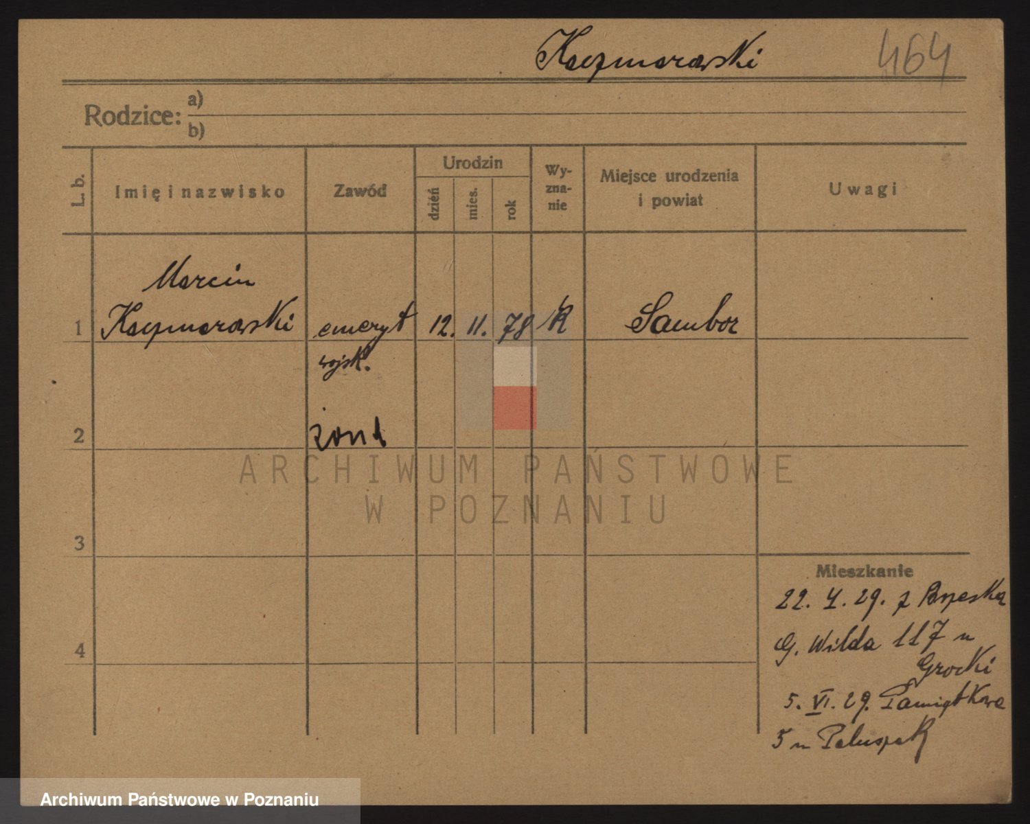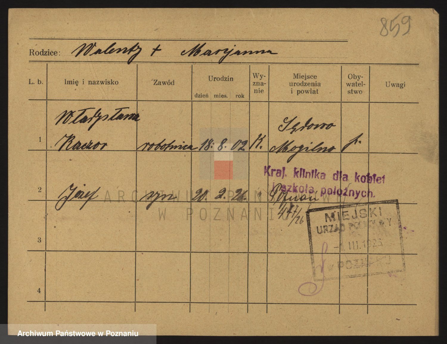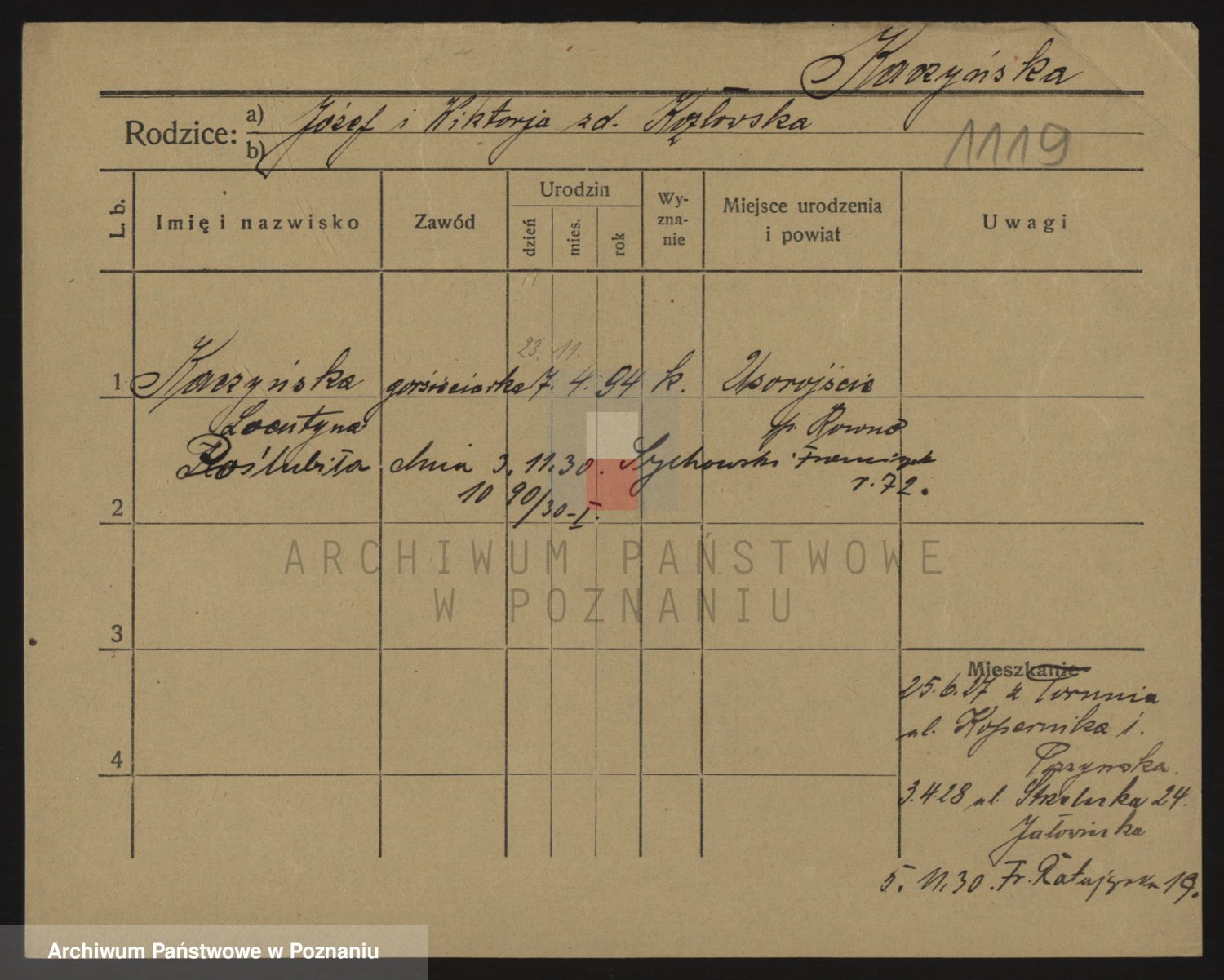 Podgląd karty osobowej dostępny jest po kliknięciu na nazwisko lub ikonkę karty. Można dokonywać powiększenia (ikony na górze) lub przechodzić między kolejnymi skanami (strzałki po bokach).