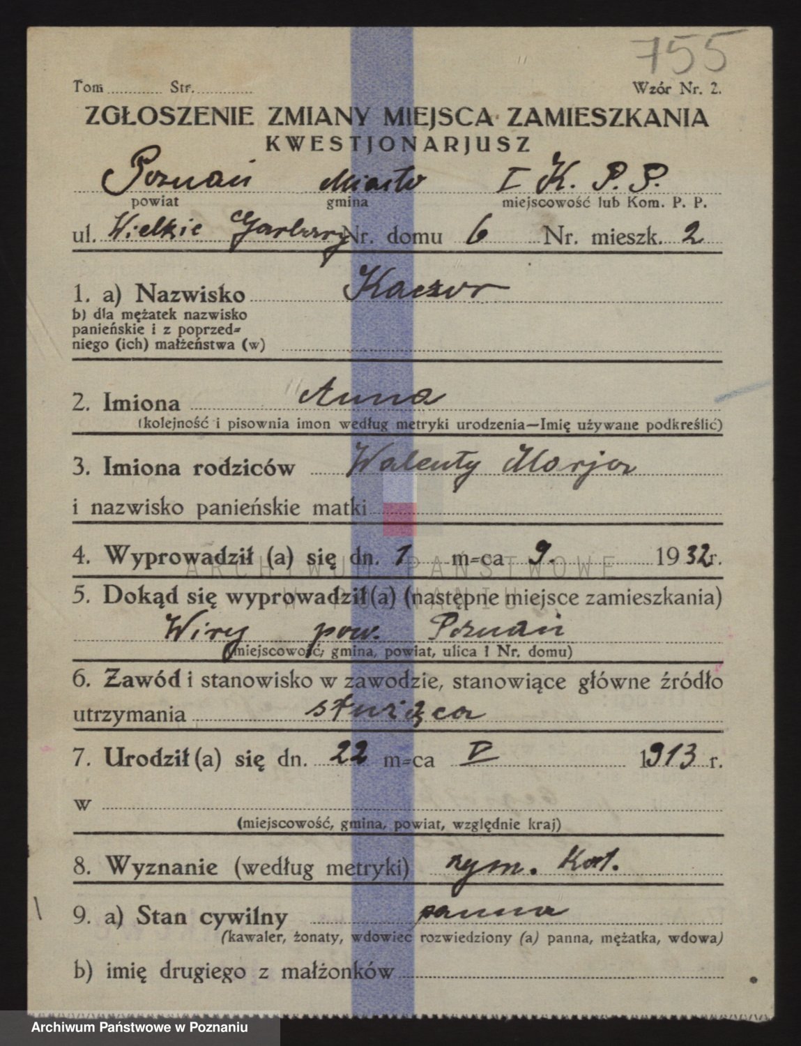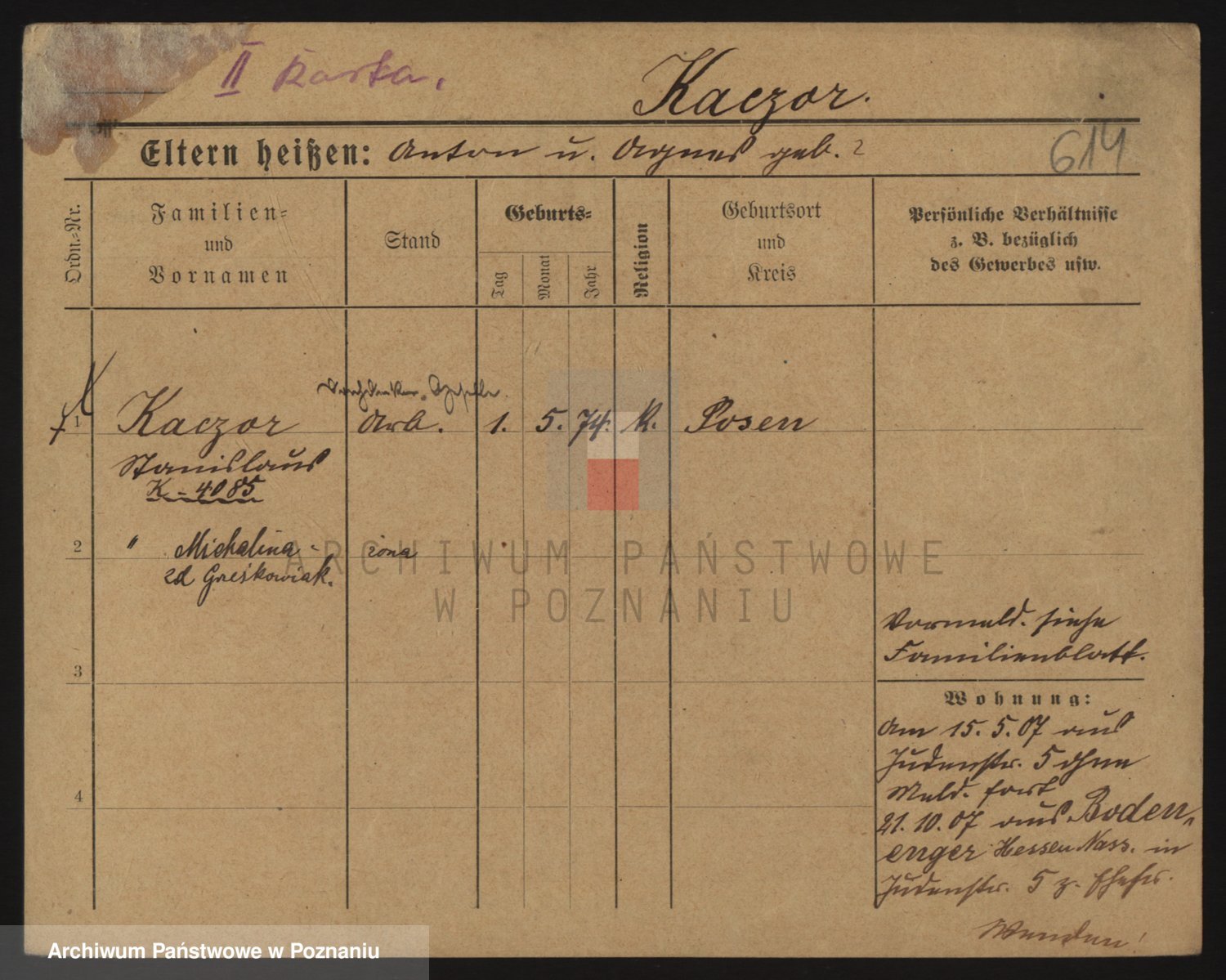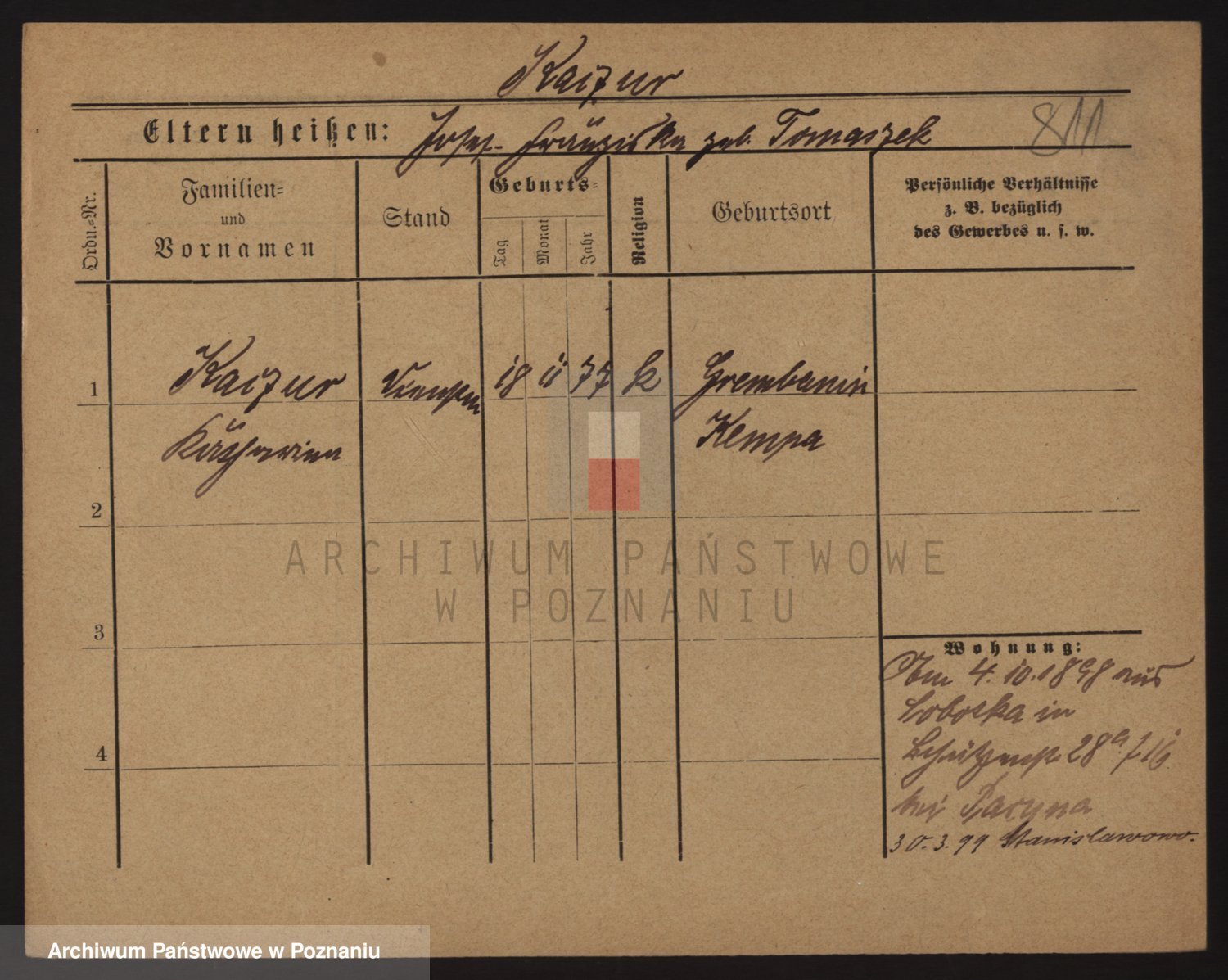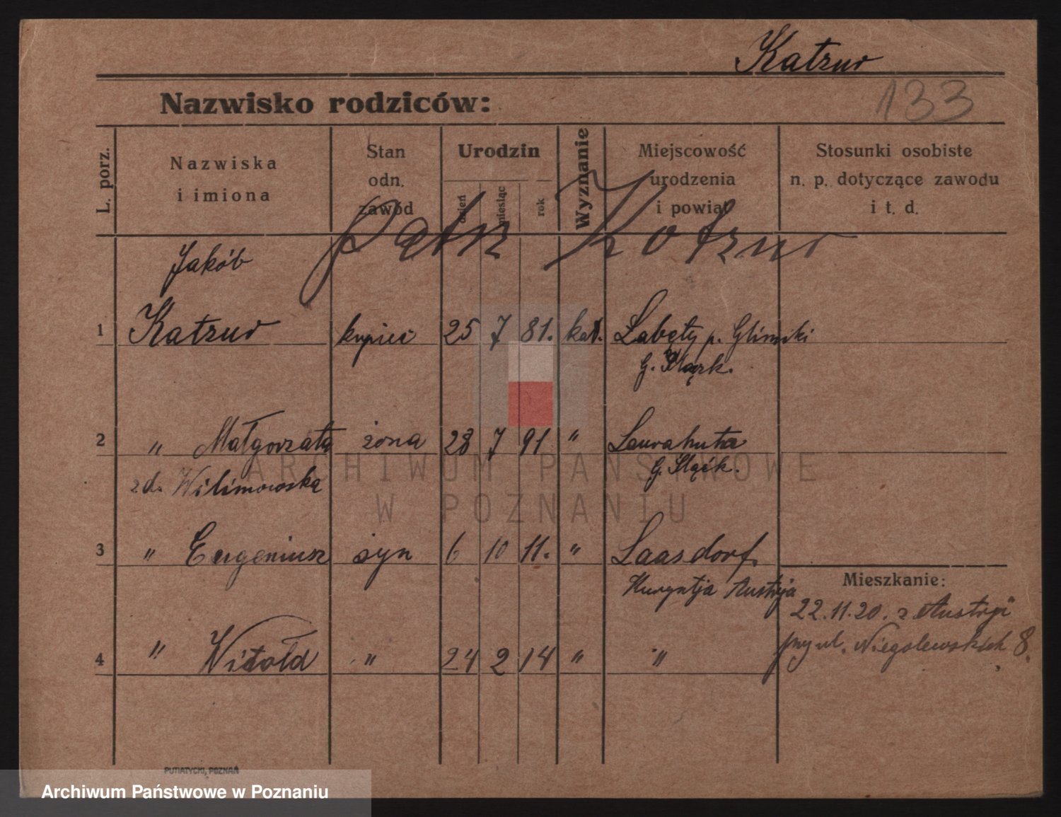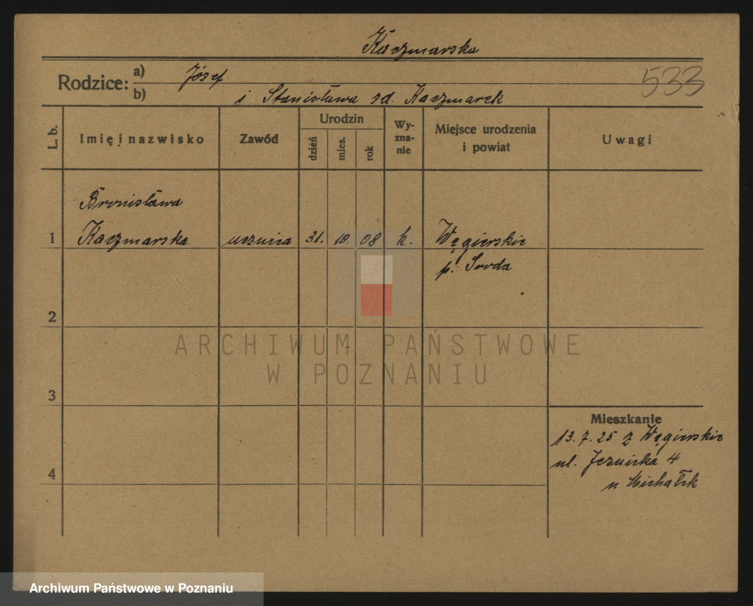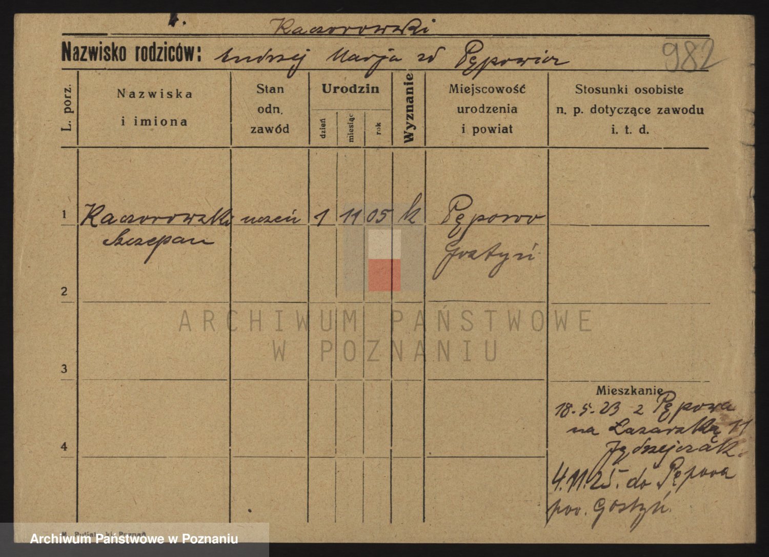 Podgląd karty osobowej dostępny jest po kliknięciu na nazwisko lub ikonkę karty. Można dokonywać powiększenia (ikony na górze) lub przechodzić między kolejnymi skanami (strzałki po bokach).