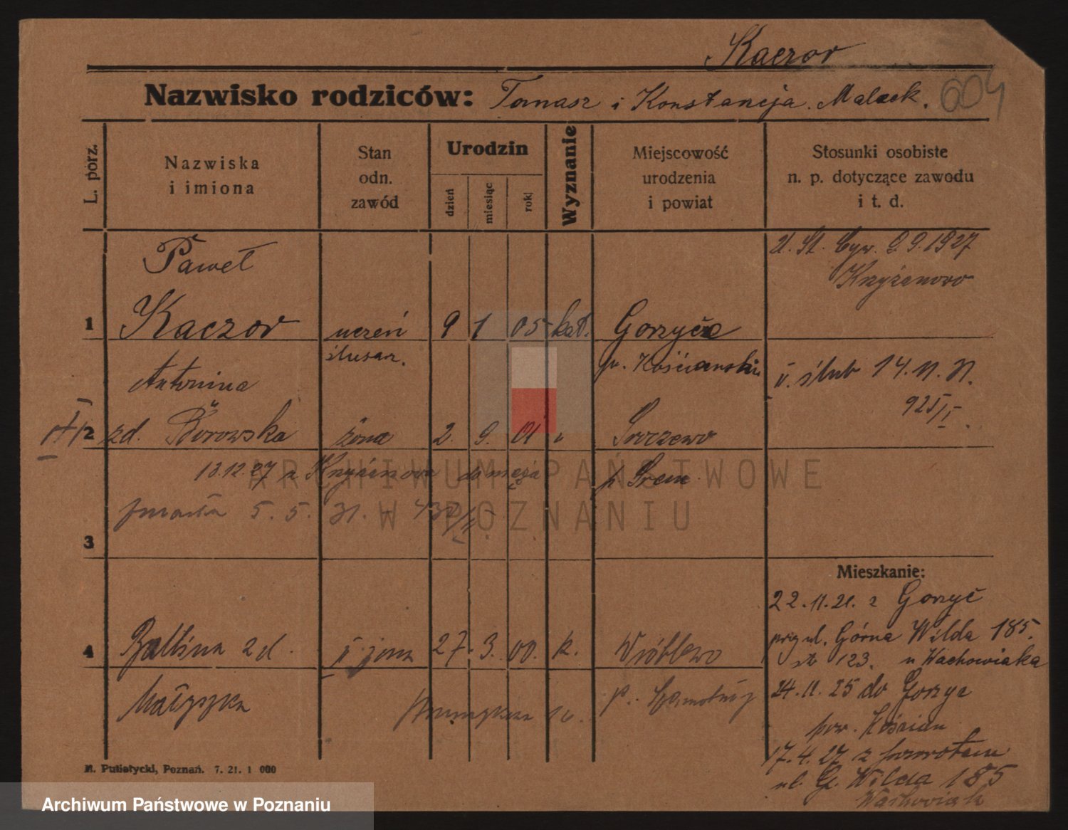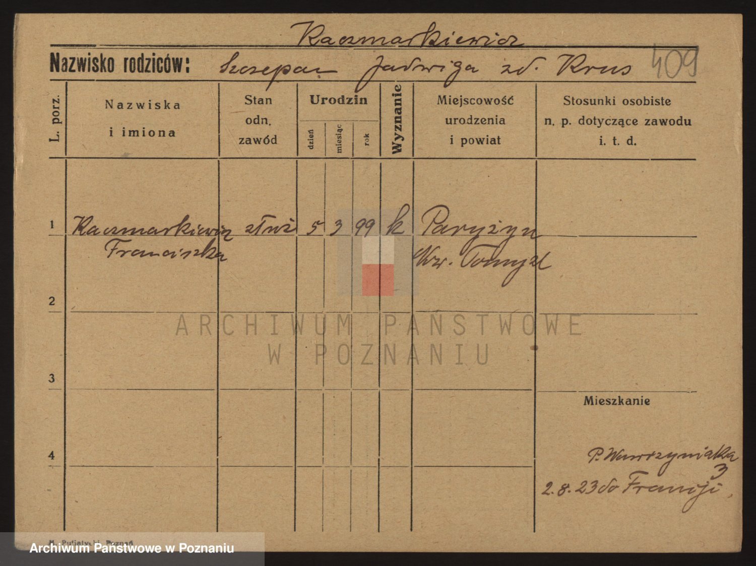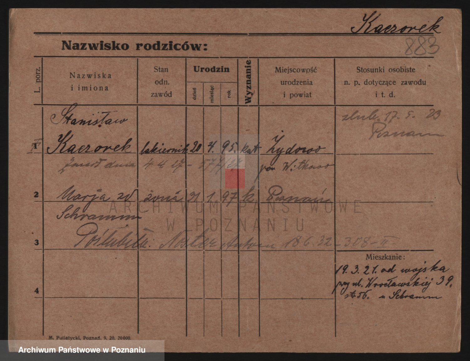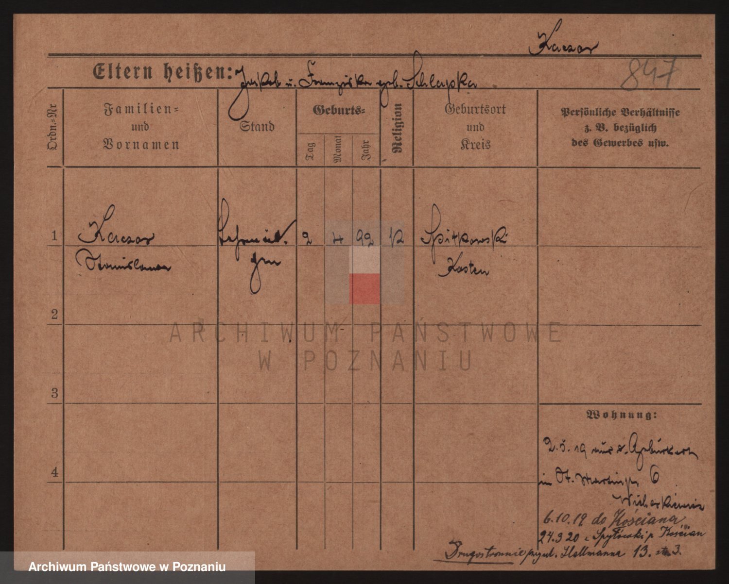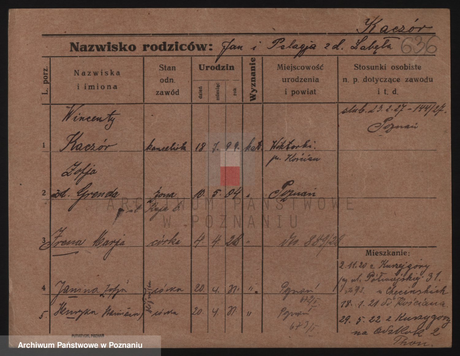 Podgląd karty osobowej dostępny jest po kliknięciu na nazwisko lub ikonkę karty. Można dokonywać powiększenia (ikony na górze) lub przechodzić między kolejnymi skanami (strzałki po bokach).