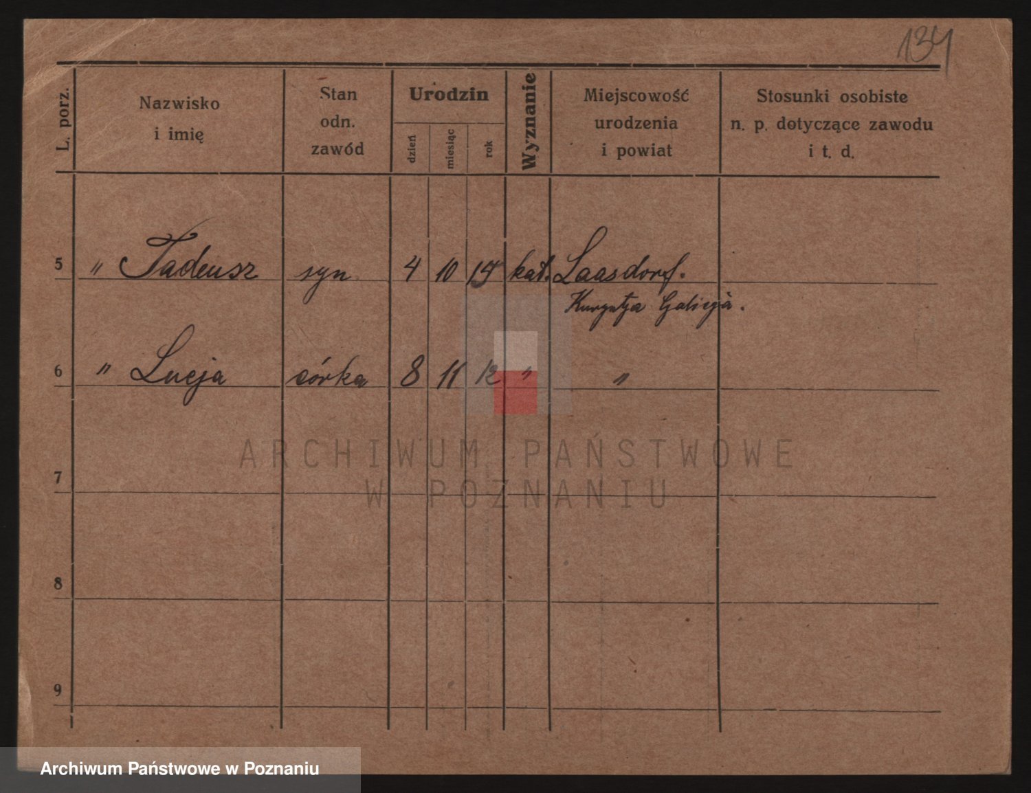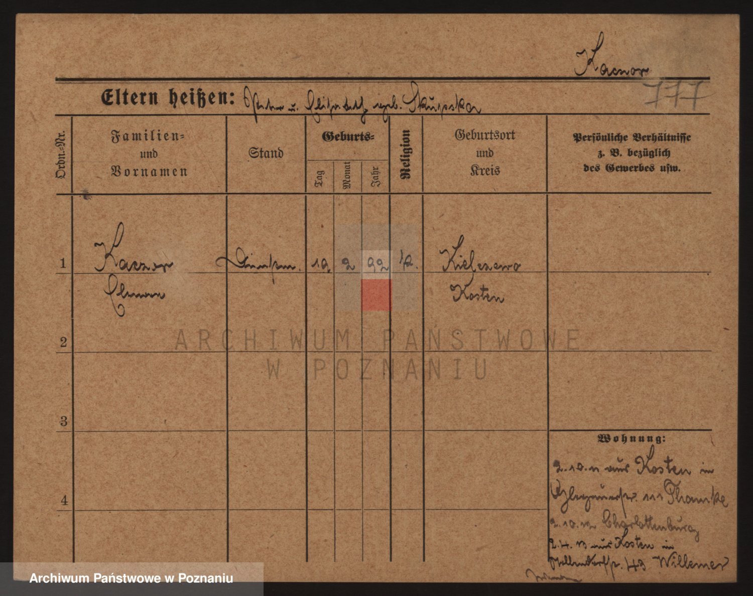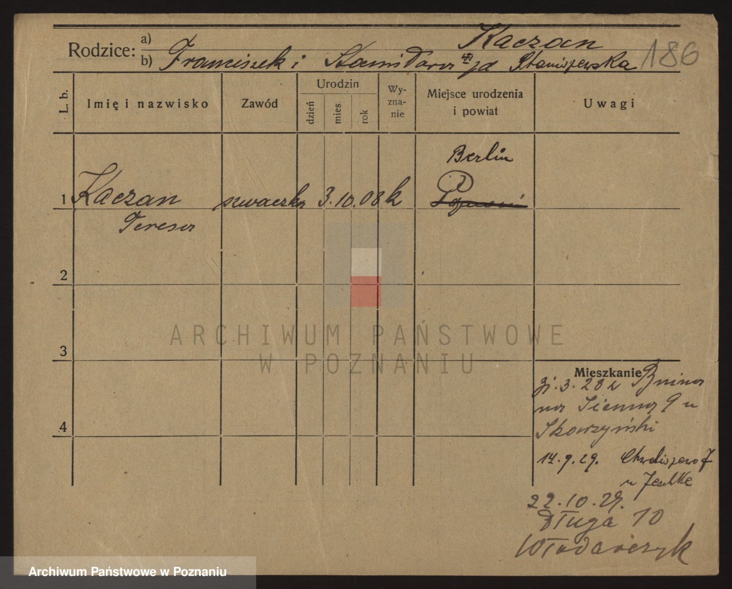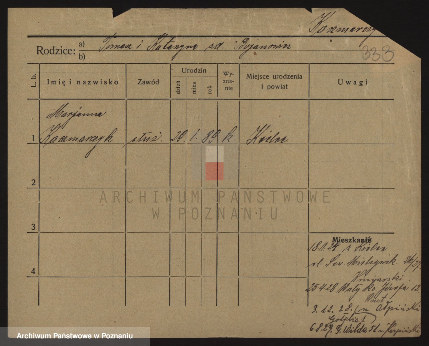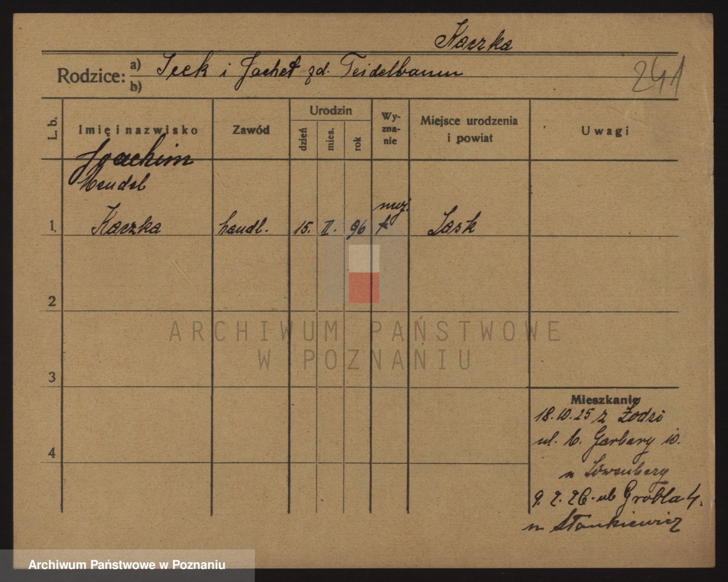 Podgląd karty osobowej dostępny jest po kliknięciu na nazwisko lub ikonkę karty. Można dokonywać powiększenia (ikony na górze) lub przechodzić między kolejnymi skanami (strzałki po bokach).