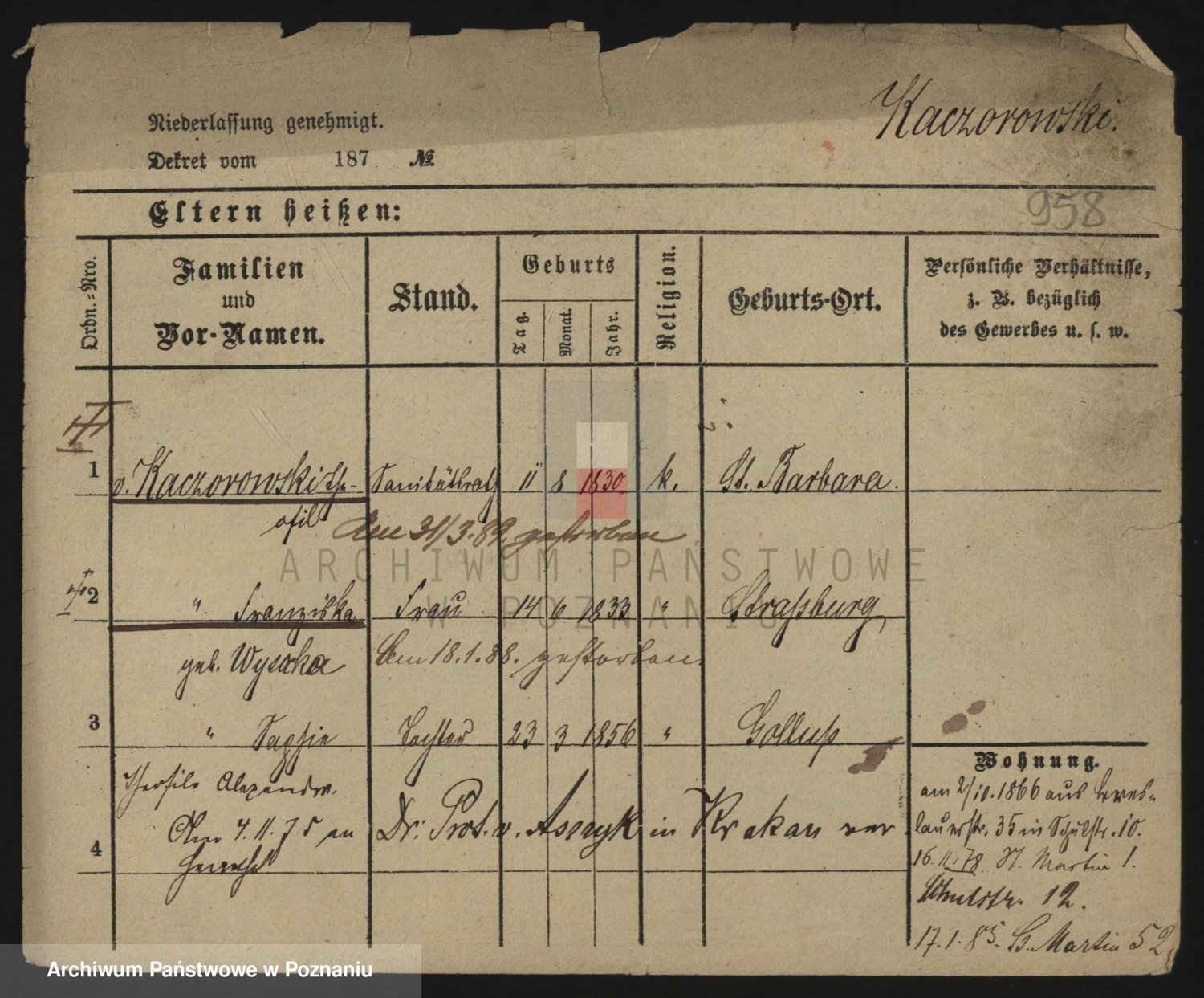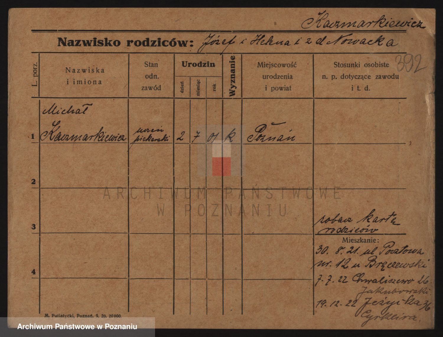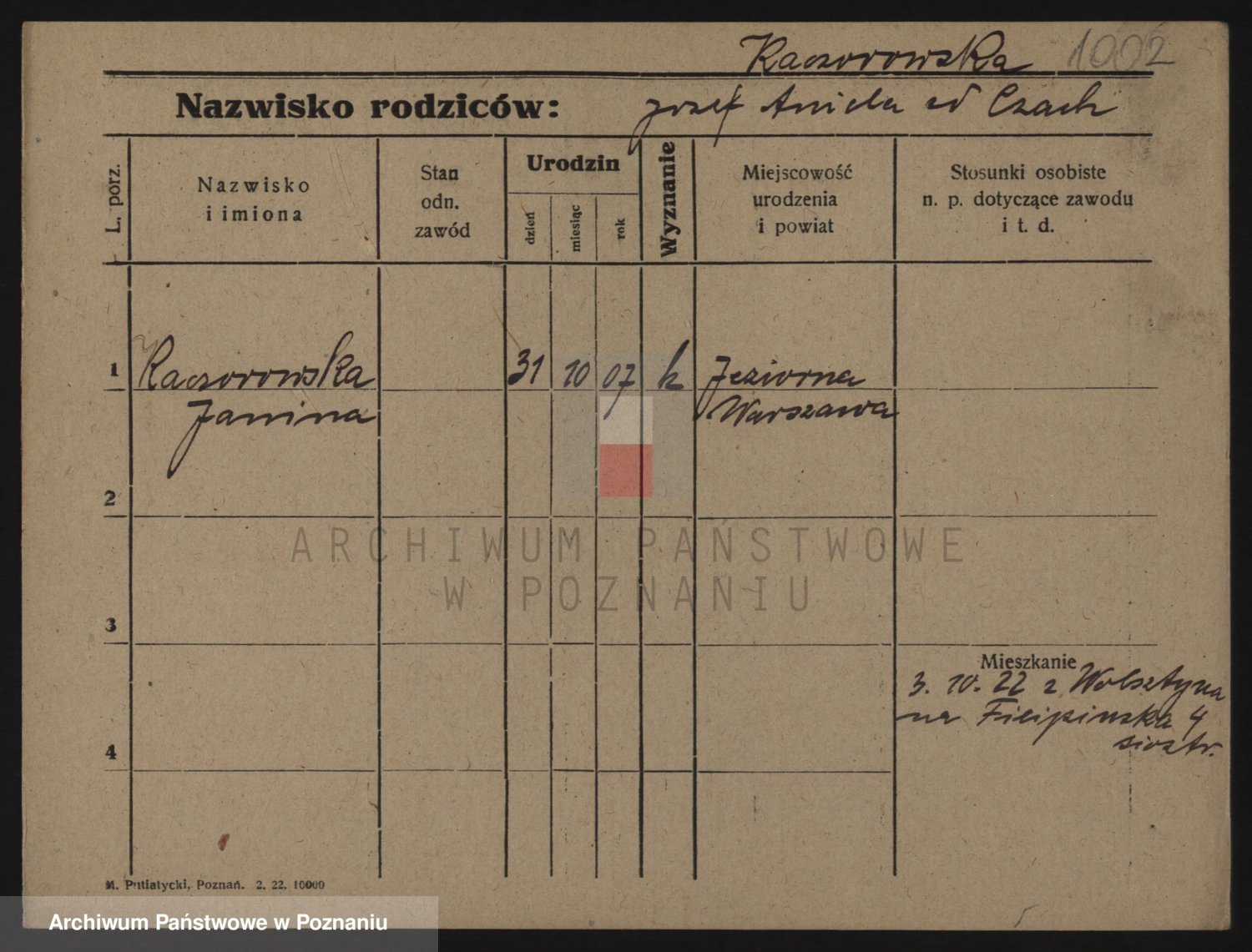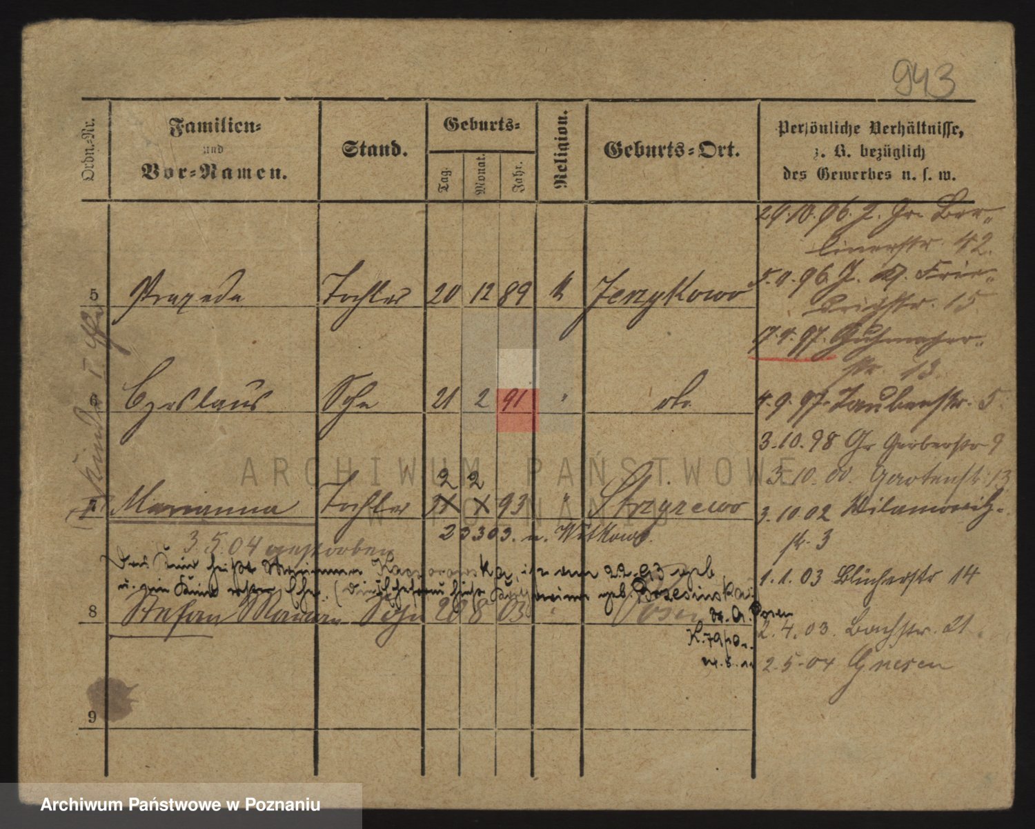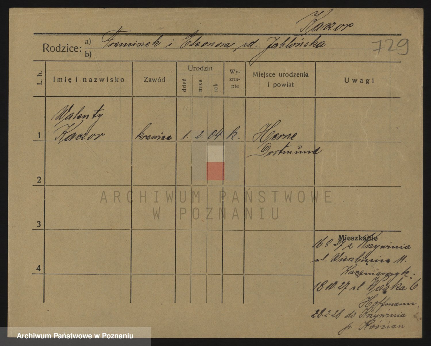 Podgląd karty osobowej dostępny jest po kliknięciu na nazwisko lub ikonkę karty. Można dokonywać powiększenia (ikony na górze) lub przechodzić między kolejnymi skanami (strzałki po bokach).
