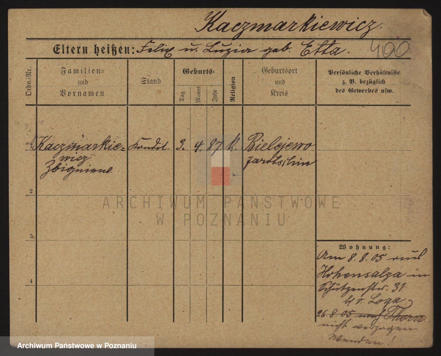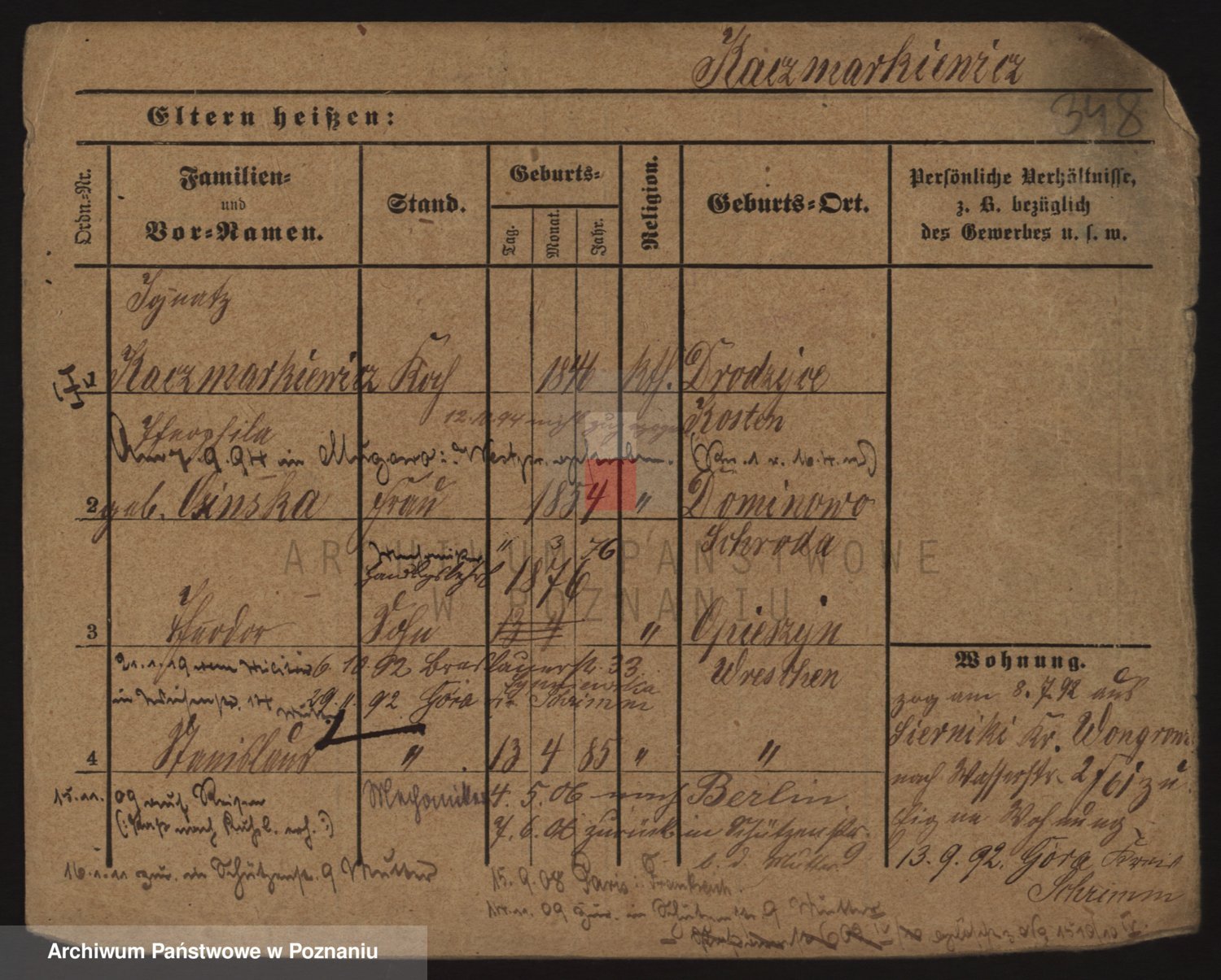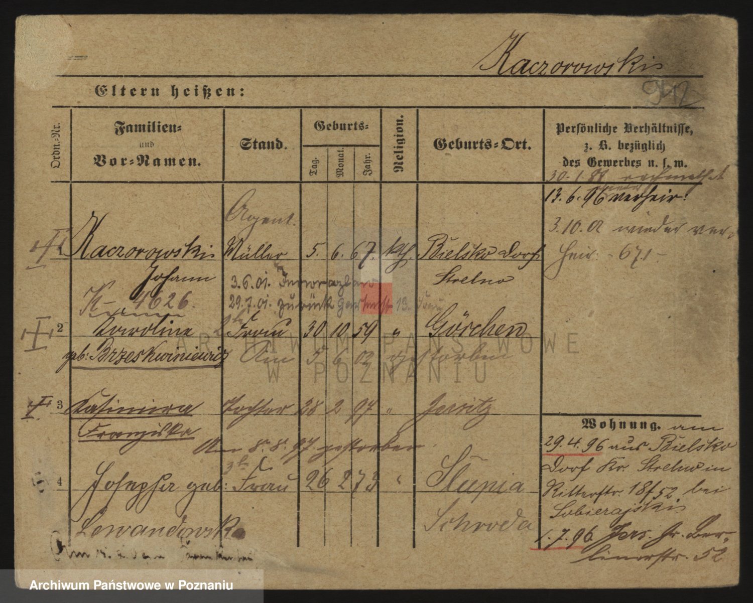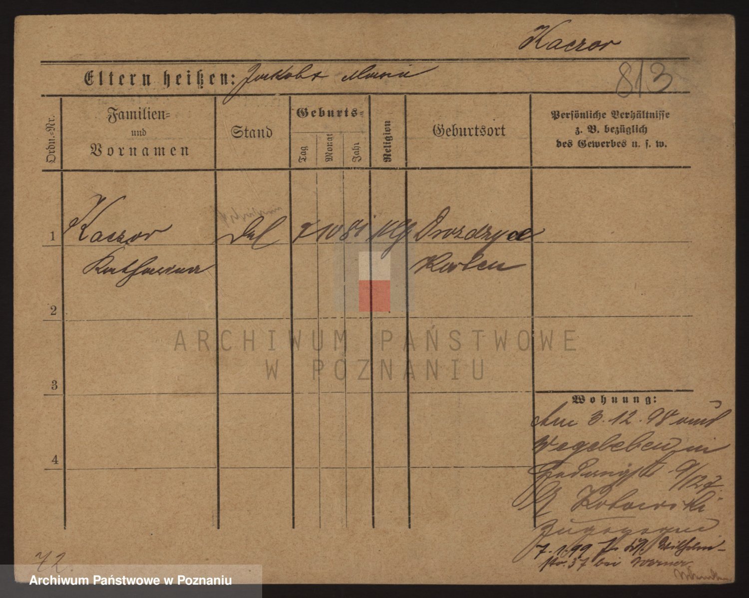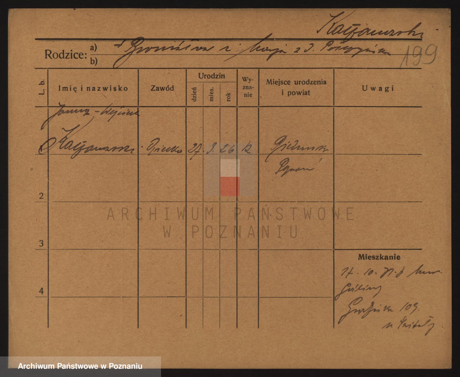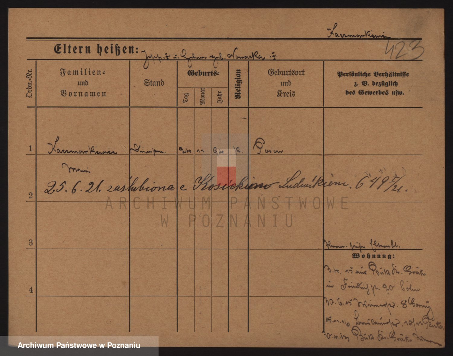 Podgląd karty osobowej dostępny jest po kliknięciu na nazwisko lub ikonkę karty. Można dokonywać powiększenia (ikony na górze) lub przechodzić między kolejnymi skanami (strzałki po bokach).