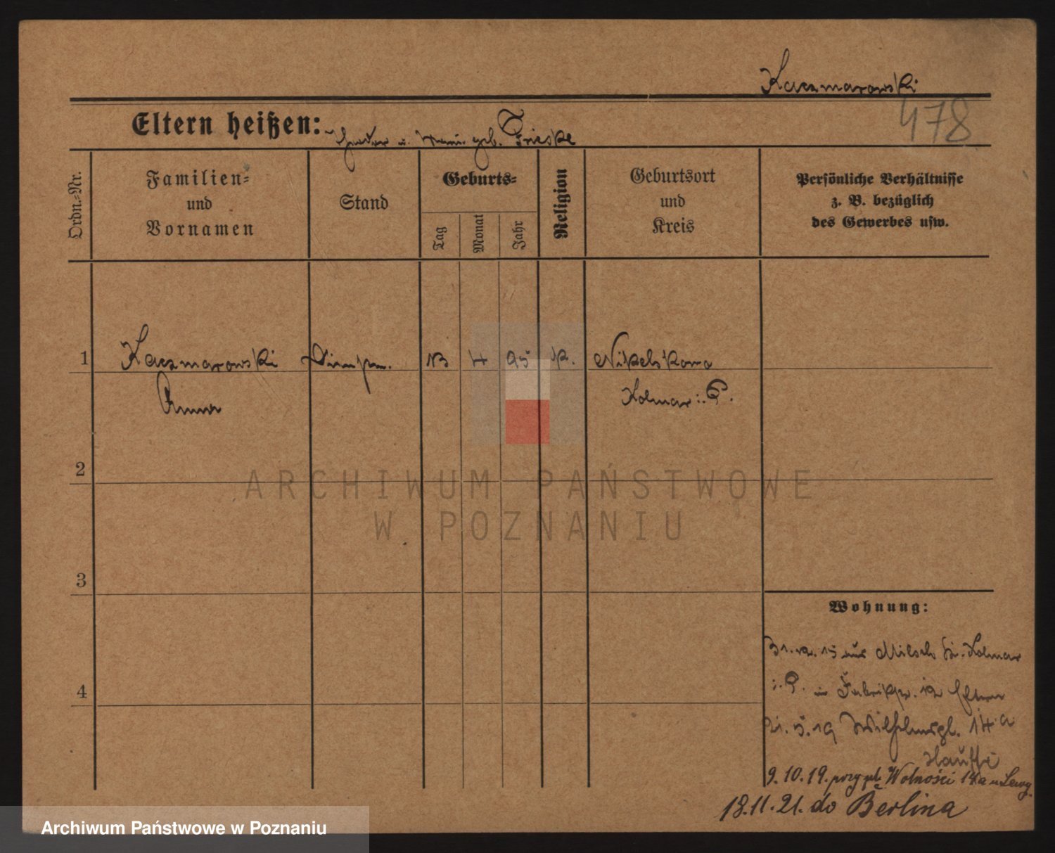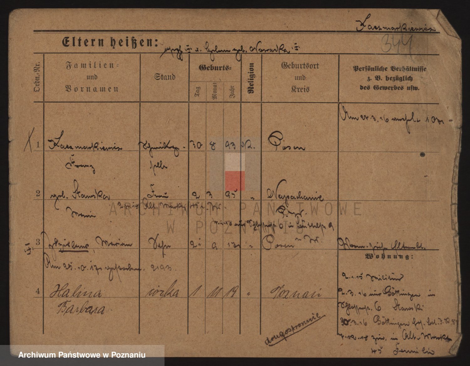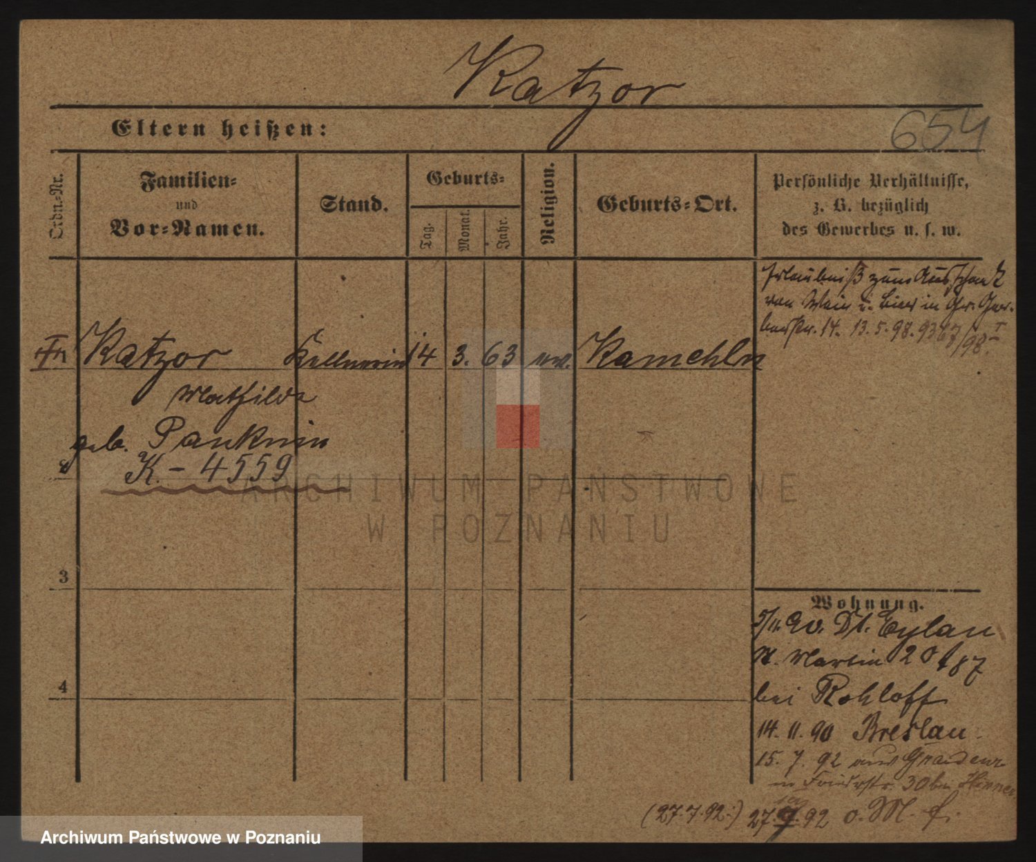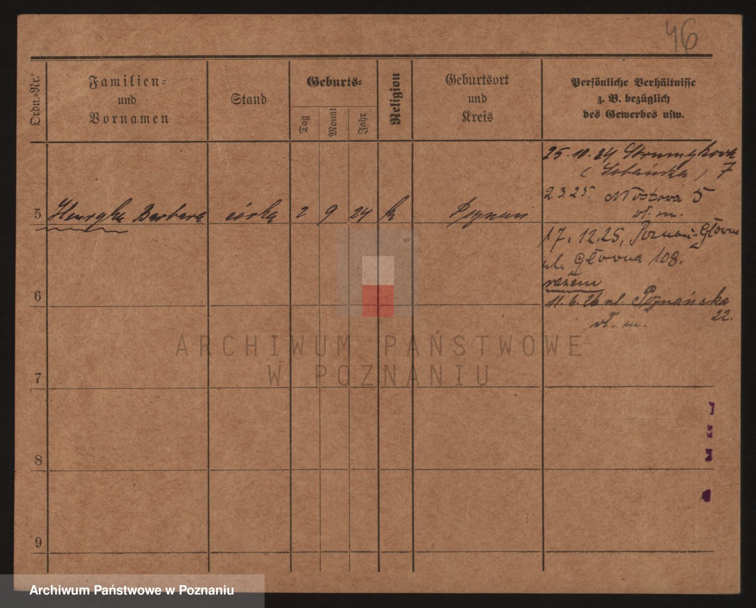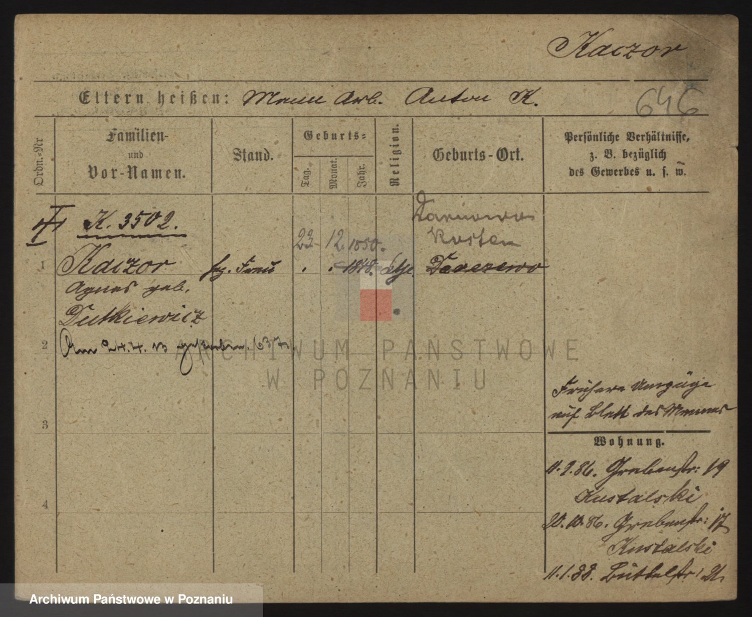 Podgląd karty osobowej dostępny jest po kliknięciu na nazwisko lub ikonkę karty. Można dokonywać powiększenia (ikony na górze) lub przechodzić między kolejnymi skanami (strzałki po bokach).