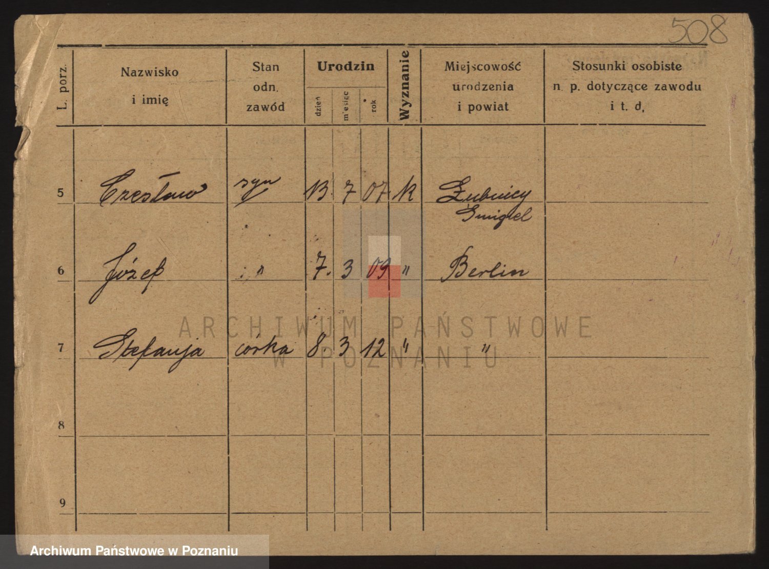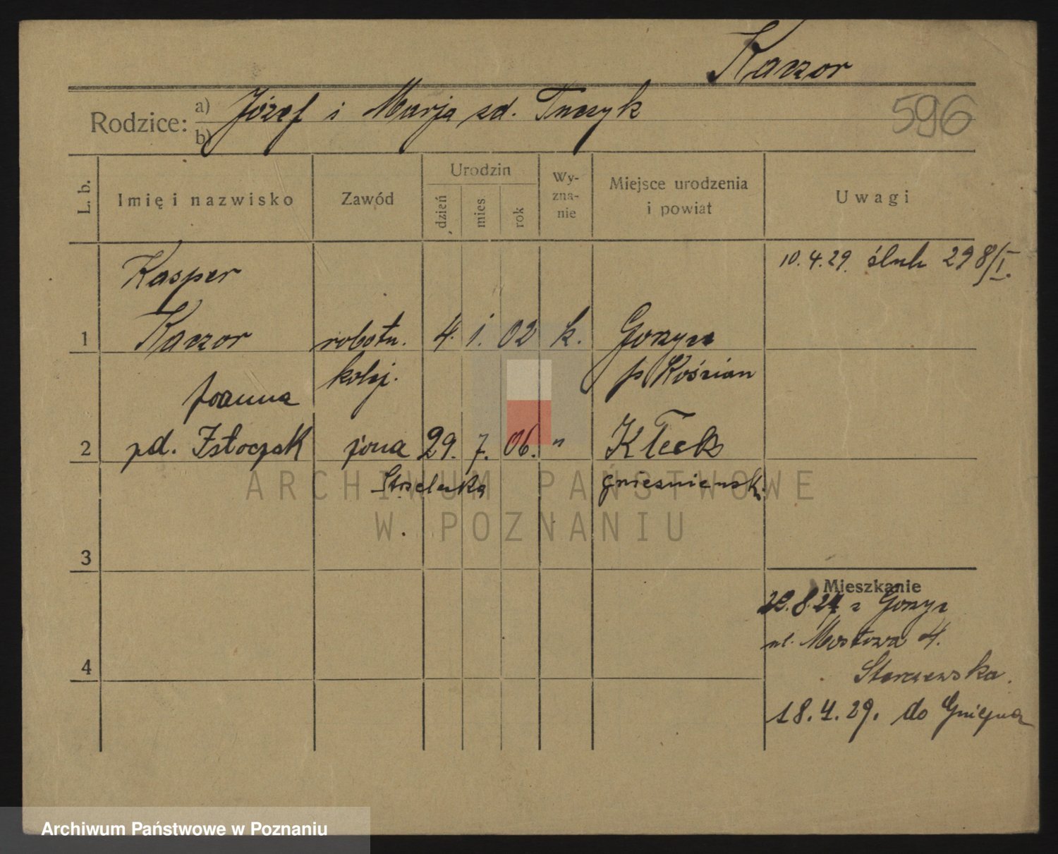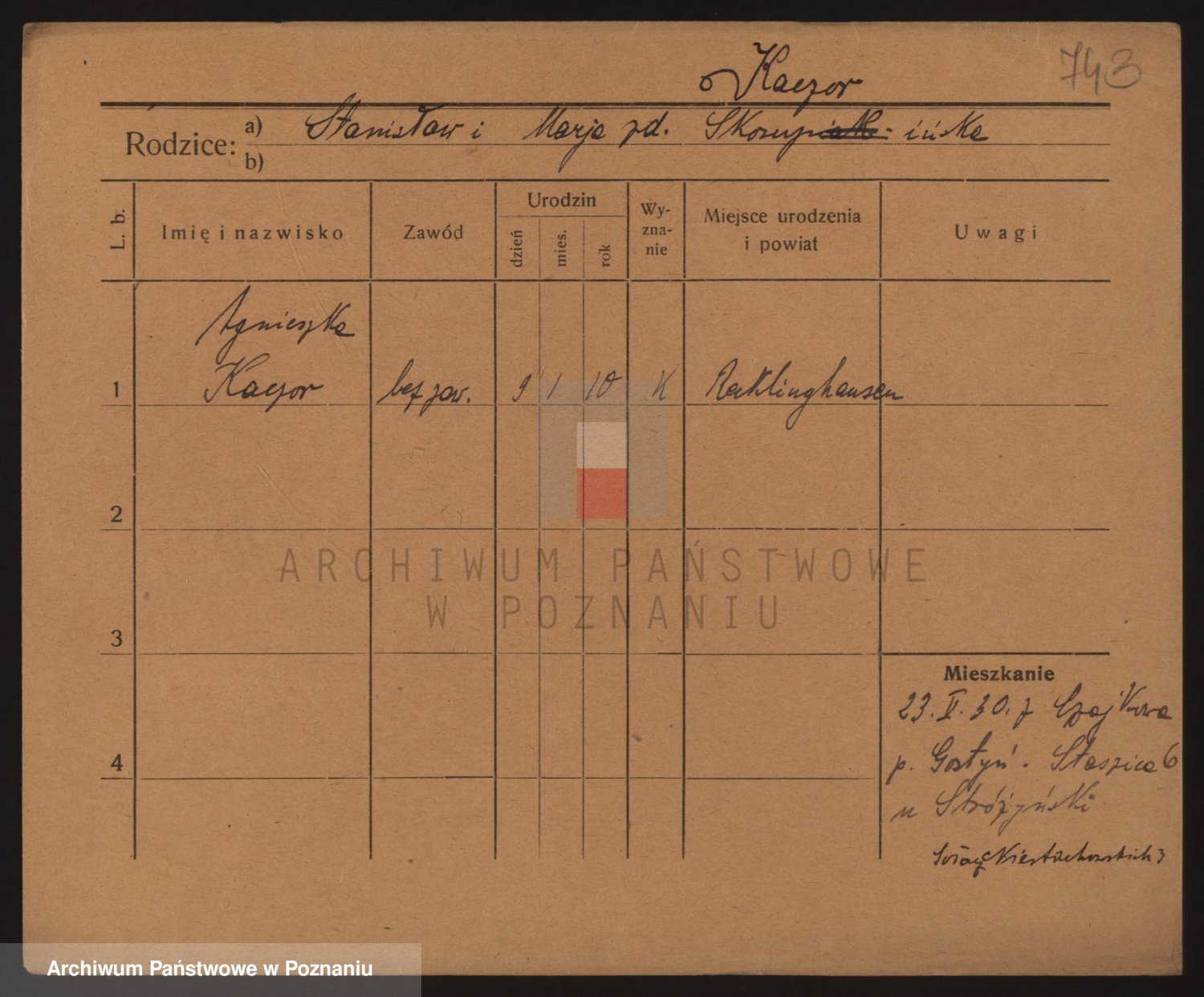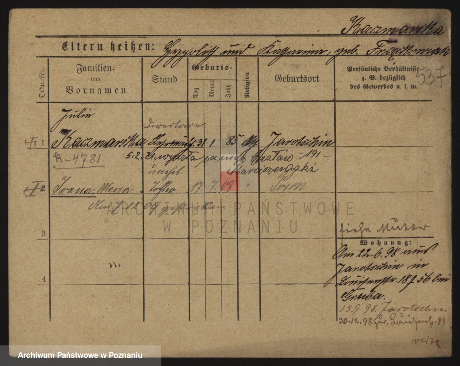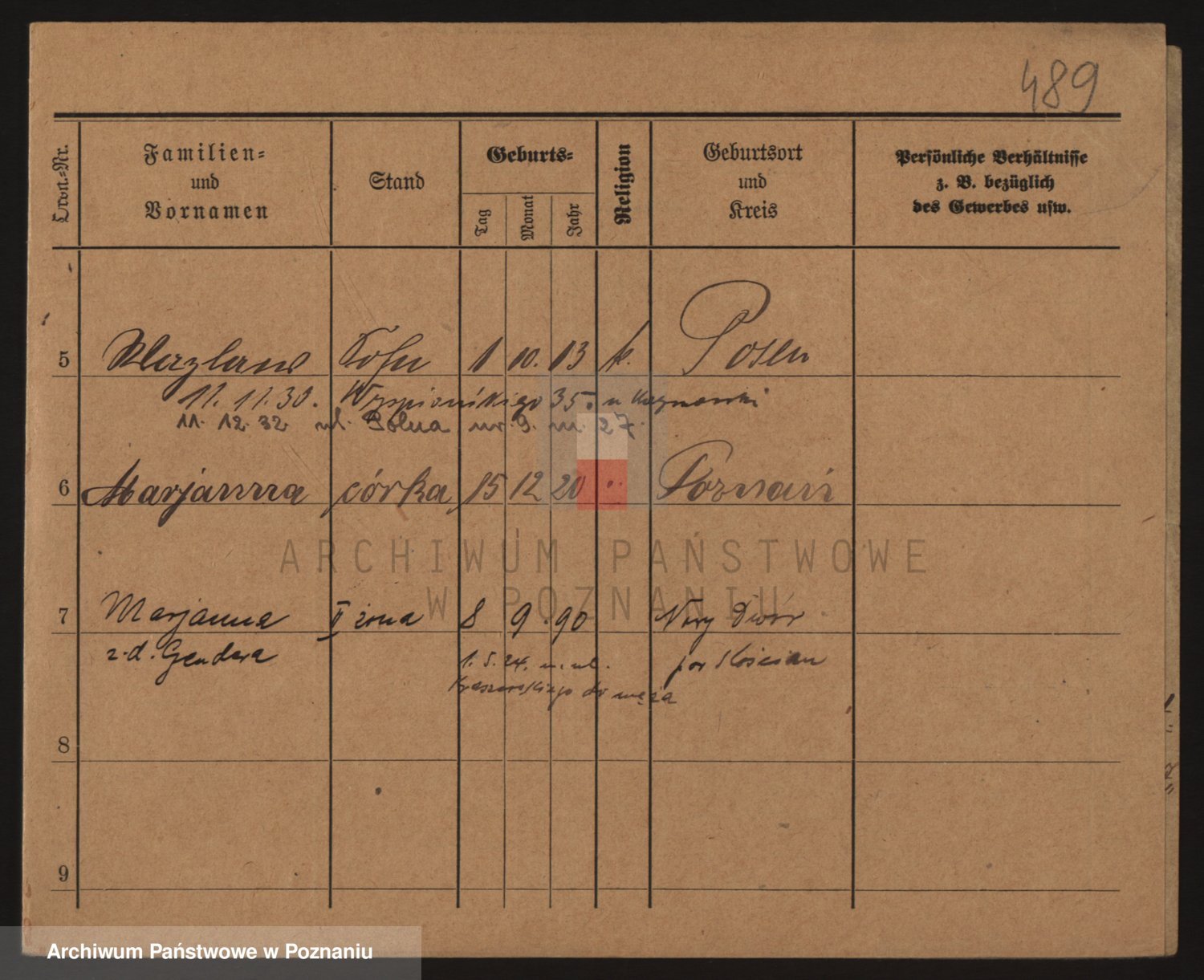 Podgląd karty osobowej dostępny jest po kliknięciu na nazwisko lub ikonkę karty. Można dokonywać powiększenia (ikony na górze) lub przechodzić między kolejnymi skanami (strzałki po bokach).
