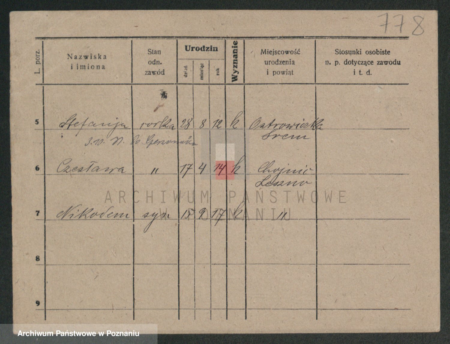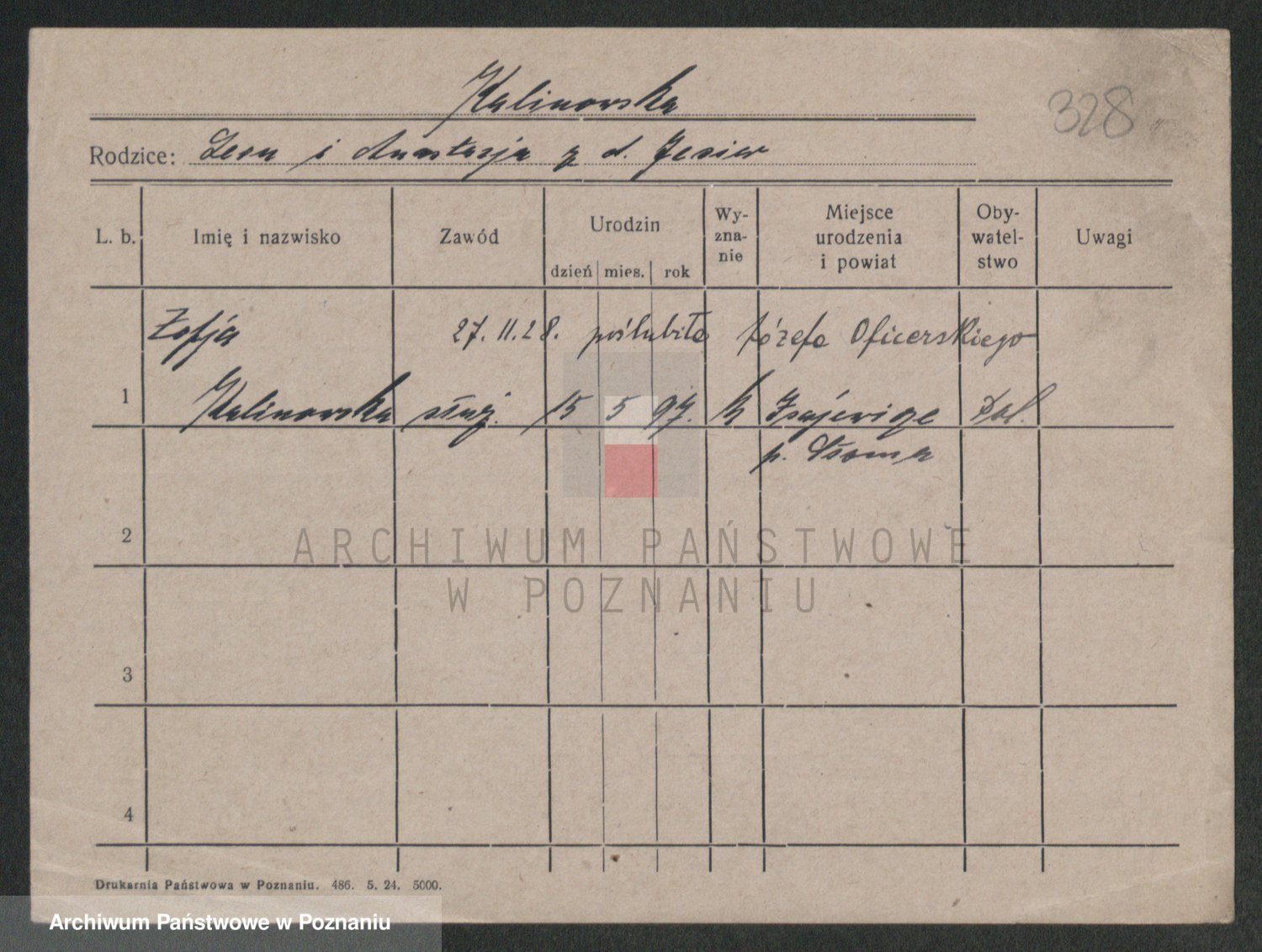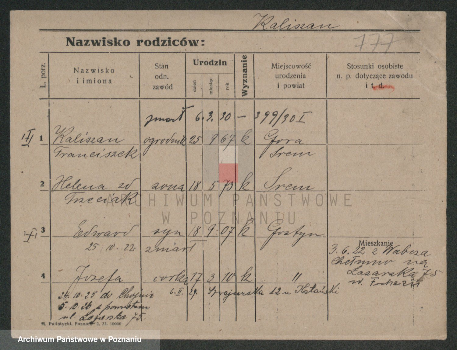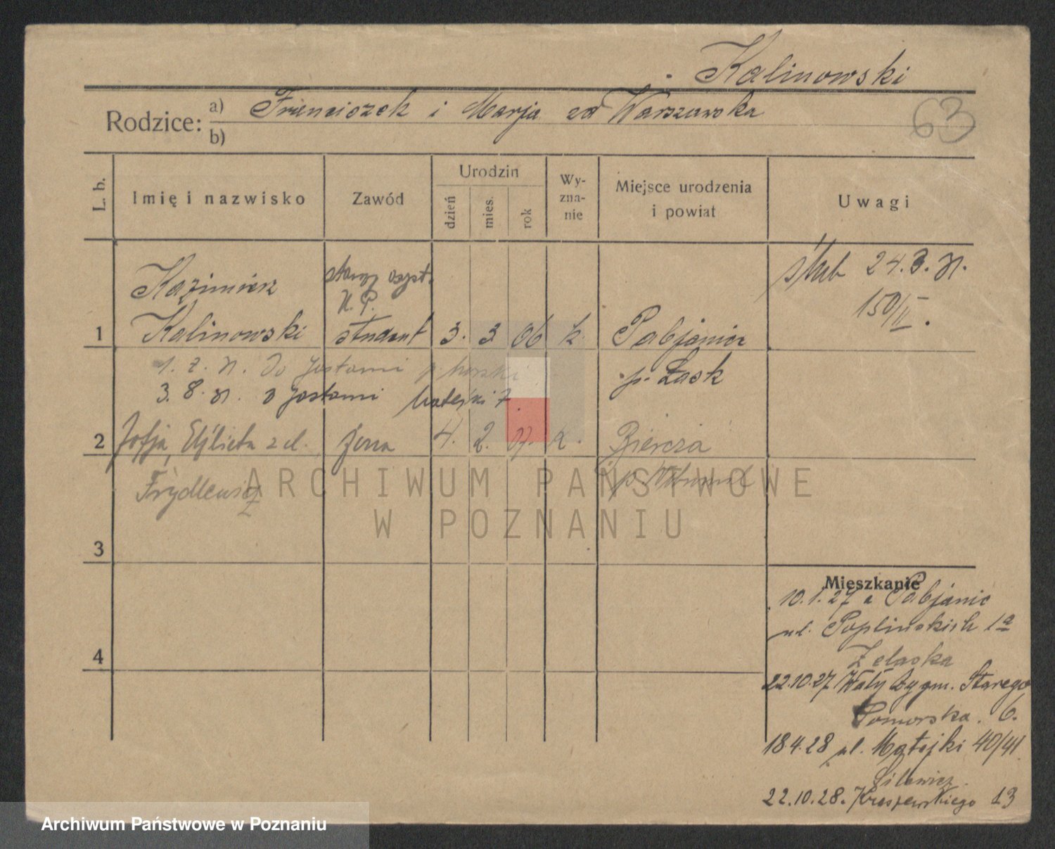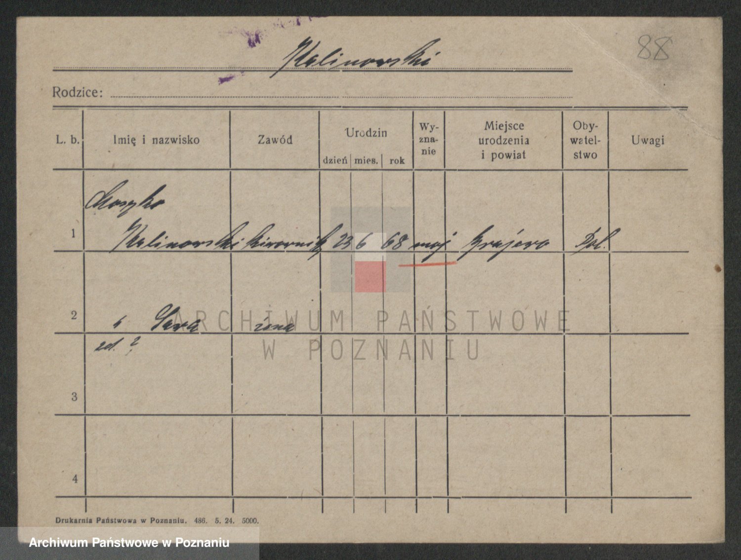 Podgląd karty osobowej dostępny jest po kliknięciu na nazwisko lub ikonkę karty. Można dokonywać powiększenia (ikony na górze) lub przechodzić między kolejnymi skanami (strzałki po bokach).