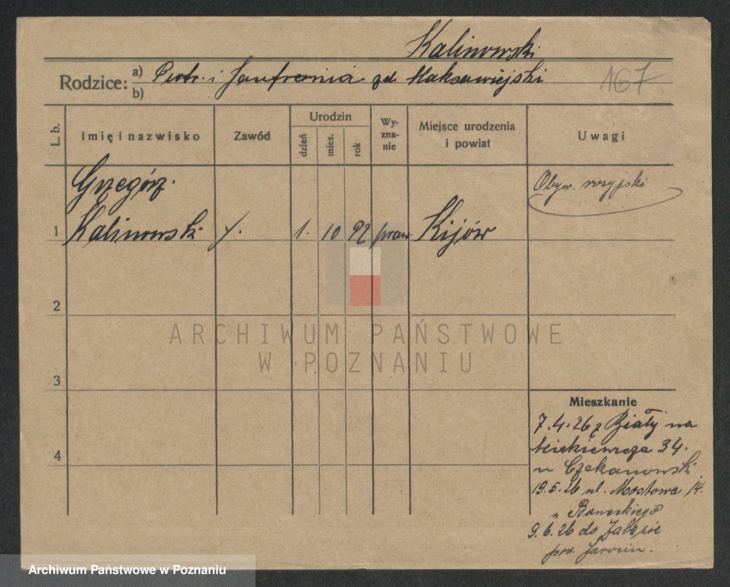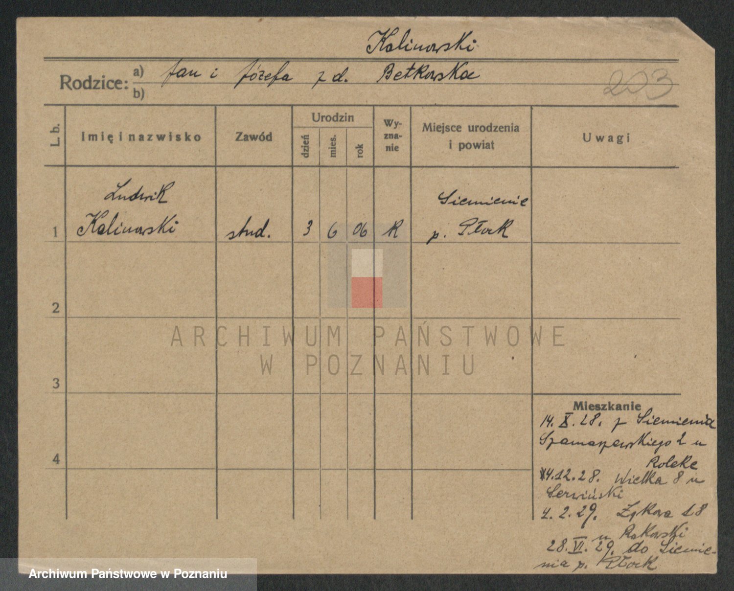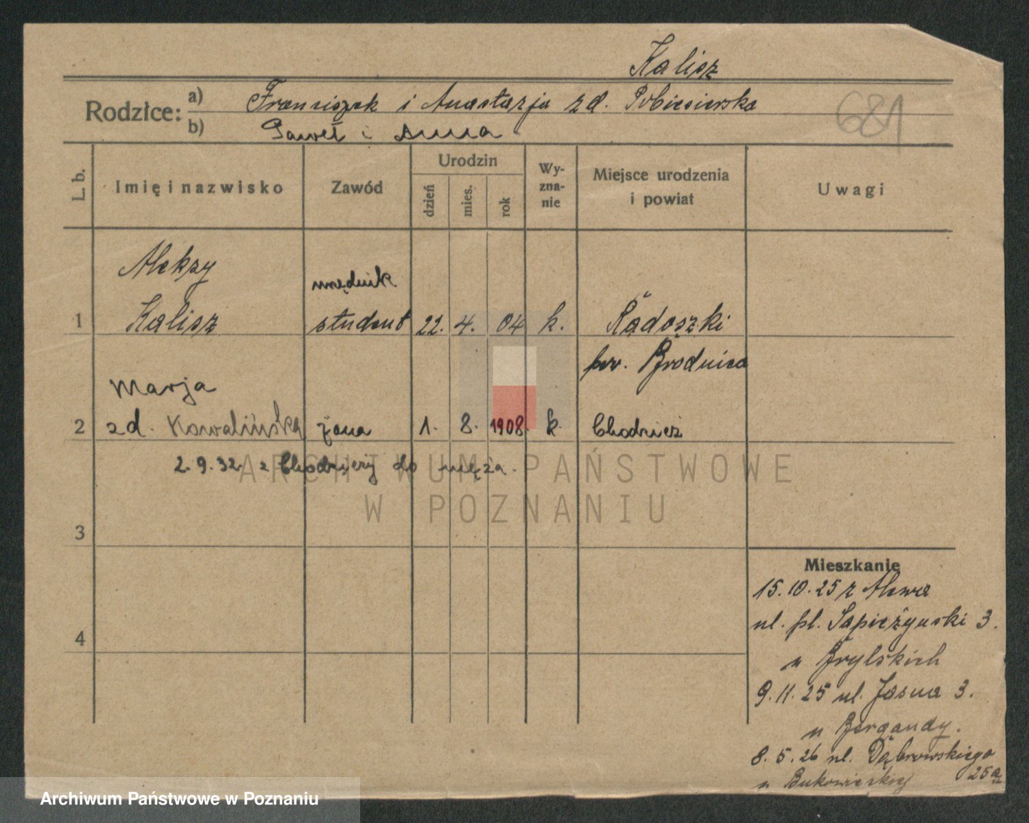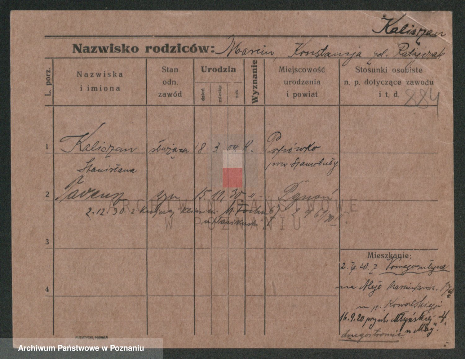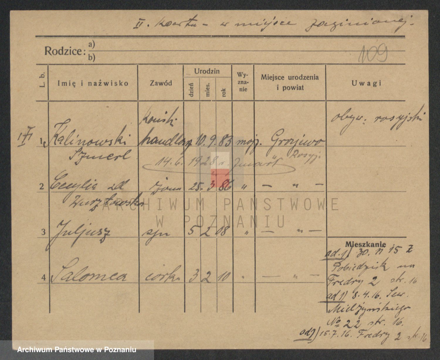 Podgląd karty osobowej dostępny jest po kliknięciu na nazwisko lub ikonkę karty. Można dokonywać powiększenia (ikony na górze) lub przechodzić między kolejnymi skanami (strzałki po bokach).