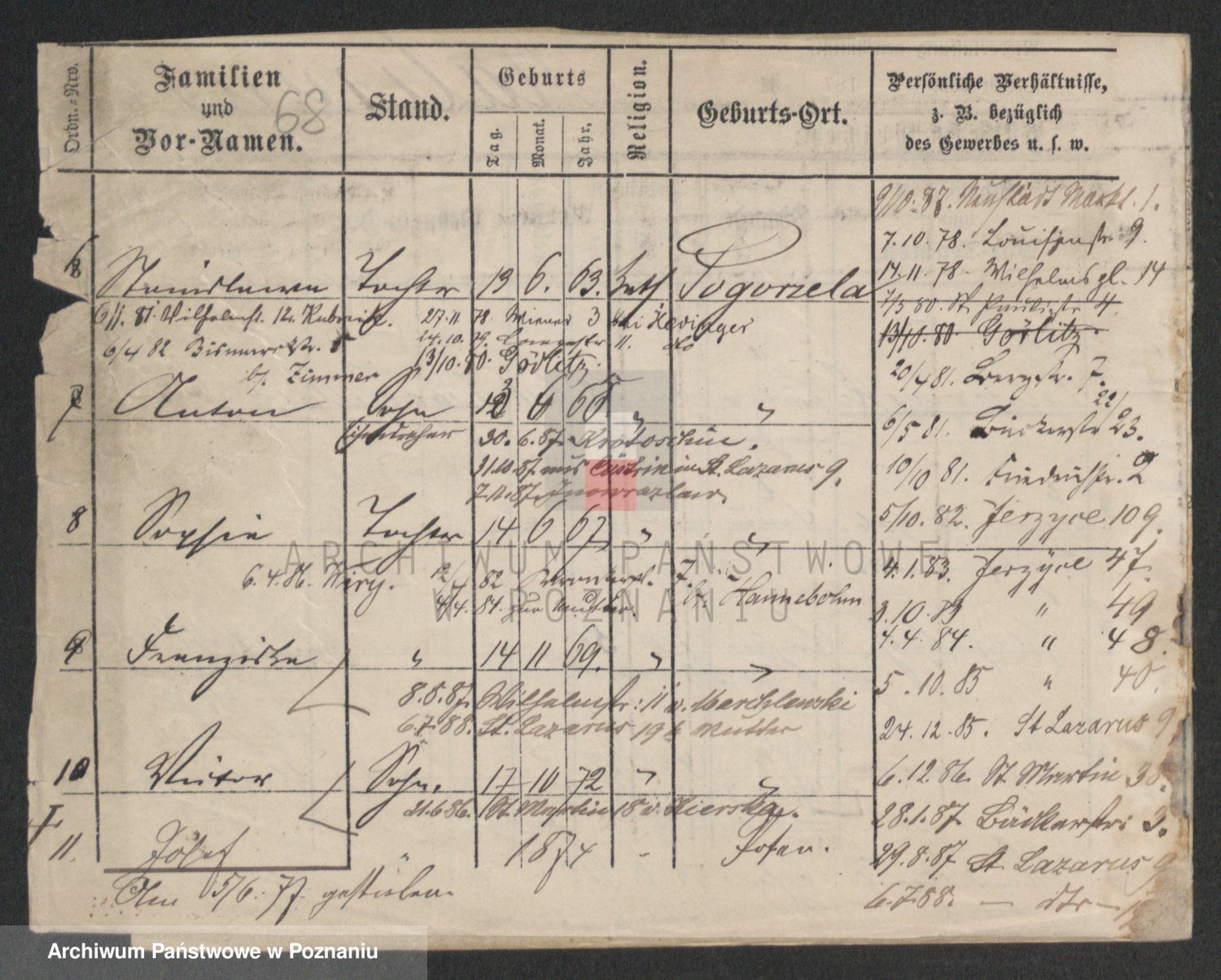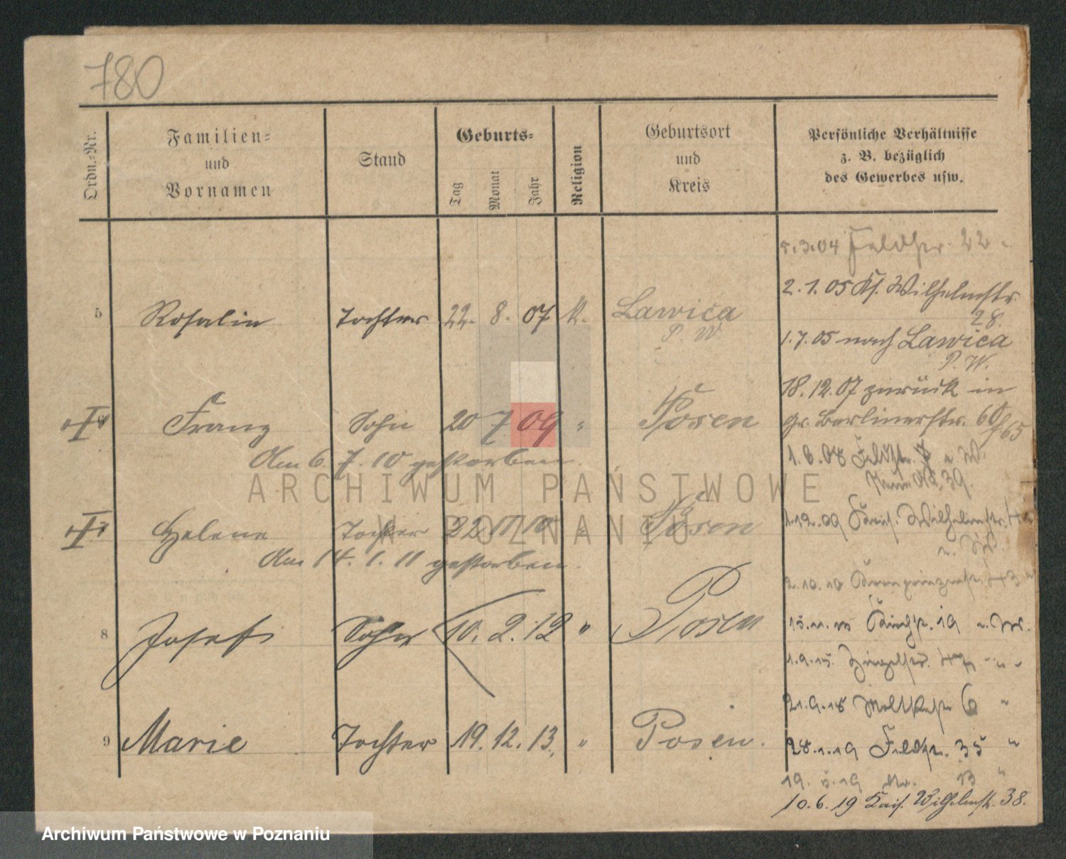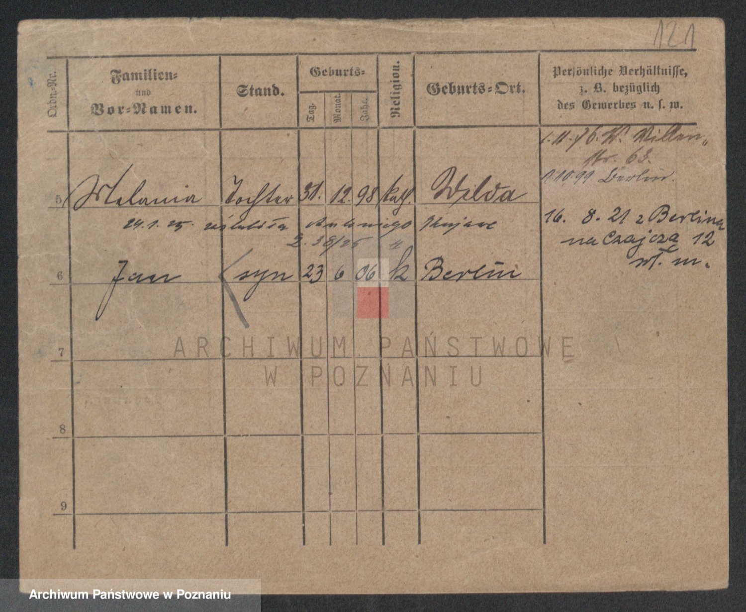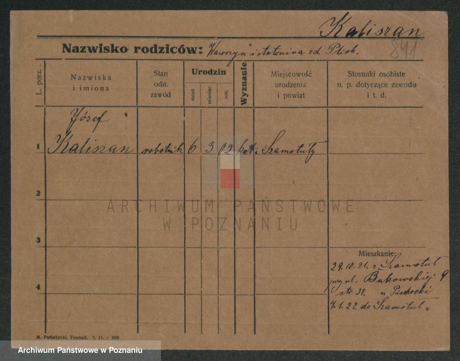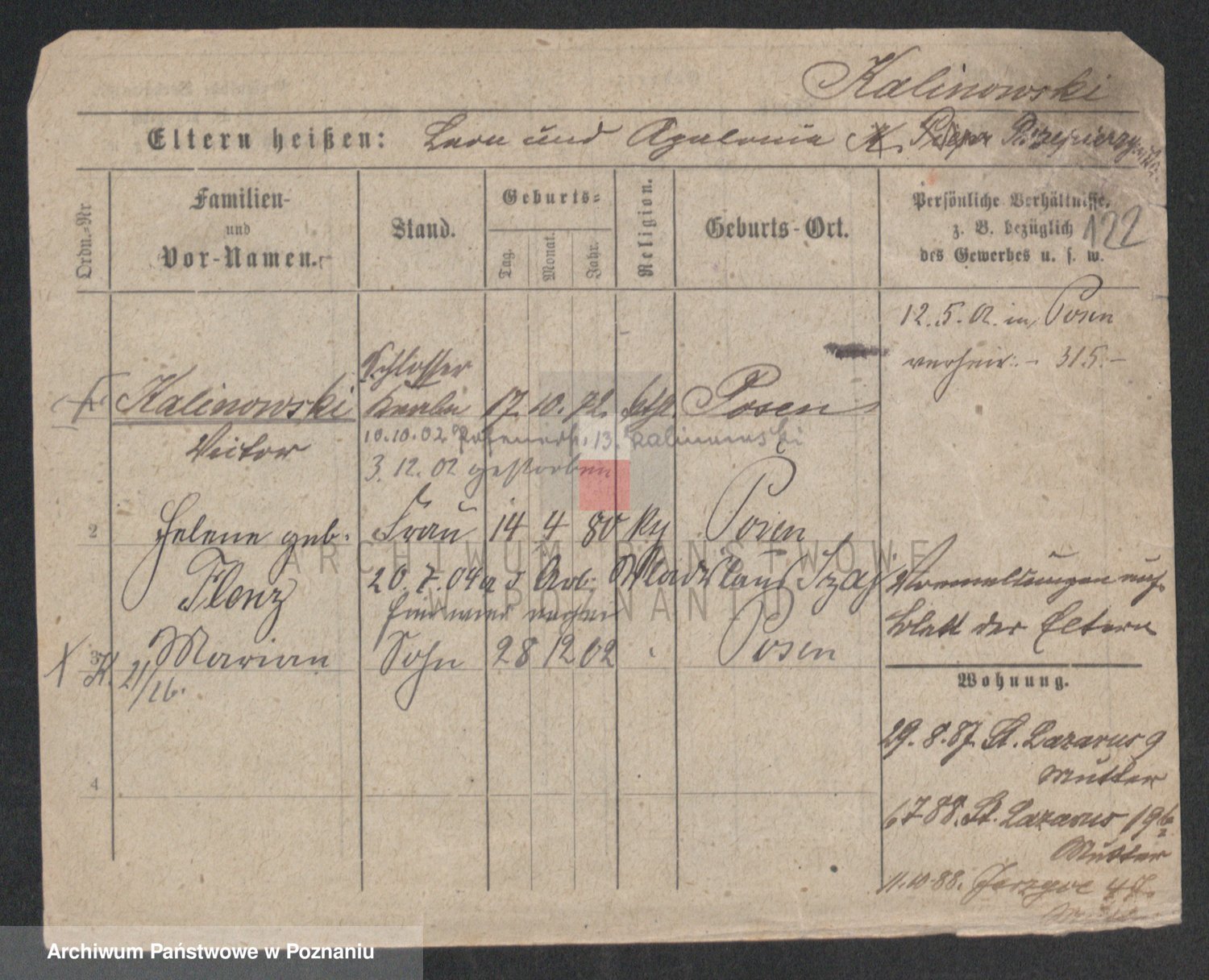 Podgląd karty osobowej dostępny jest po kliknięciu na nazwisko lub ikonkę karty. Można dokonywać powiększenia (ikony na górze) lub przechodzić między kolejnymi skanami (strzałki po bokach).