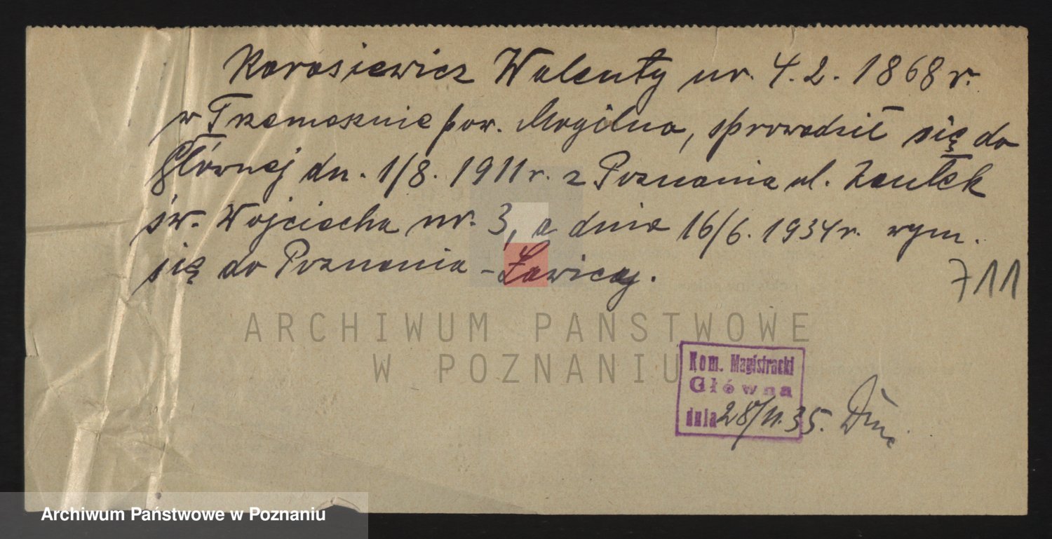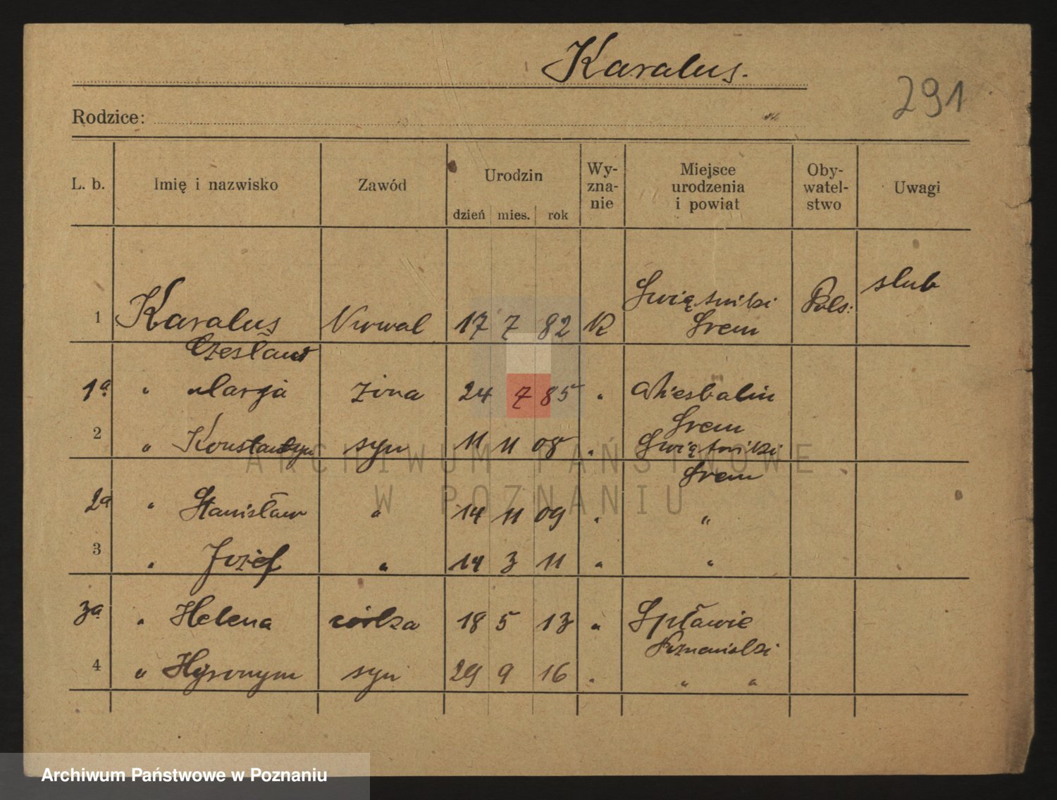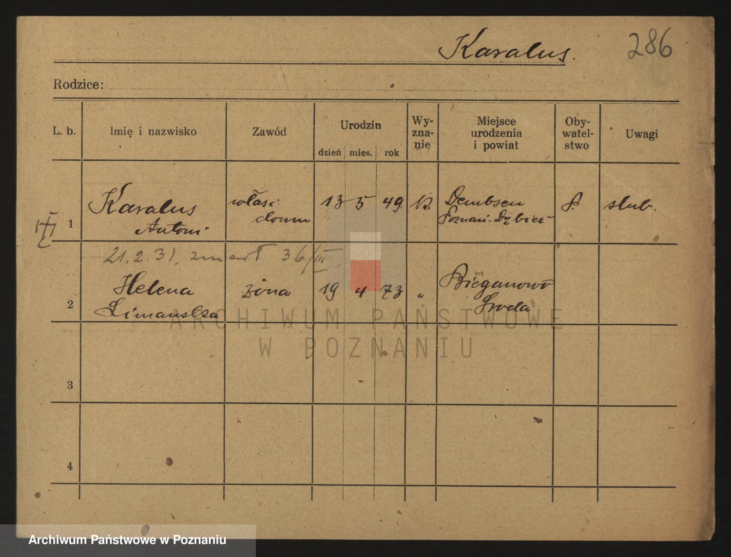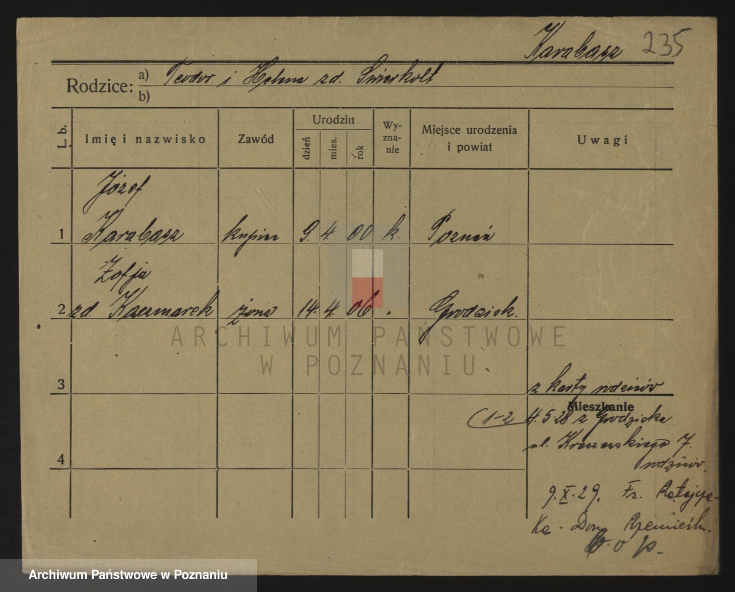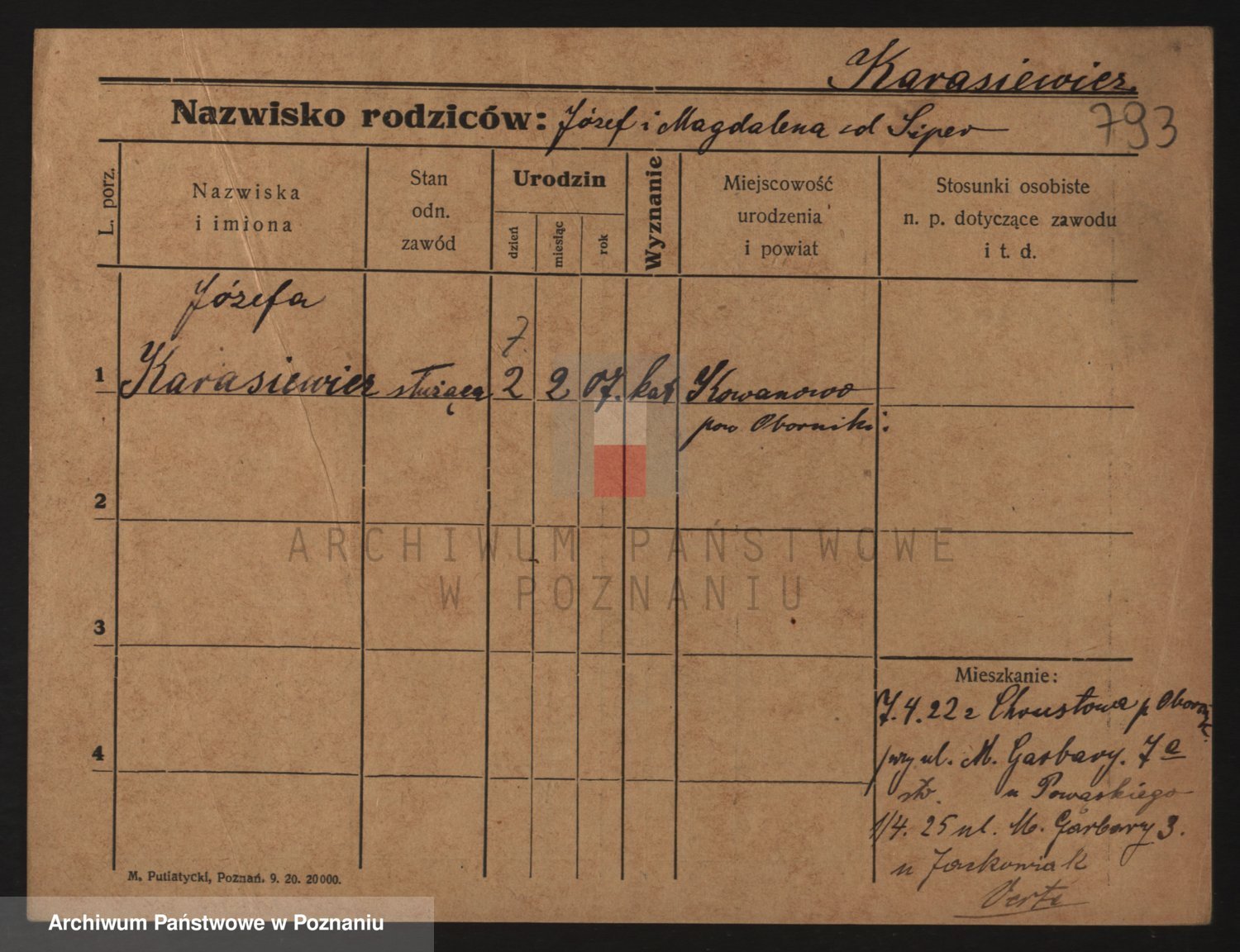 Podgląd karty osobowej dostępny jest po kliknięciu na nazwisko lub ikonkę karty. Można dokonywać powiększenia (ikony na górze) lub przechodzić między kolejnymi skanami (strzałki po bokach).