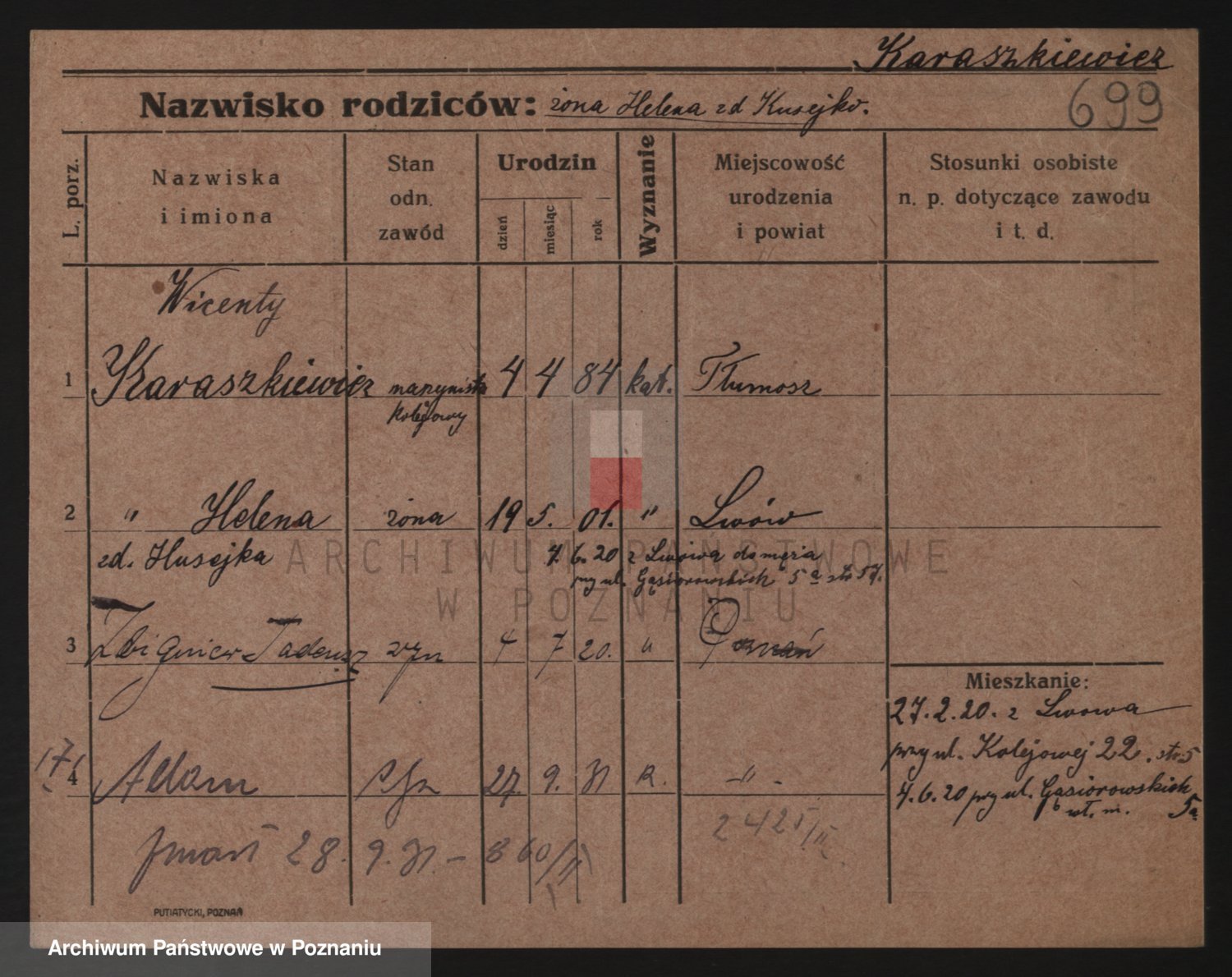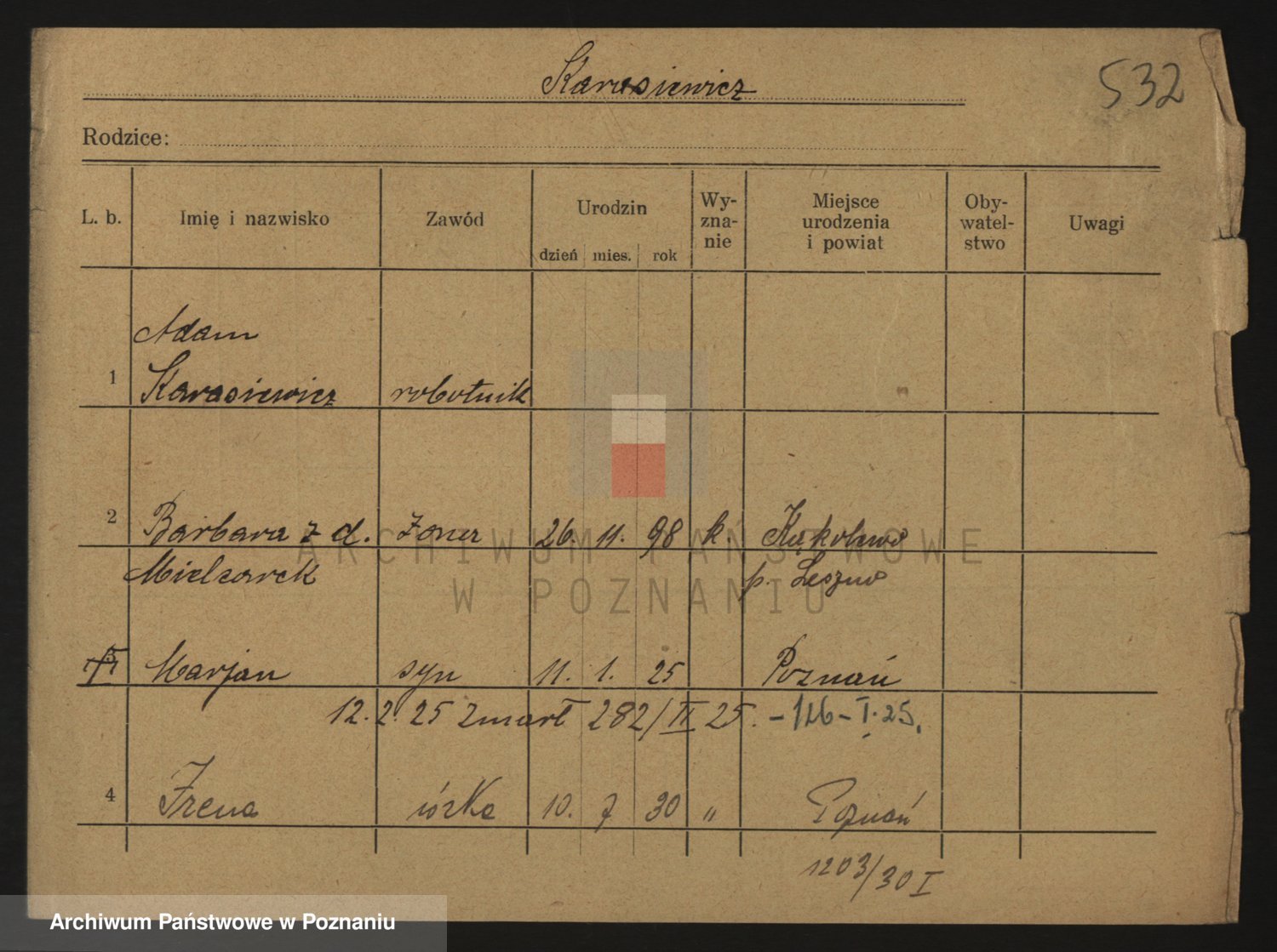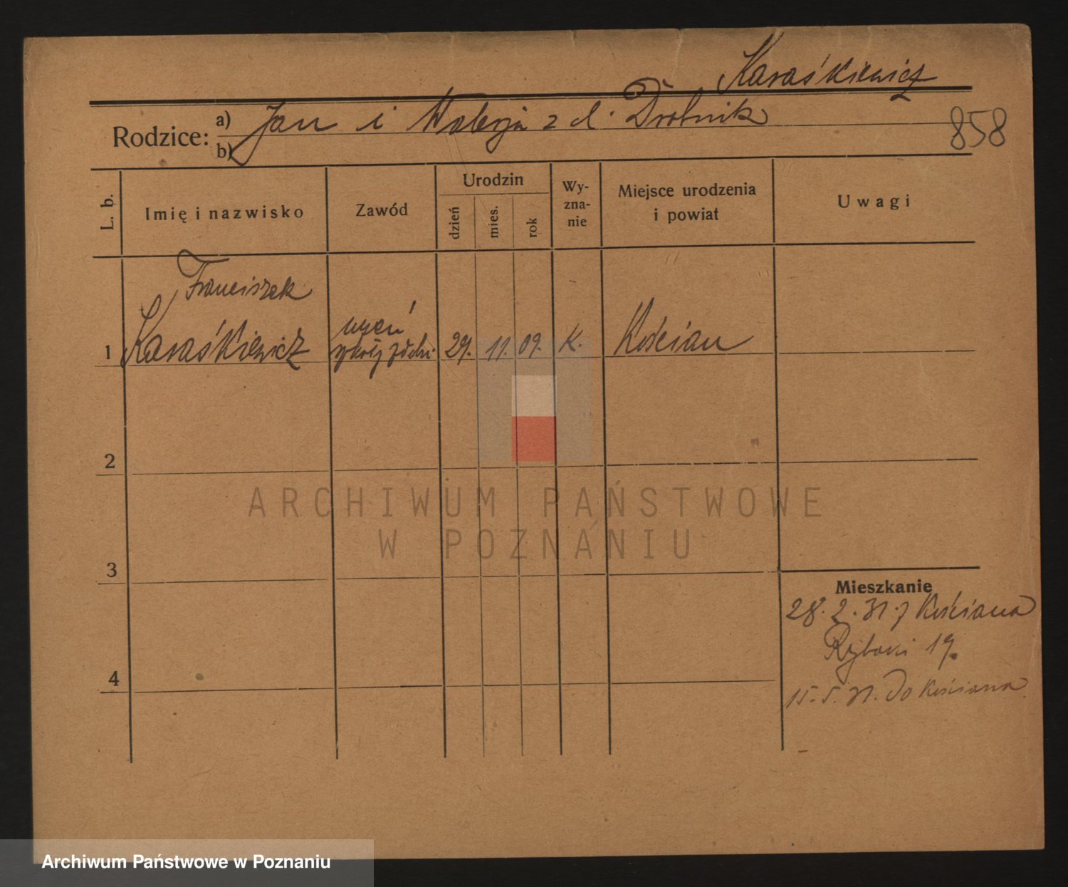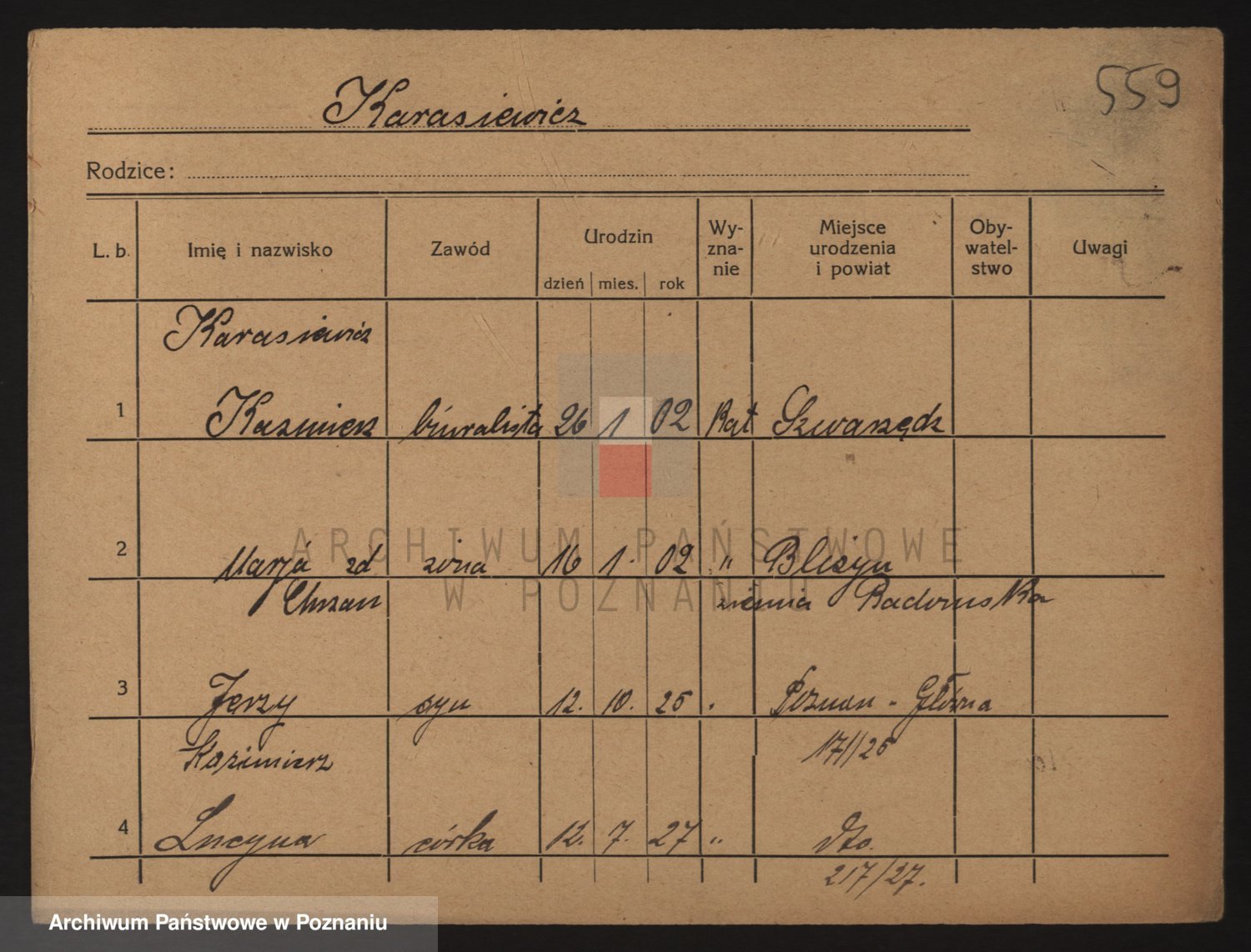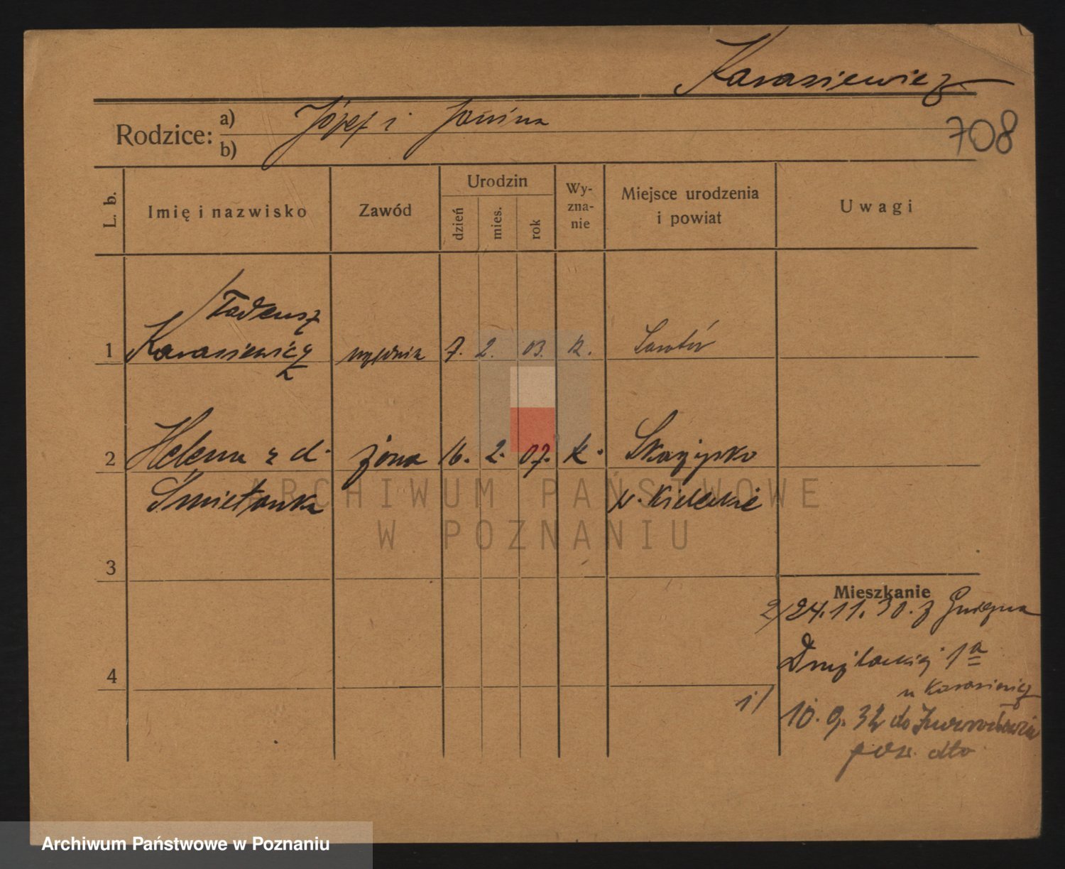 Podgląd karty osobowej dostępny jest po kliknięciu na nazwisko lub ikonkę karty. Można dokonywać powiększenia (ikony na górze) lub przechodzić między kolejnymi skanami (strzałki po bokach).