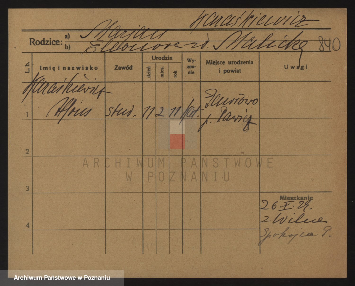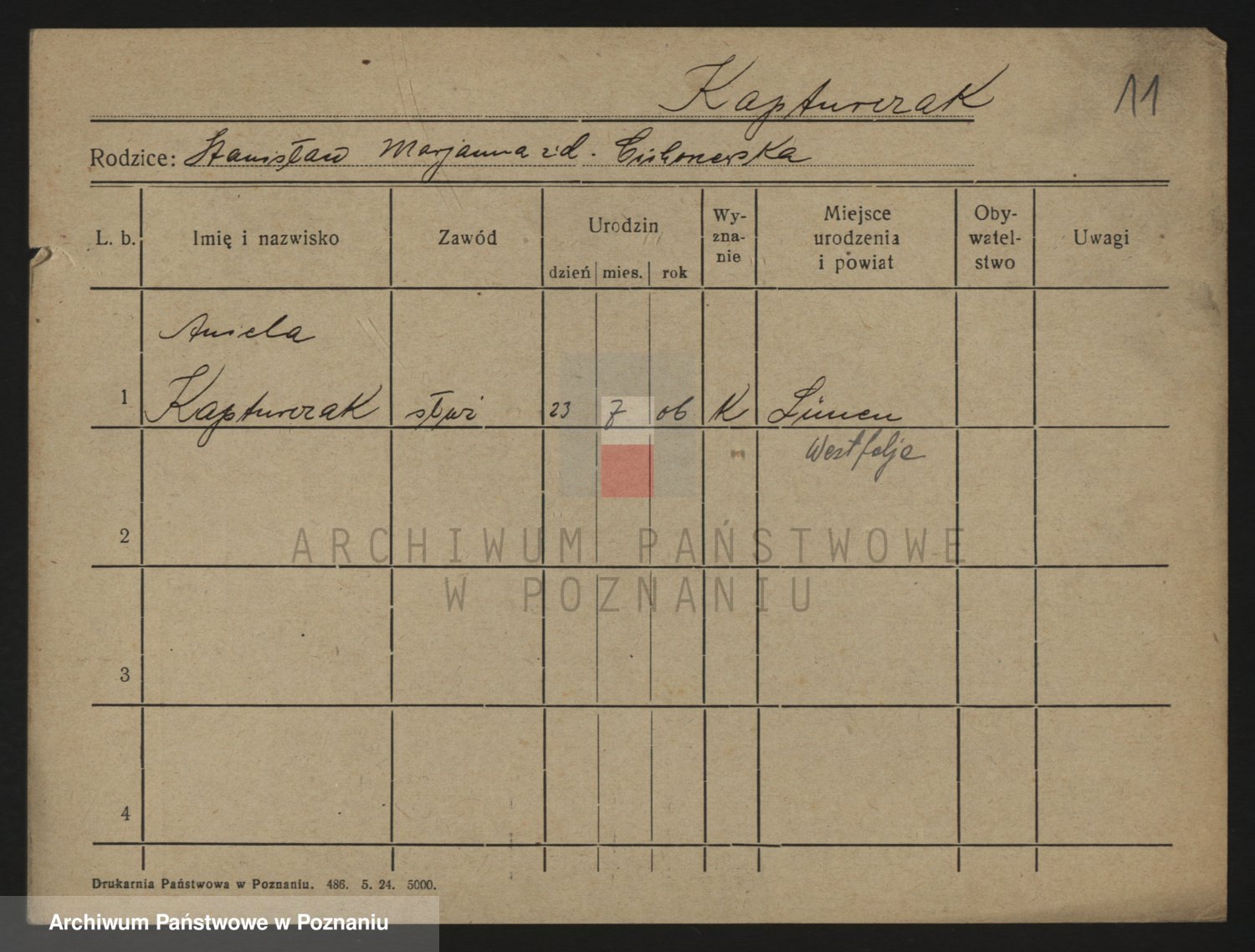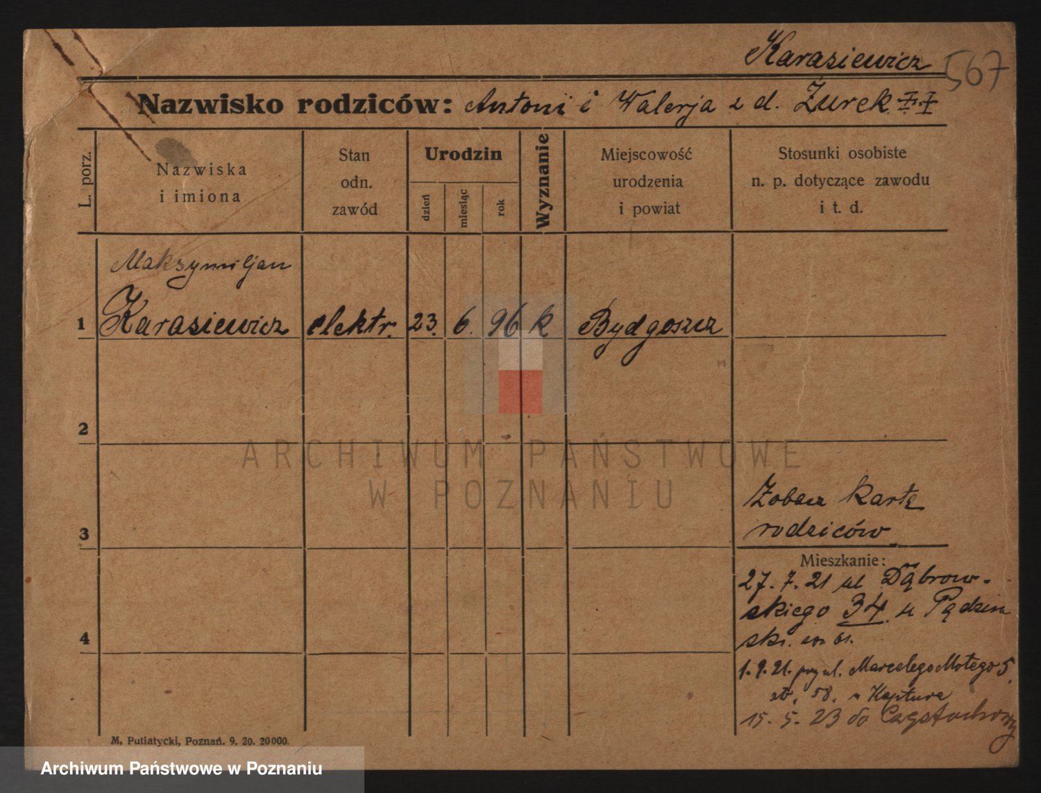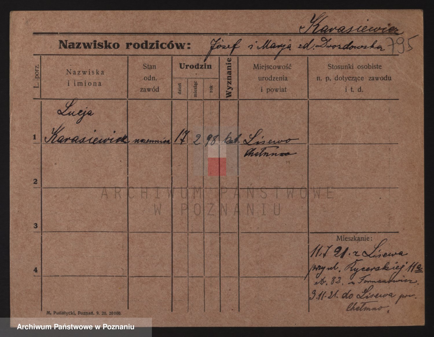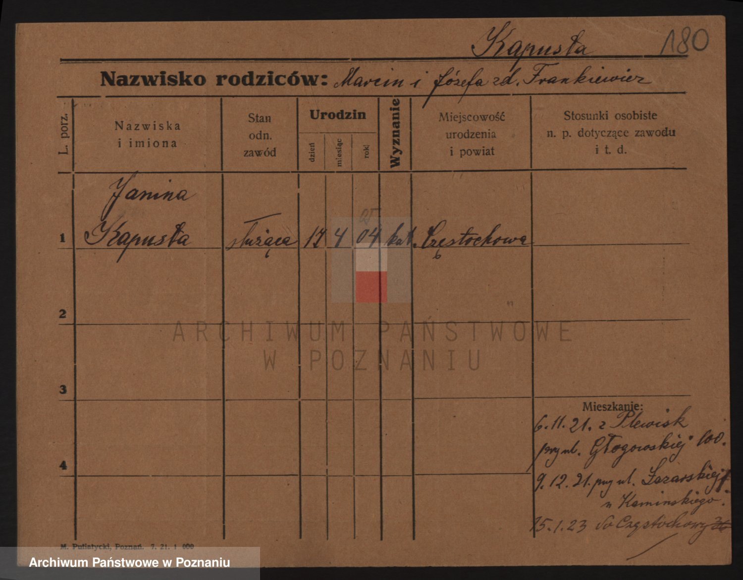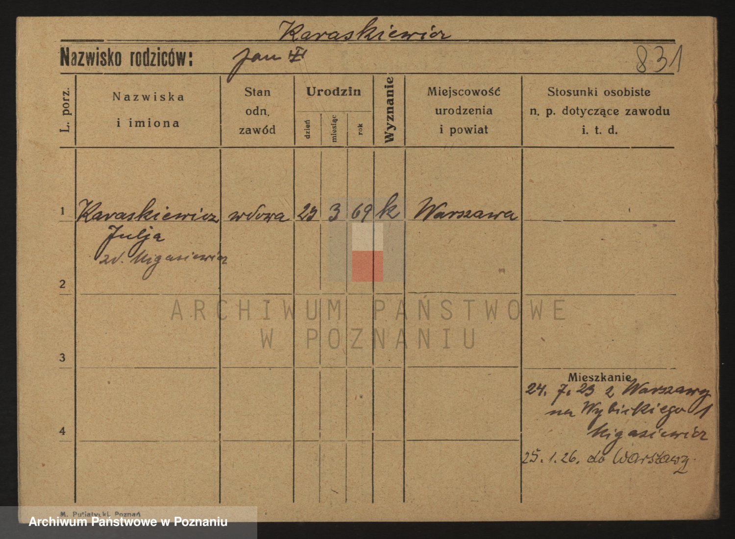 Podgląd karty osobowej dostępny jest po kliknięciu na nazwisko lub ikonkę karty. Można dokonywać powiększenia (ikony na górze) lub przechodzić między kolejnymi skanami (strzałki po bokach).