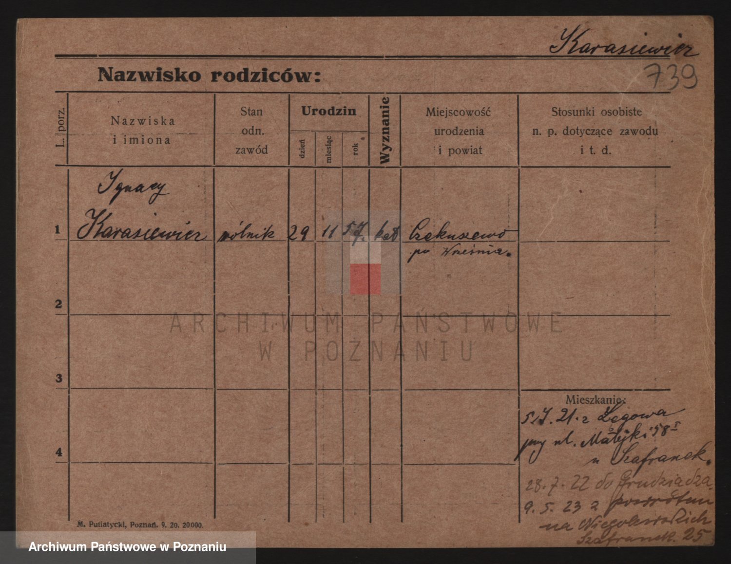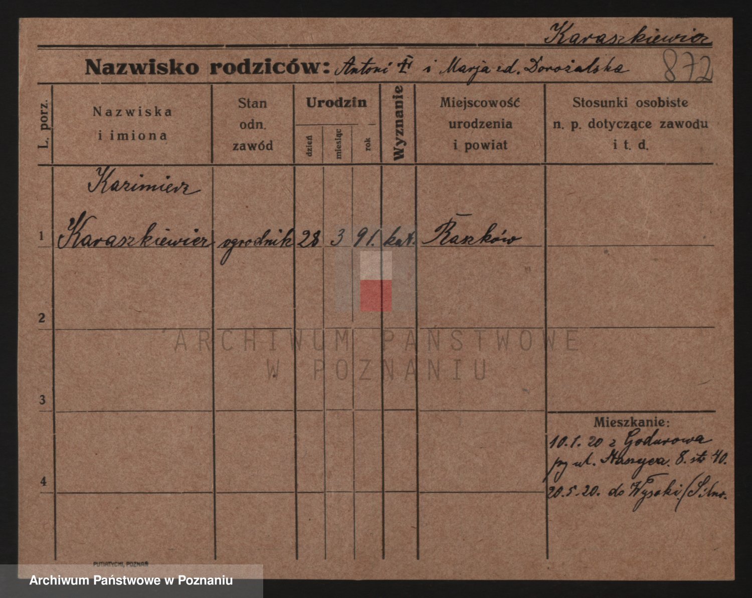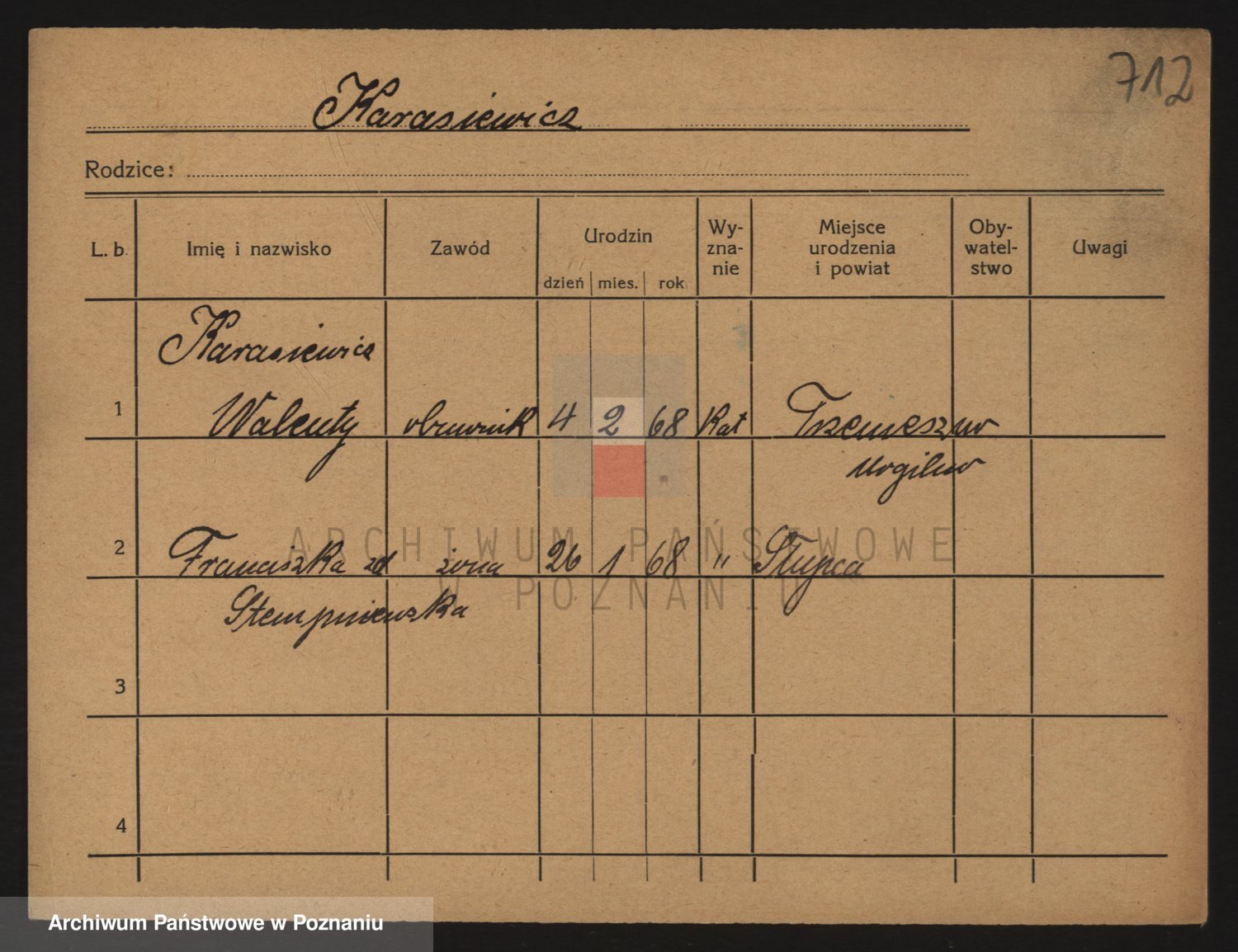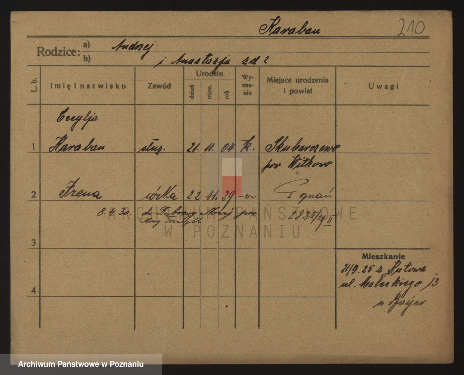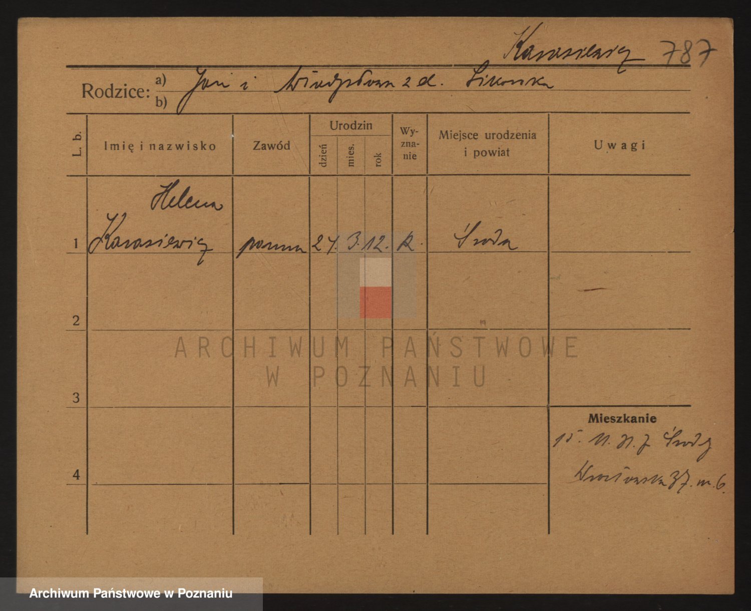 Podgląd karty osobowej dostępny jest po kliknięciu na nazwisko lub ikonkę karty. Można dokonywać powiększenia (ikony na górze) lub przechodzić między kolejnymi skanami (strzałki po bokach).