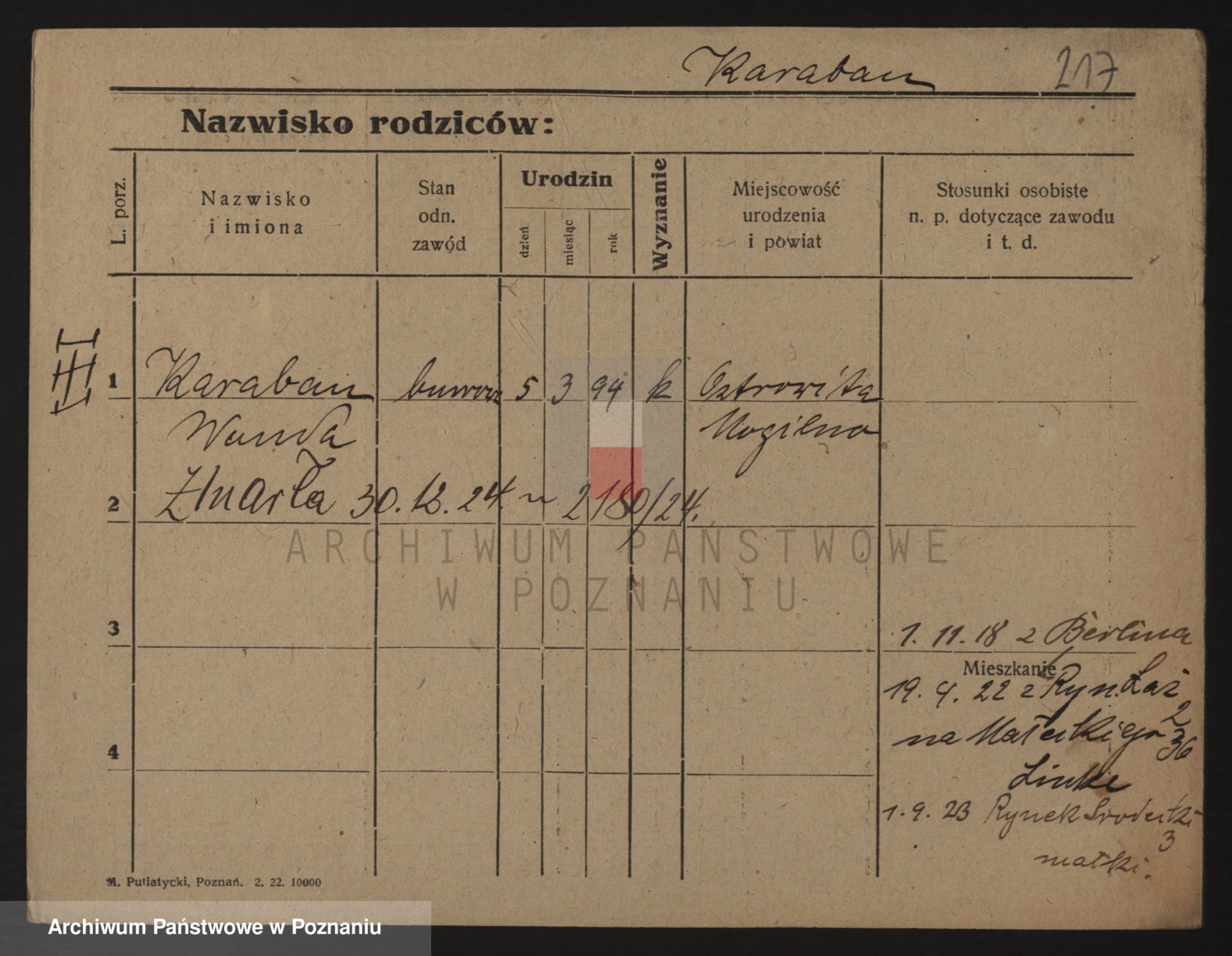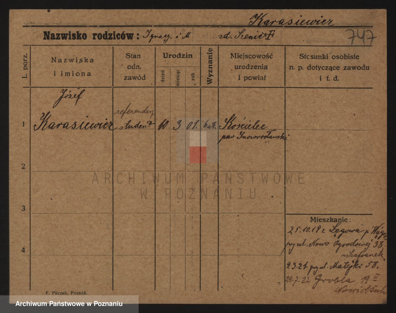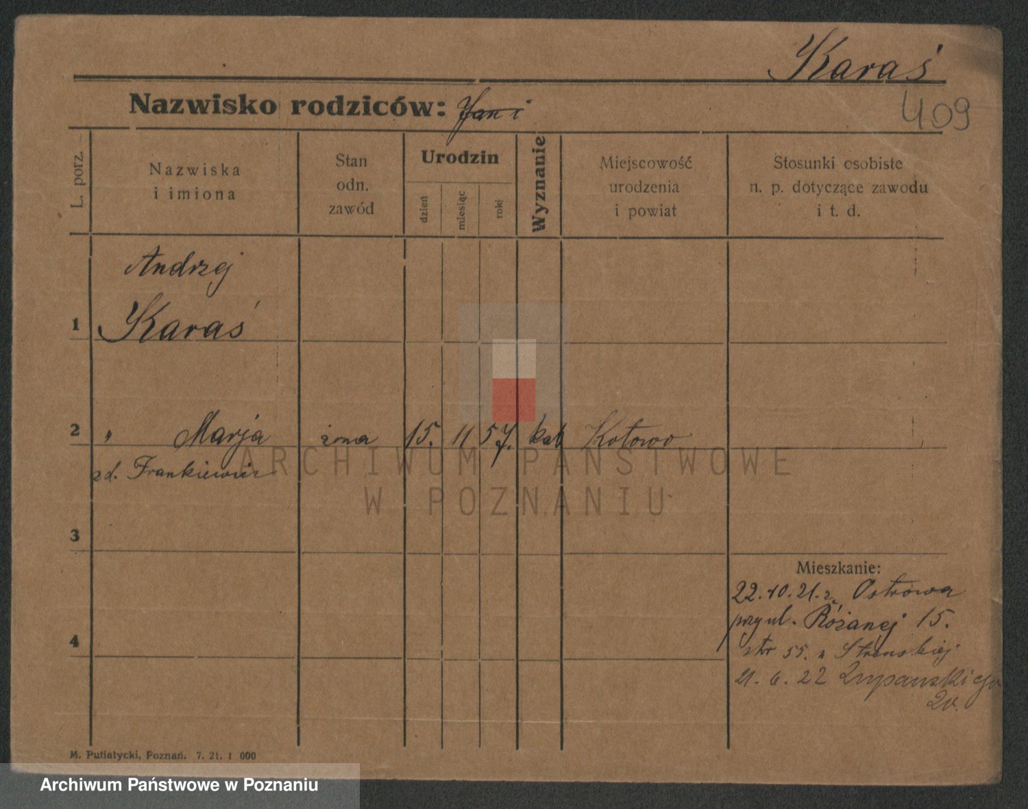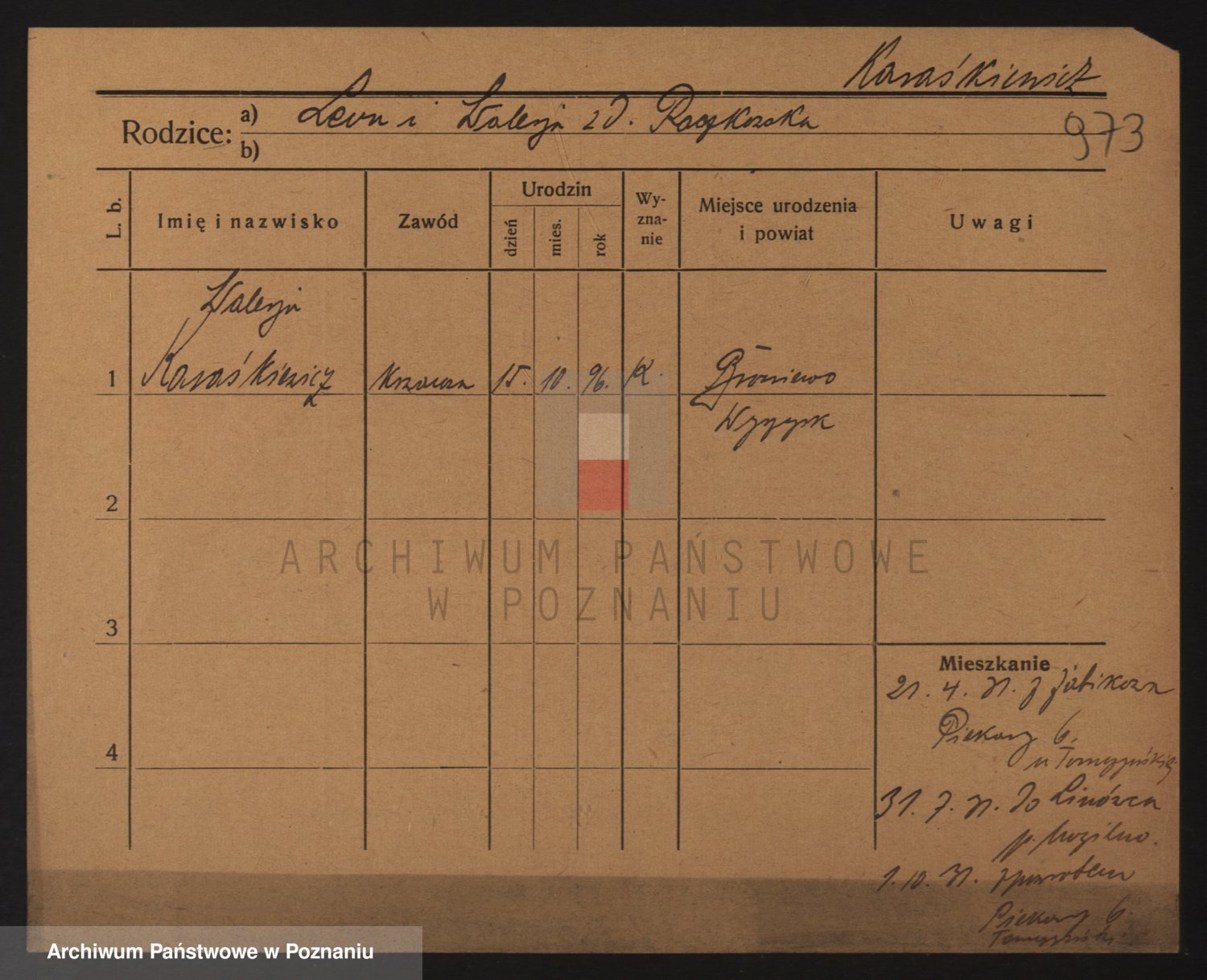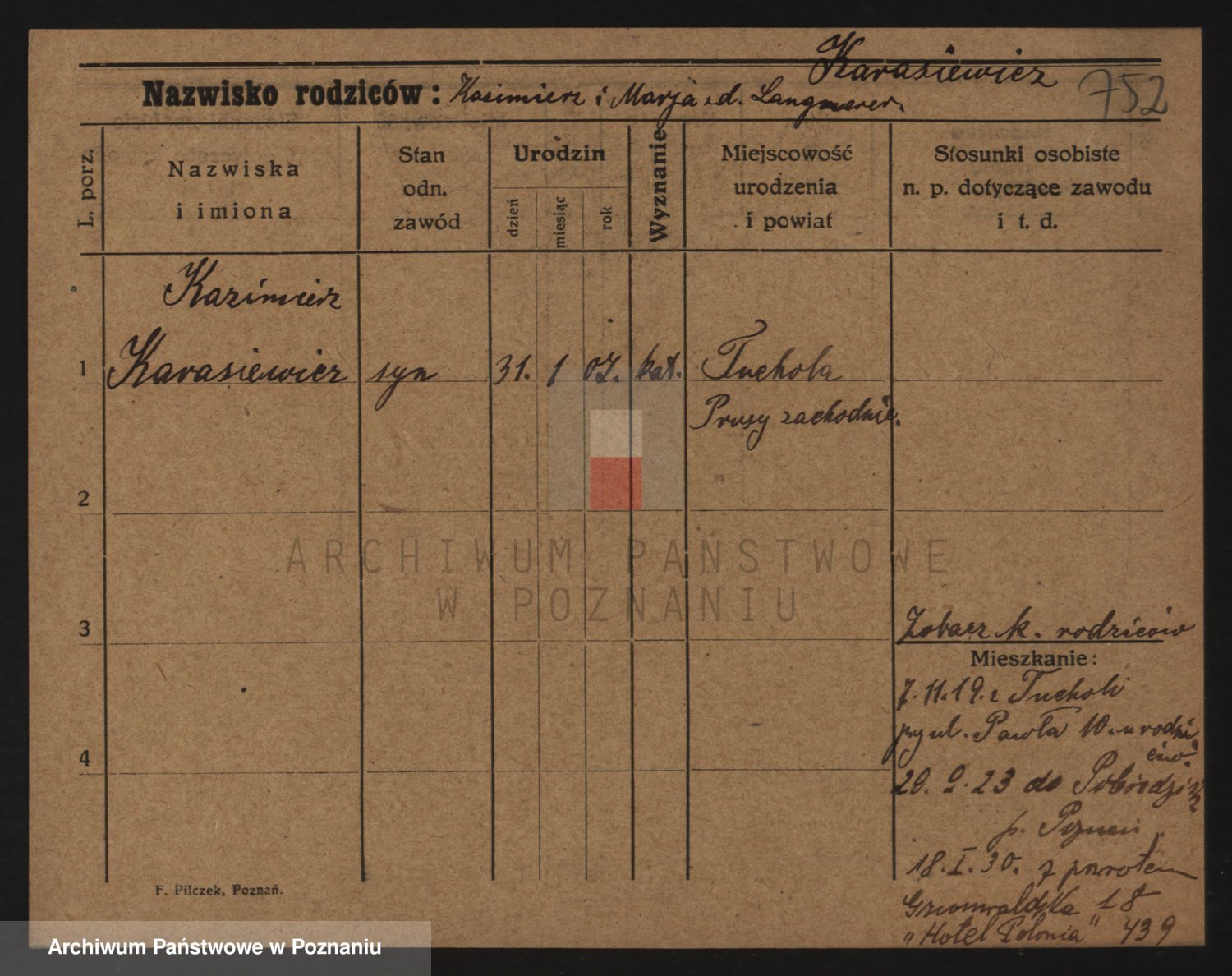 Podgląd karty osobowej dostępny jest po kliknięciu na nazwisko lub ikonkę karty. Można dokonywać powiększenia (ikony na górze) lub przechodzić między kolejnymi skanami (strzałki po bokach).