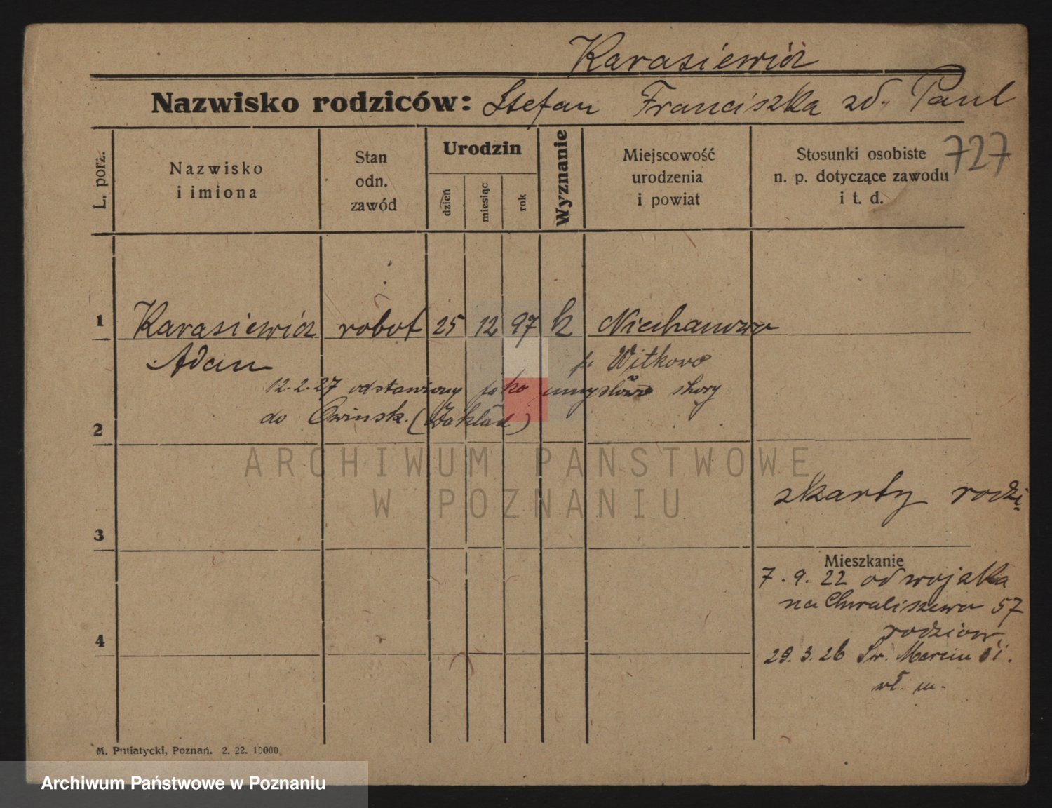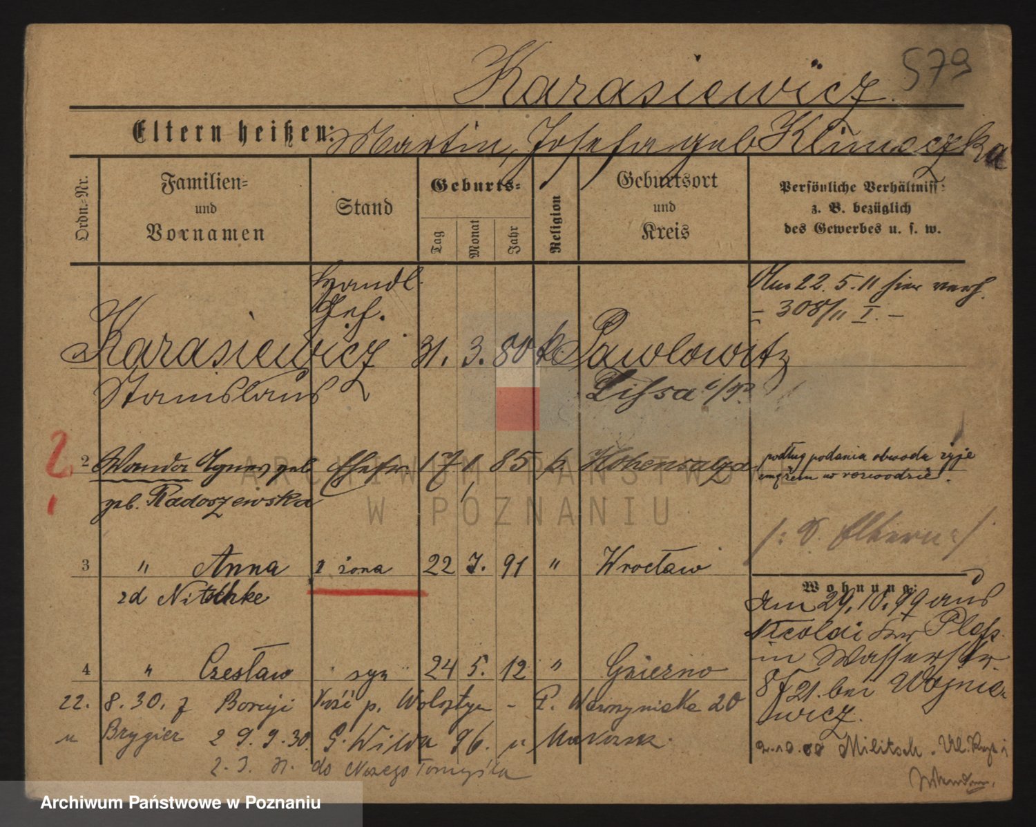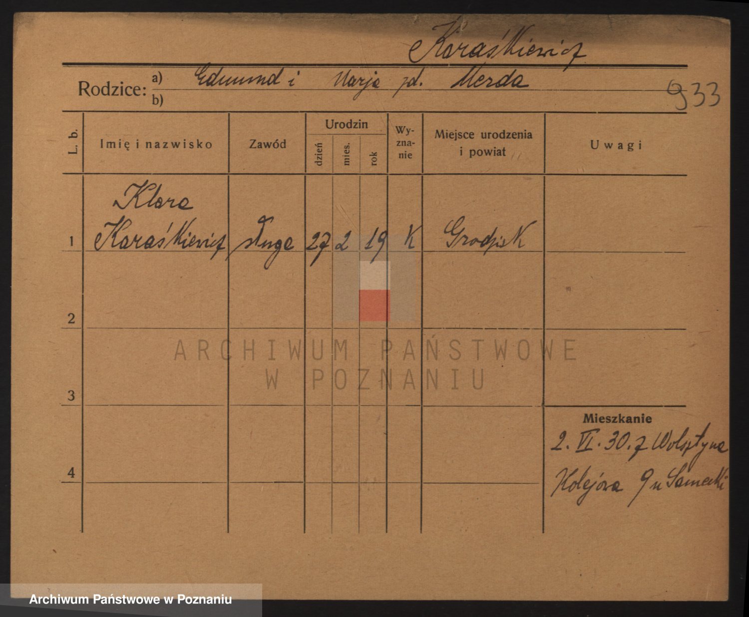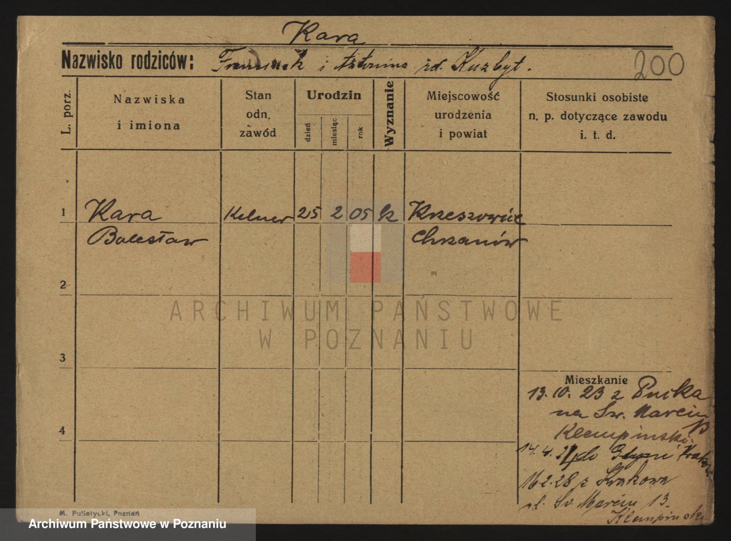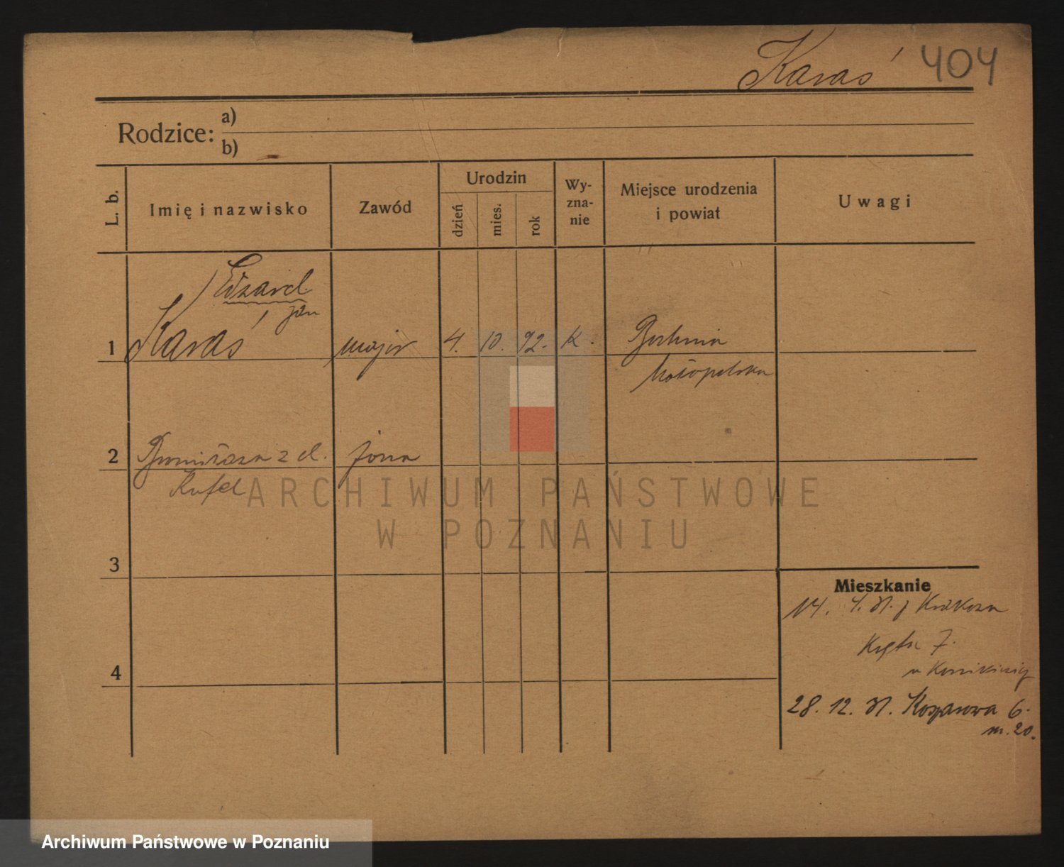 Podgląd karty osobowej dostępny jest po kliknięciu na nazwisko lub ikonkę karty. Można dokonywać powiększenia (ikony na górze) lub przechodzić między kolejnymi skanami (strzałki po bokach).