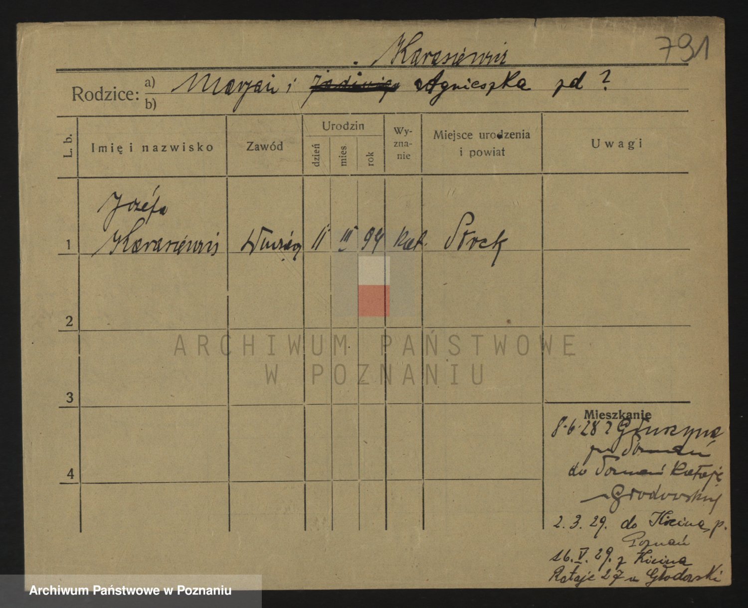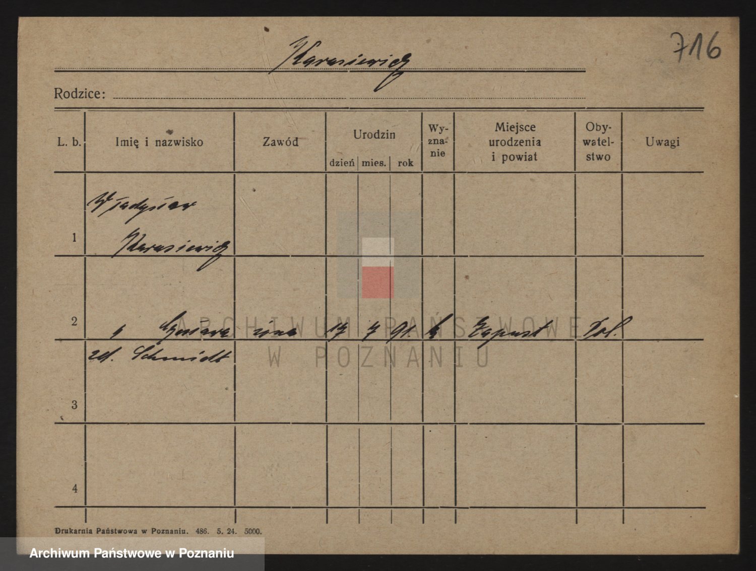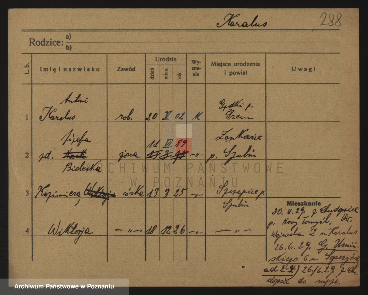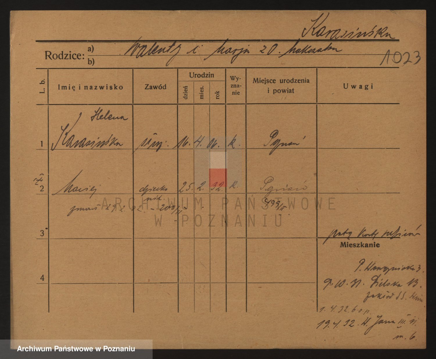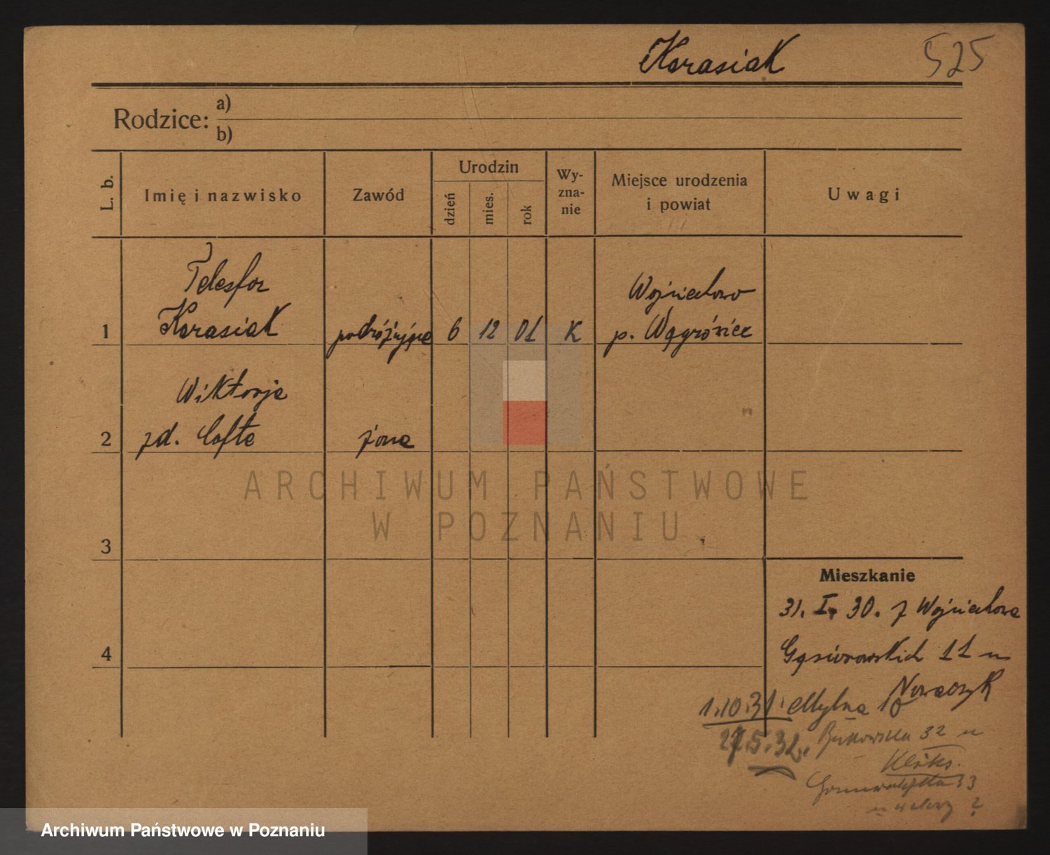 Podgląd karty osobowej dostępny jest po kliknięciu na nazwisko lub ikonkę karty. Można dokonywać powiększenia (ikony na górze) lub przechodzić między kolejnymi skanami (strzałki po bokach).