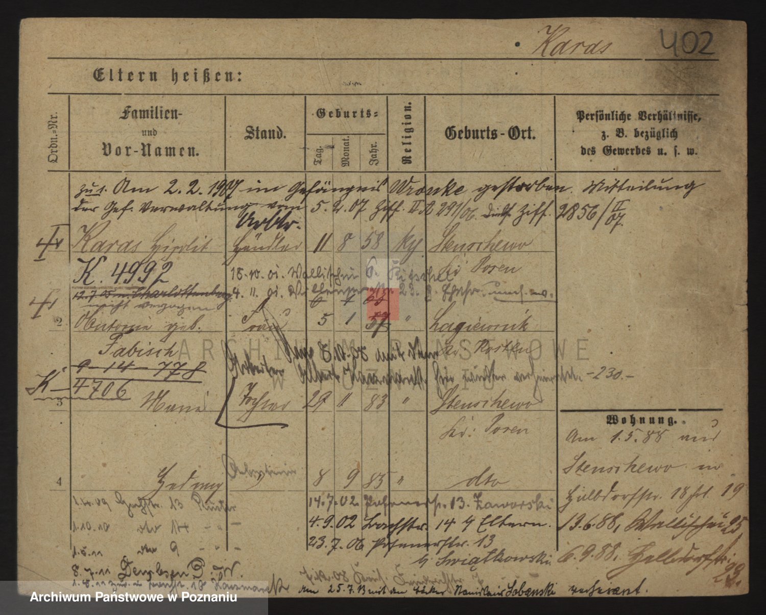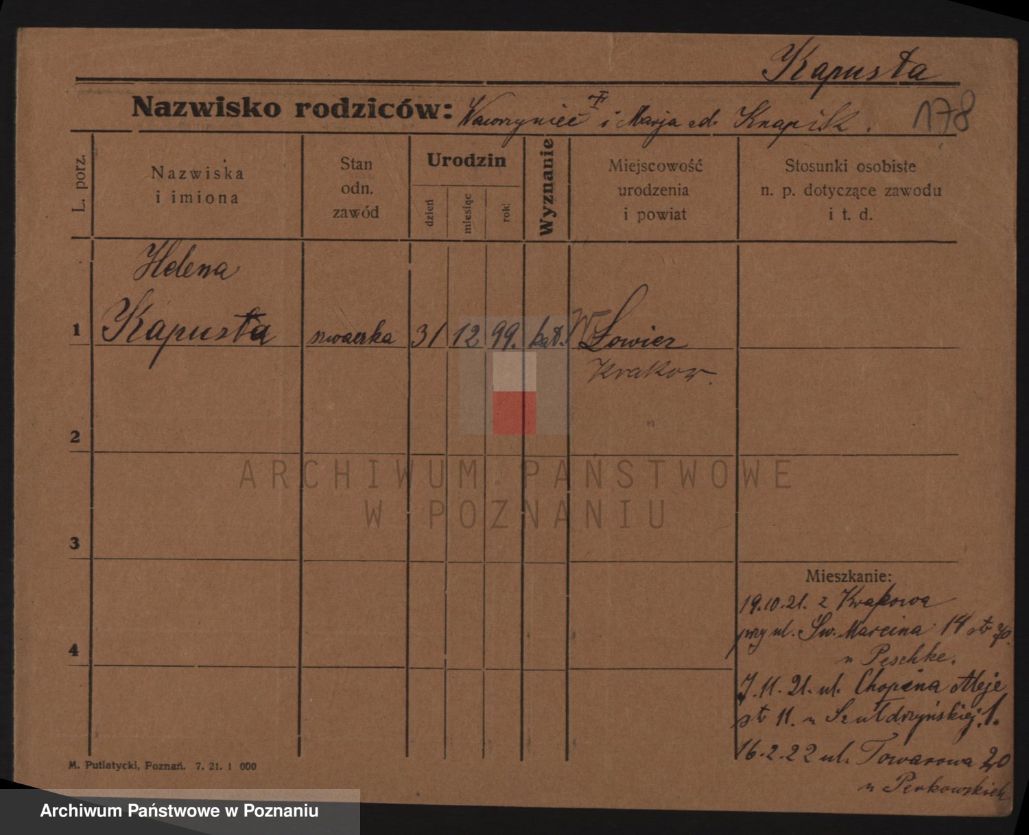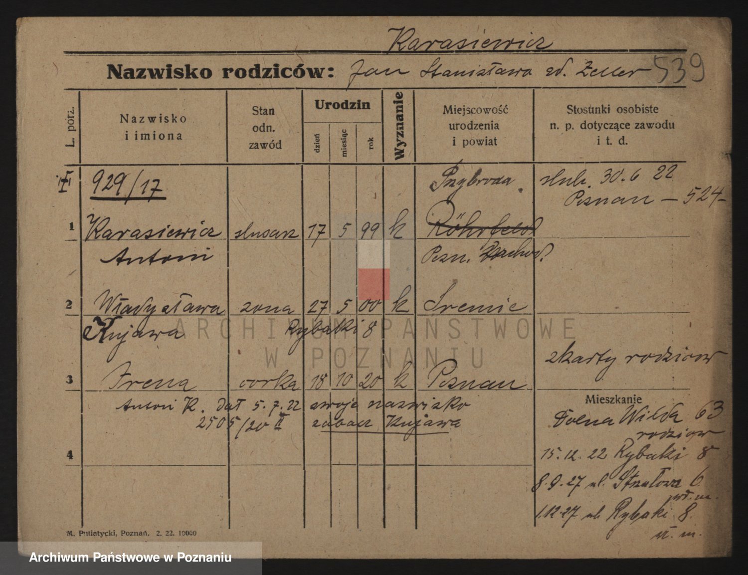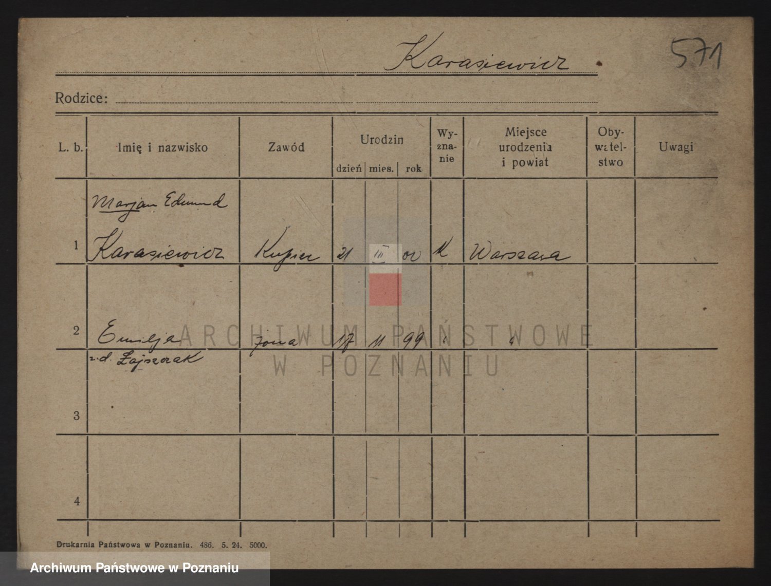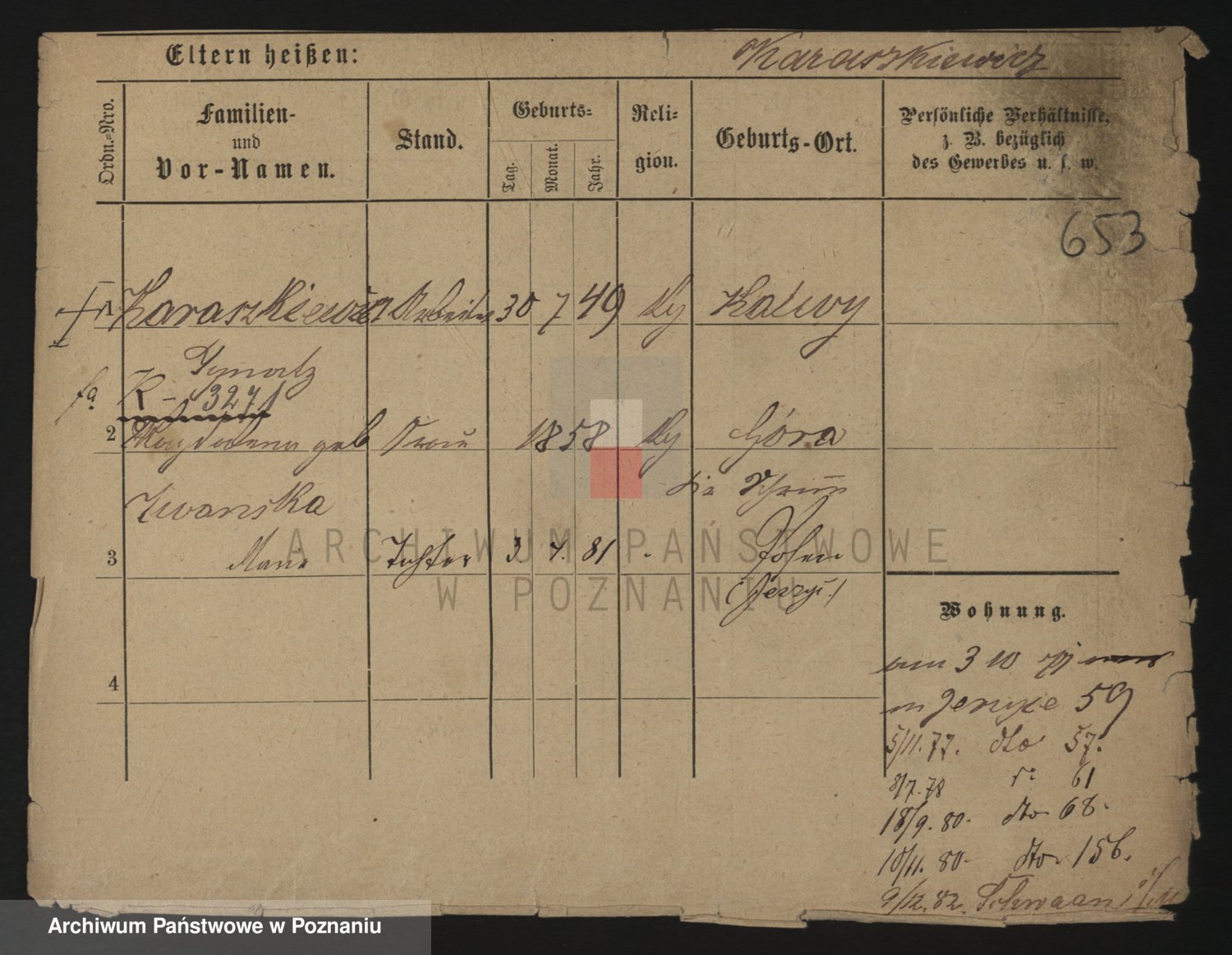 Podgląd karty osobowej dostępny jest po kliknięciu na nazwisko lub ikonkę karty. Można dokonywać powiększenia (ikony na górze) lub przechodzić między kolejnymi skanami (strzałki po bokach).