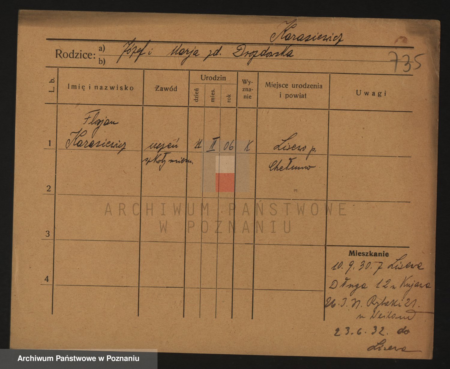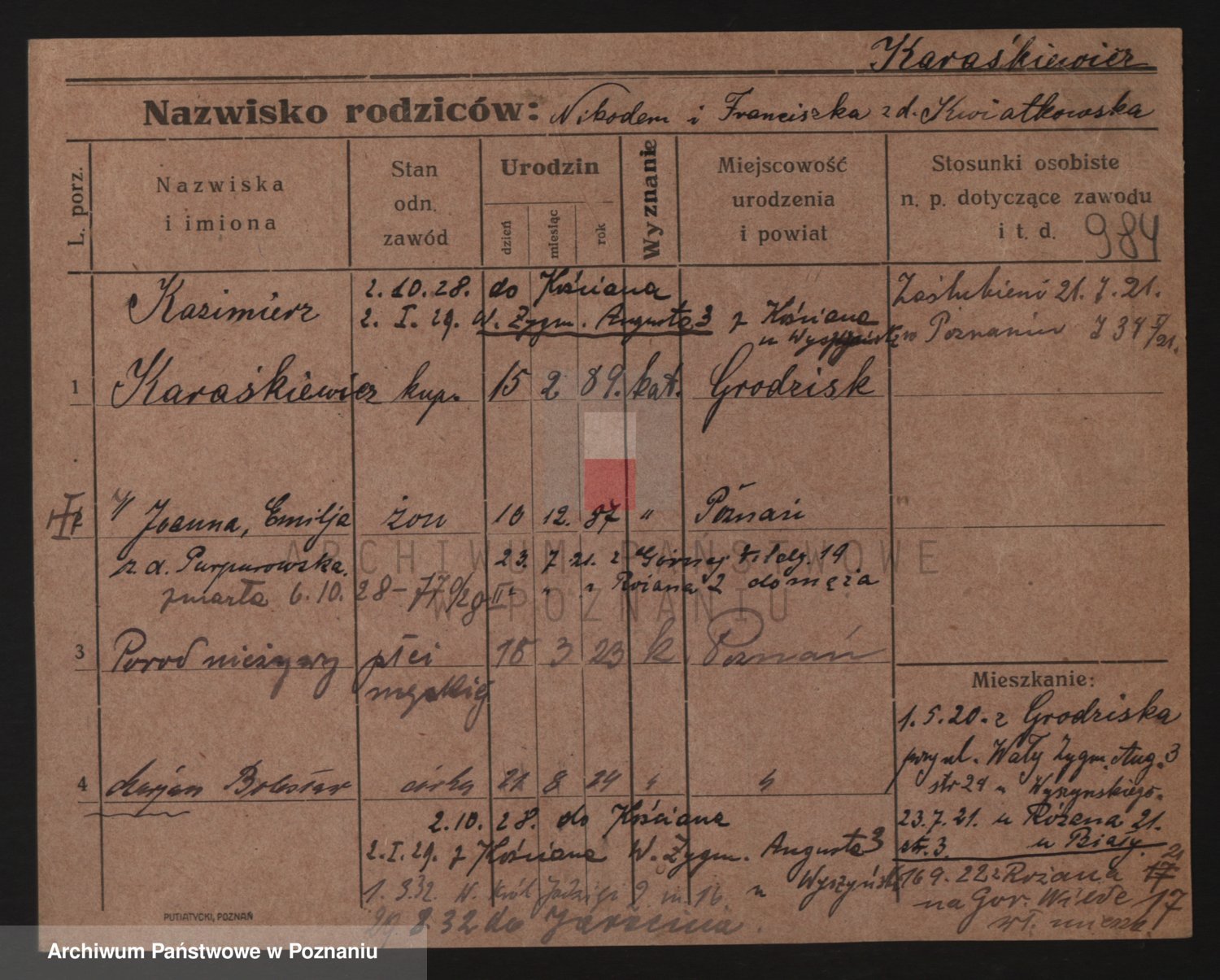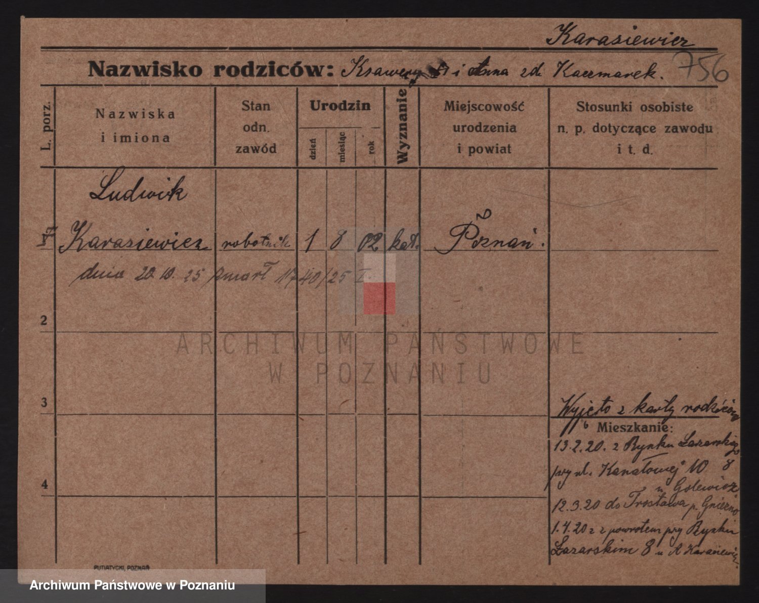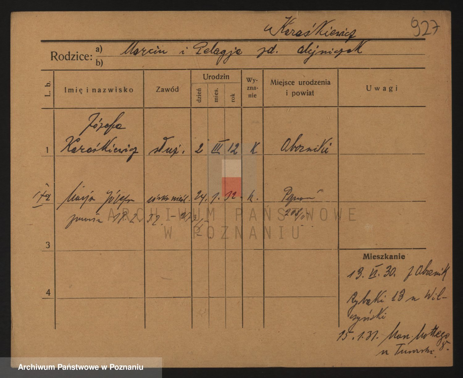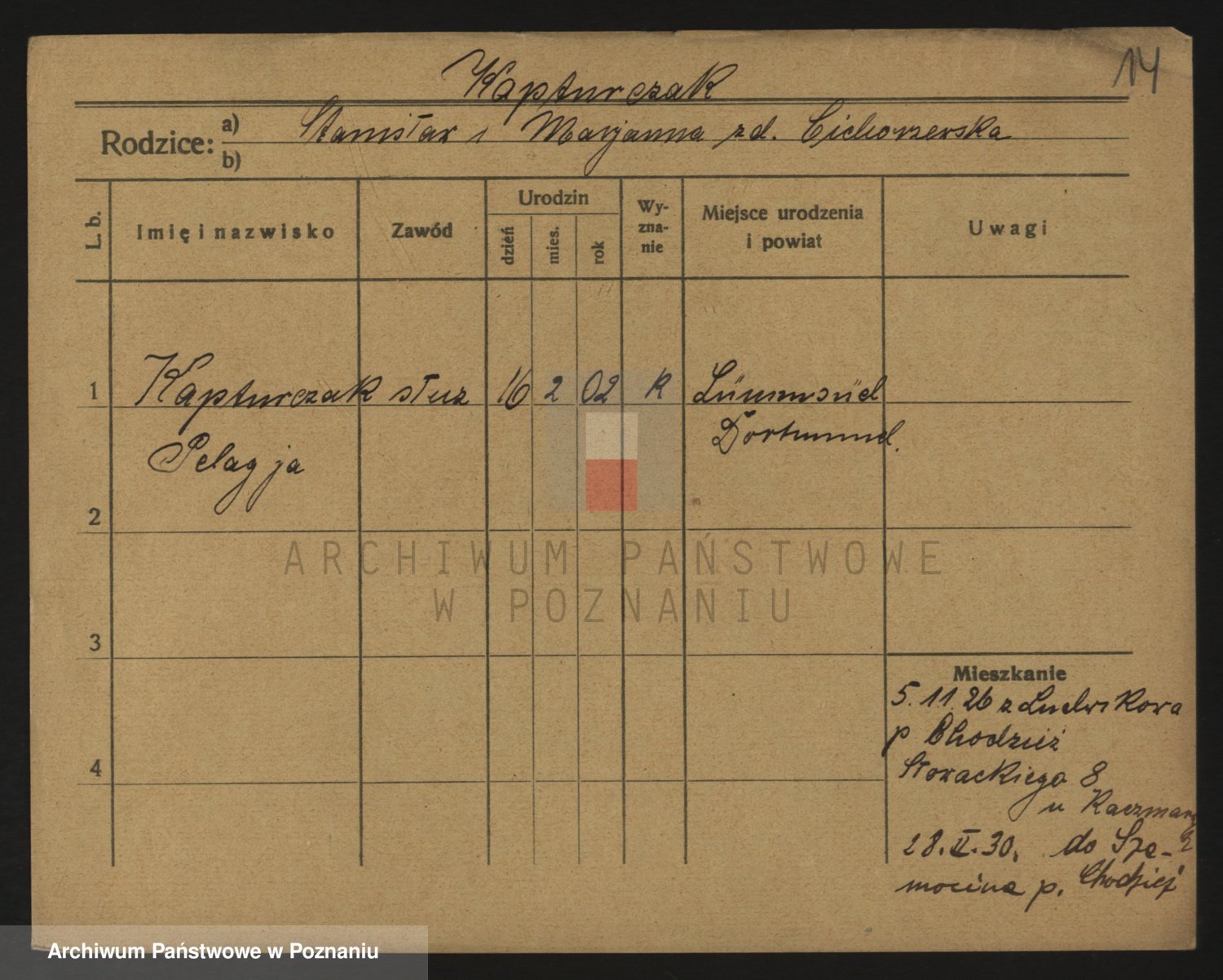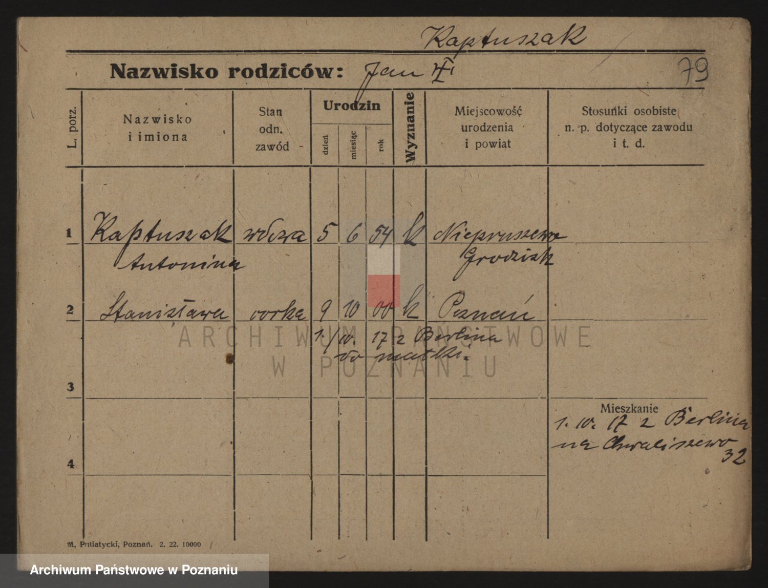 Podgląd karty osobowej dostępny jest po kliknięciu na nazwisko lub ikonkę karty. Można dokonywać powiększenia (ikony na górze) lub przechodzić między kolejnymi skanami (strzałki po bokach).