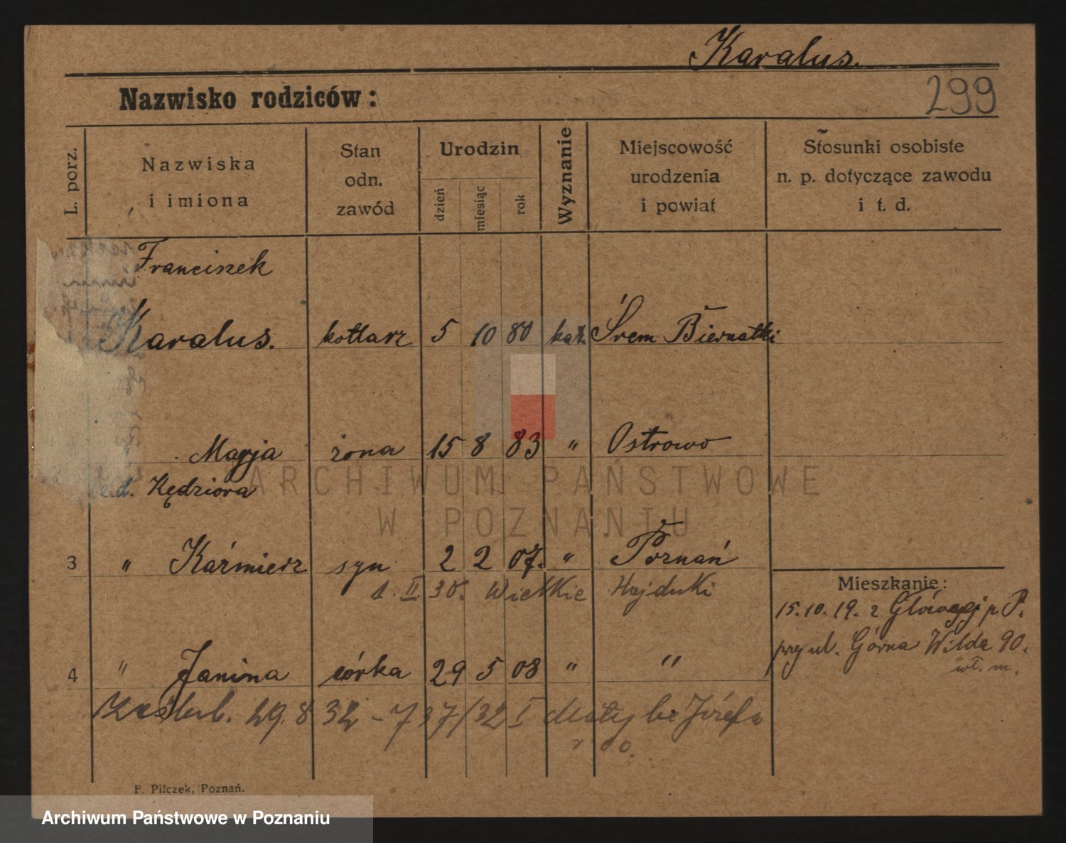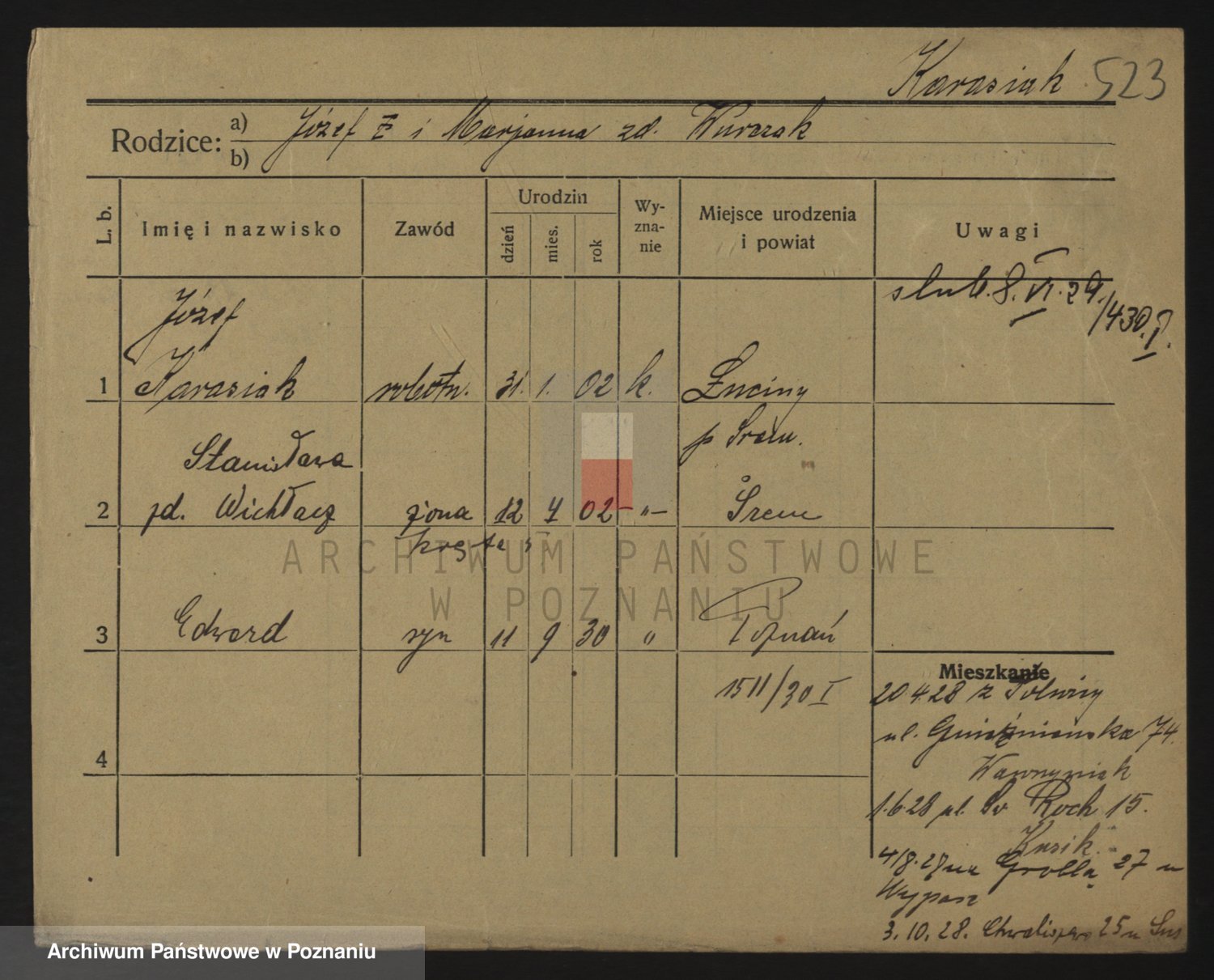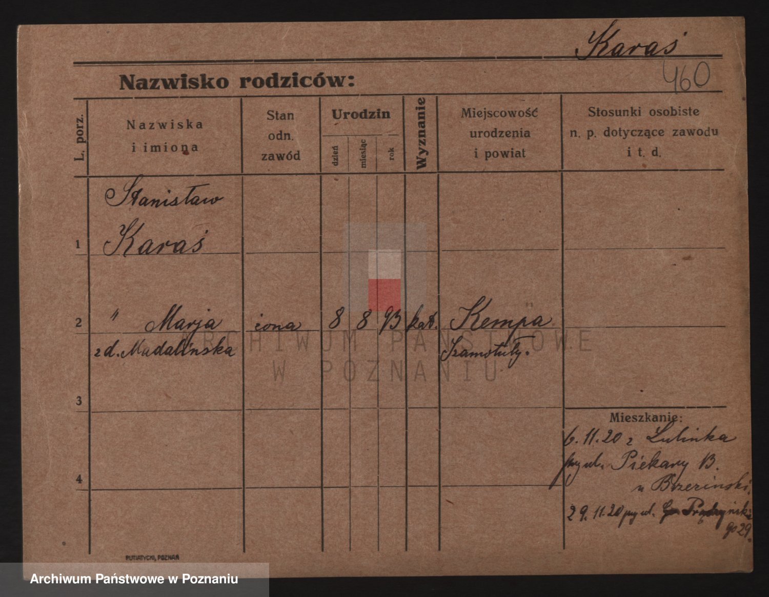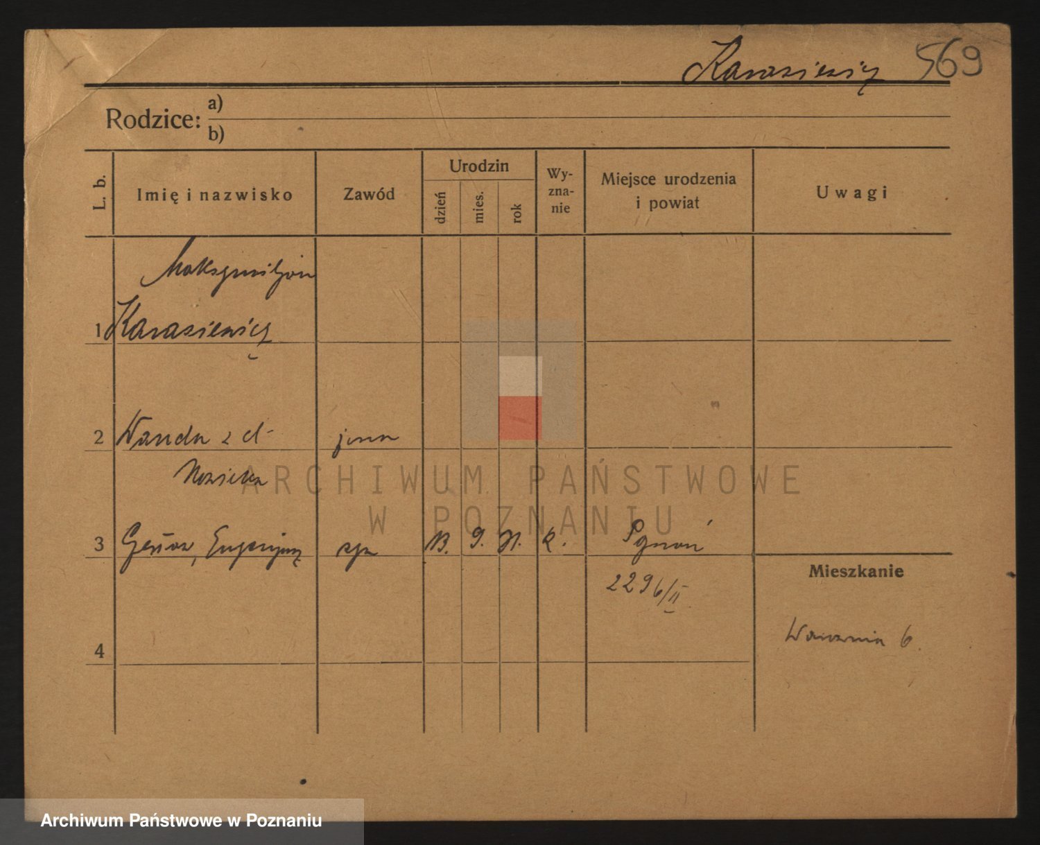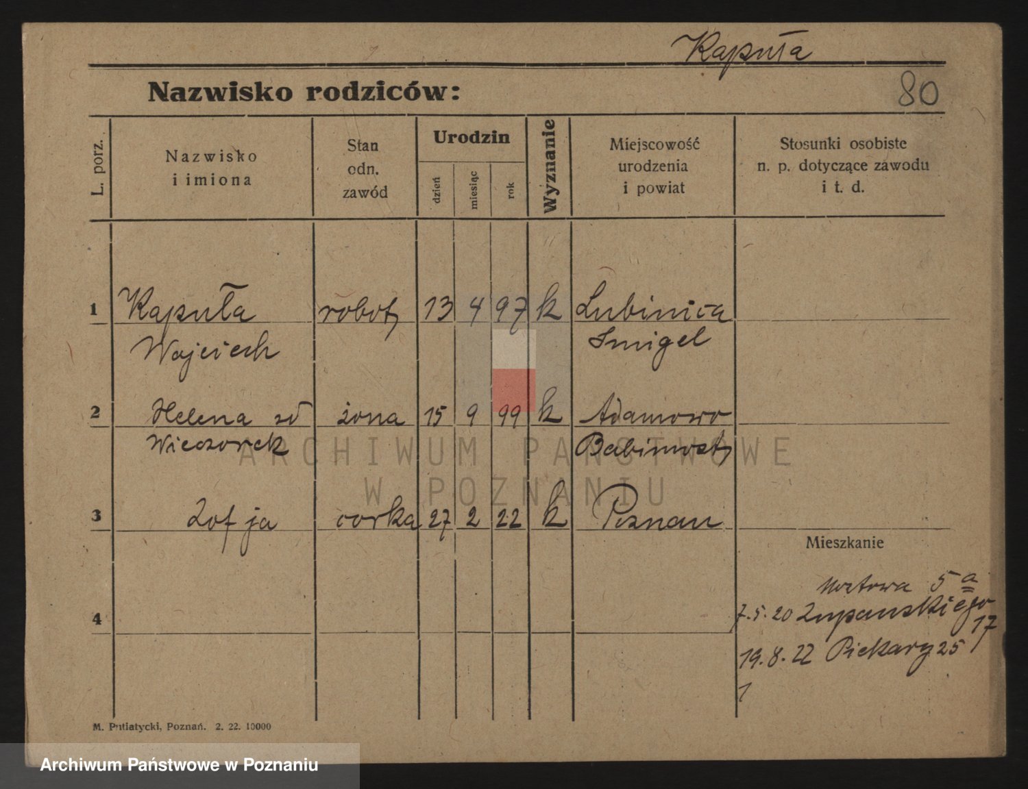 Podgląd karty osobowej dostępny jest po kliknięciu na nazwisko lub ikonkę karty. Można dokonywać powiększenia (ikony na górze) lub przechodzić między kolejnymi skanami (strzałki po bokach).