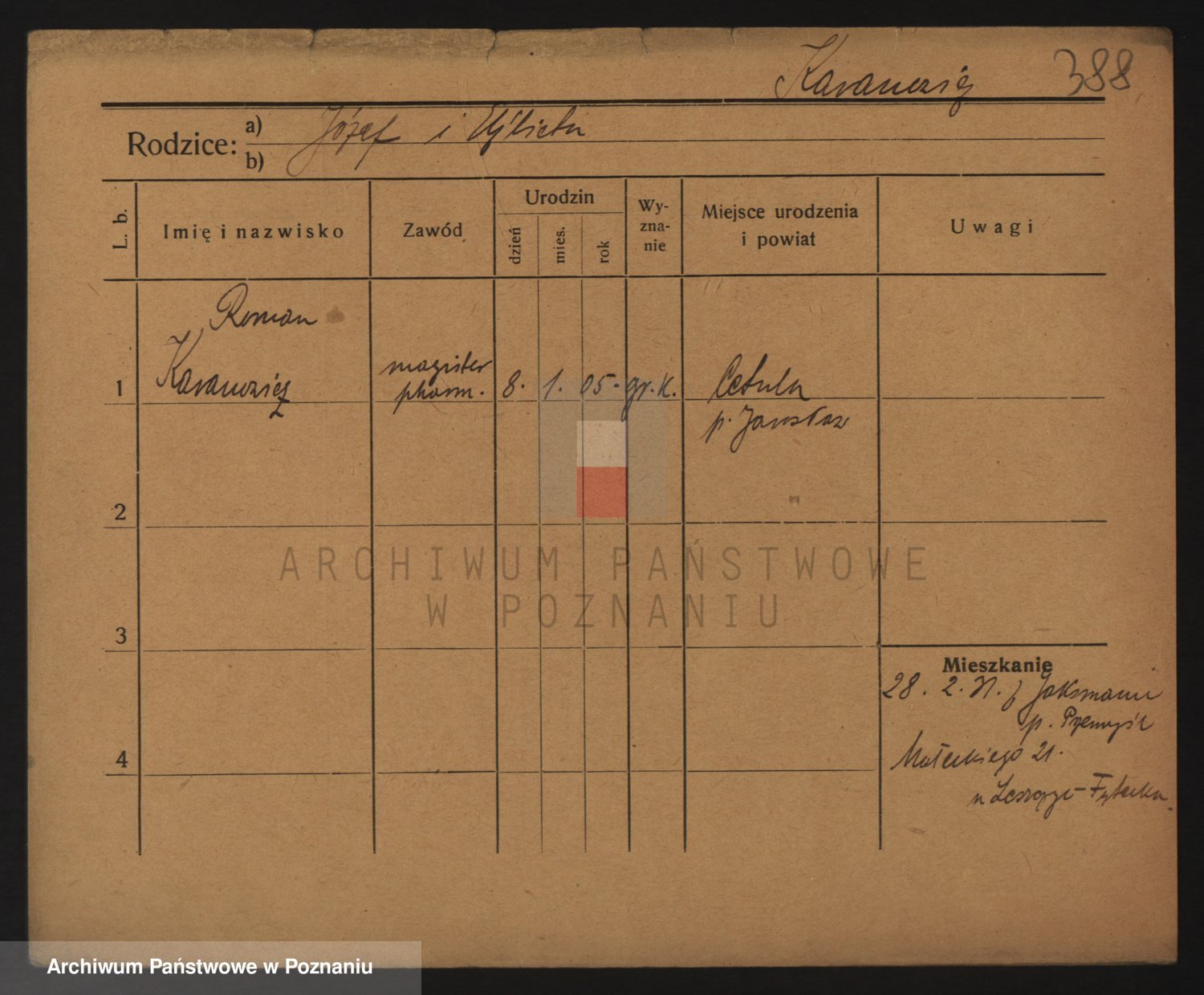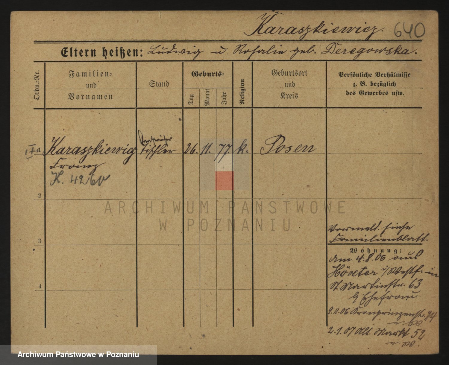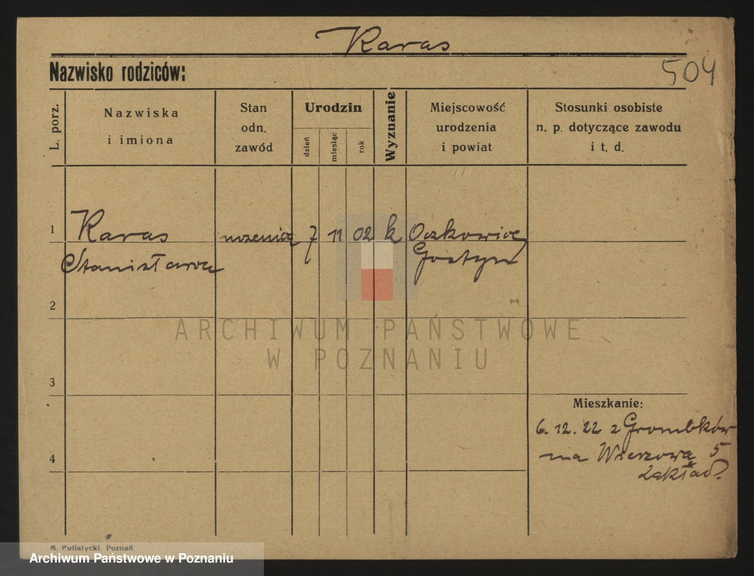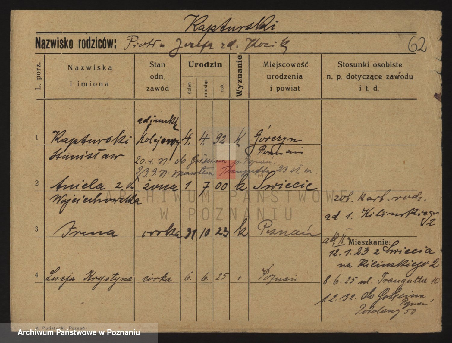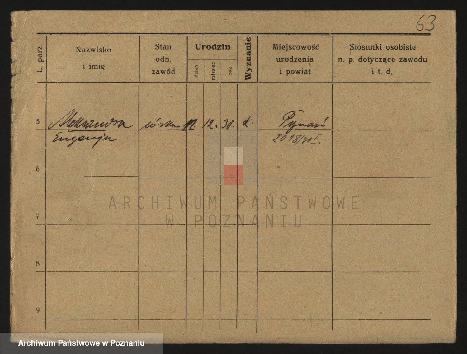 Podgląd karty osobowej dostępny jest po kliknięciu na nazwisko lub ikonkę karty. Można dokonywać powiększenia (ikony na górze) lub przechodzić między kolejnymi skanami (strzałki po bokach).