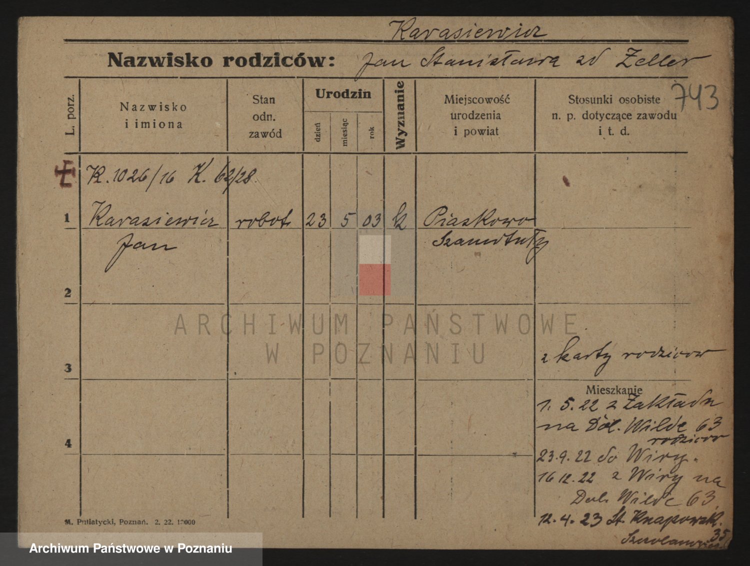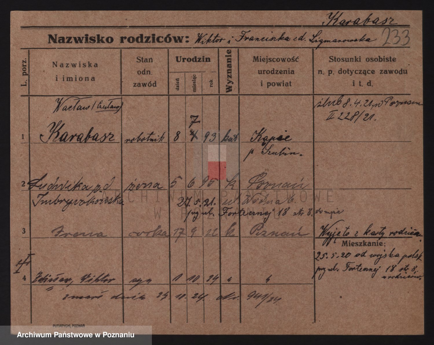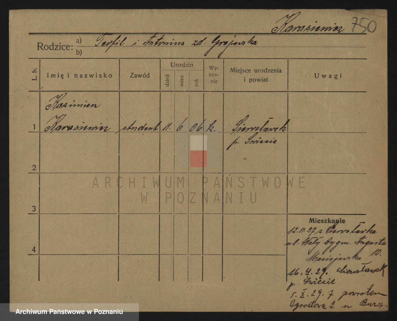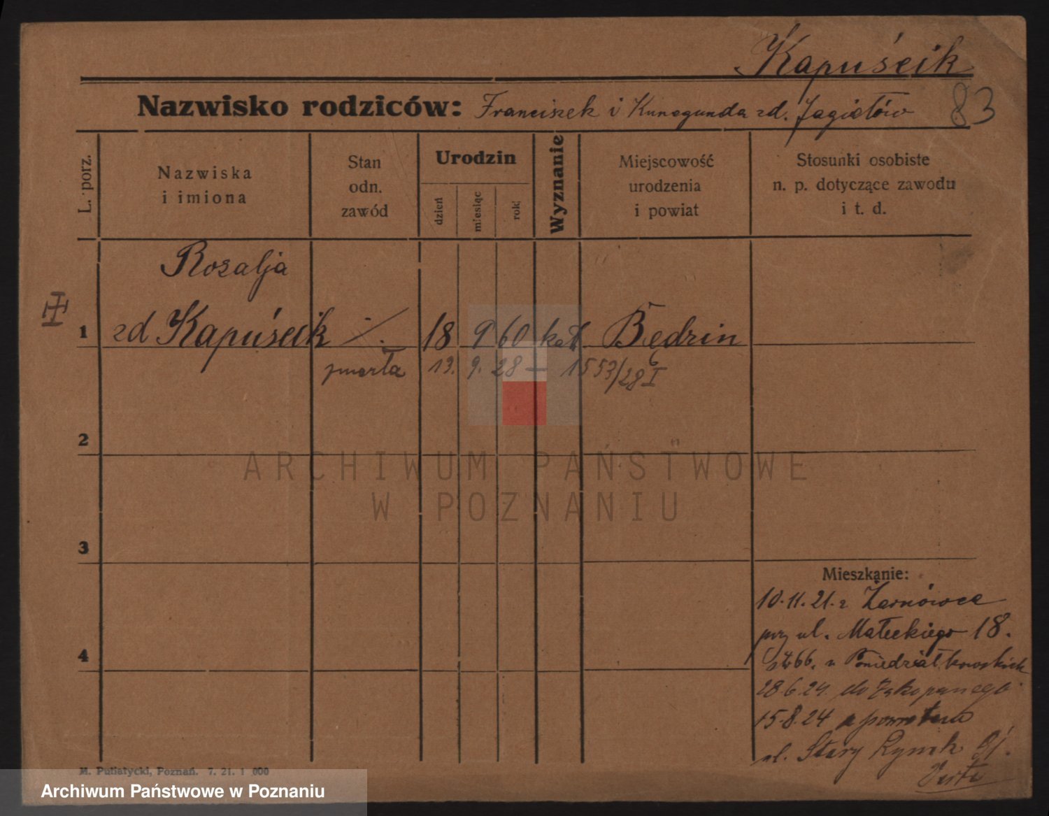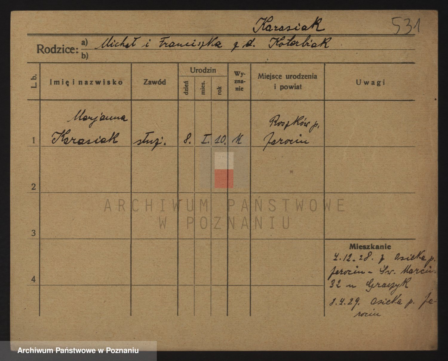 Podgląd karty osobowej dostępny jest po kliknięciu na nazwisko lub ikonkę karty. Można dokonywać powiększenia (ikony na górze) lub przechodzić między kolejnymi skanami (strzałki po bokach).