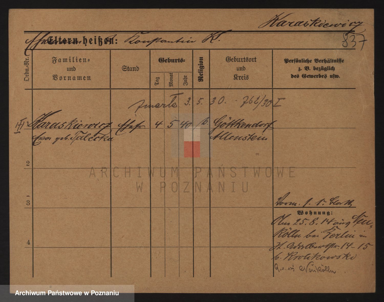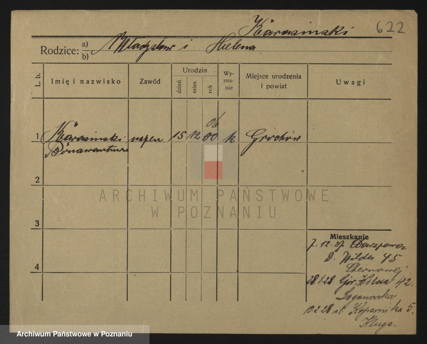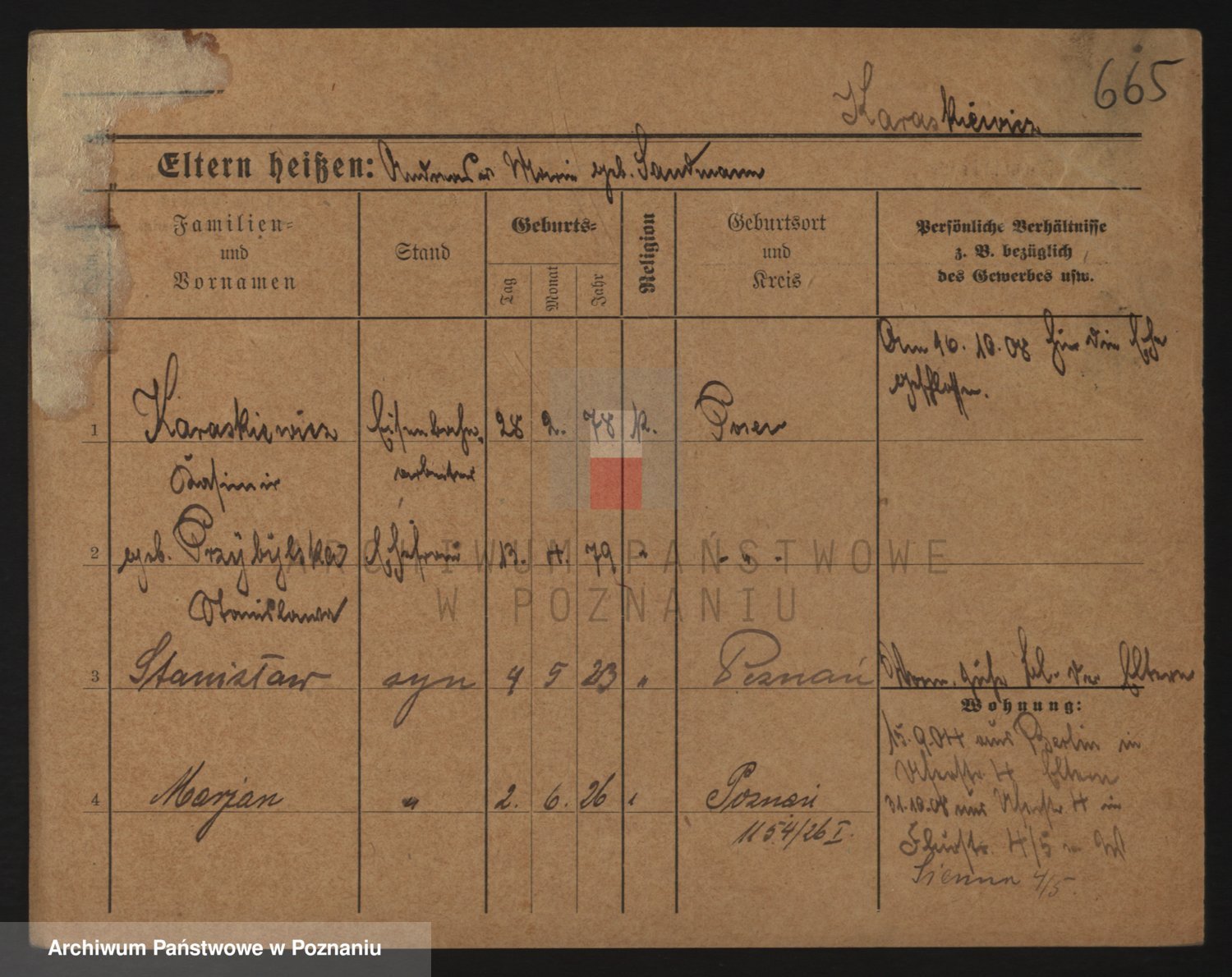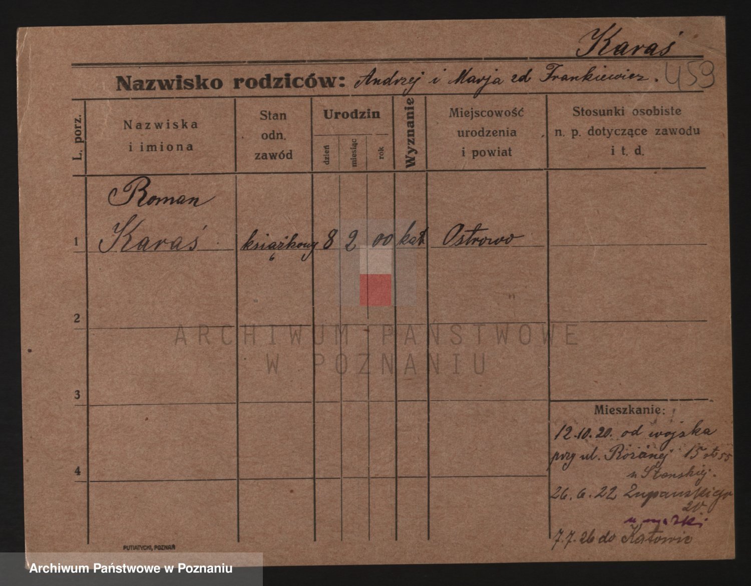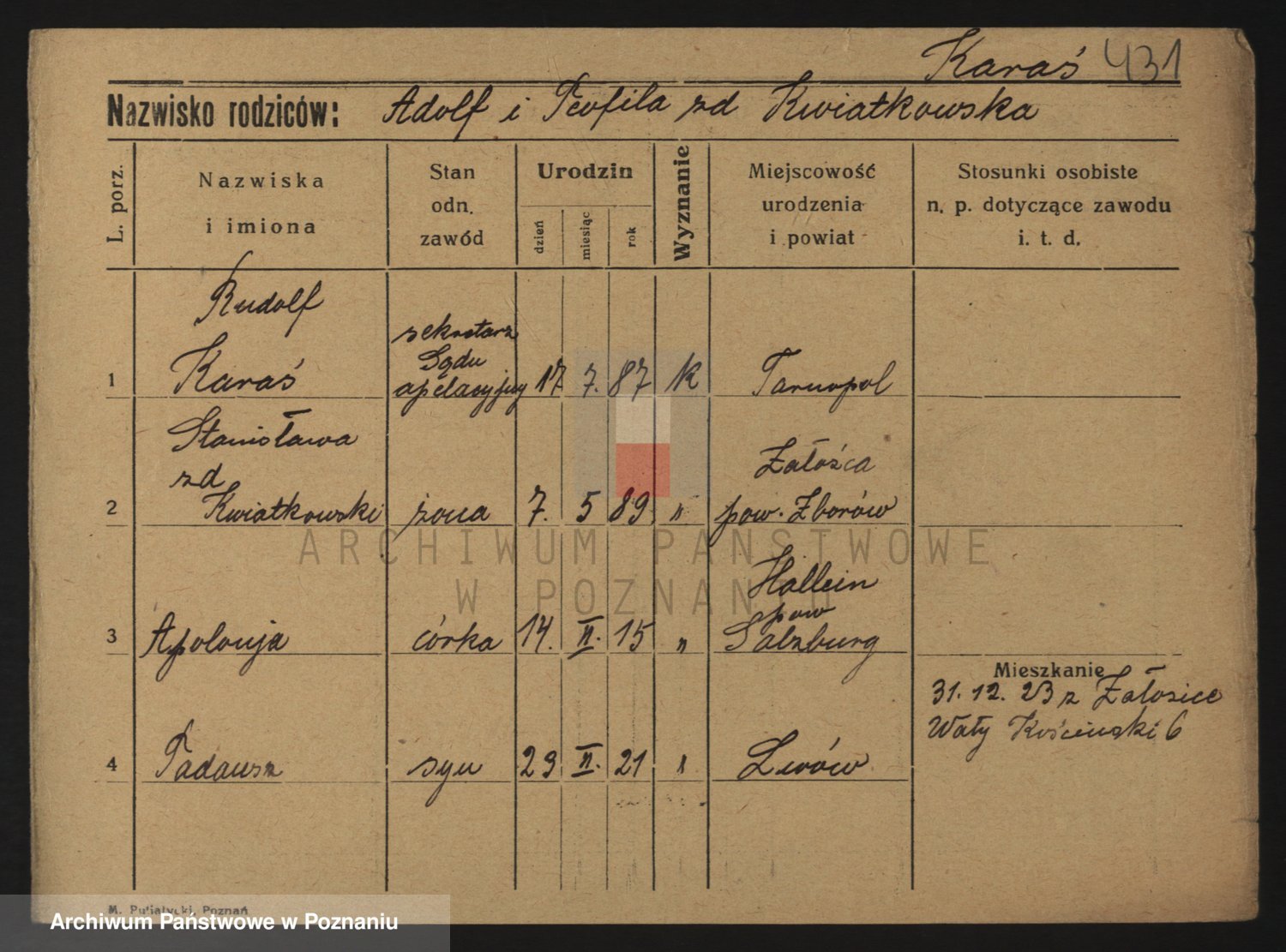 Podgląd karty osobowej dostępny jest po kliknięciu na nazwisko lub ikonkę karty. Można dokonywać powiększenia (ikony na górze) lub przechodzić między kolejnymi skanami (strzałki po bokach).