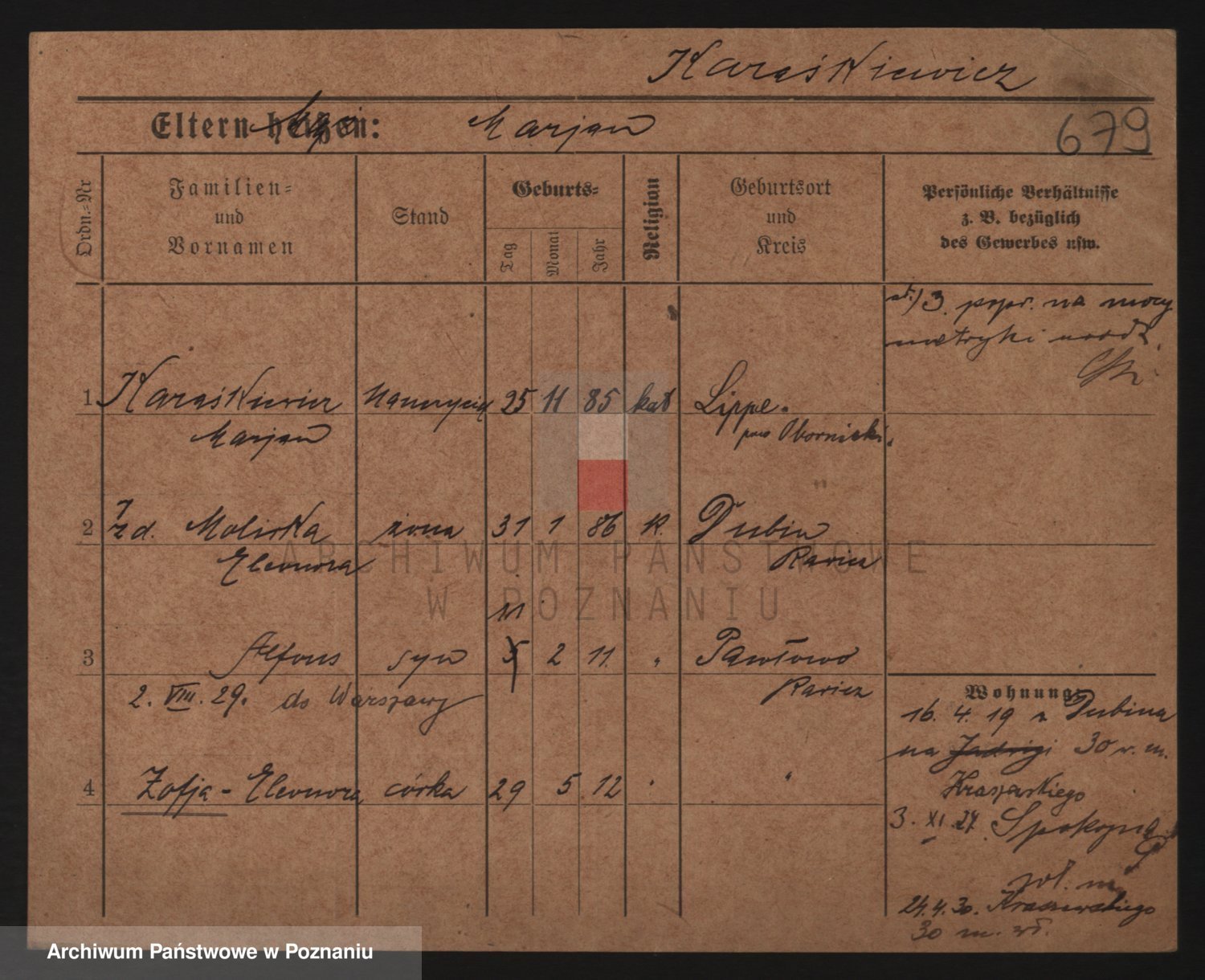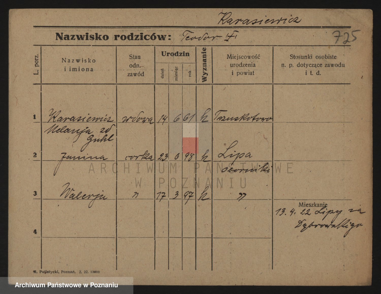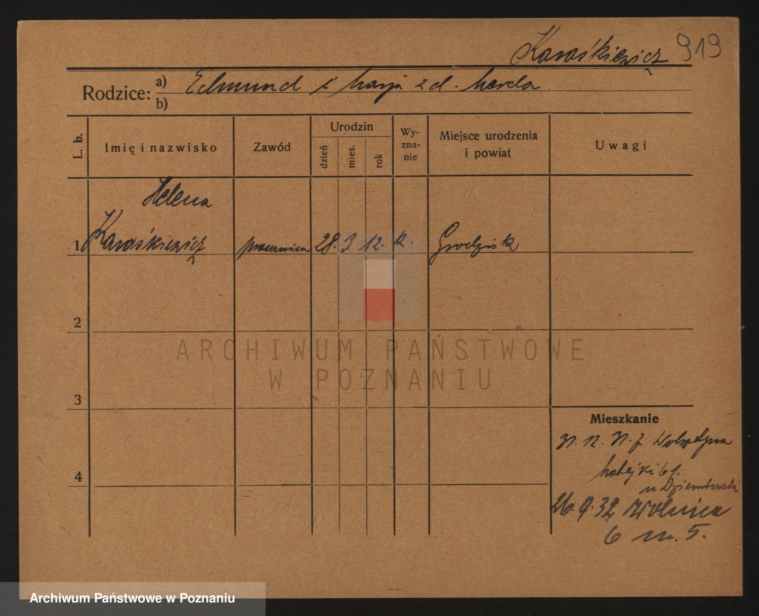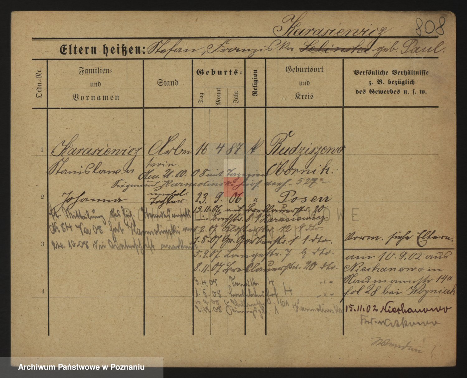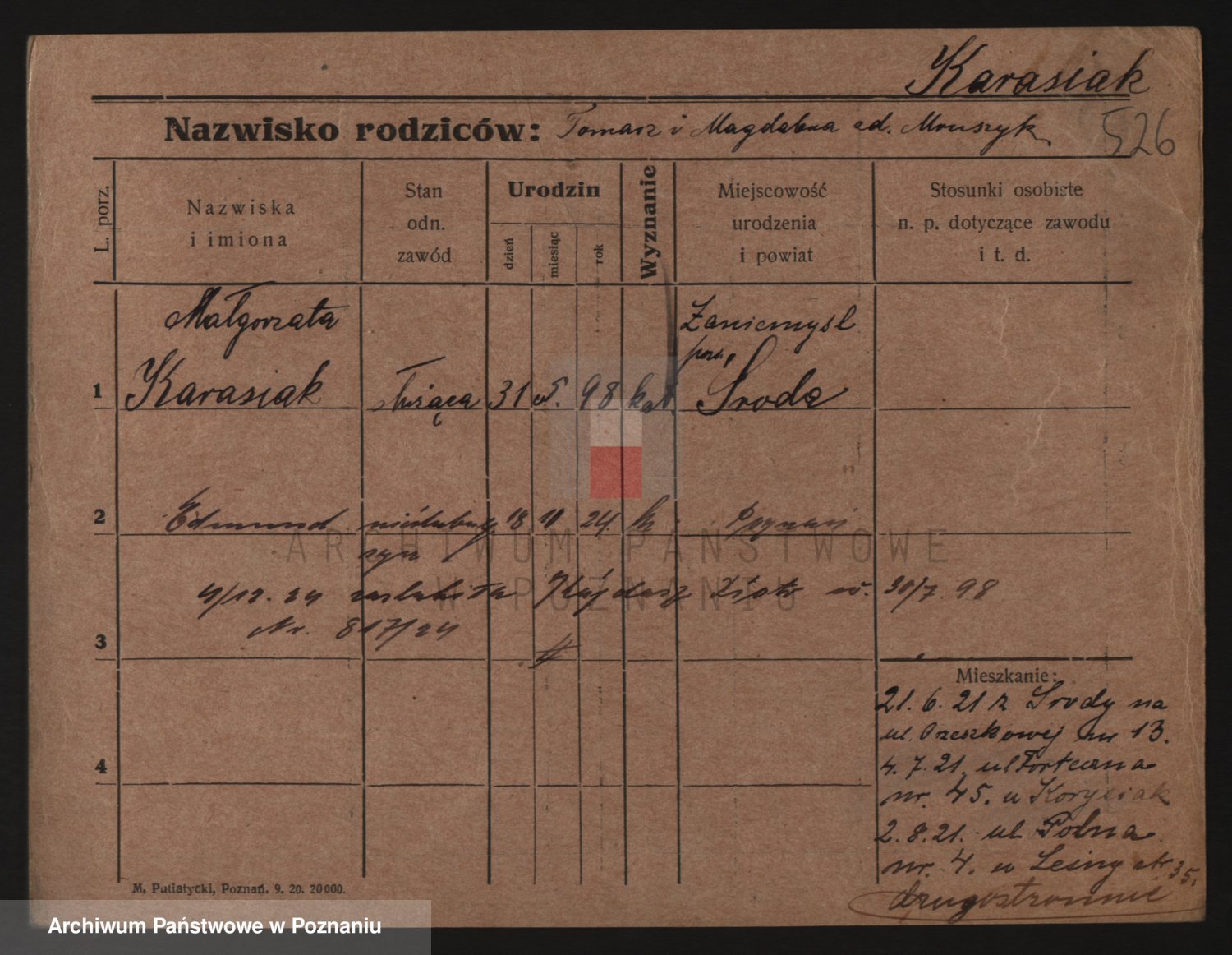 Podgląd karty osobowej dostępny jest po kliknięciu na nazwisko lub ikonkę karty. Można dokonywać powiększenia (ikony na górze) lub przechodzić między kolejnymi skanami (strzałki po bokach).