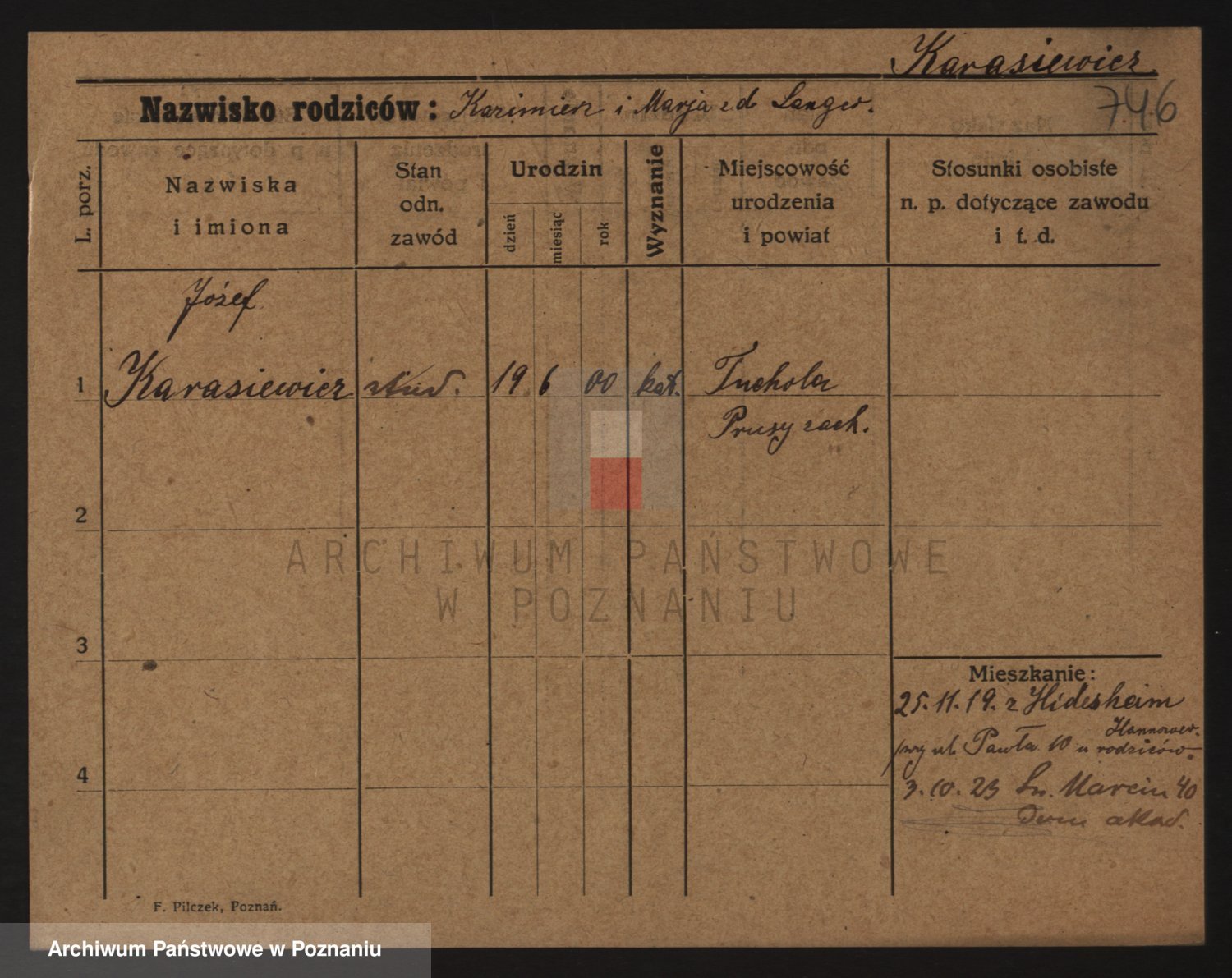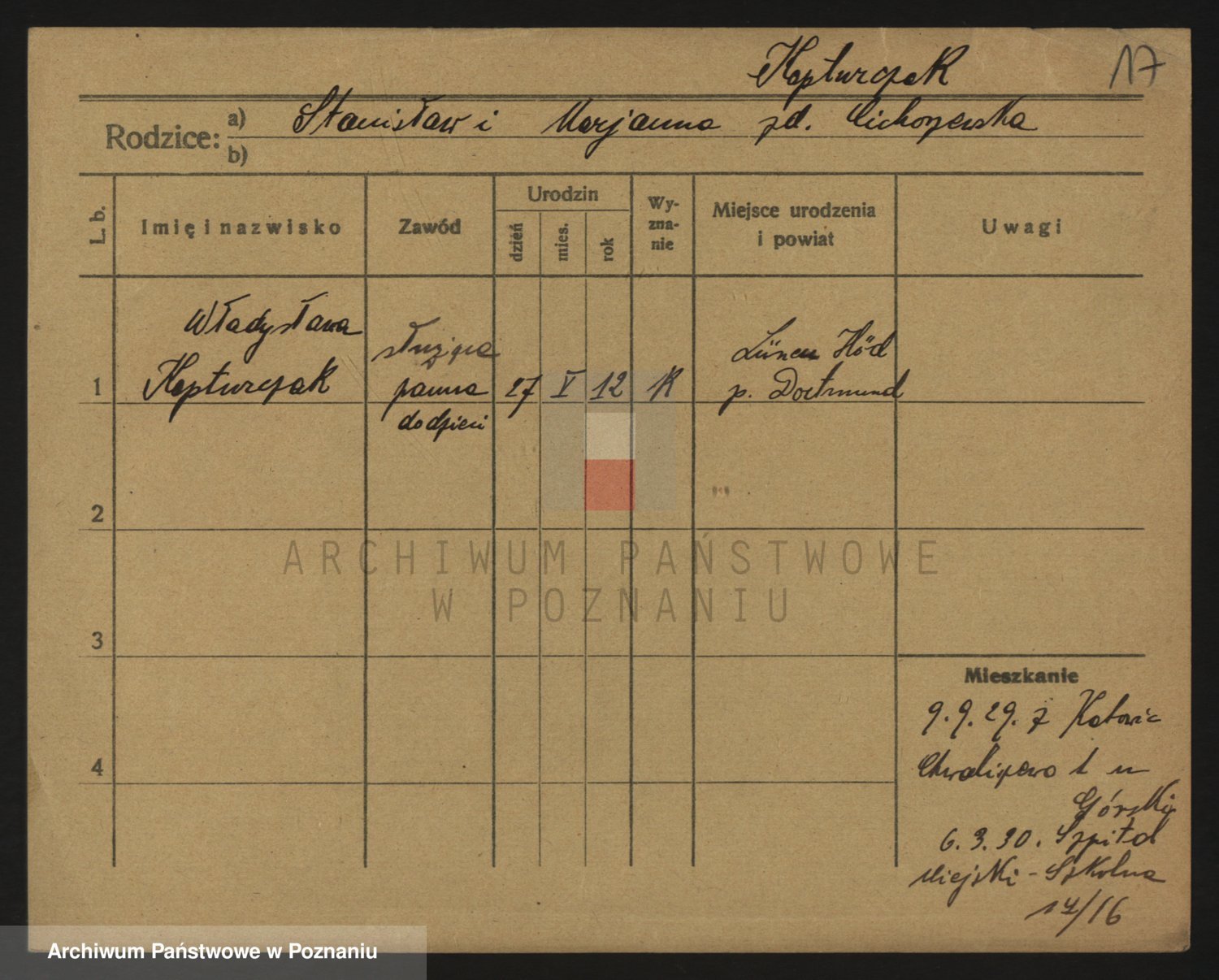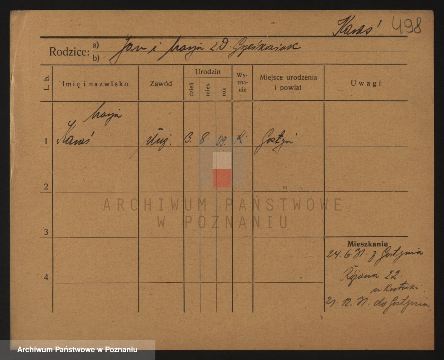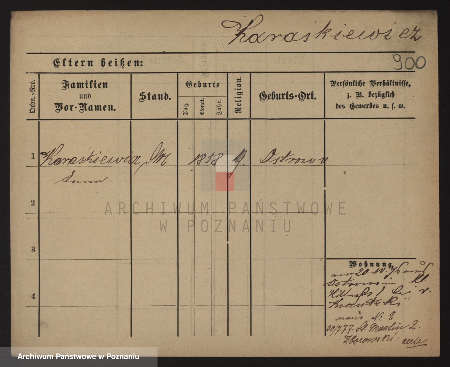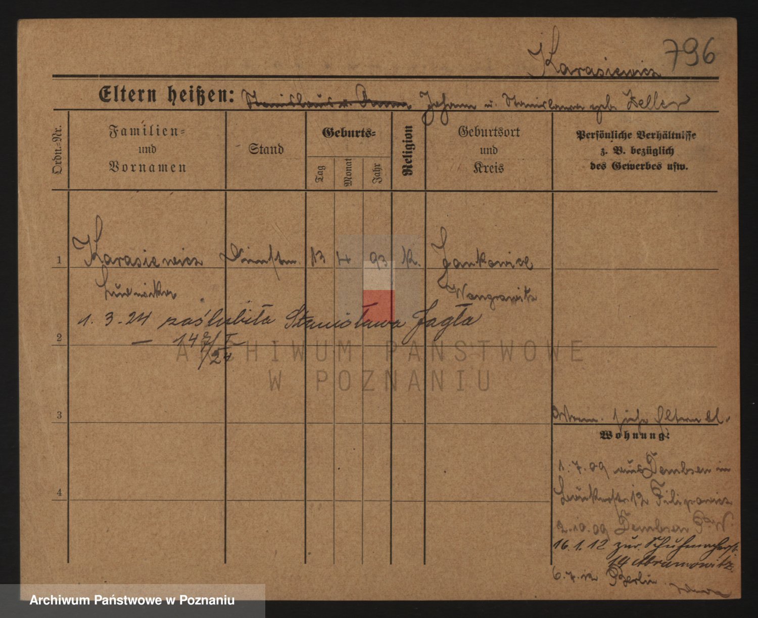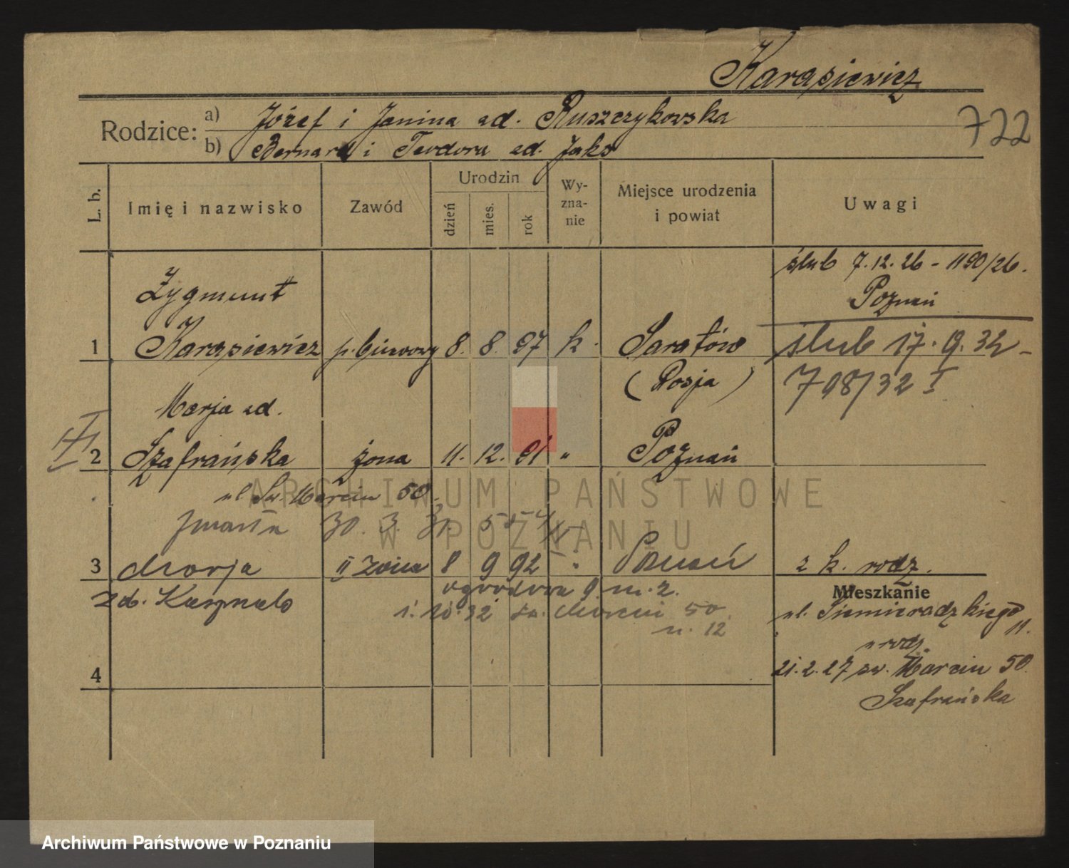 Podgląd karty osobowej dostępny jest po kliknięciu na nazwisko lub ikonkę karty. Można dokonywać powiększenia (ikony na górze) lub przechodzić między kolejnymi skanami (strzałki po bokach).