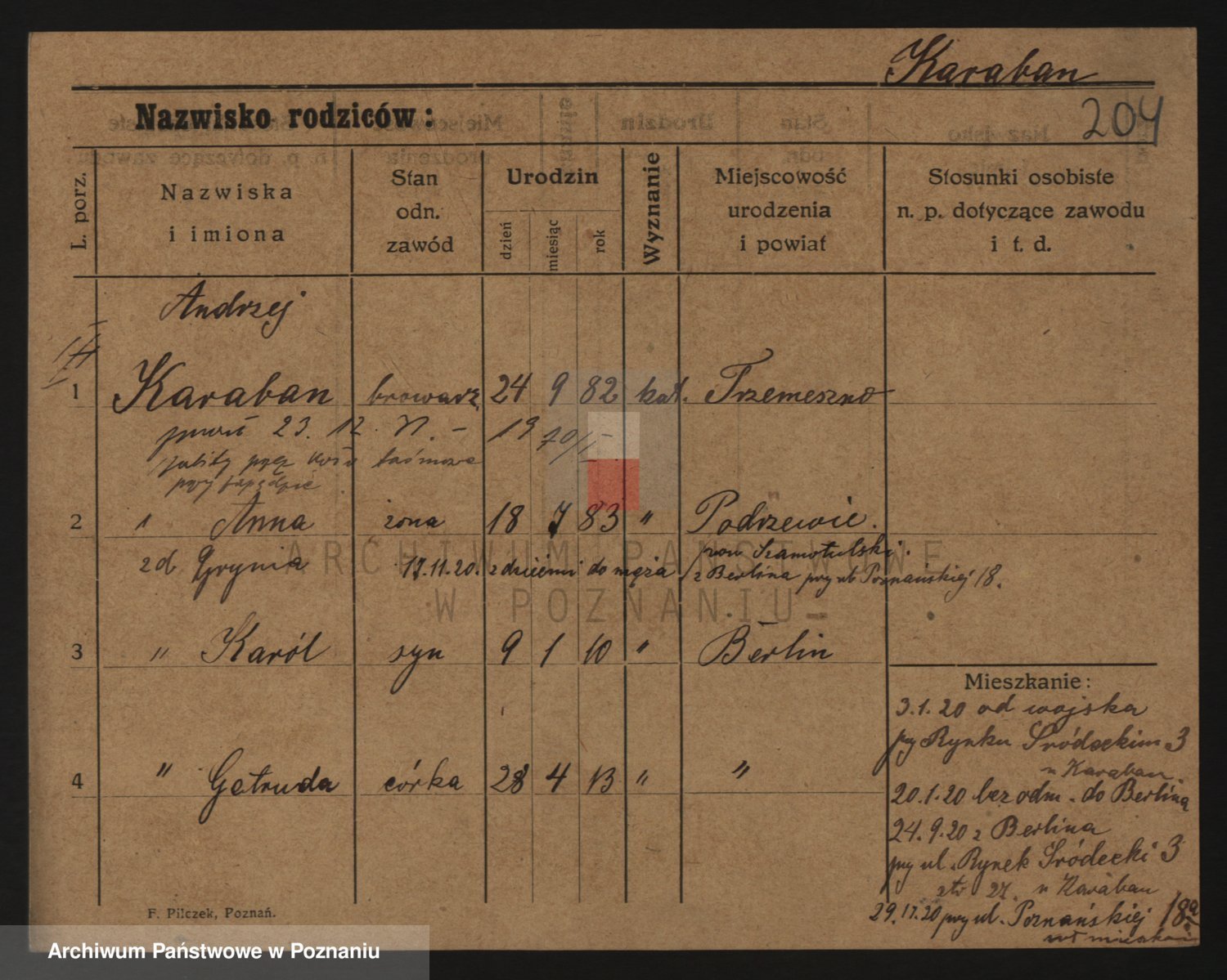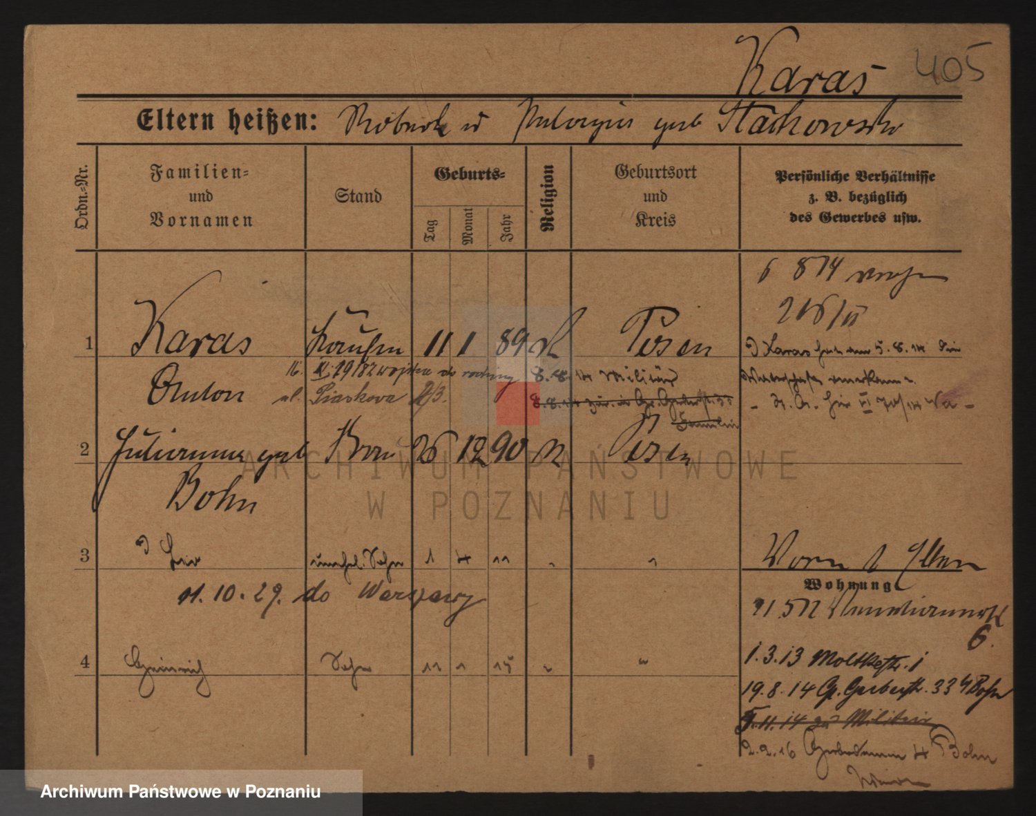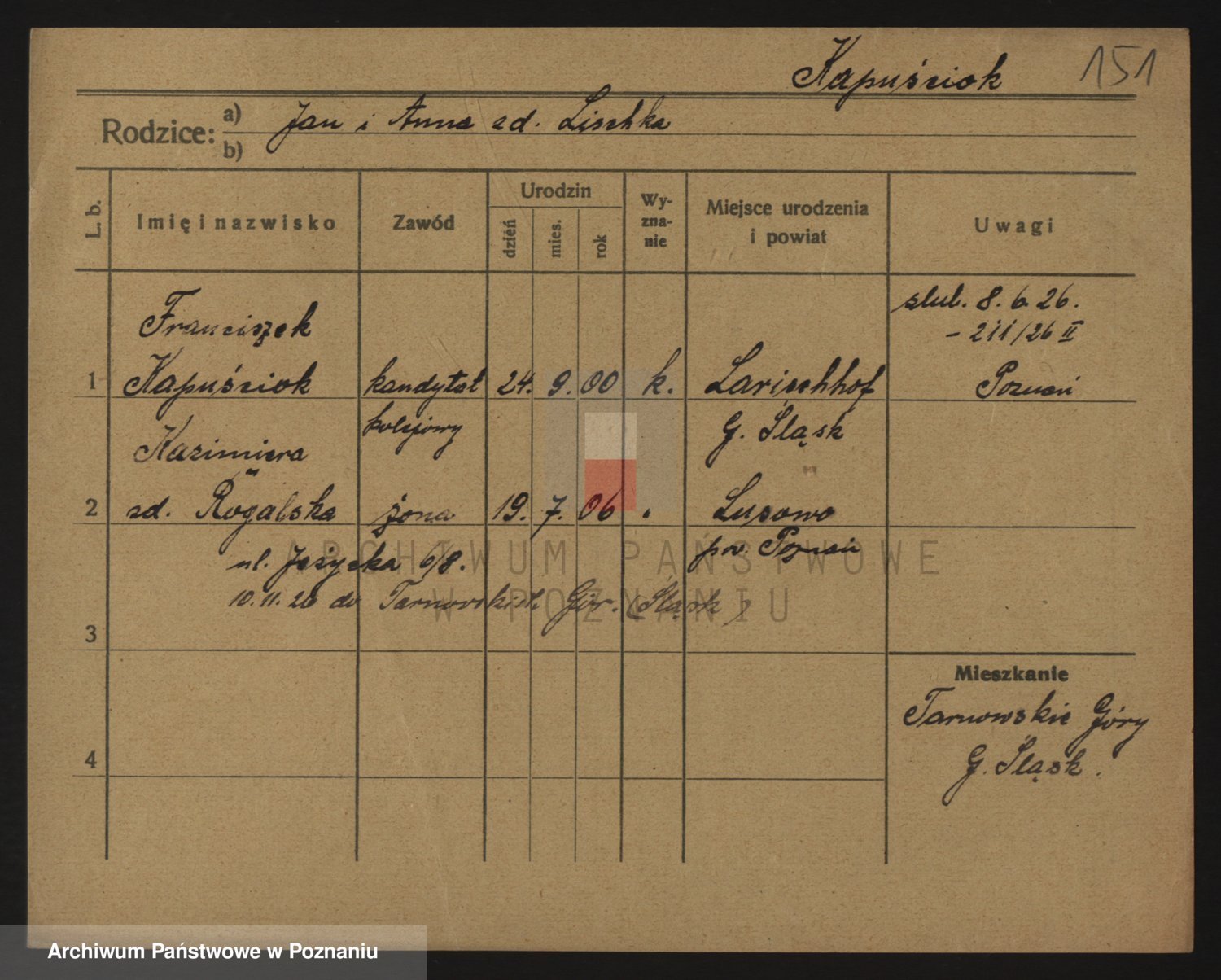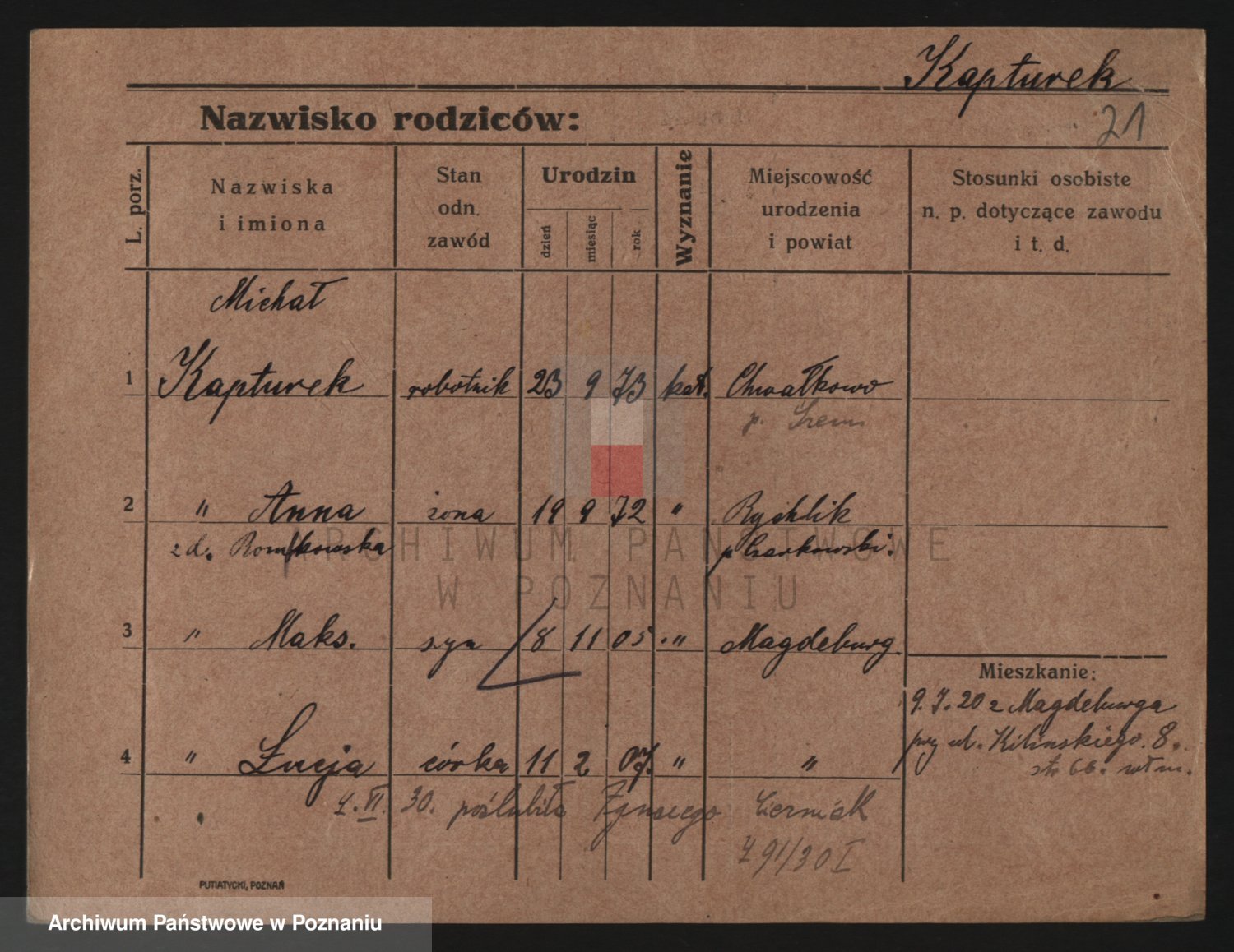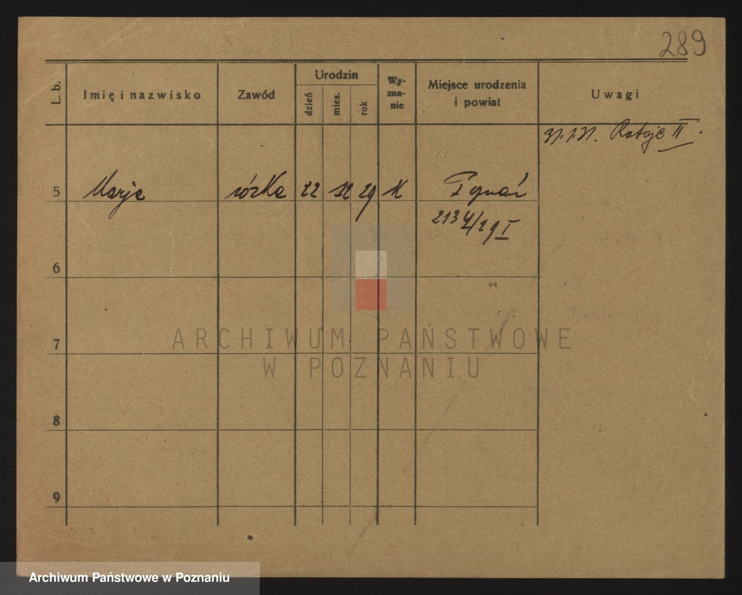 Podgląd karty osobowej dostępny jest po kliknięciu na nazwisko lub ikonkę karty. Można dokonywać powiększenia (ikony na górze) lub przechodzić między kolejnymi skanami (strzałki po bokach).