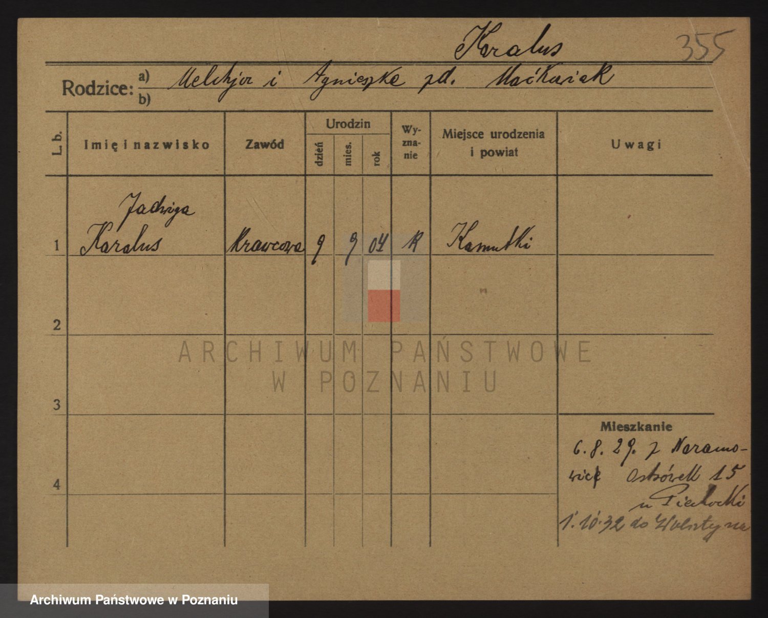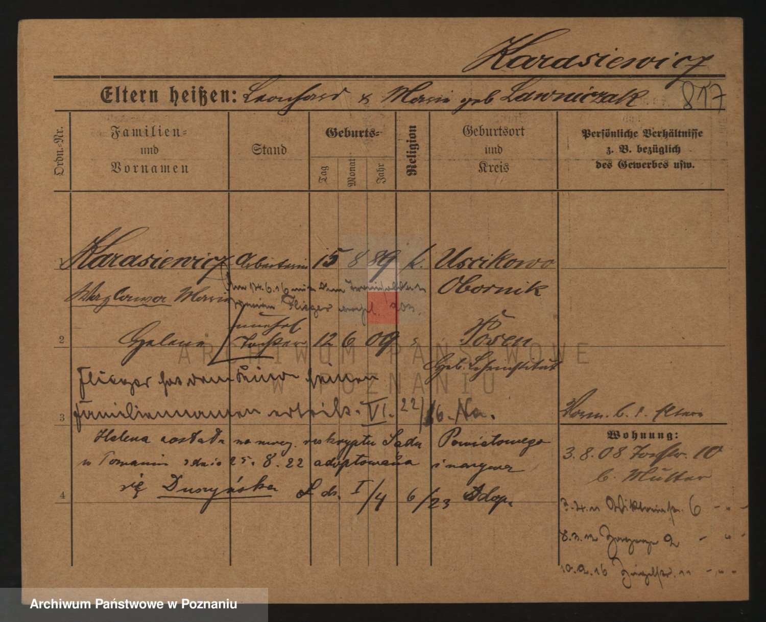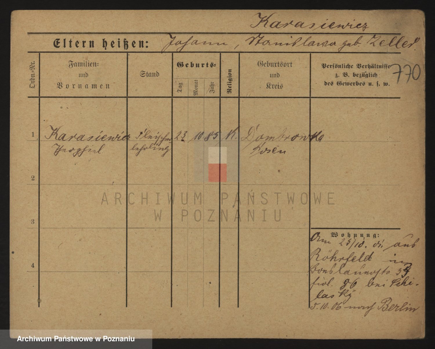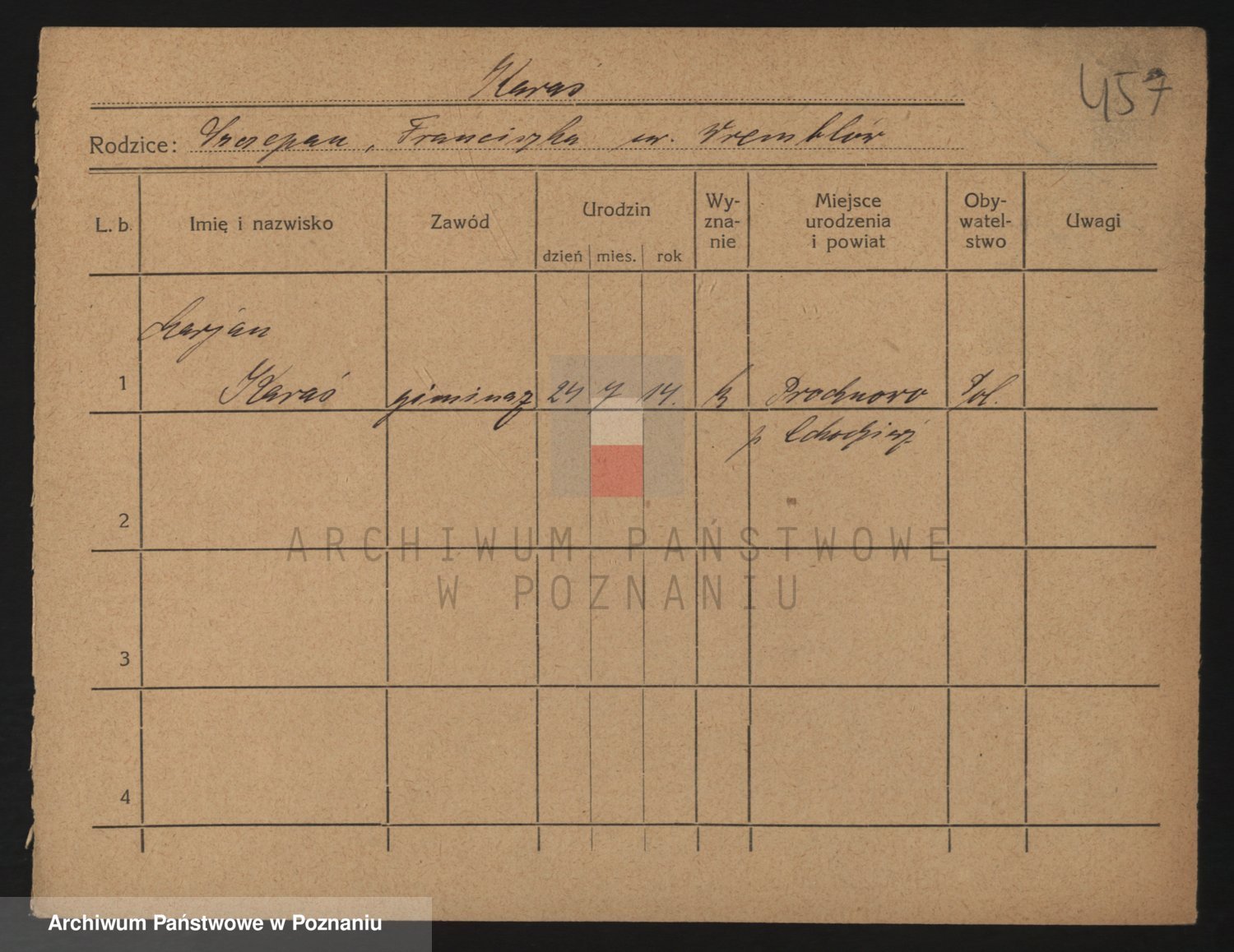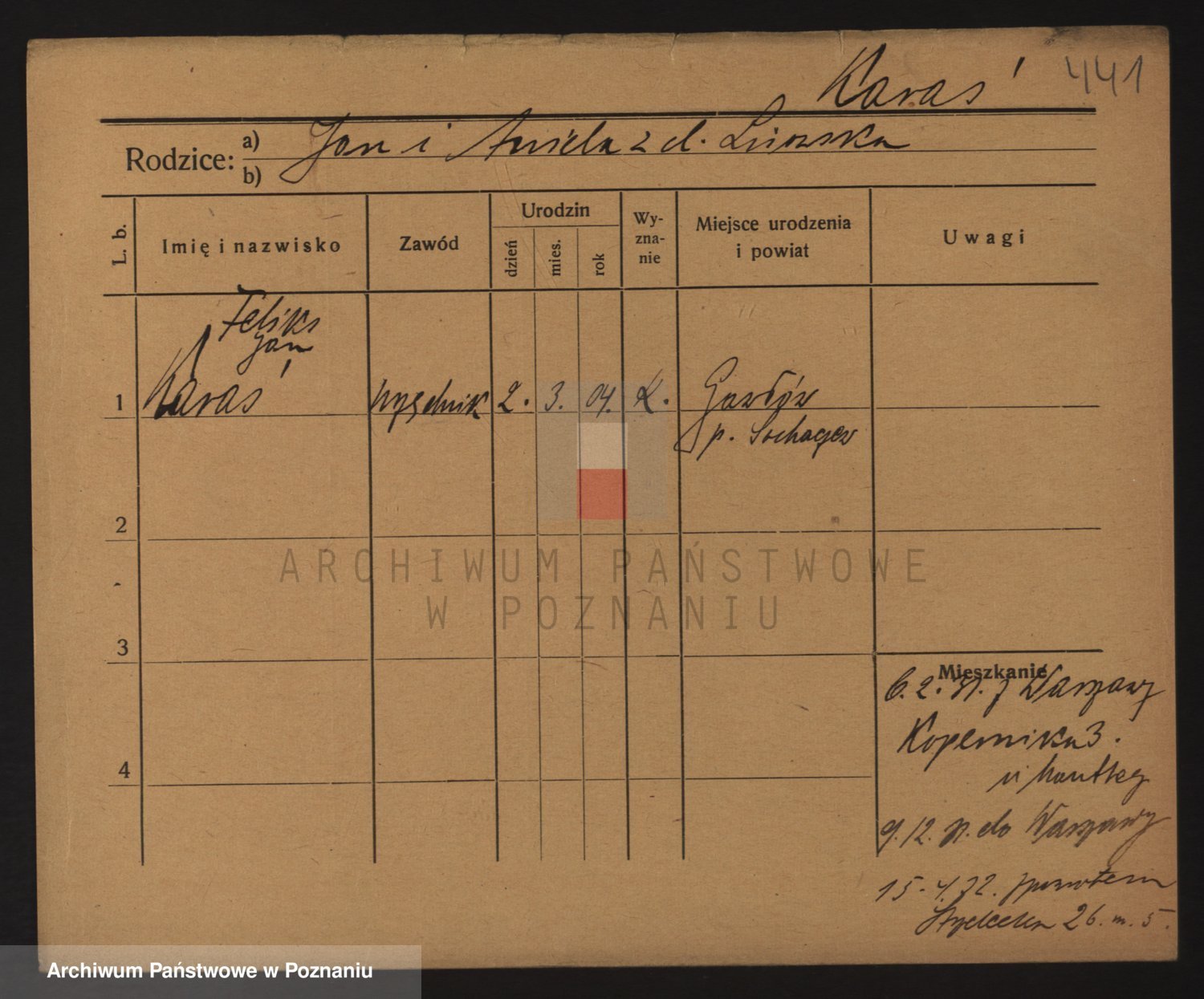 Podgląd karty osobowej dostępny jest po kliknięciu na nazwisko lub ikonkę karty. Można dokonywać powiększenia (ikony na górze) lub przechodzić między kolejnymi skanami (strzałki po bokach).