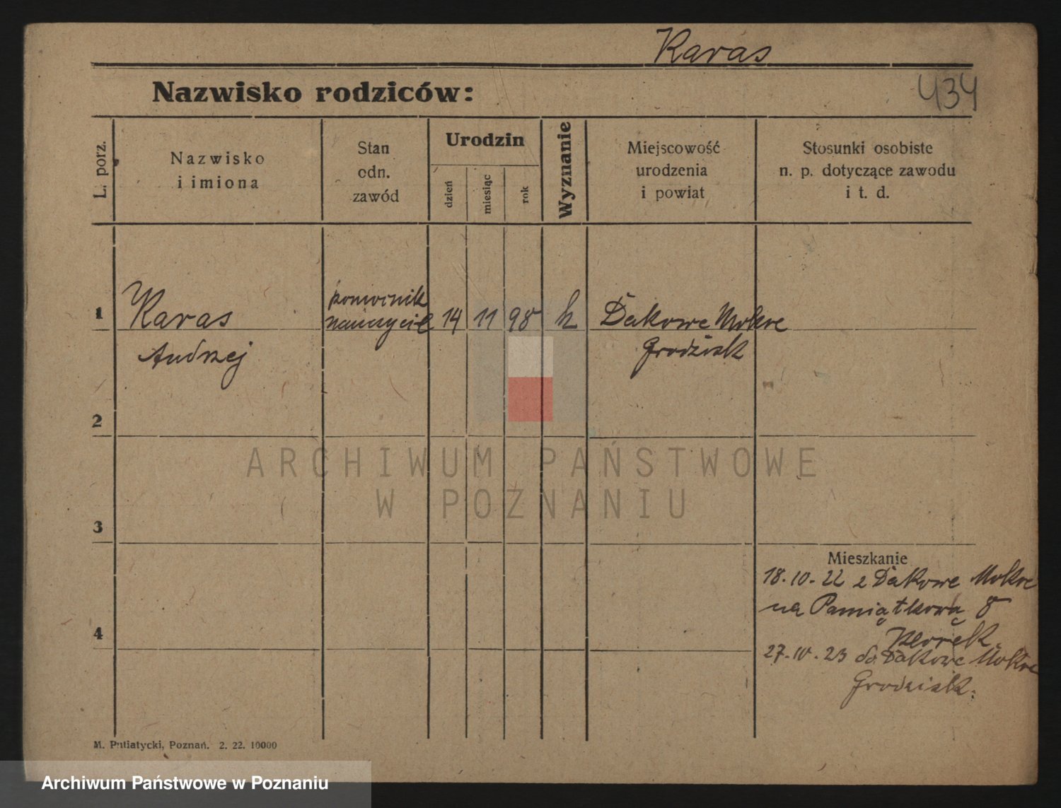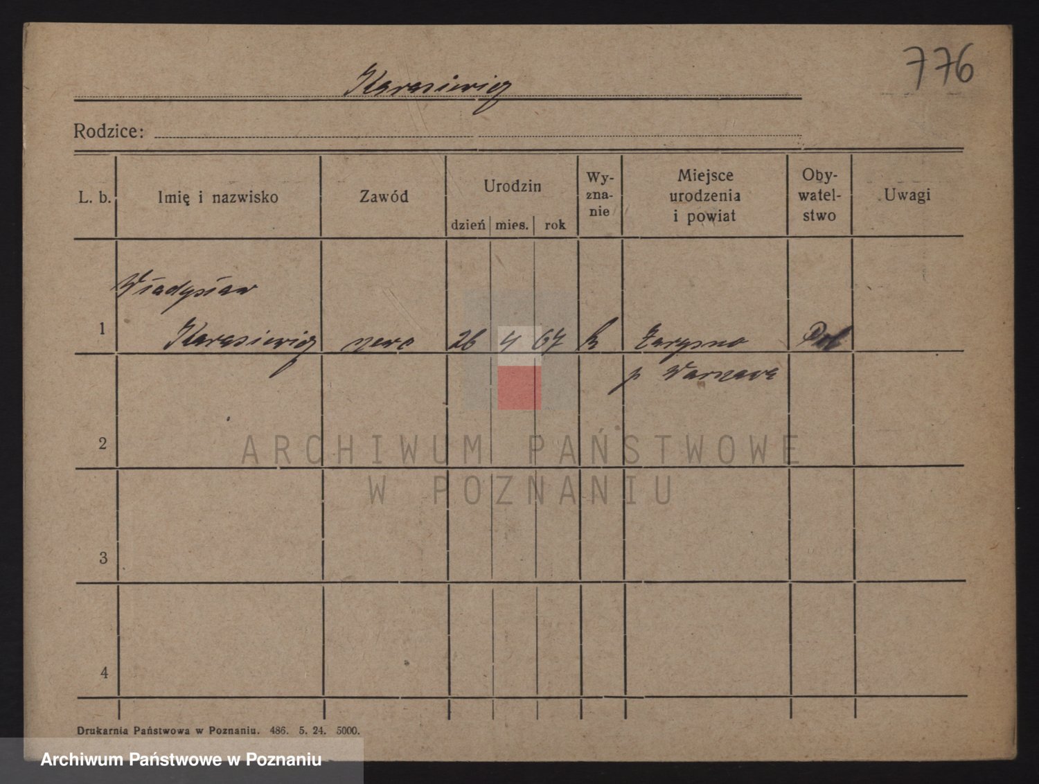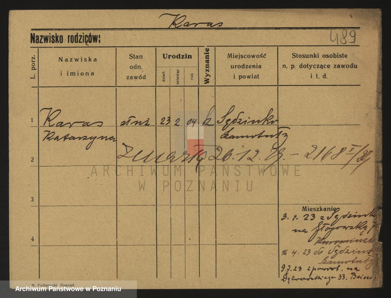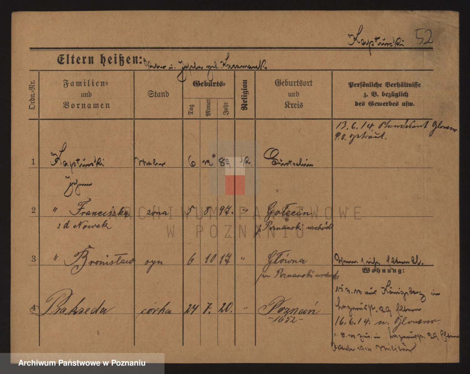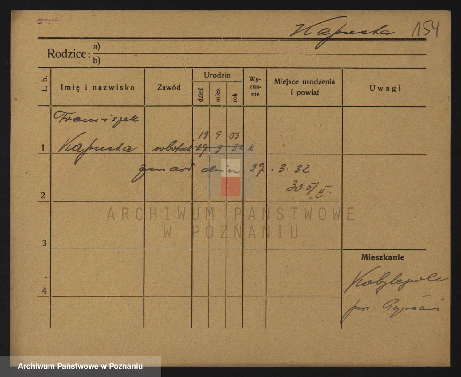 Podgląd karty osobowej dostępny jest po kliknięciu na nazwisko lub ikonkę karty. Można dokonywać powiększenia (ikony na górze) lub przechodzić między kolejnymi skanami (strzałki po bokach).