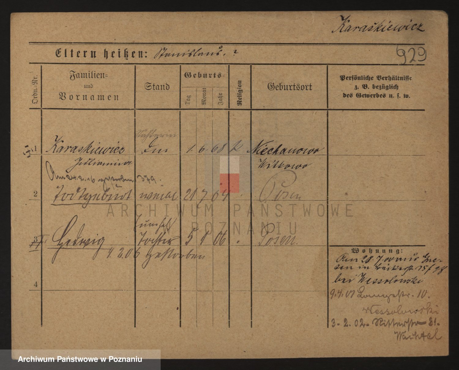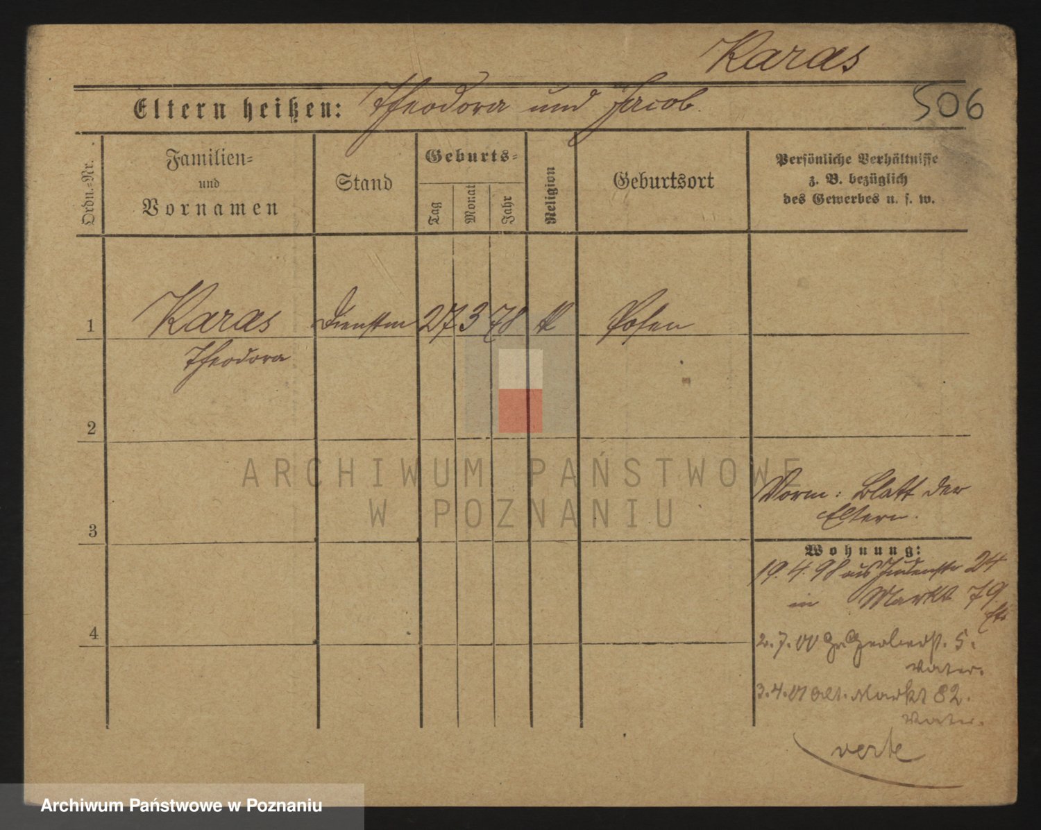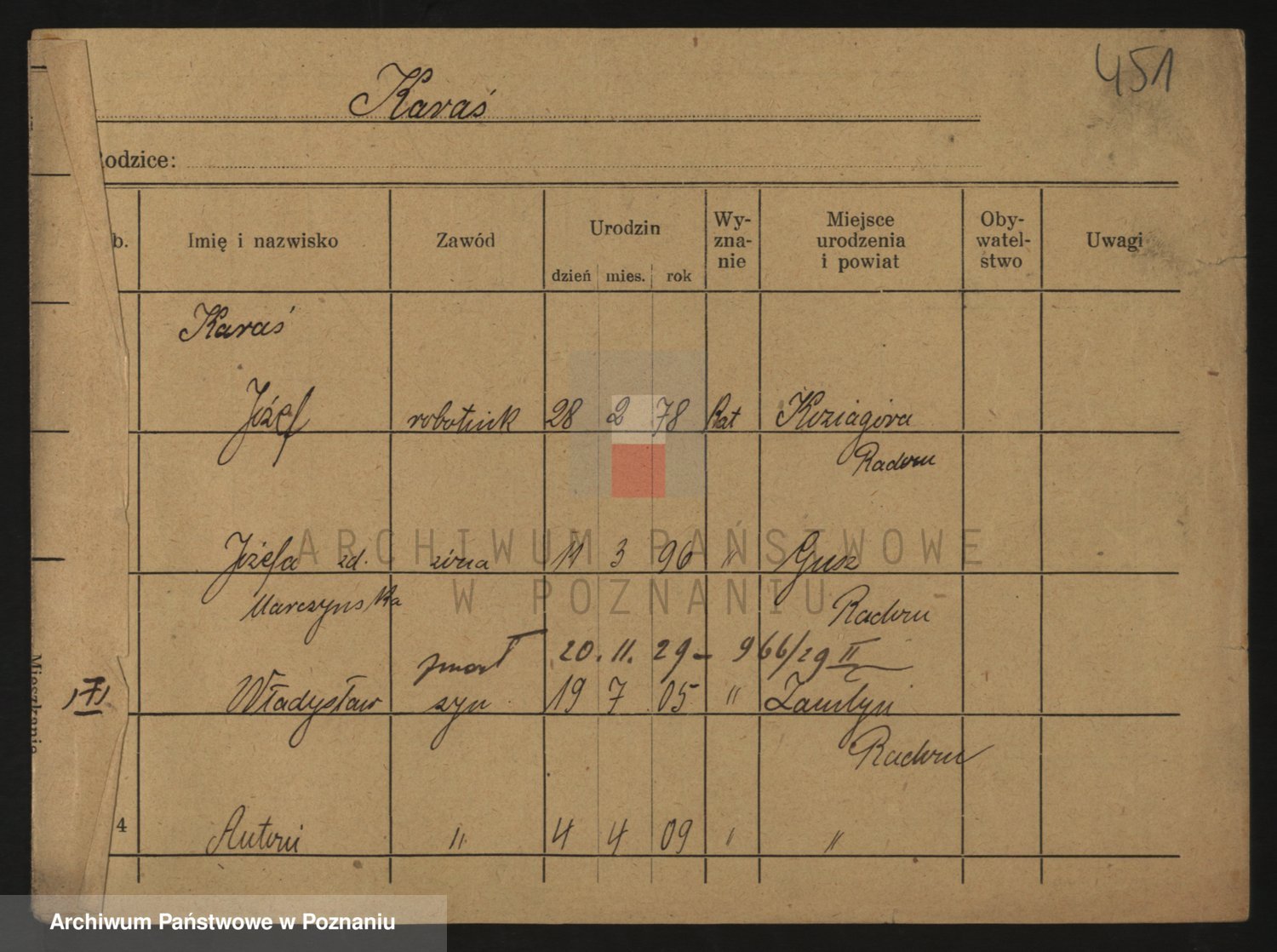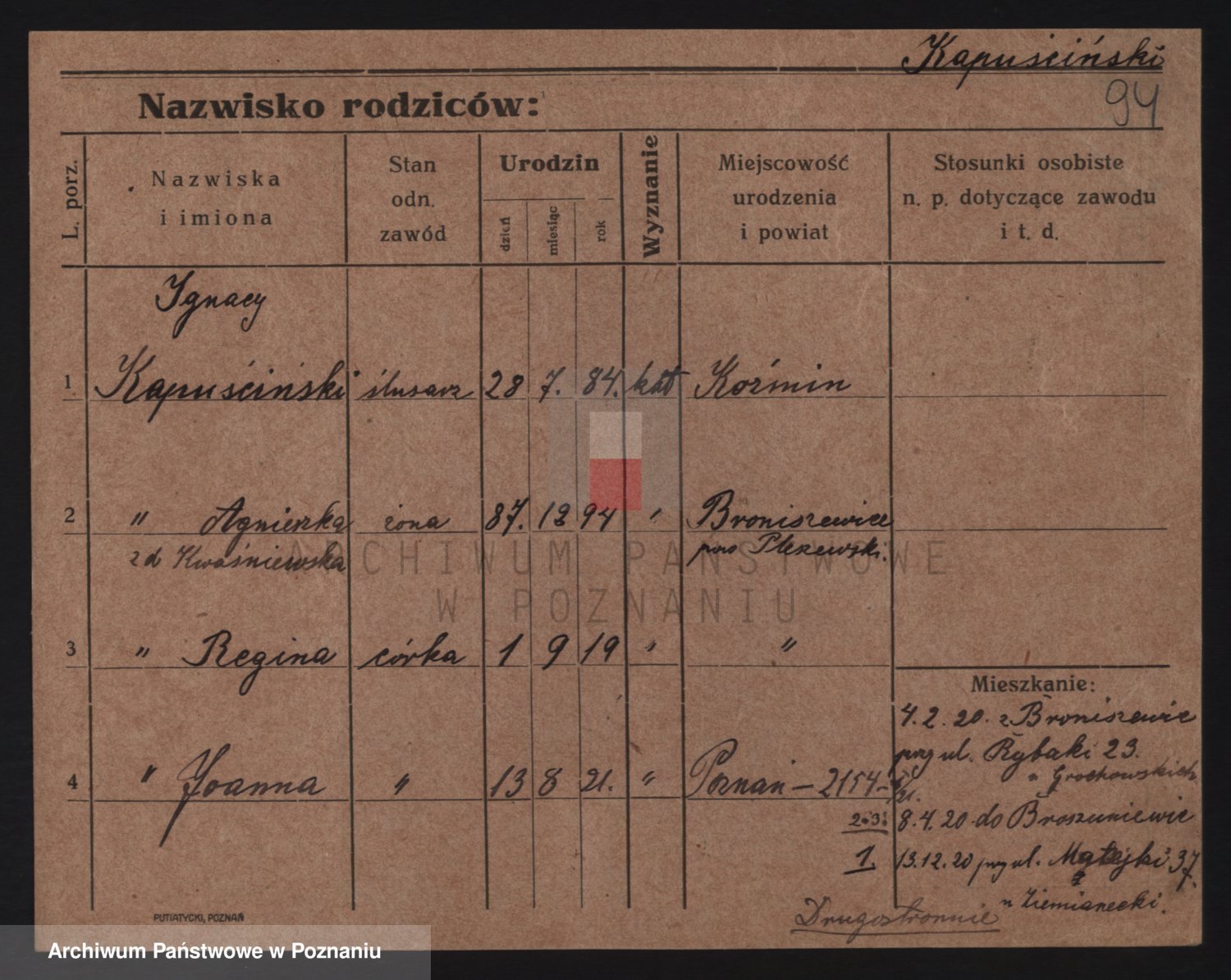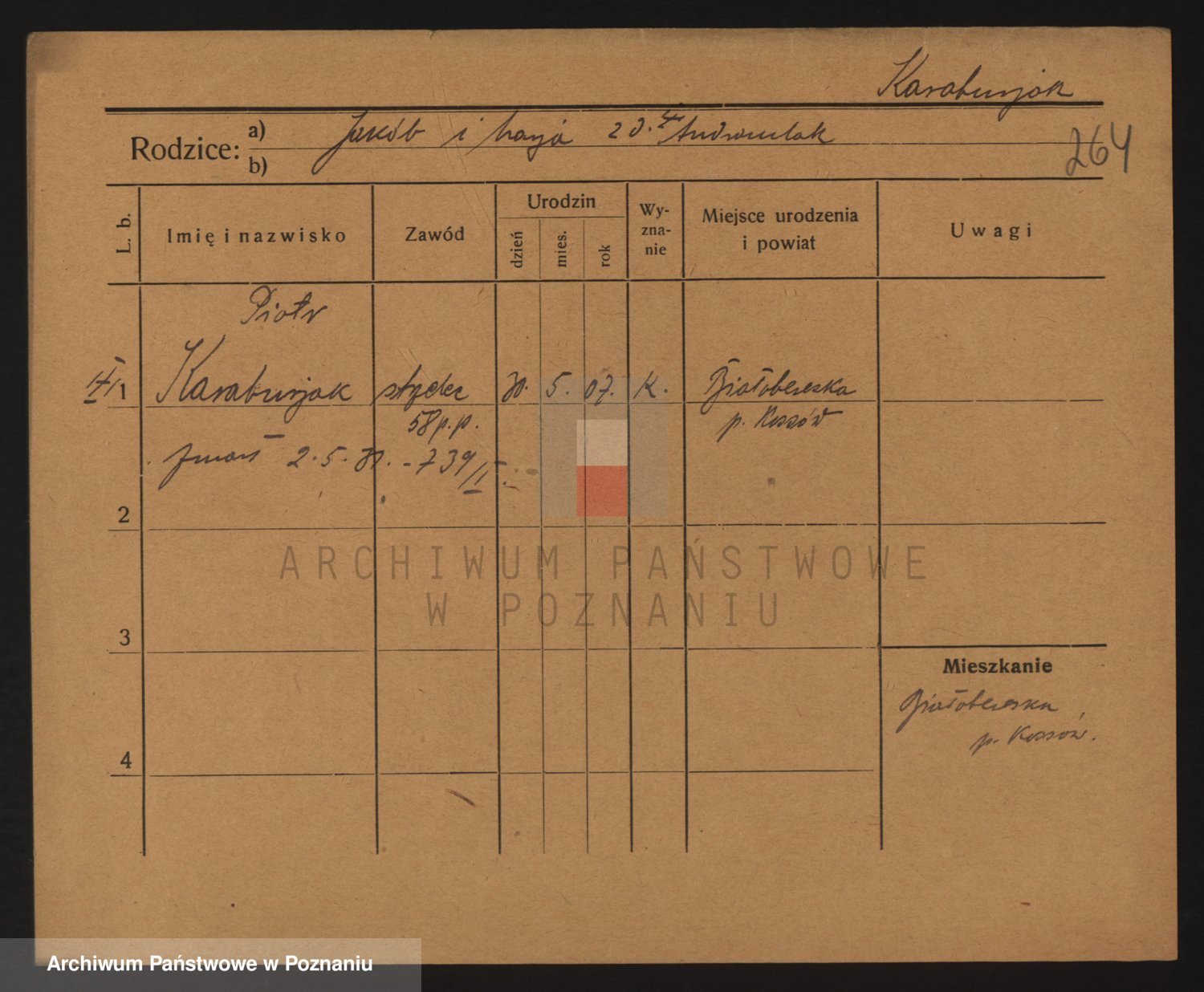 Podgląd karty osobowej dostępny jest po kliknięciu na nazwisko lub ikonkę karty. Można dokonywać powiększenia (ikony na górze) lub przechodzić między kolejnymi skanami (strzałki po bokach).