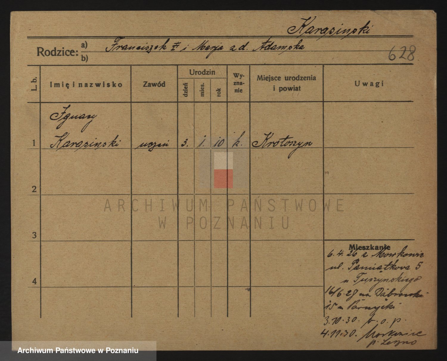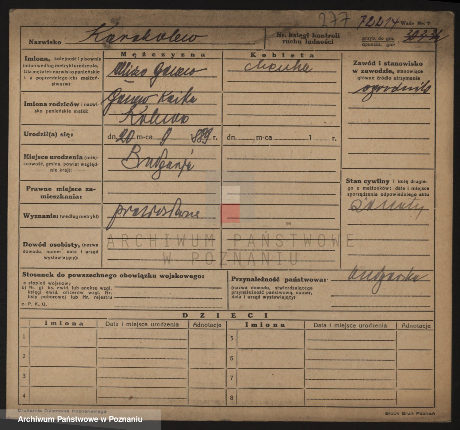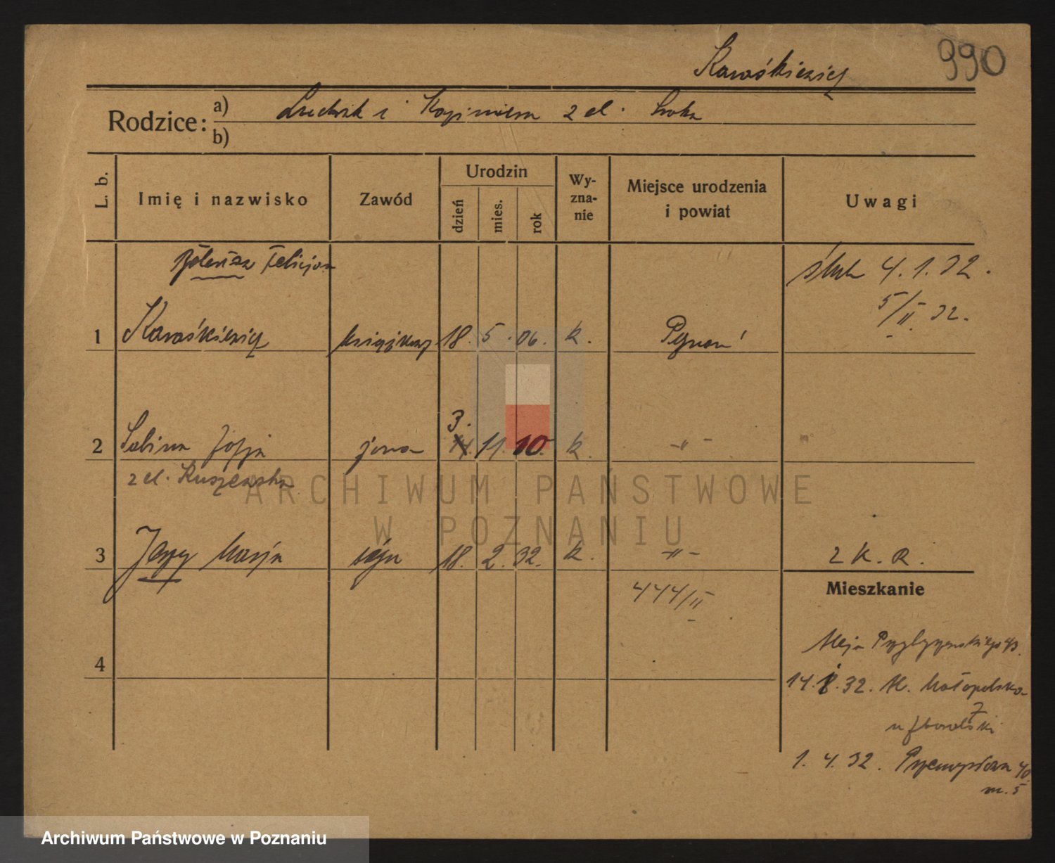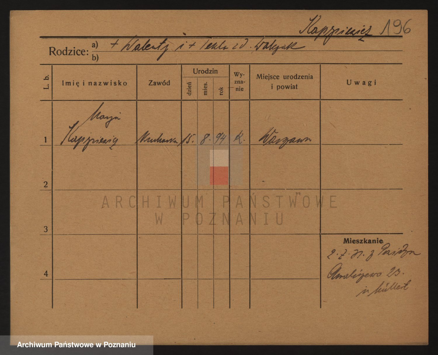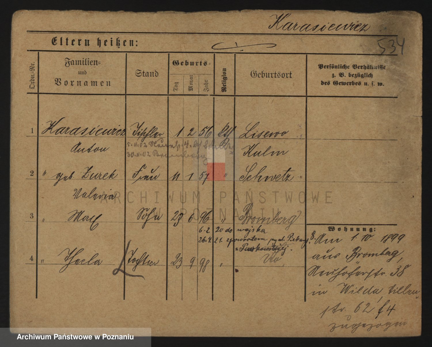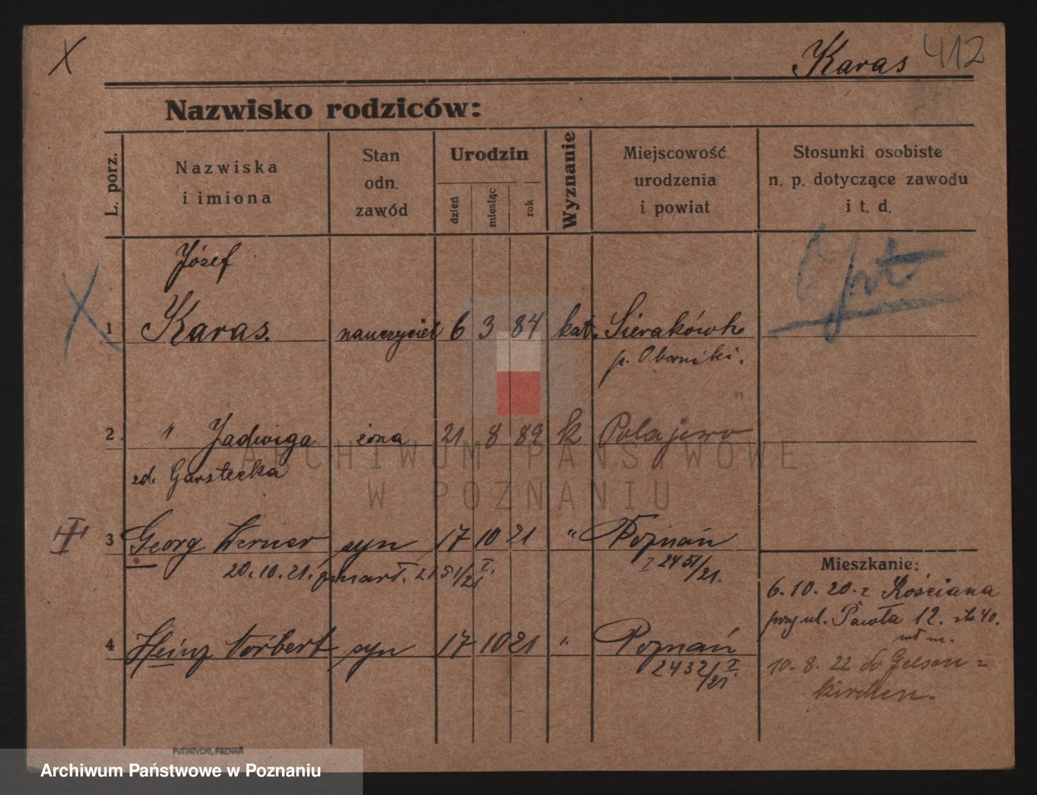 Podgląd karty osobowej dostępny jest po kliknięciu na nazwisko lub ikonkę karty. Można dokonywać powiększenia (ikony na górze) lub przechodzić między kolejnymi skanami (strzałki po bokach).