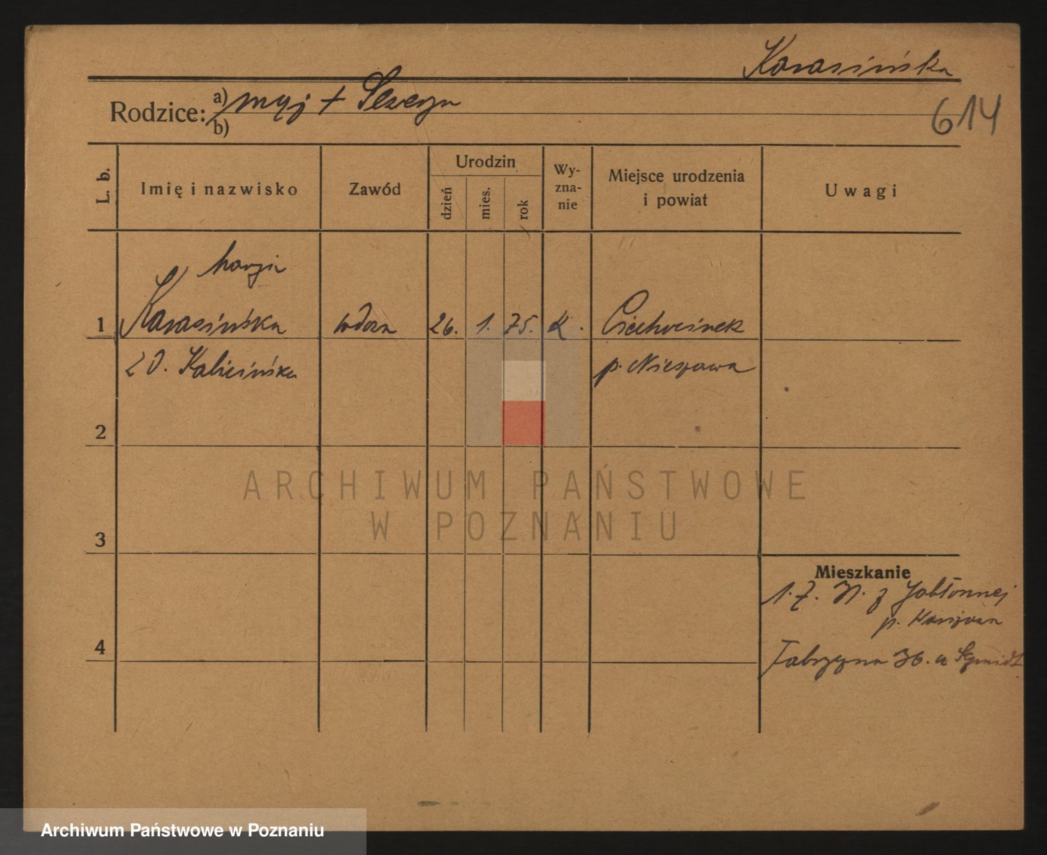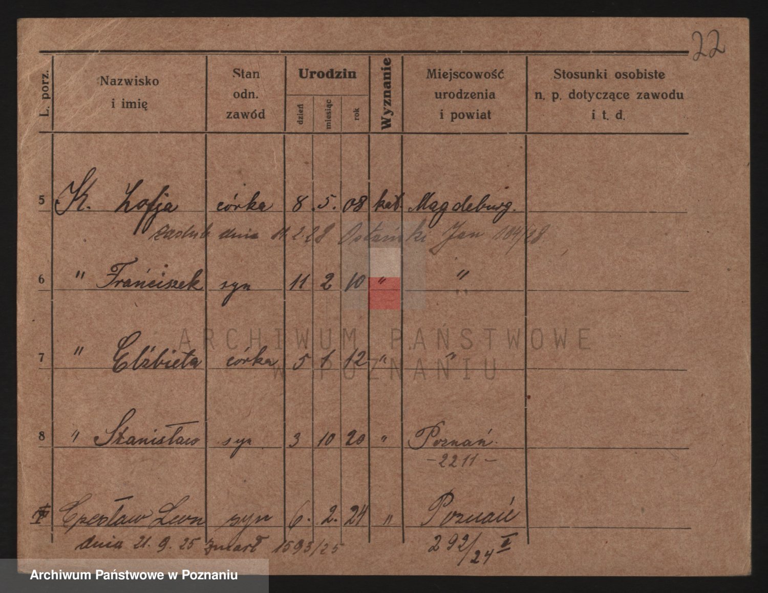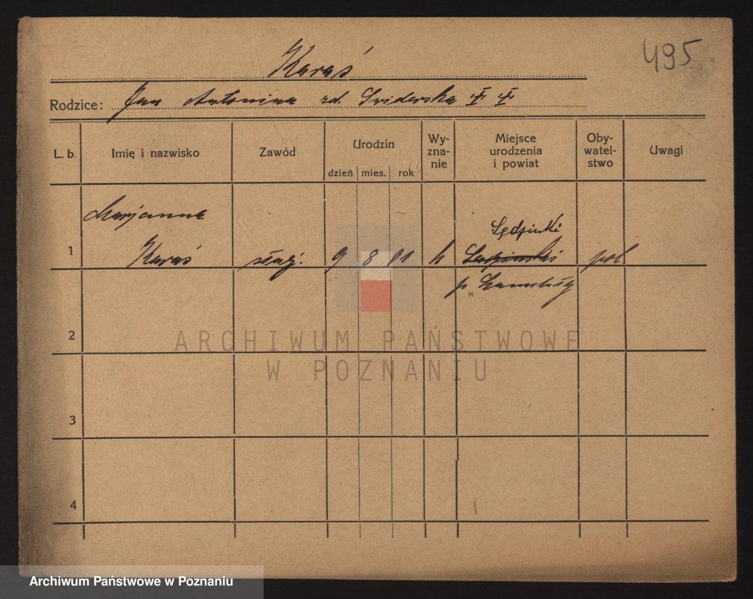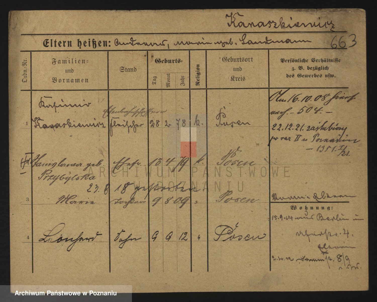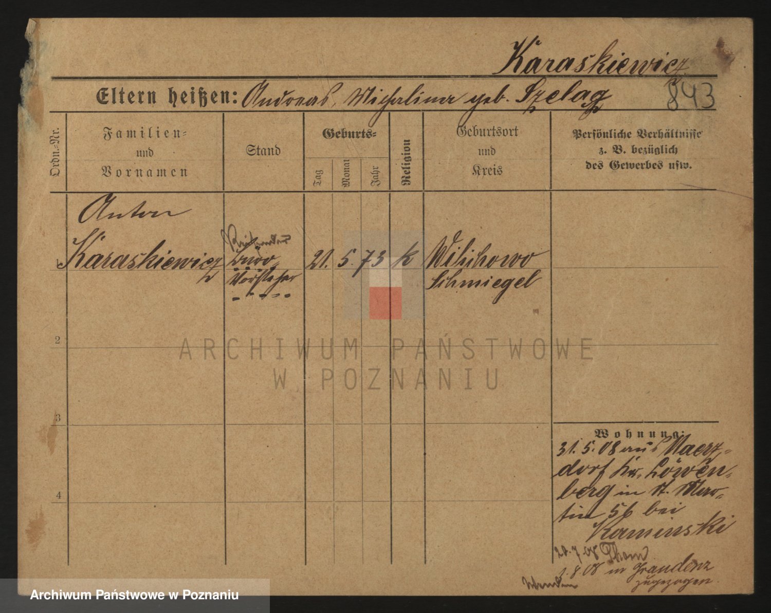 Podgląd karty osobowej dostępny jest po kliknięciu na nazwisko lub ikonkę karty. Można dokonywać powiększenia (ikony na górze) lub przechodzić między kolejnymi skanami (strzałki po bokach).