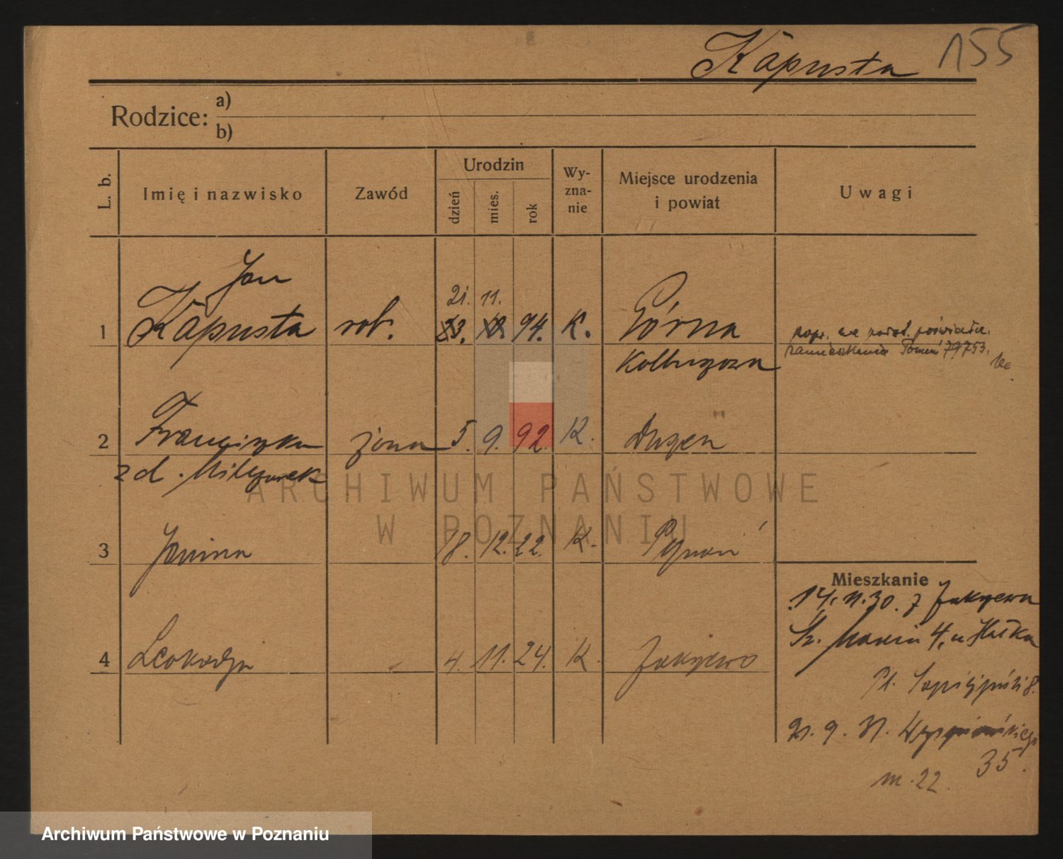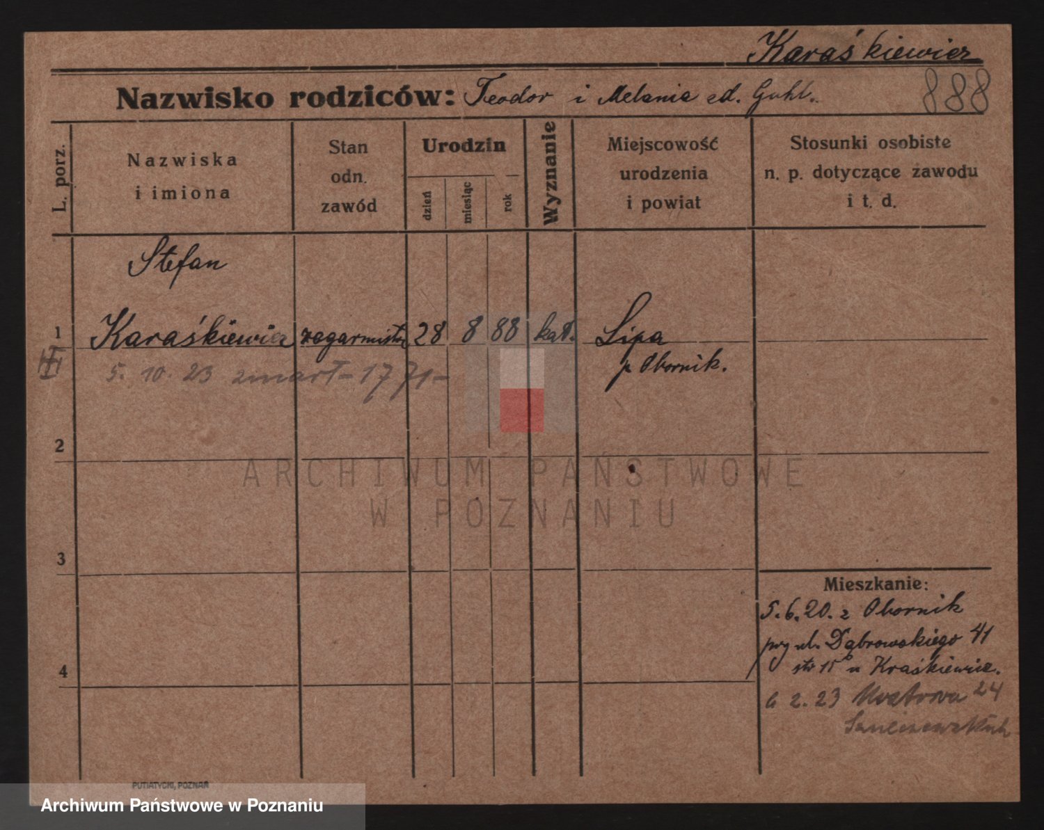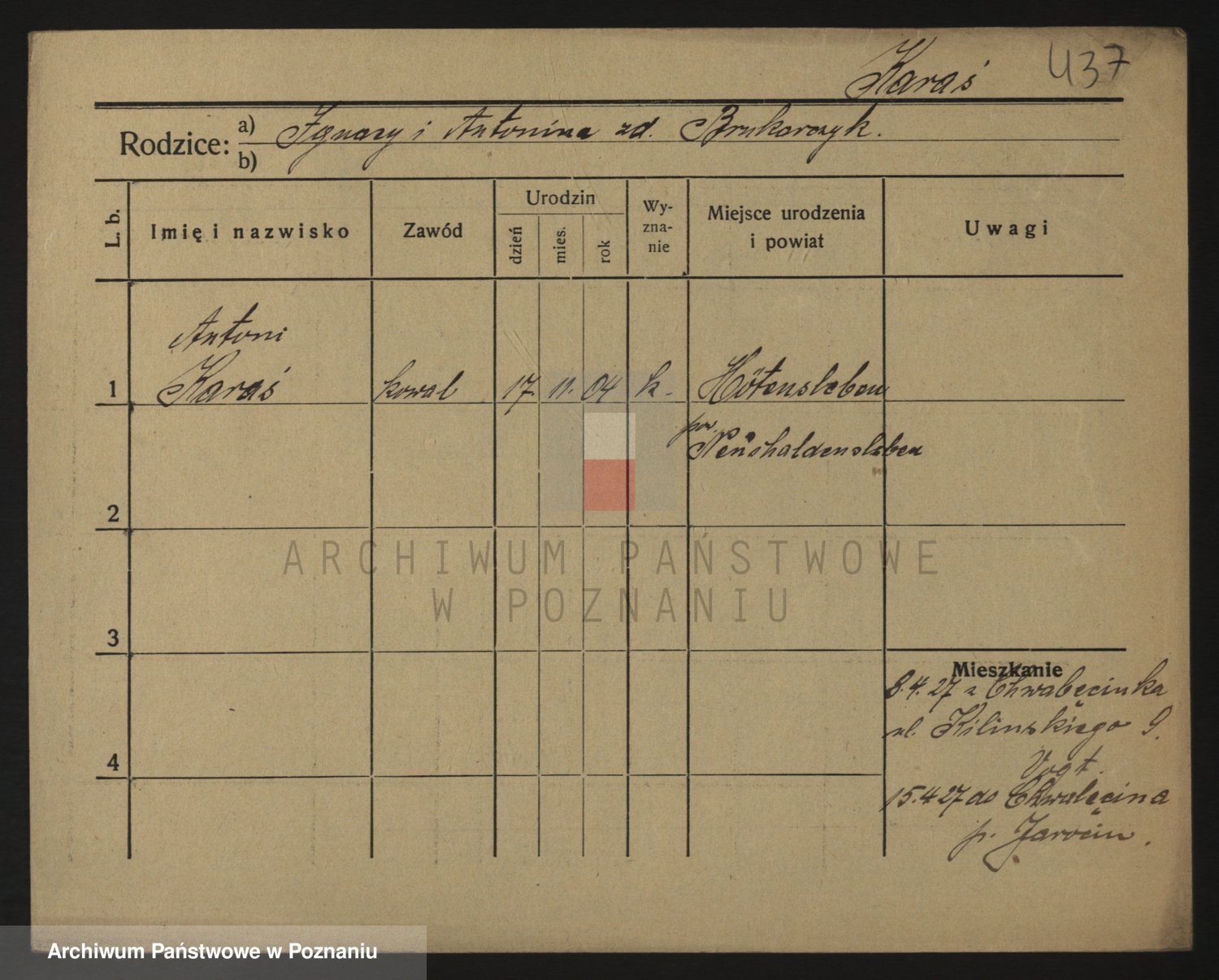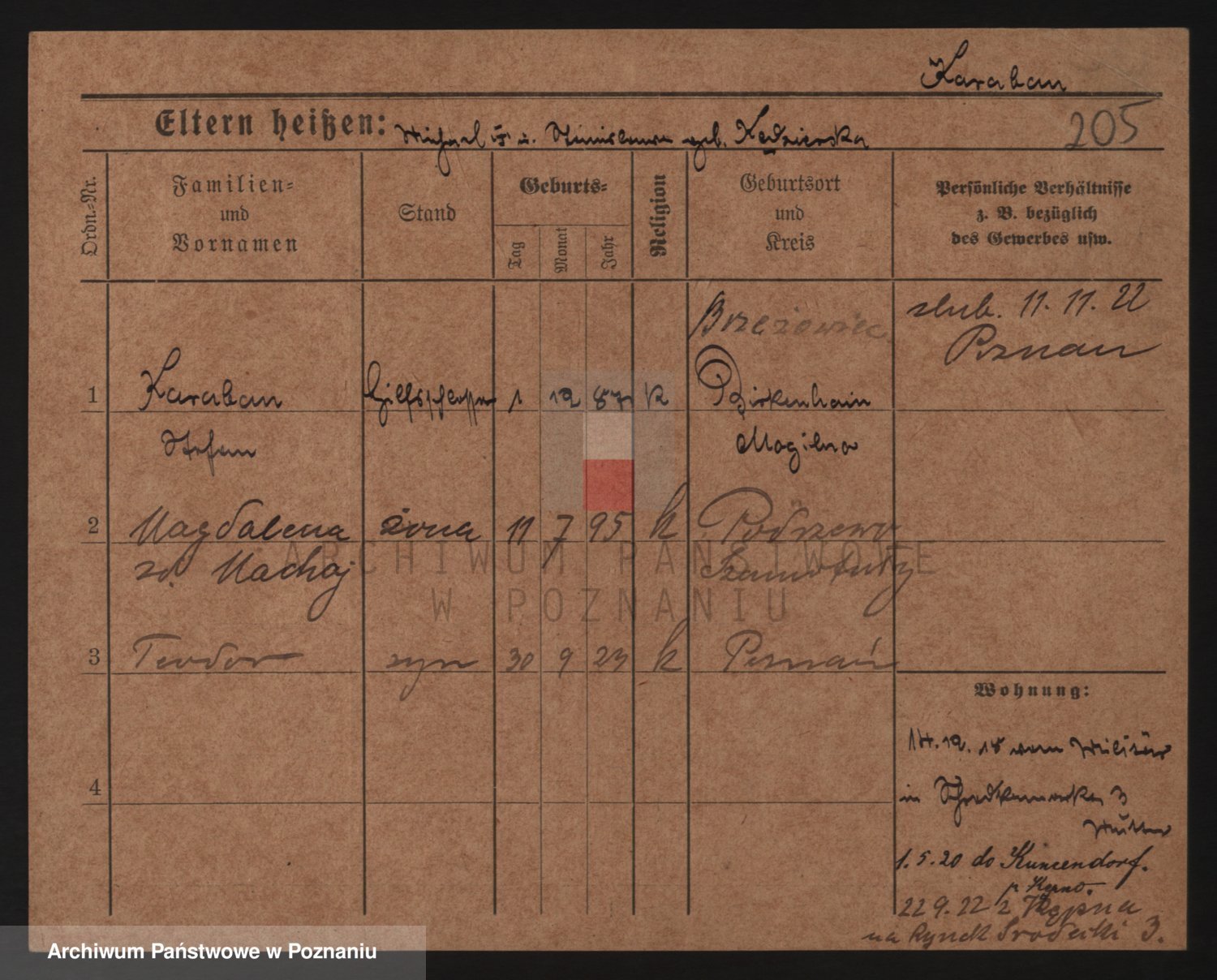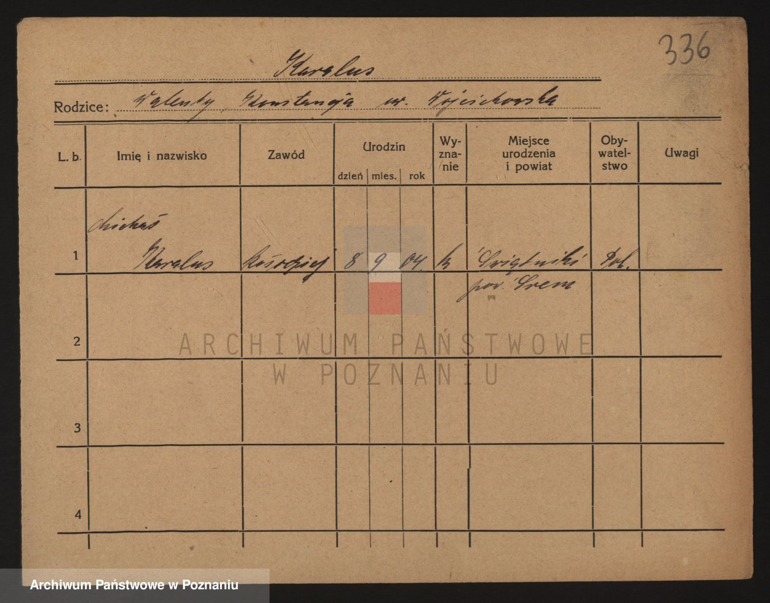 Podgląd karty osobowej dostępny jest po kliknięciu na nazwisko lub ikonkę karty. Można dokonywać powiększenia (ikony na górze) lub przechodzić między kolejnymi skanami (strzałki po bokach).