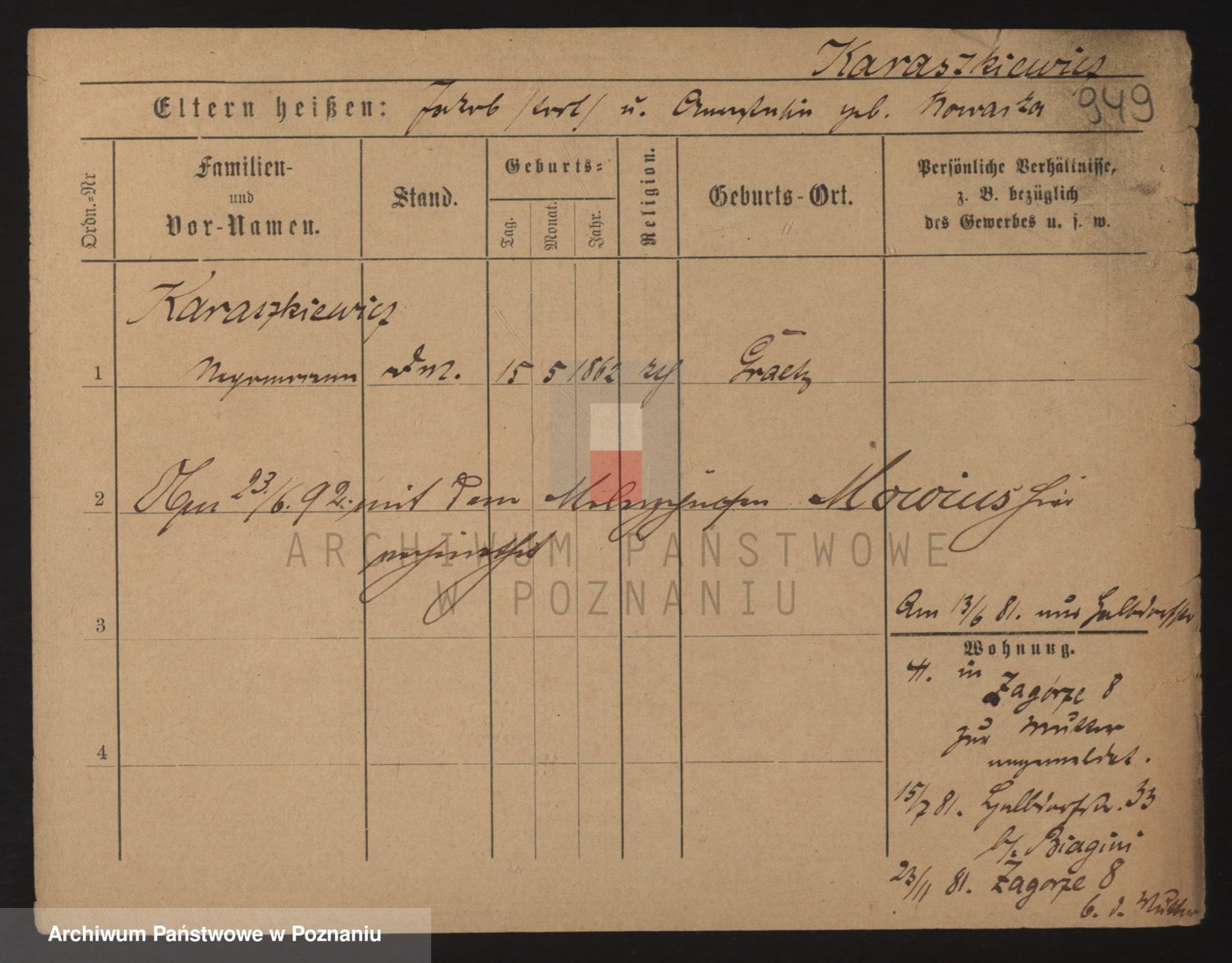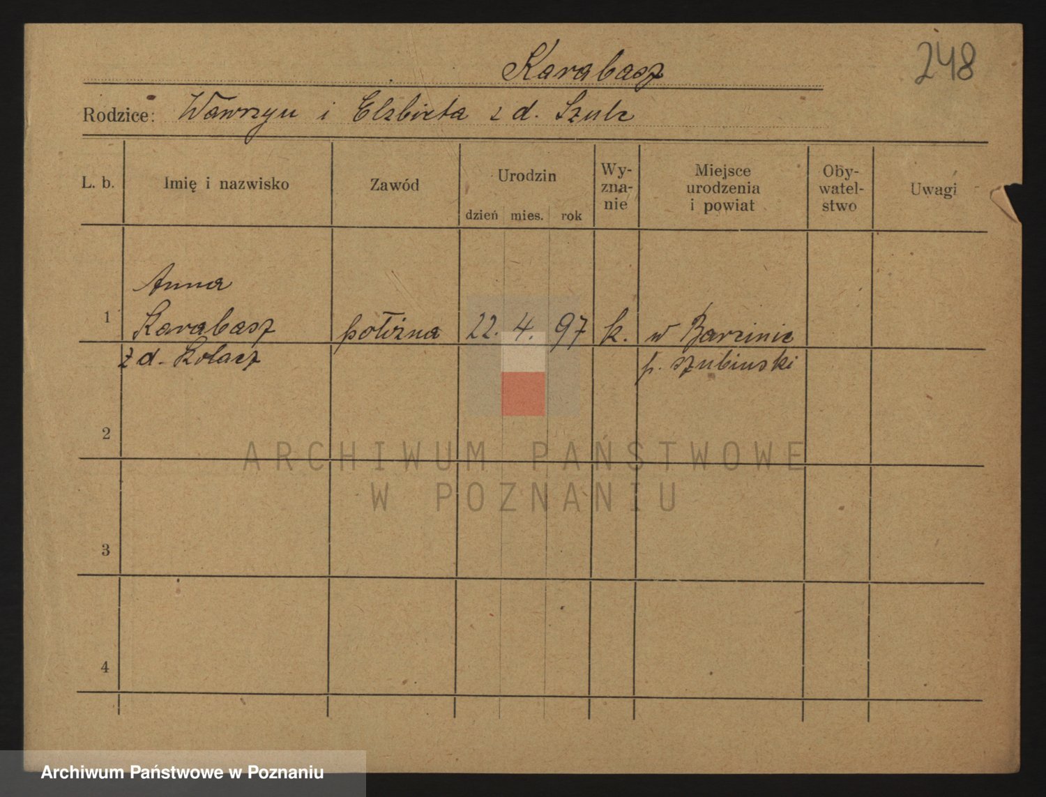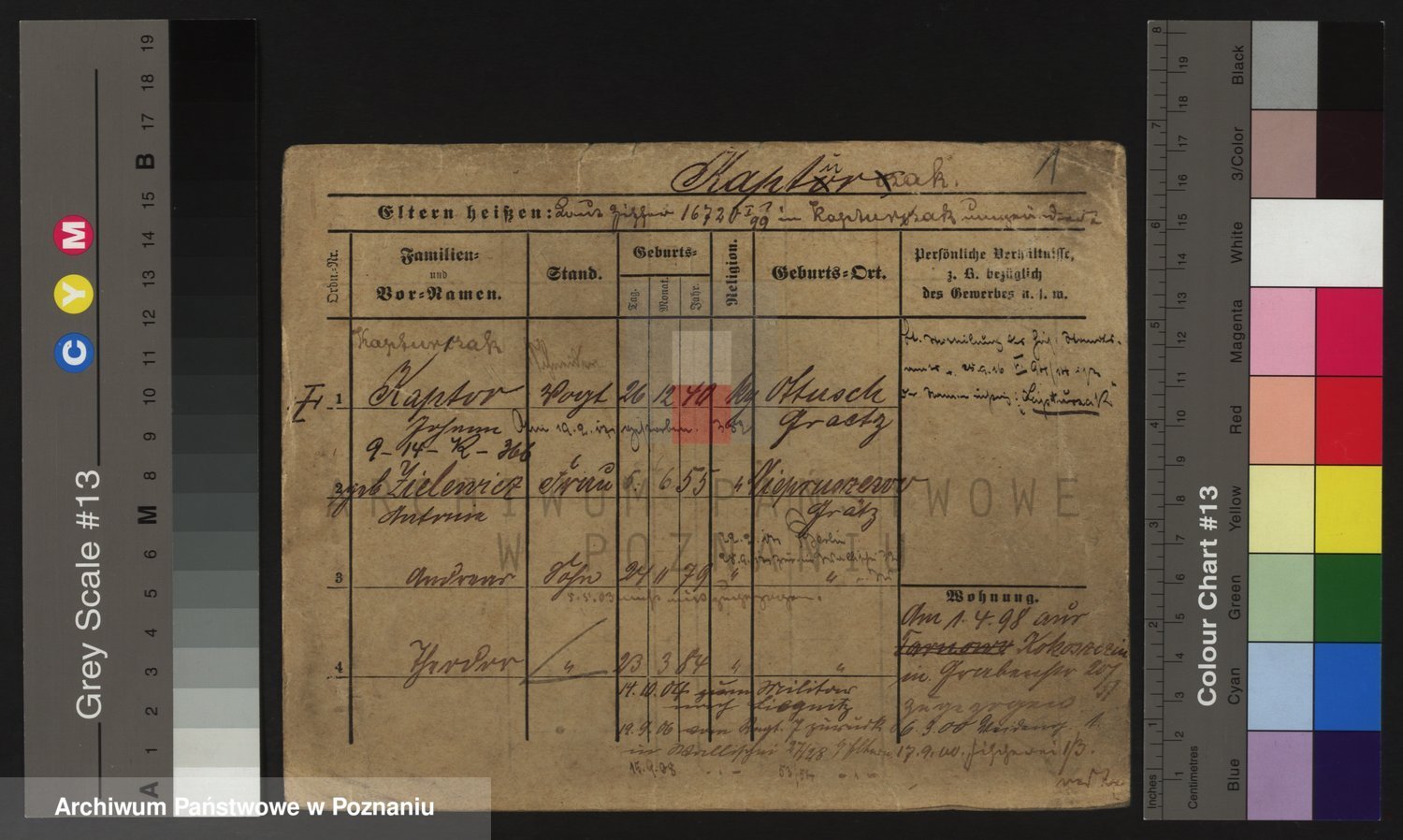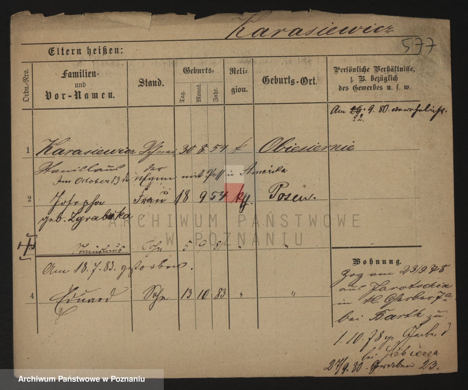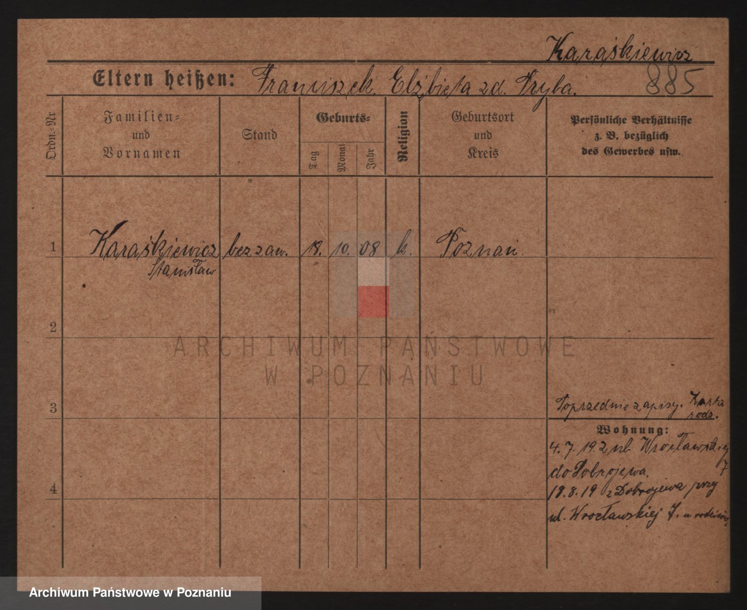Podgląd karty osobowej dostępny jest po kliknięciu na nazwisko lub ikonkę karty. Można dokonywać powiększenia (ikony na górze) lub przechodzić między kolejnymi skanami (strzałki po bokach).