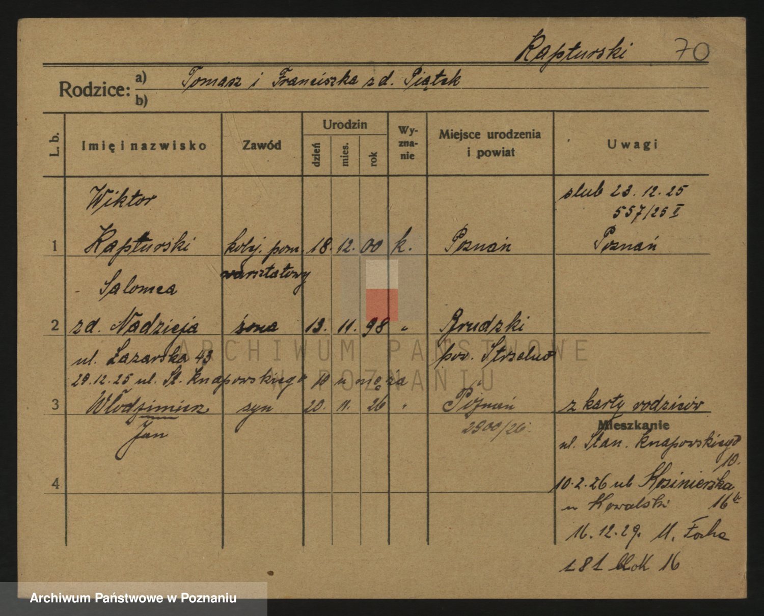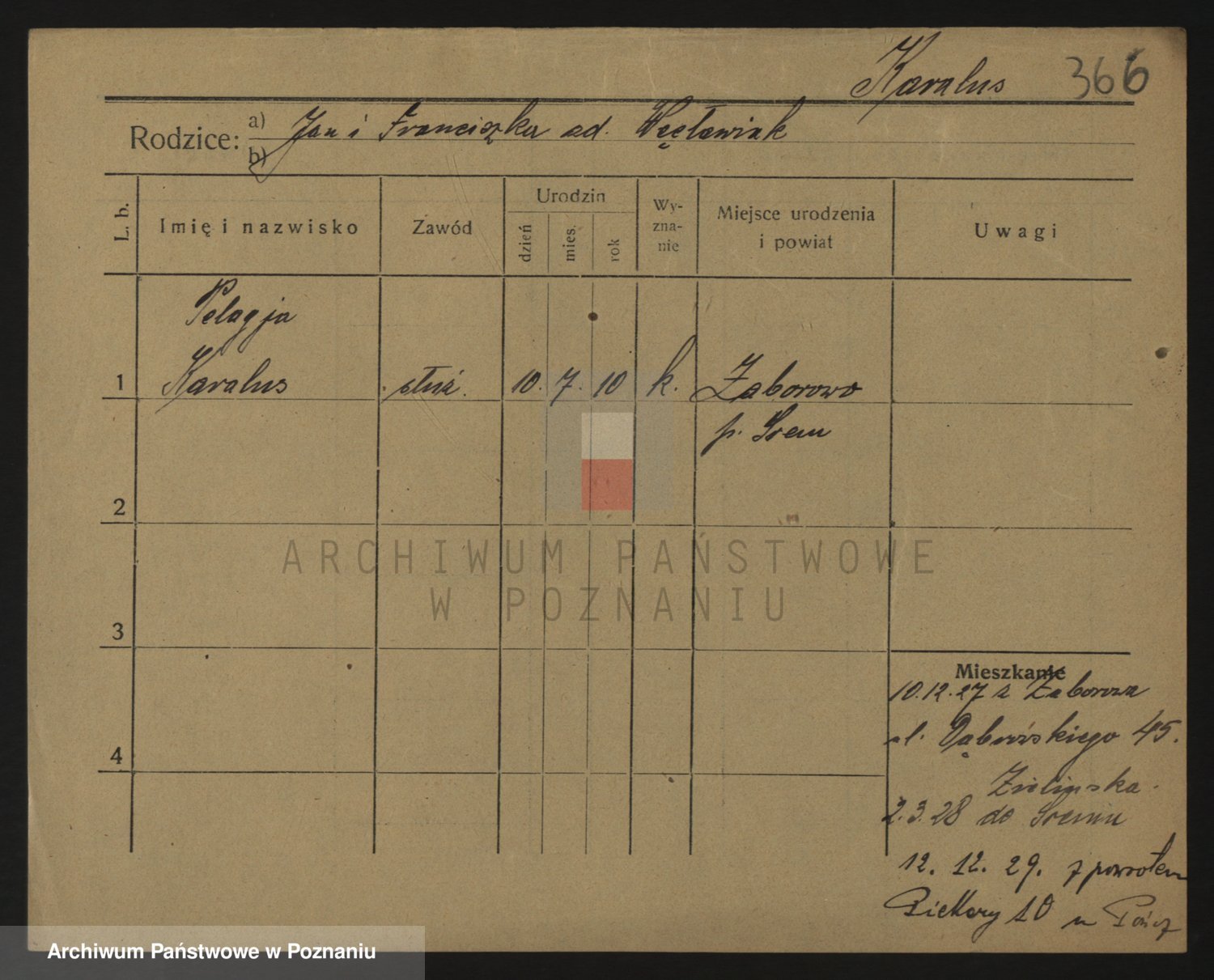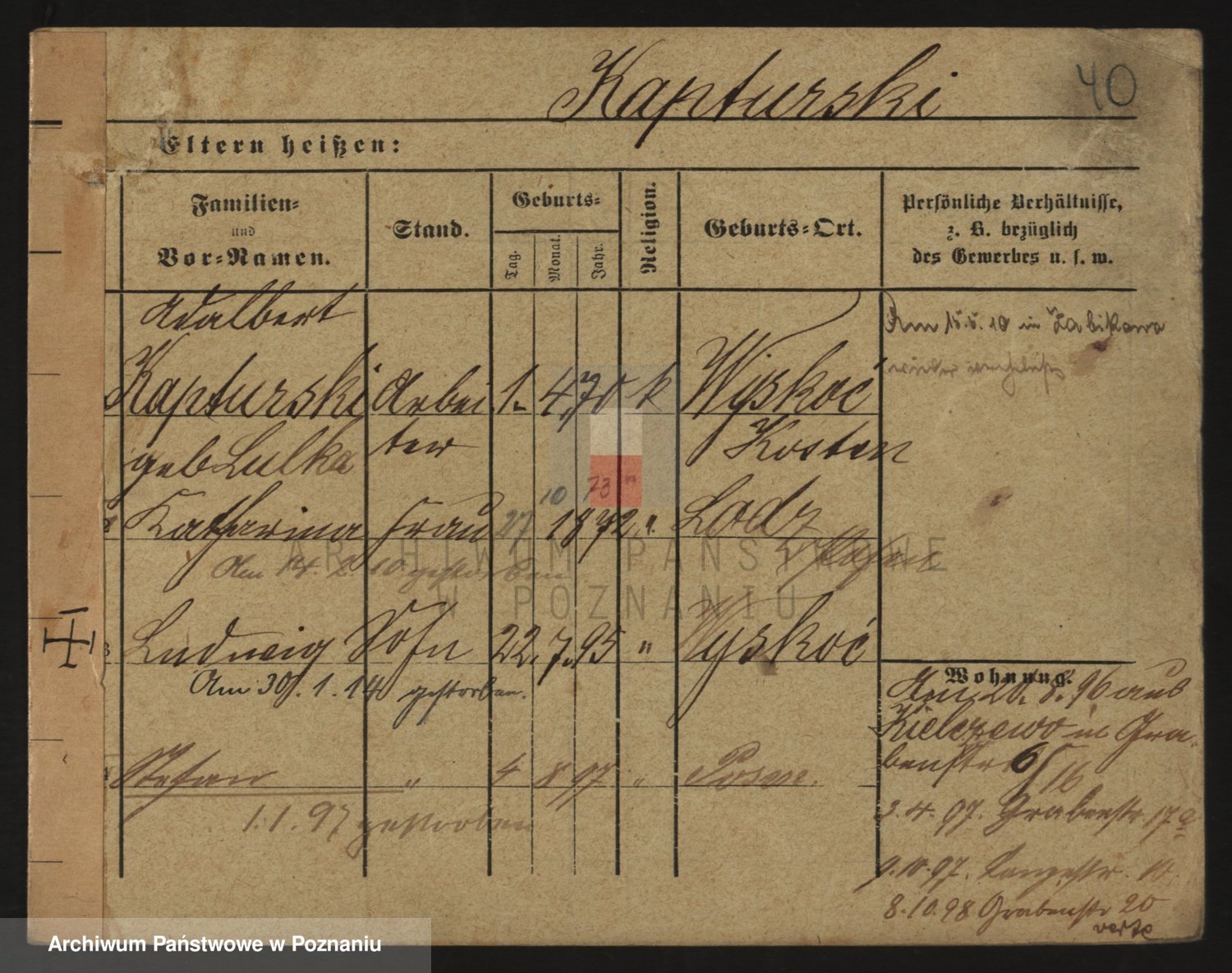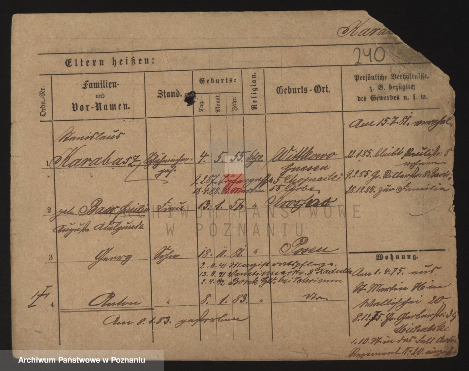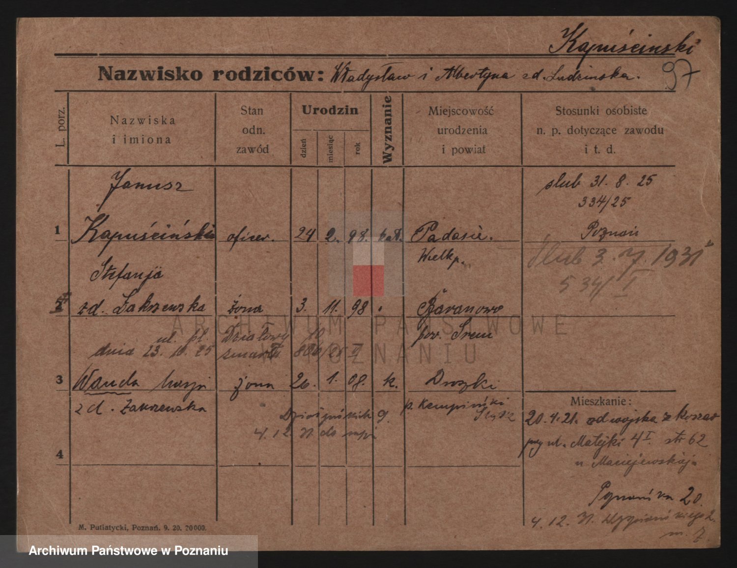 Podgląd karty osobowej dostępny jest po kliknięciu na nazwisko lub ikonkę karty. Można dokonywać powiększenia (ikony na górze) lub przechodzić między kolejnymi skanami (strzałki po bokach).