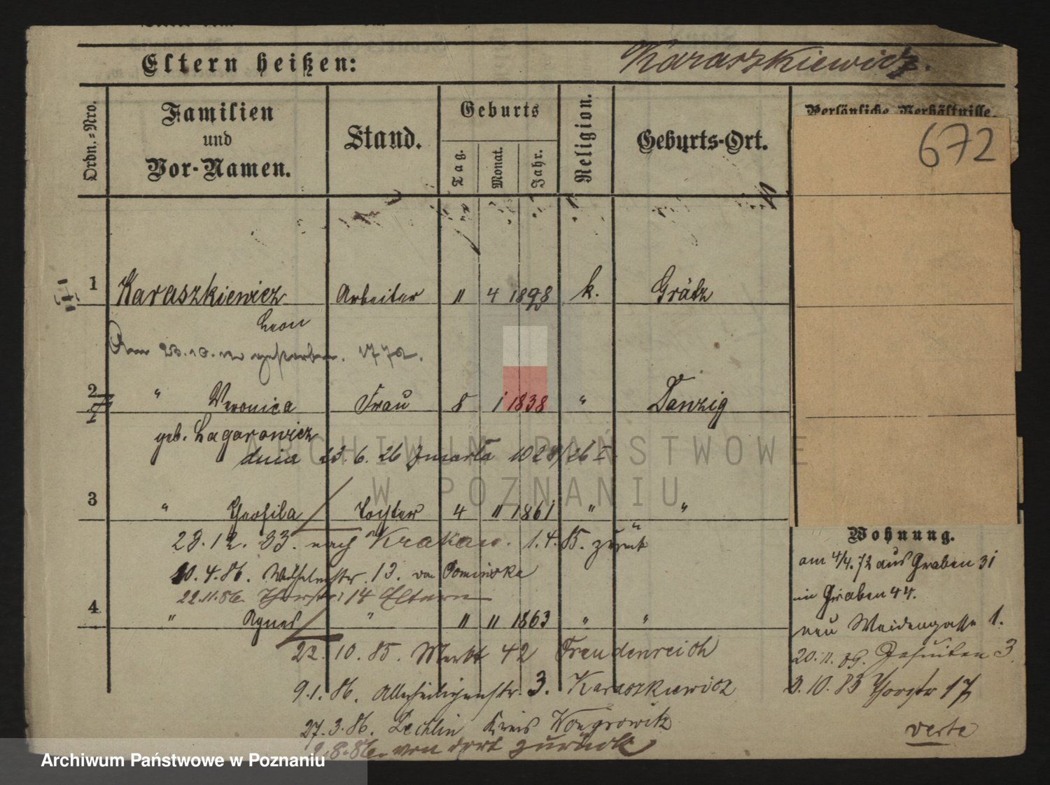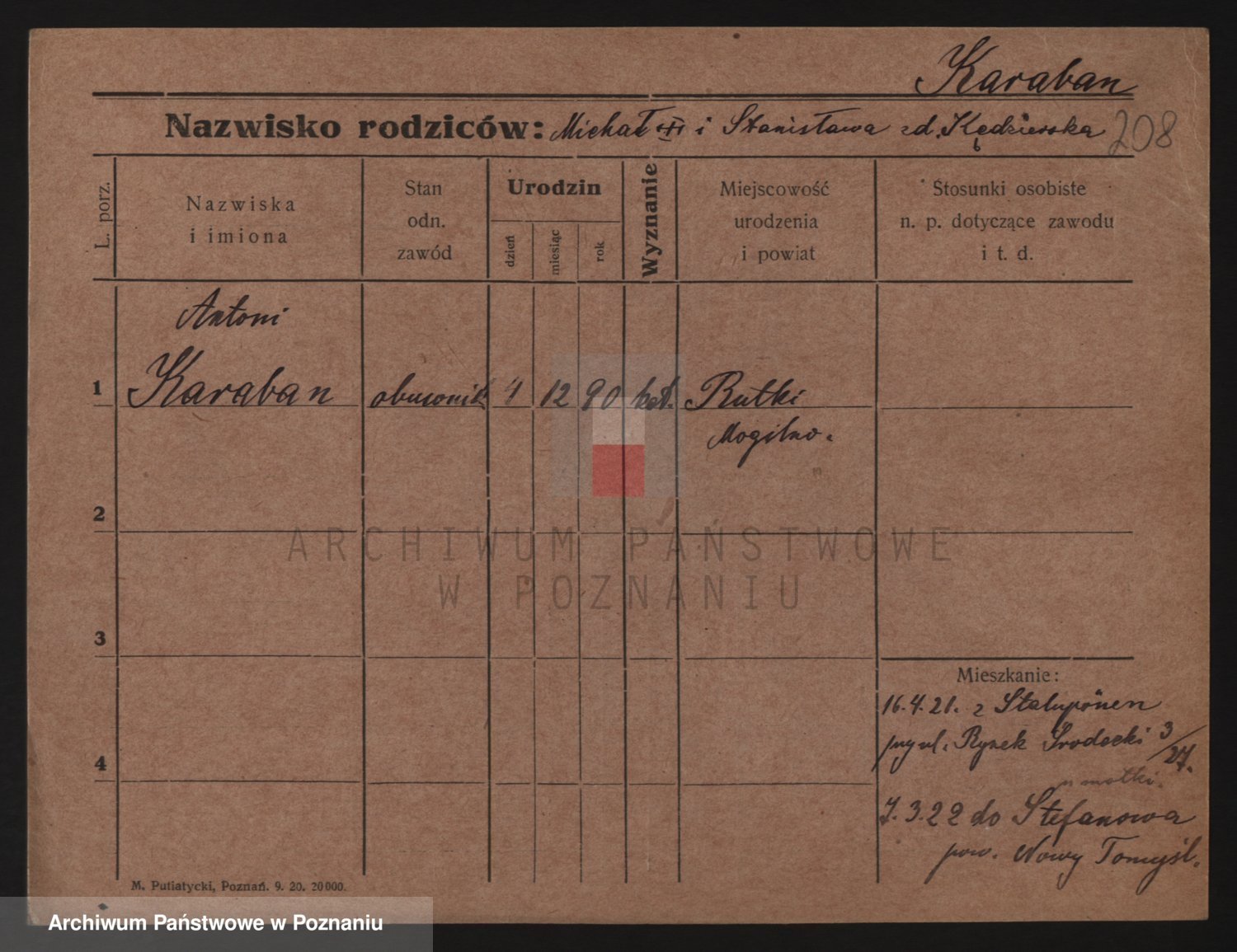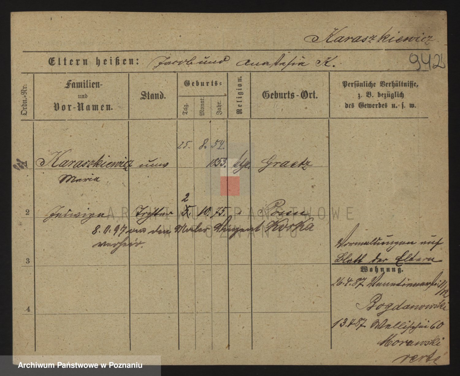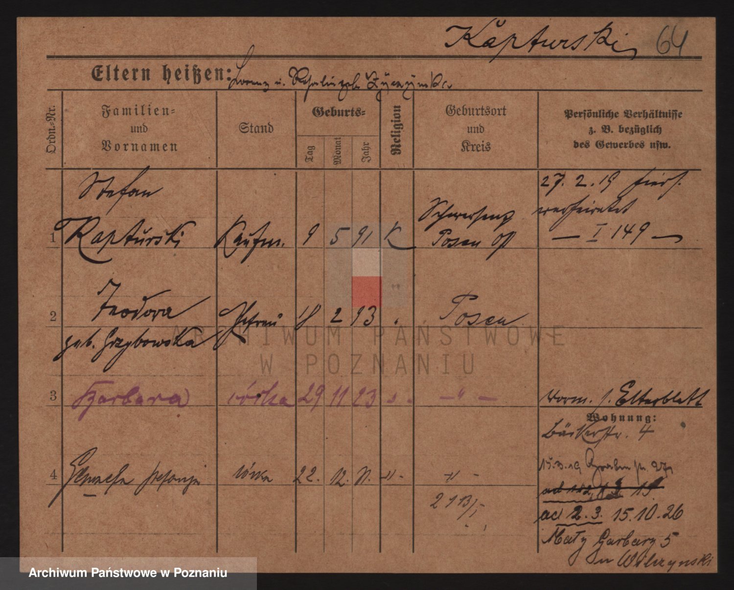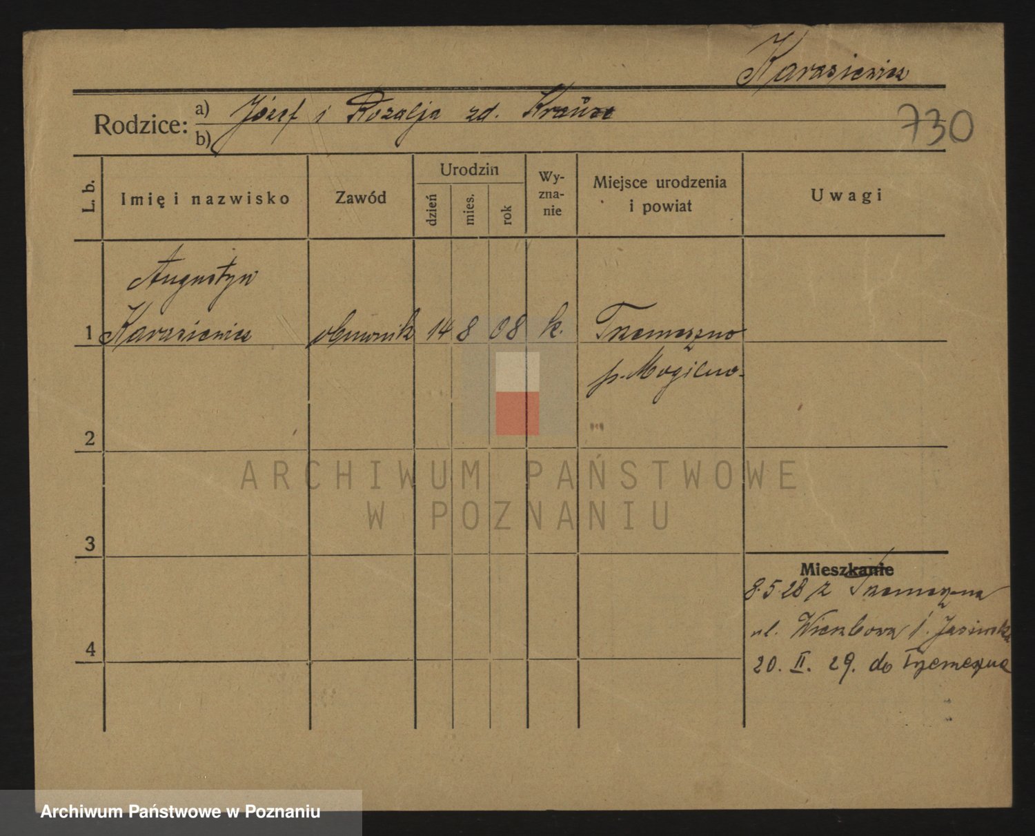 Podgląd karty osobowej dostępny jest po kliknięciu na nazwisko lub ikonkę karty. Można dokonywać powiększenia (ikony na górze) lub przechodzić między kolejnymi skanami (strzałki po bokach).