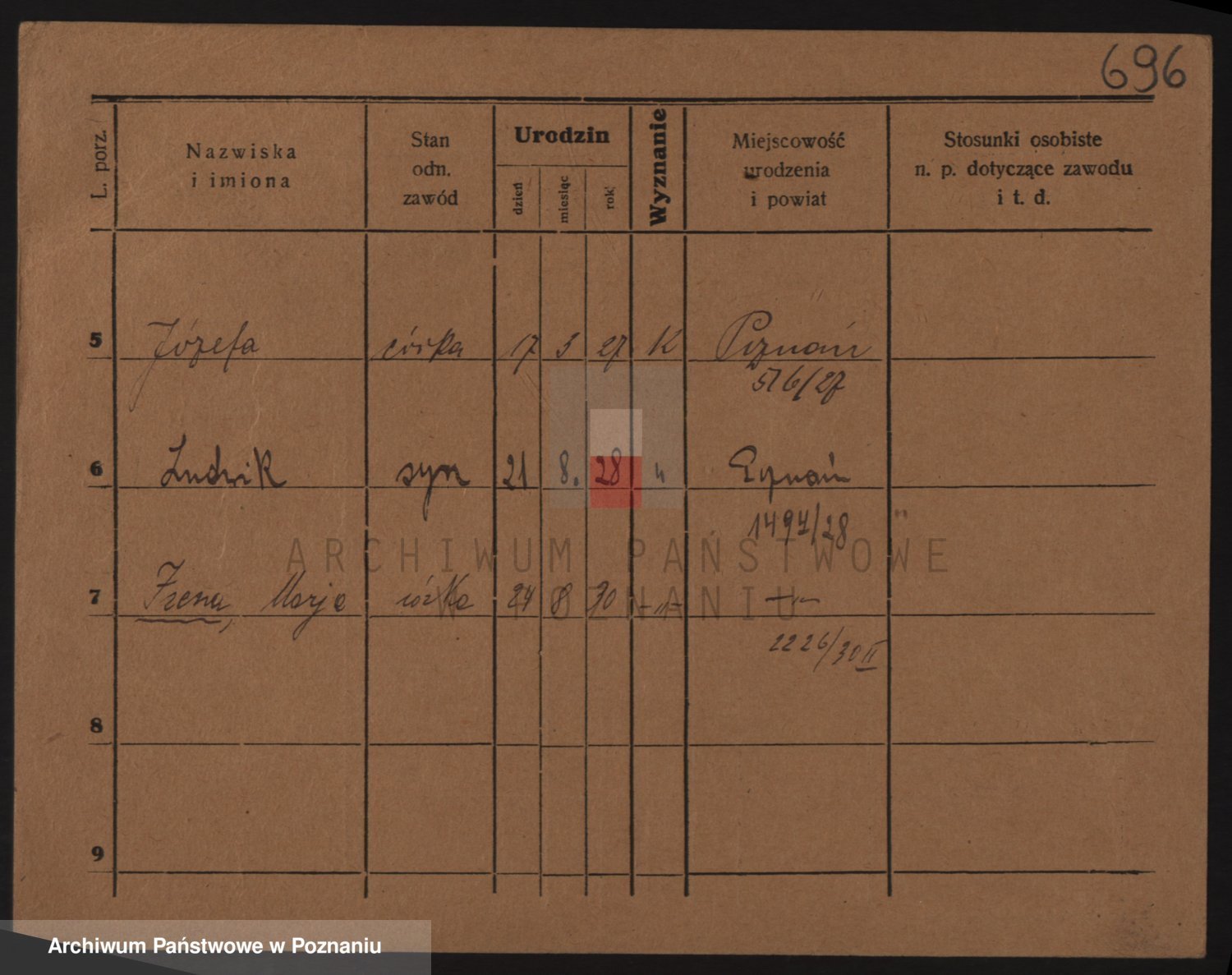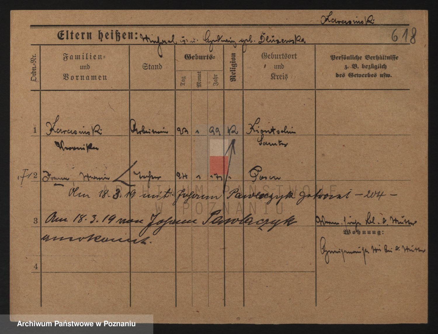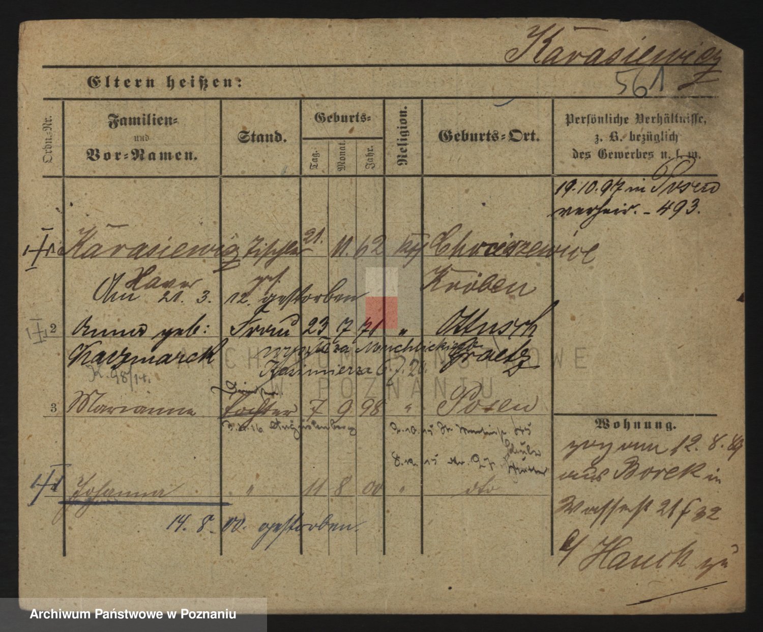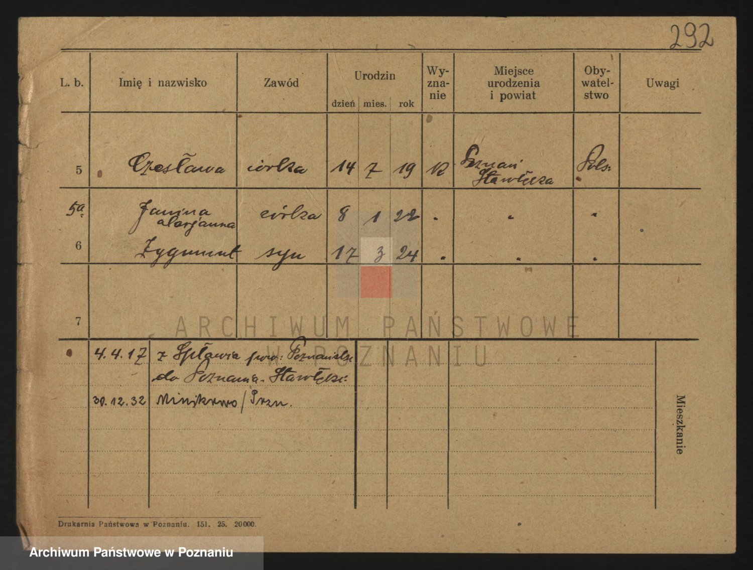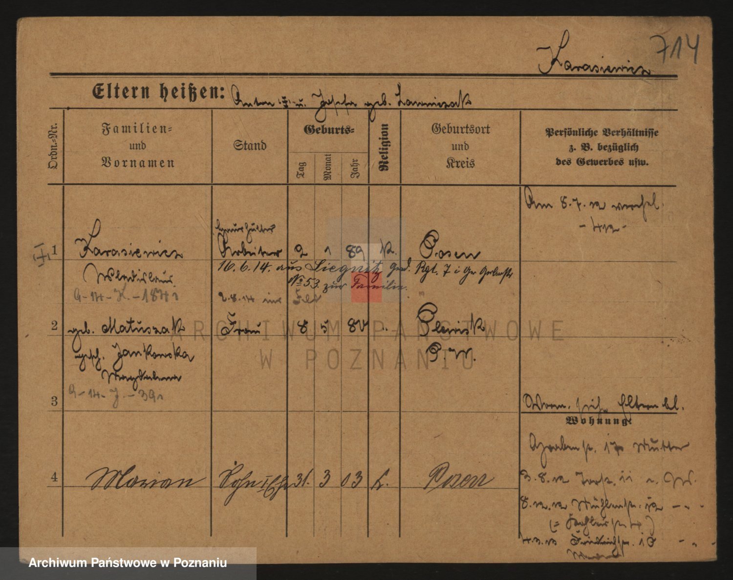 Podgląd karty osobowej dostępny jest po kliknięciu na nazwisko lub ikonkę karty. Można dokonywać powiększenia (ikony na górze) lub przechodzić między kolejnymi skanami (strzałki po bokach).