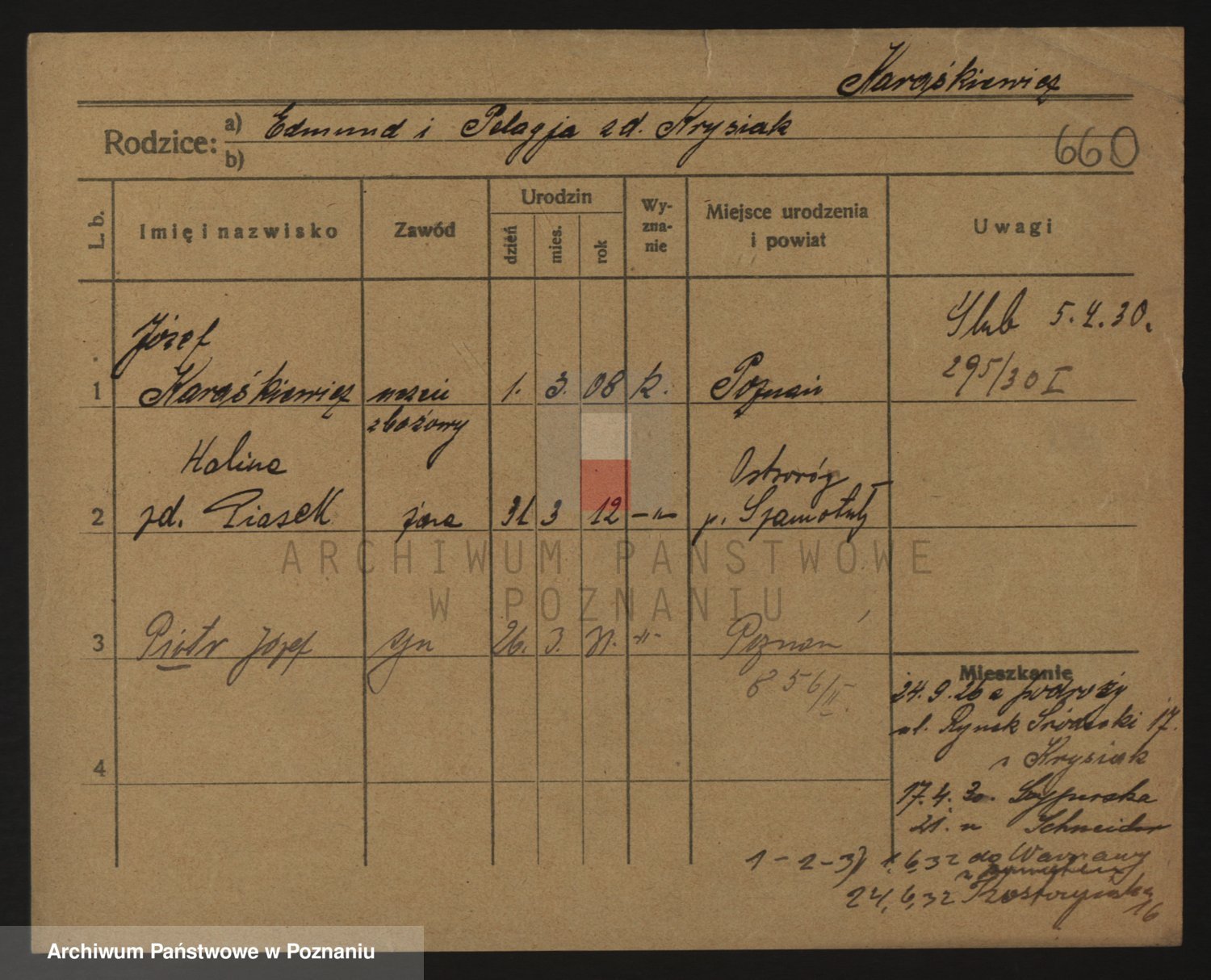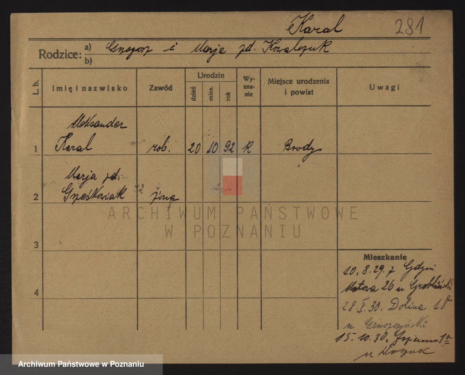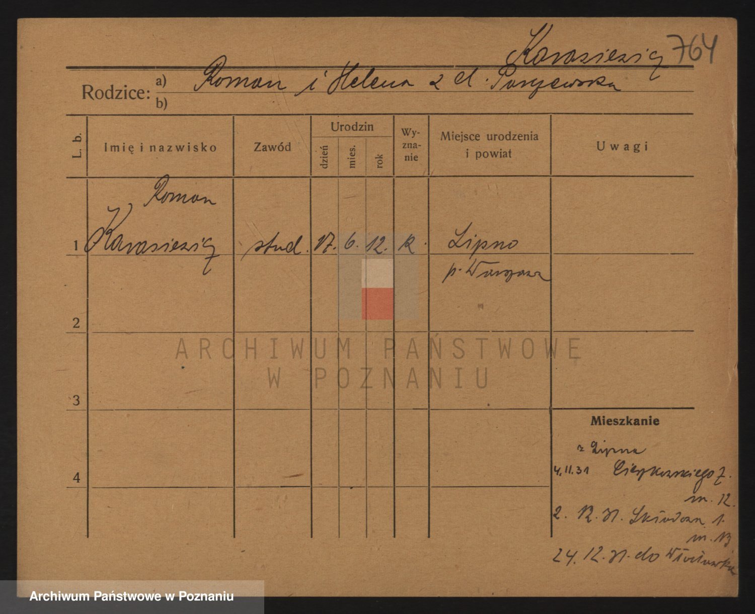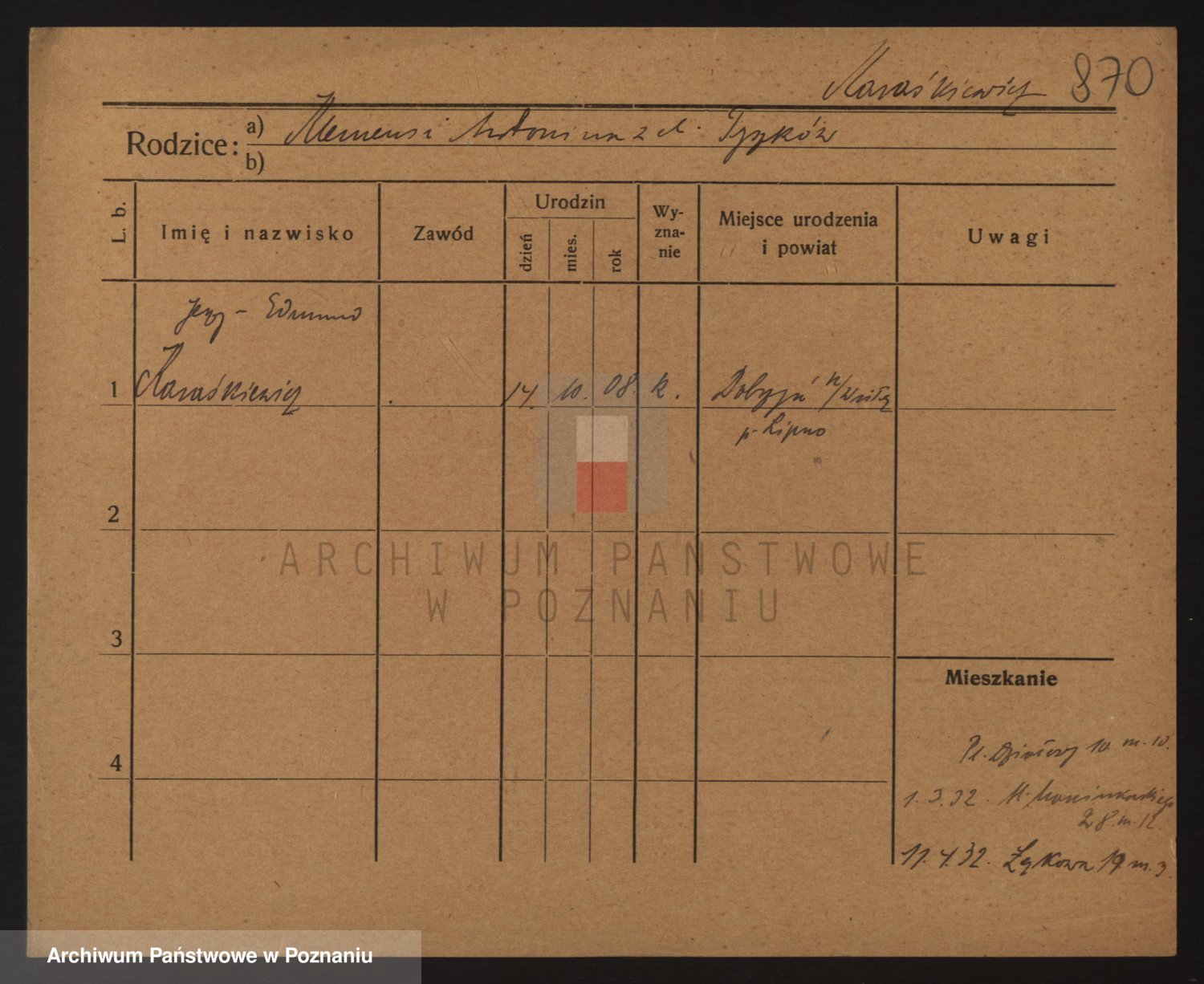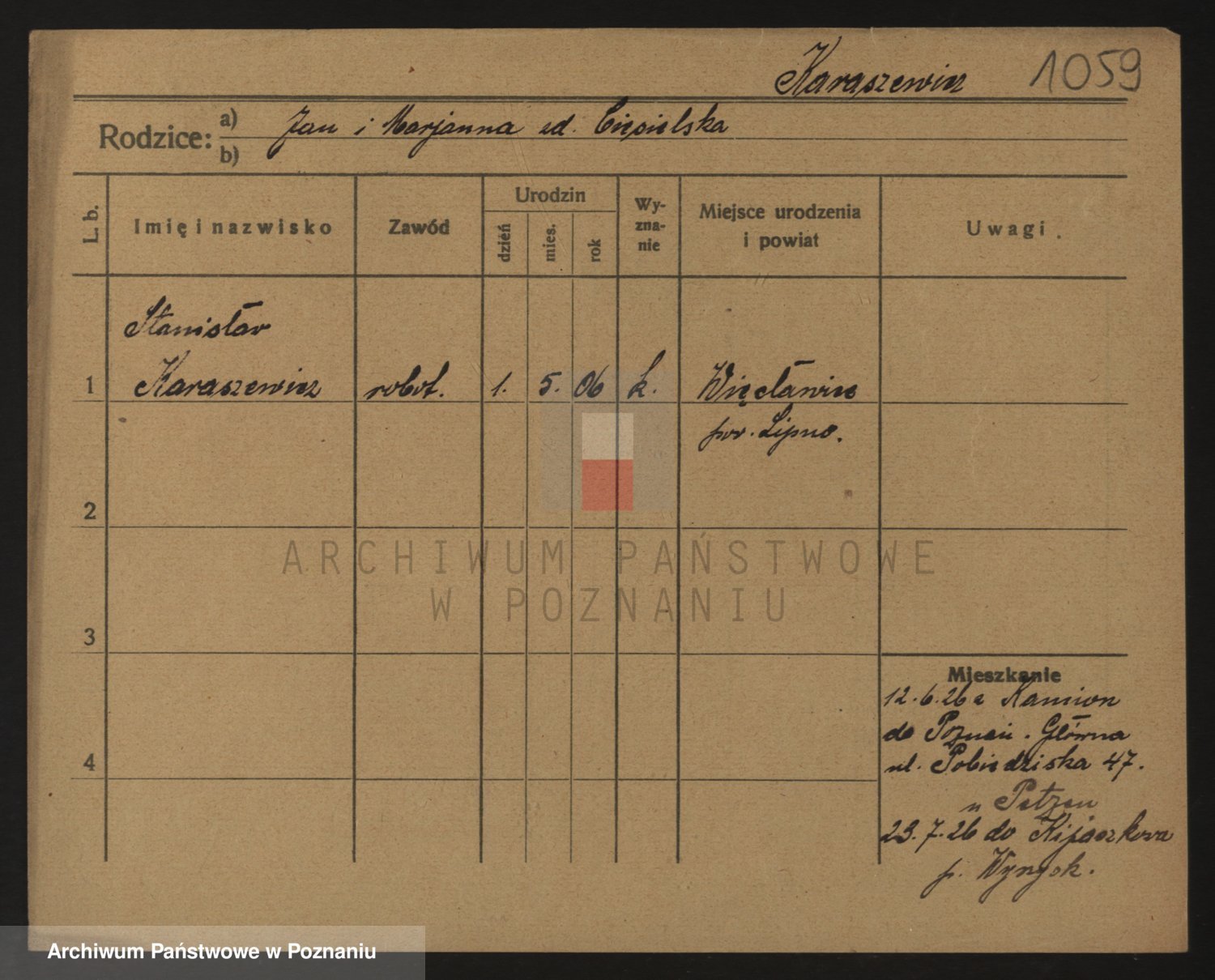 Podgląd karty osobowej dostępny jest po kliknięciu na nazwisko lub ikonkę karty. Można dokonywać powiększenia (ikony na górze) lub przechodzić między kolejnymi skanami (strzałki po bokach).