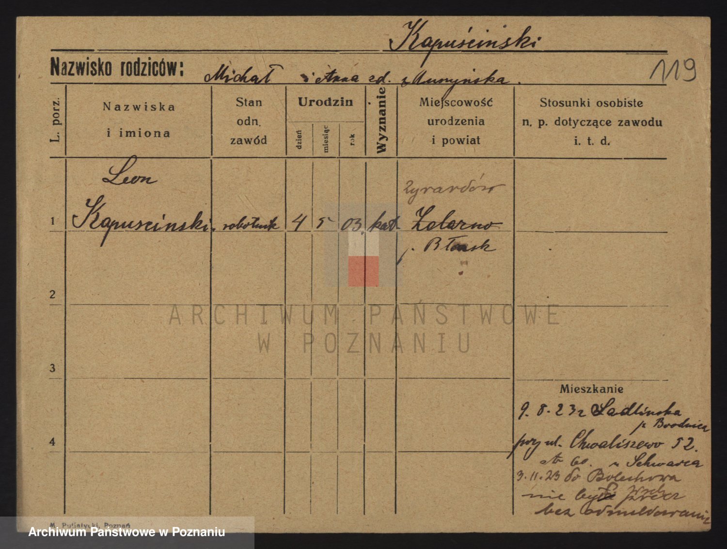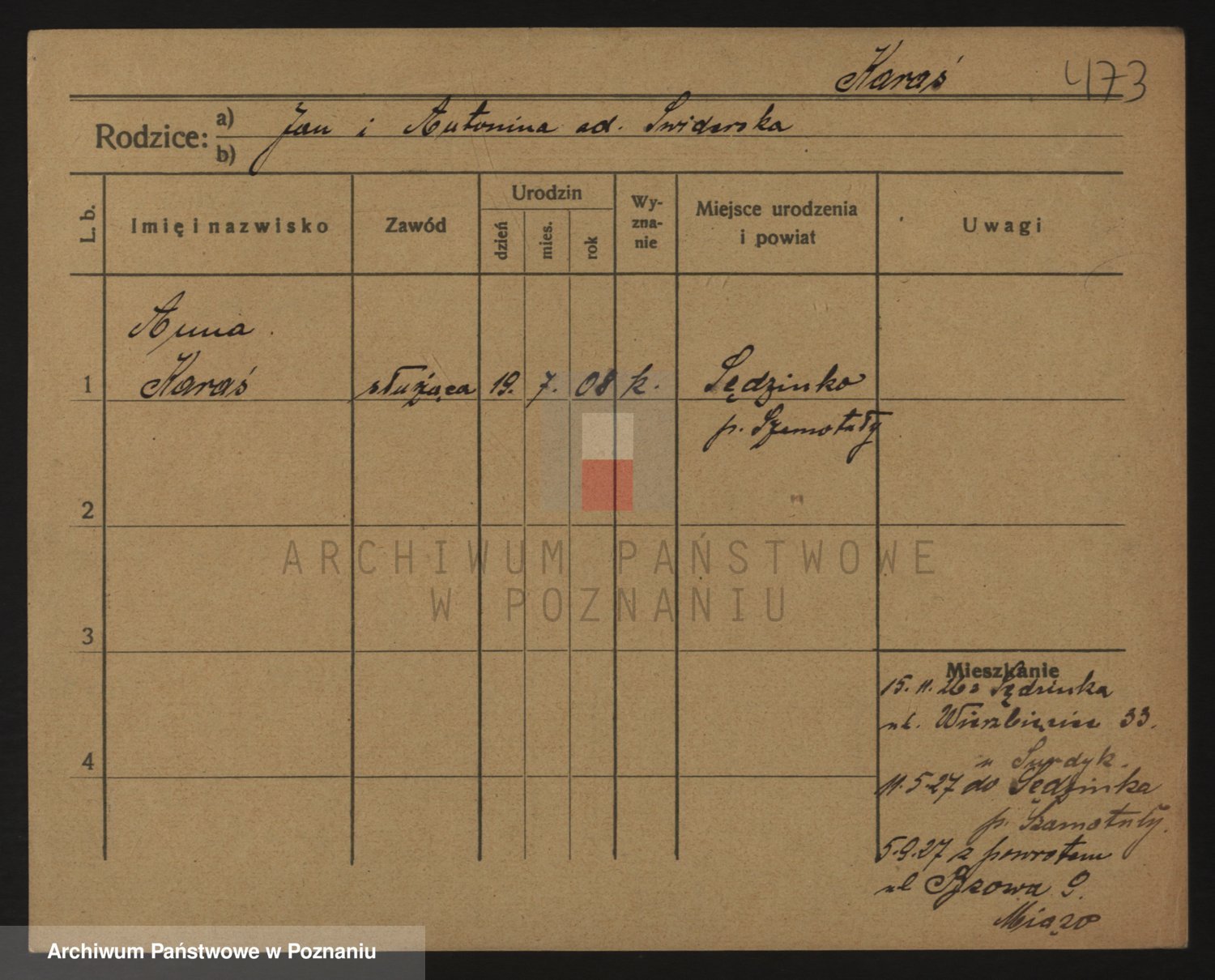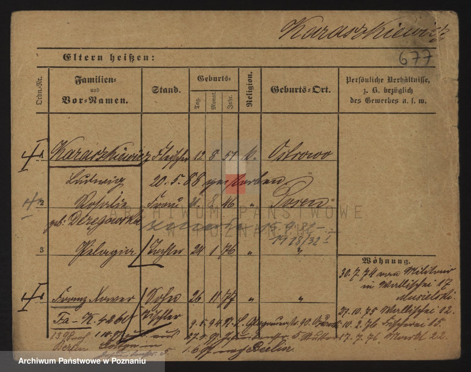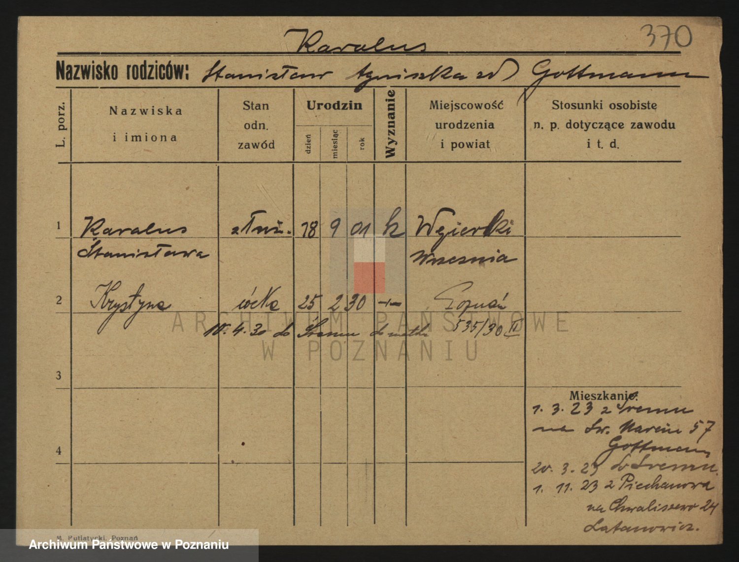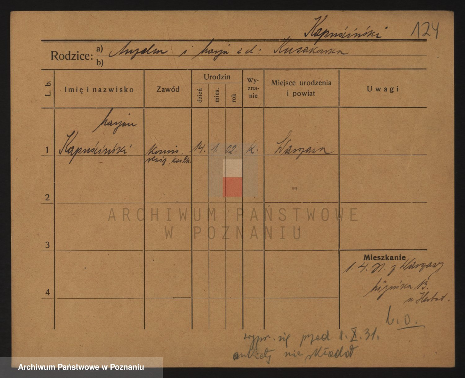 Podgląd karty osobowej dostępny jest po kliknięciu na nazwisko lub ikonkę karty. Można dokonywać powiększenia (ikony na górze) lub przechodzić między kolejnymi skanami (strzałki po bokach).