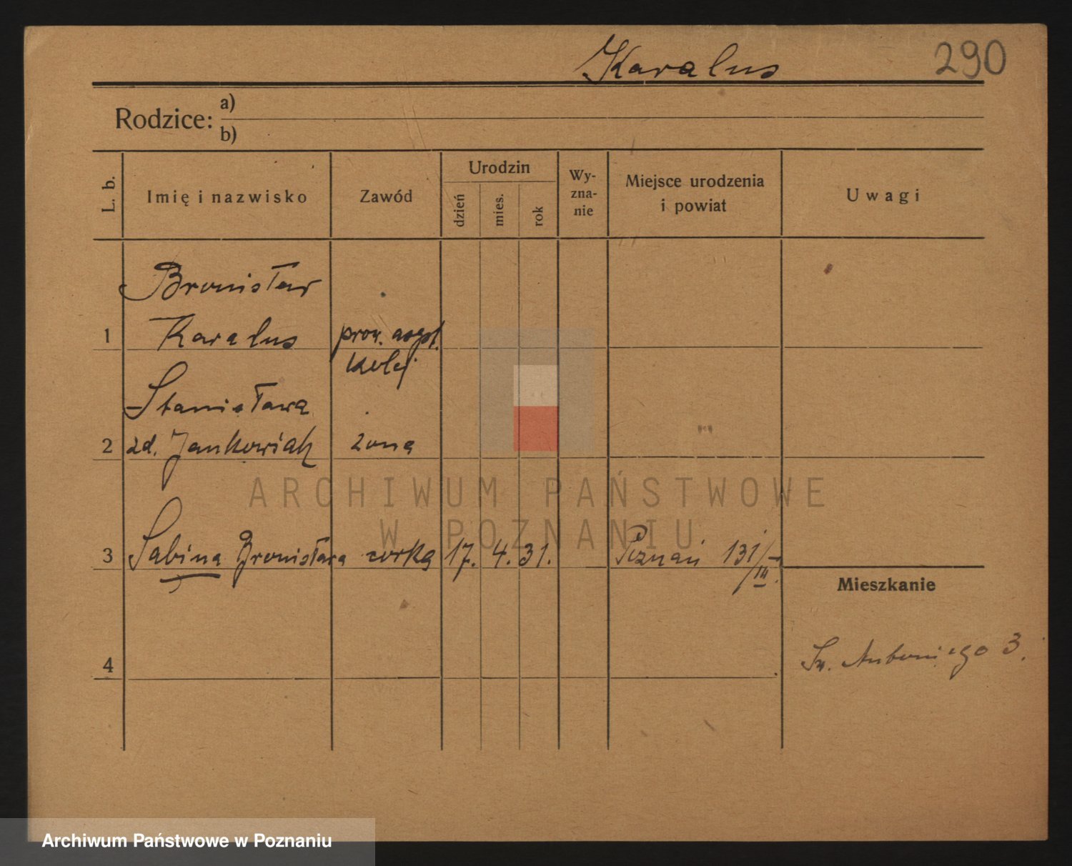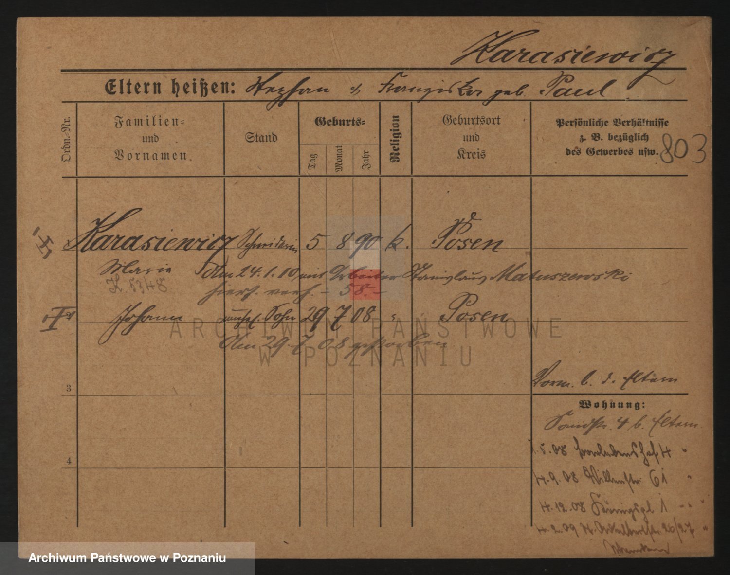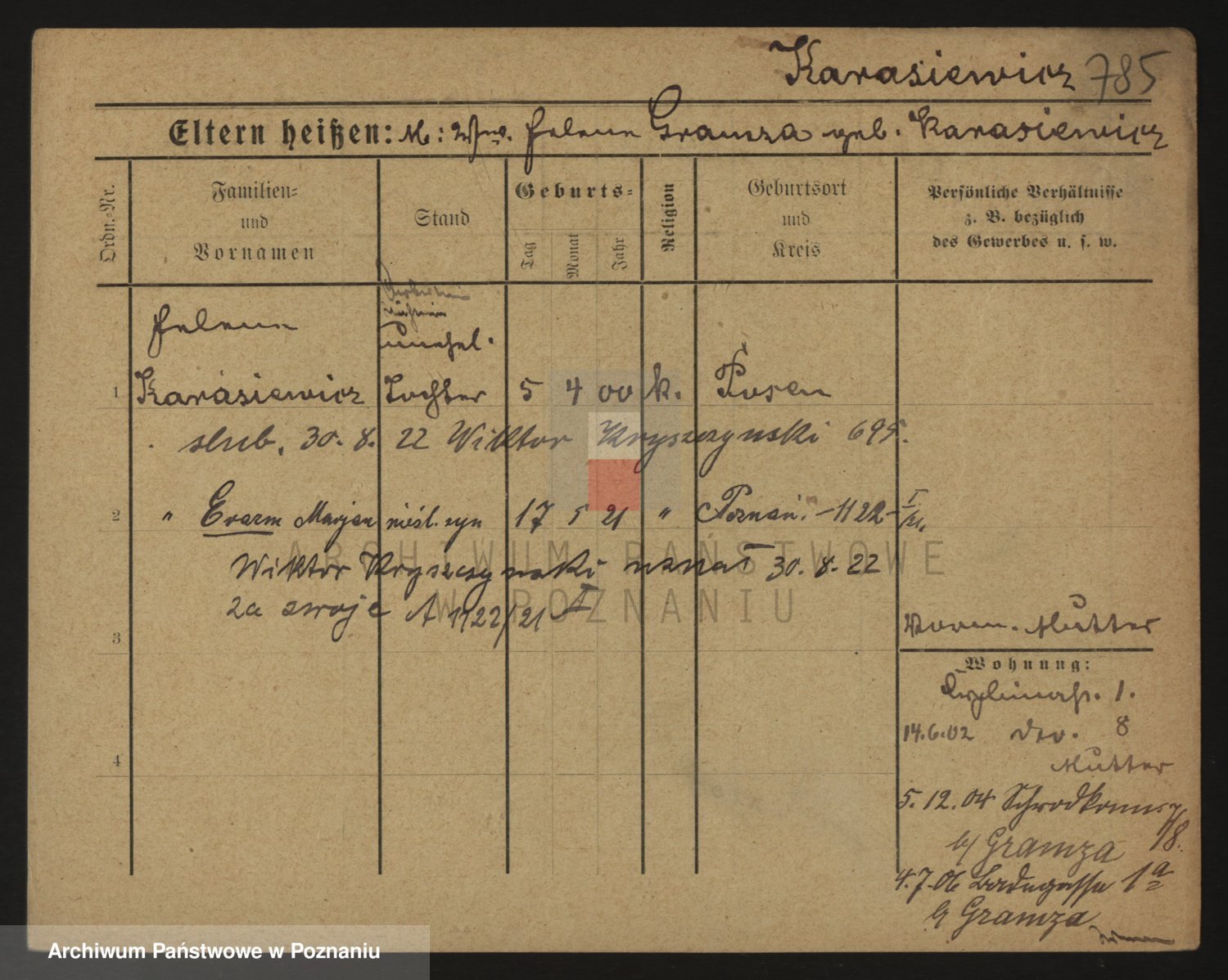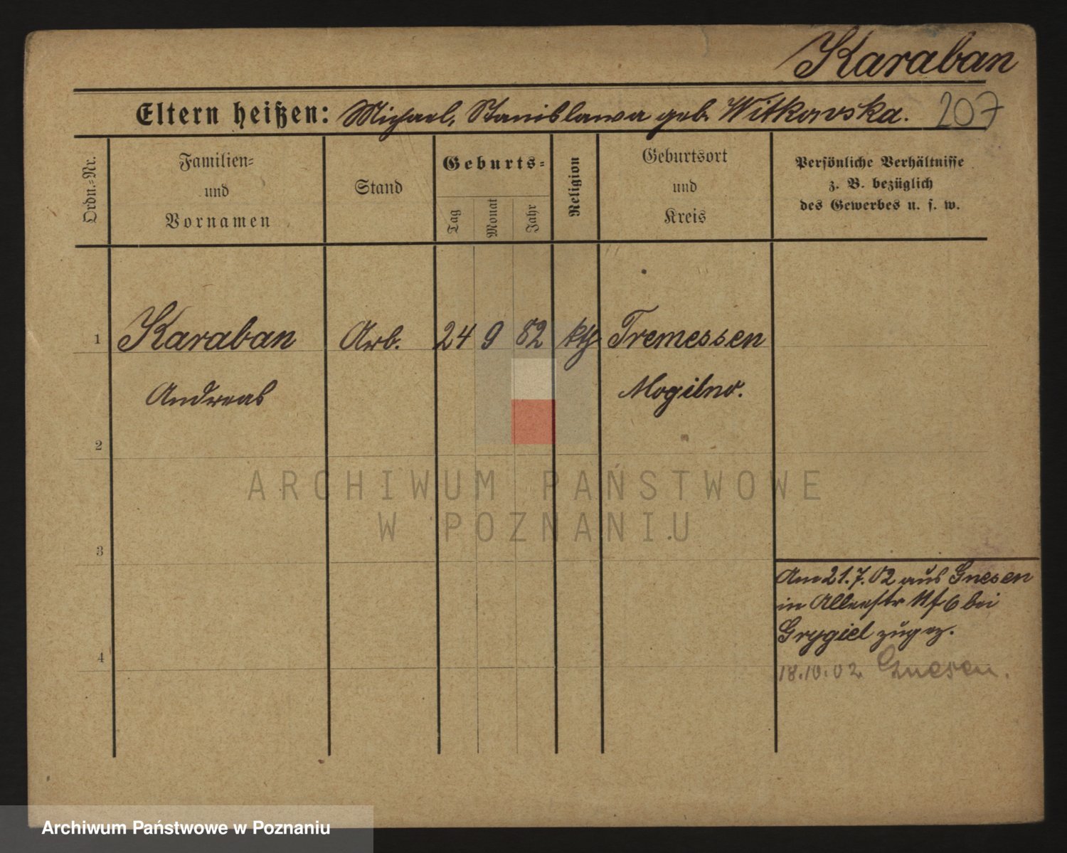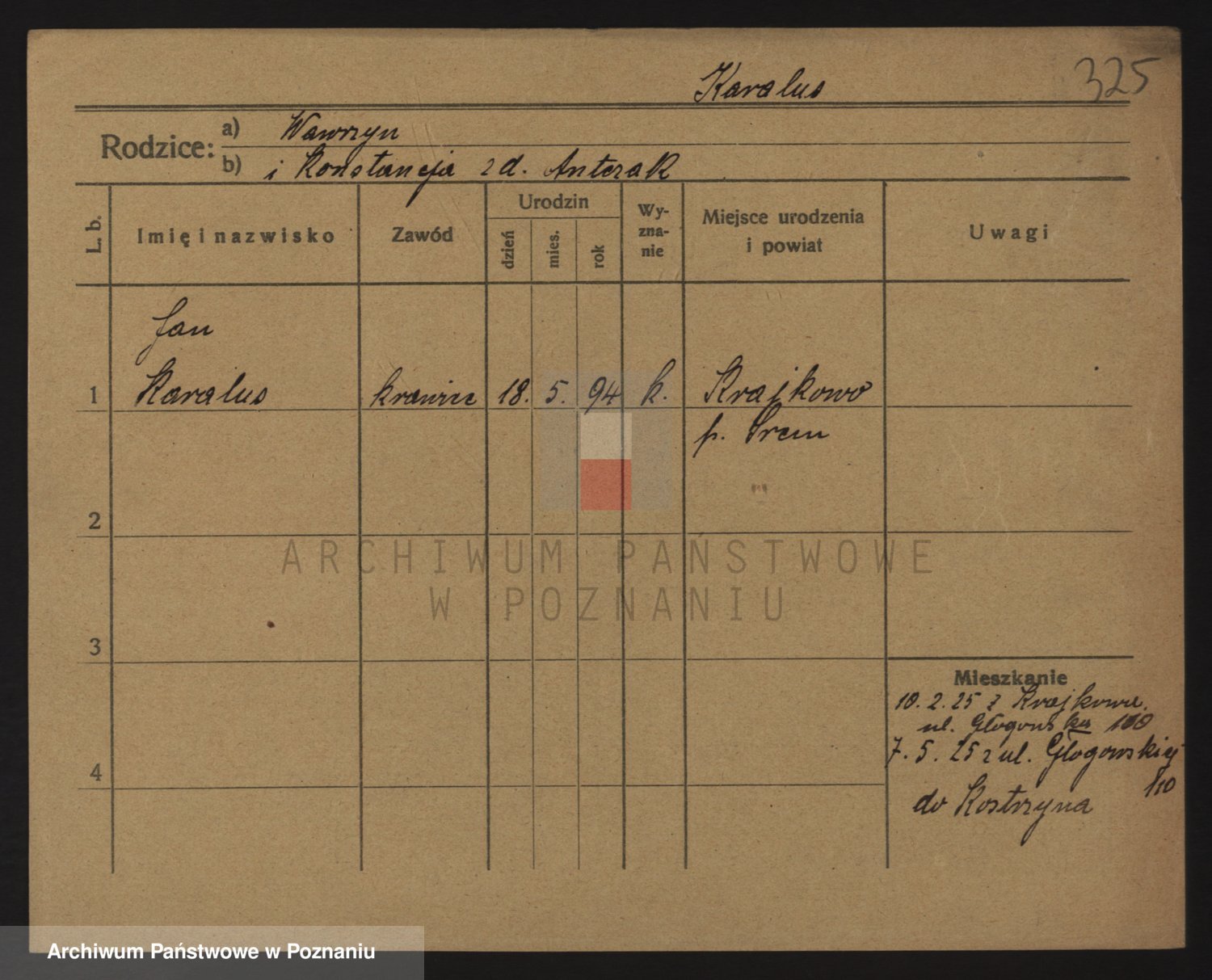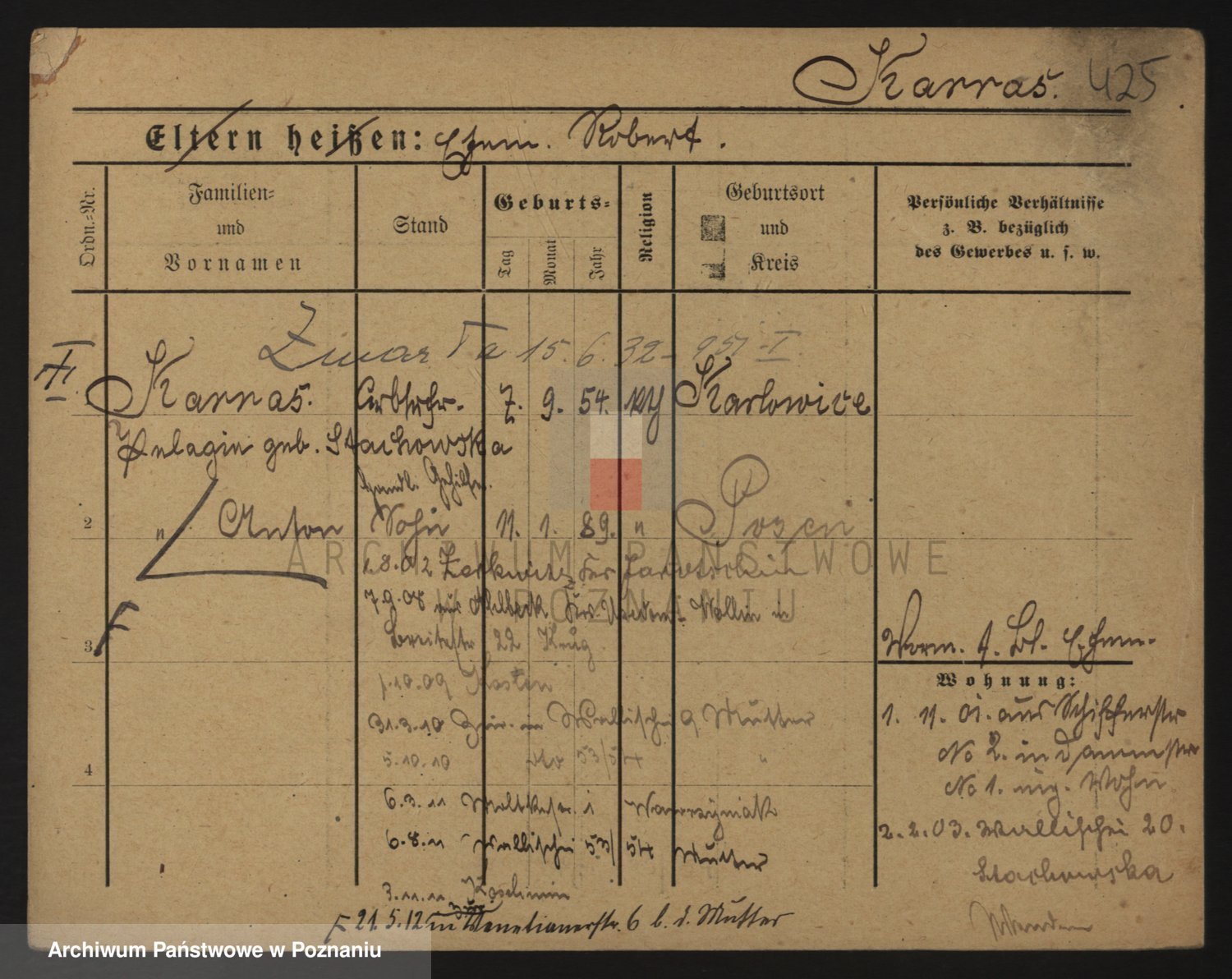 Podgląd karty osobowej dostępny jest po kliknięciu na nazwisko lub ikonkę karty. Można dokonywać powiększenia (ikony na górze) lub przechodzić między kolejnymi skanami (strzałki po bokach).