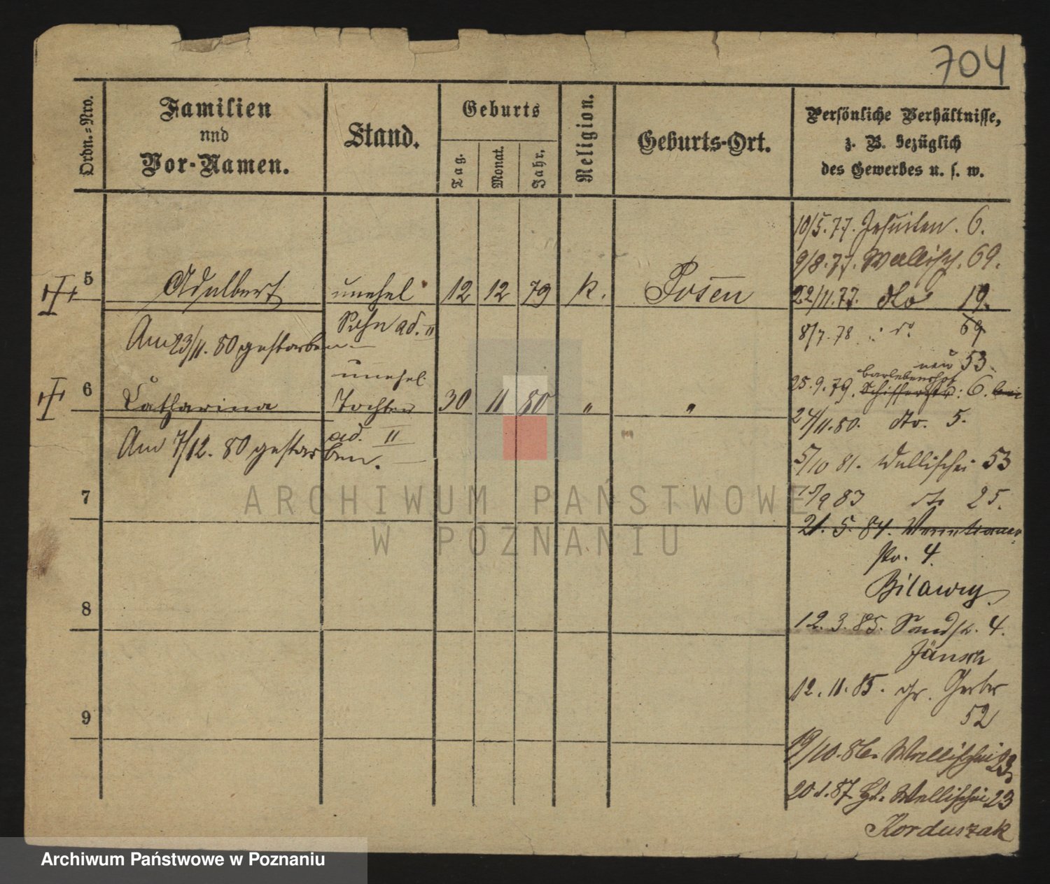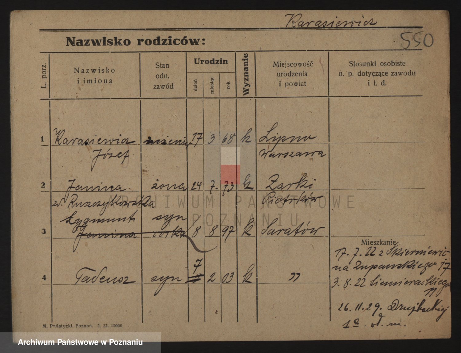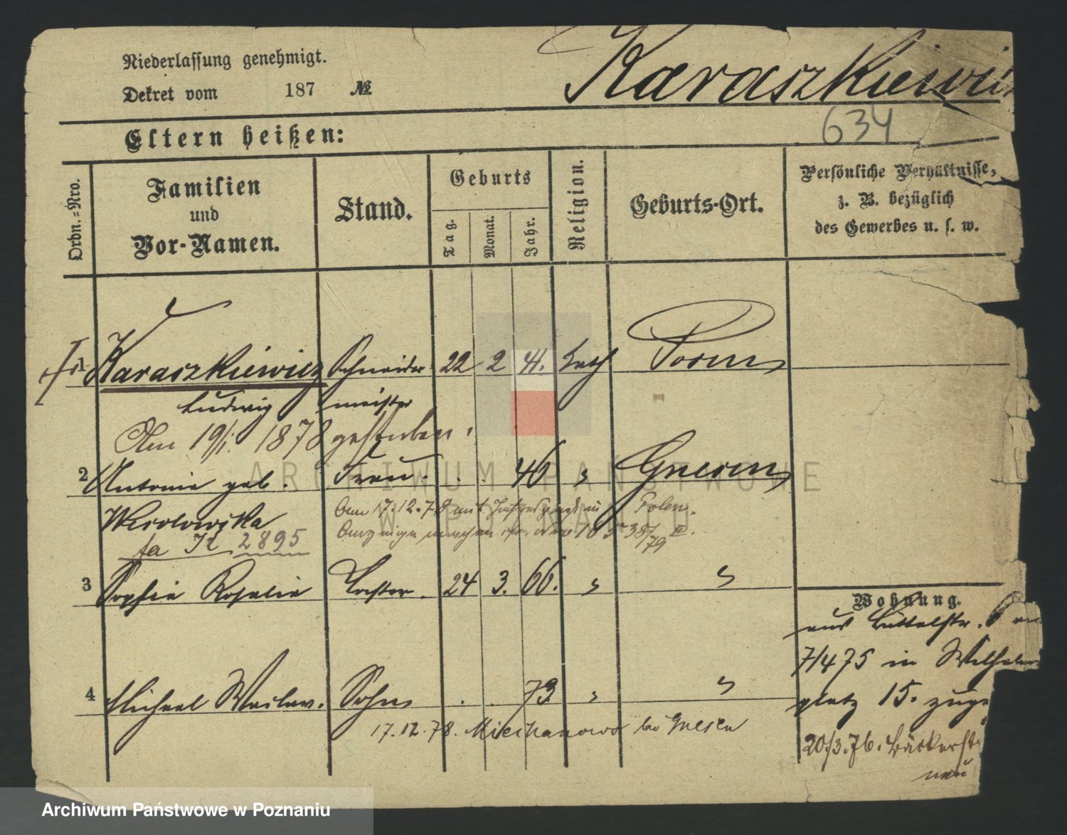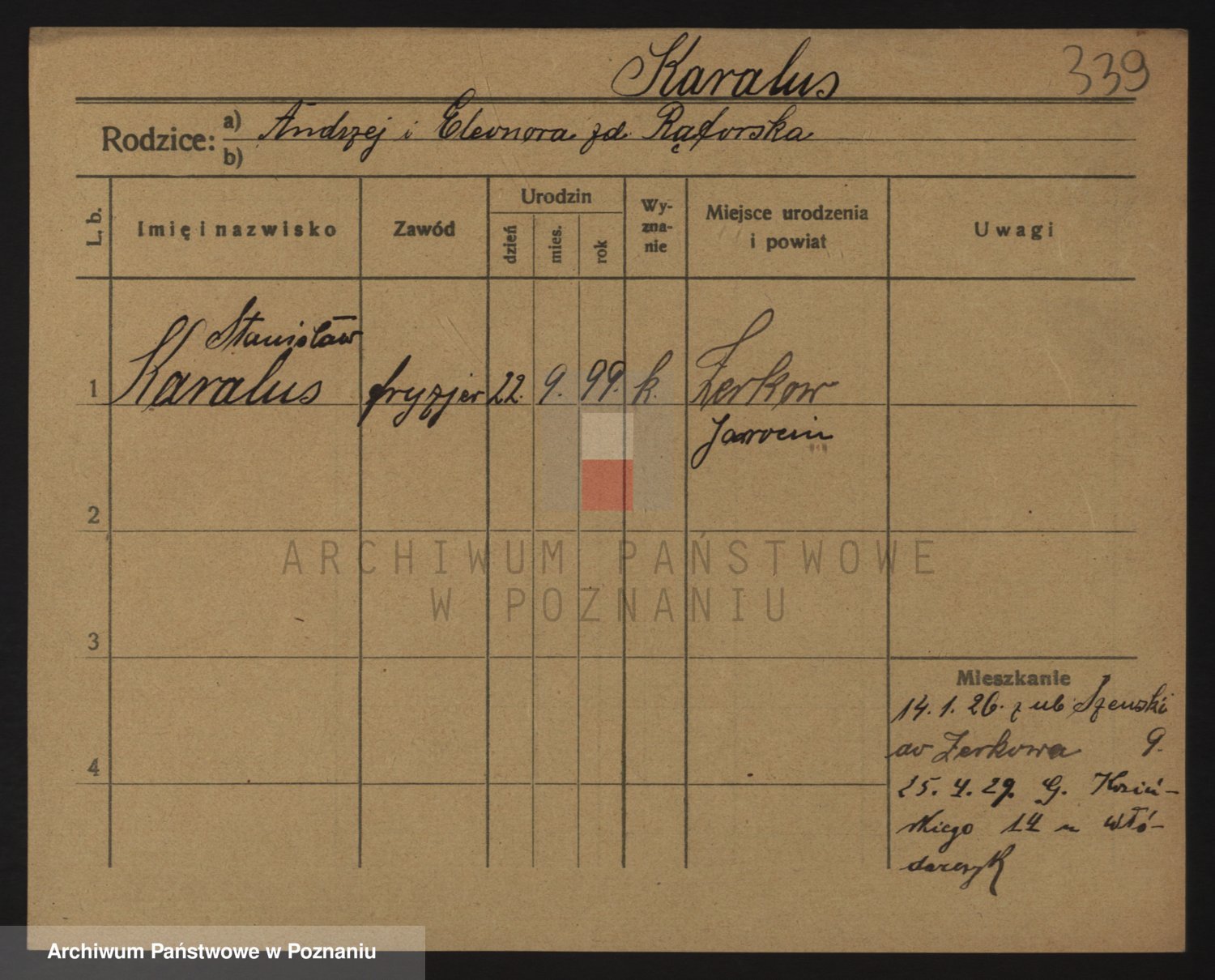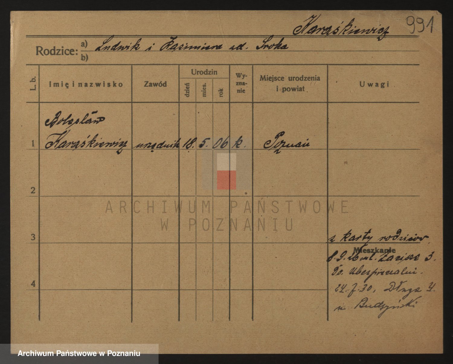 Podgląd karty osobowej dostępny jest po kliknięciu na nazwisko lub ikonkę karty. Można dokonywać powiększenia (ikony na górze) lub przechodzić między kolejnymi skanami (strzałki po bokach).