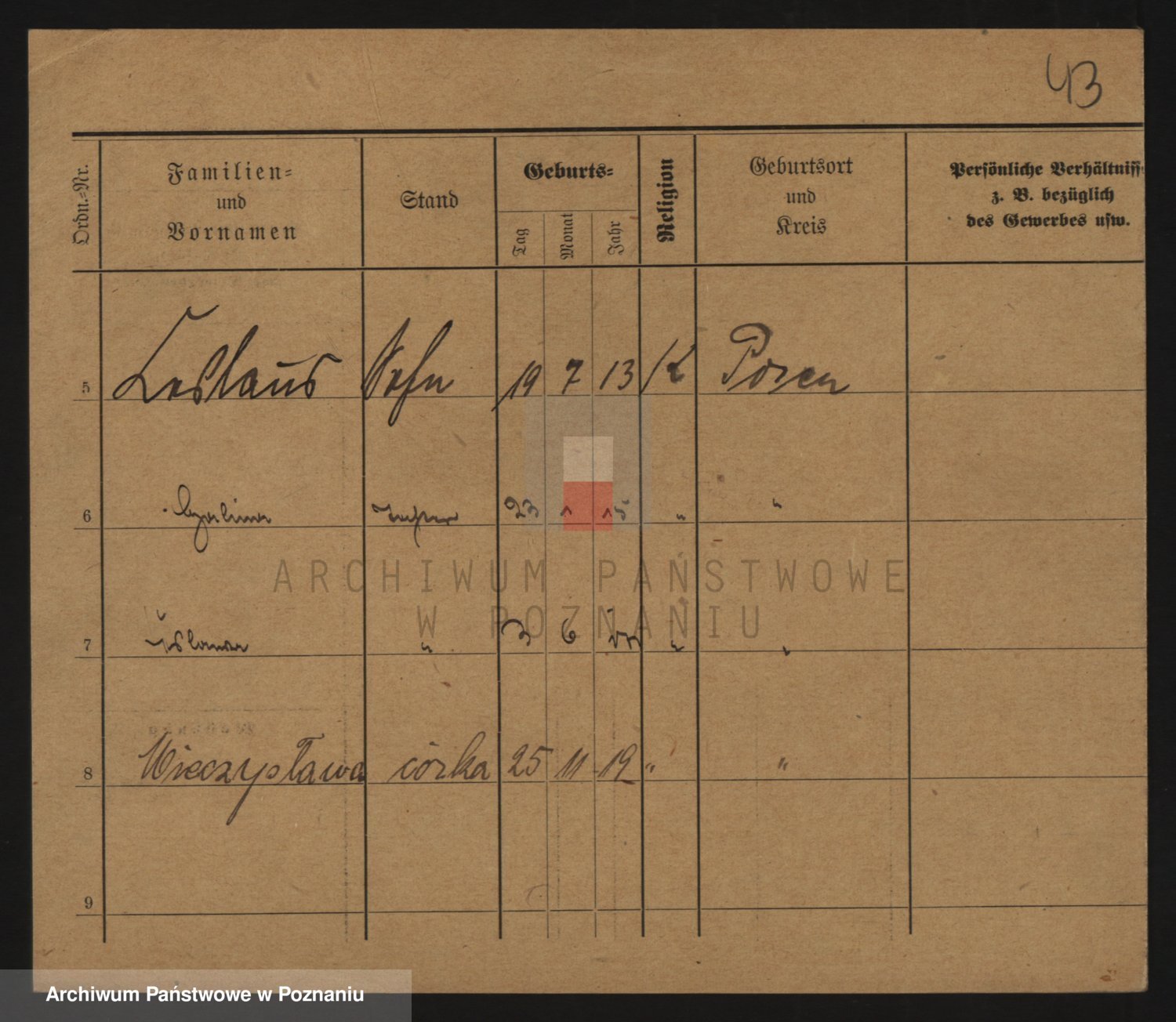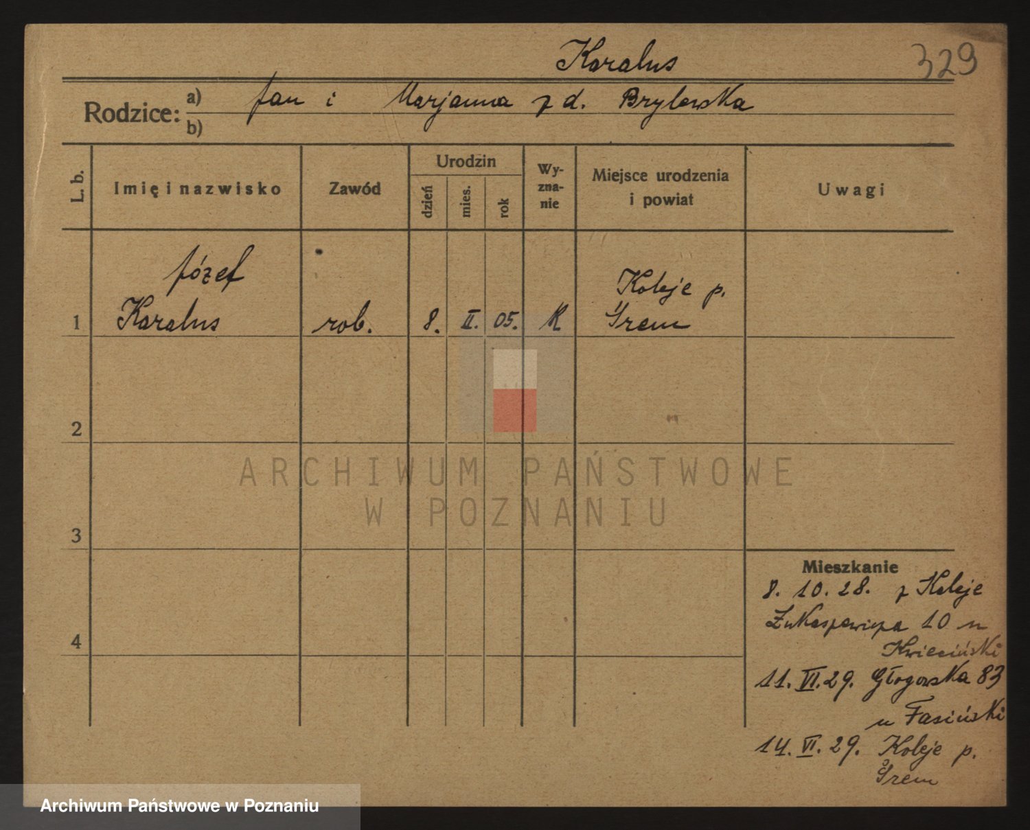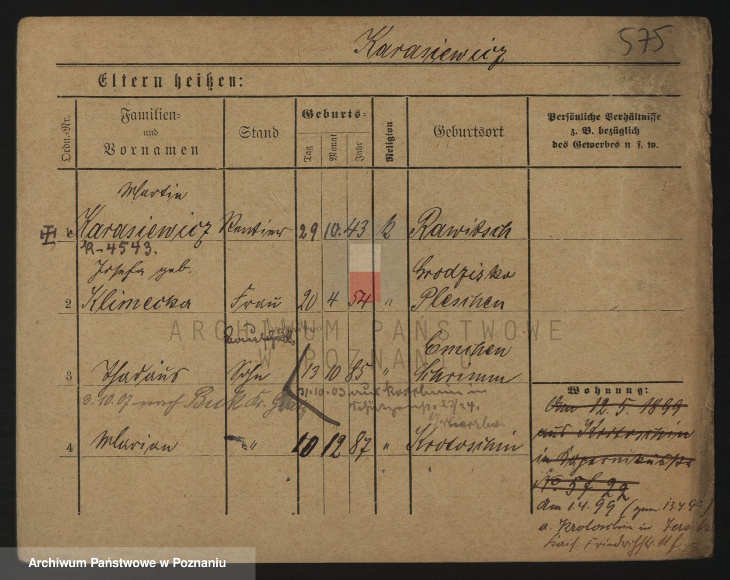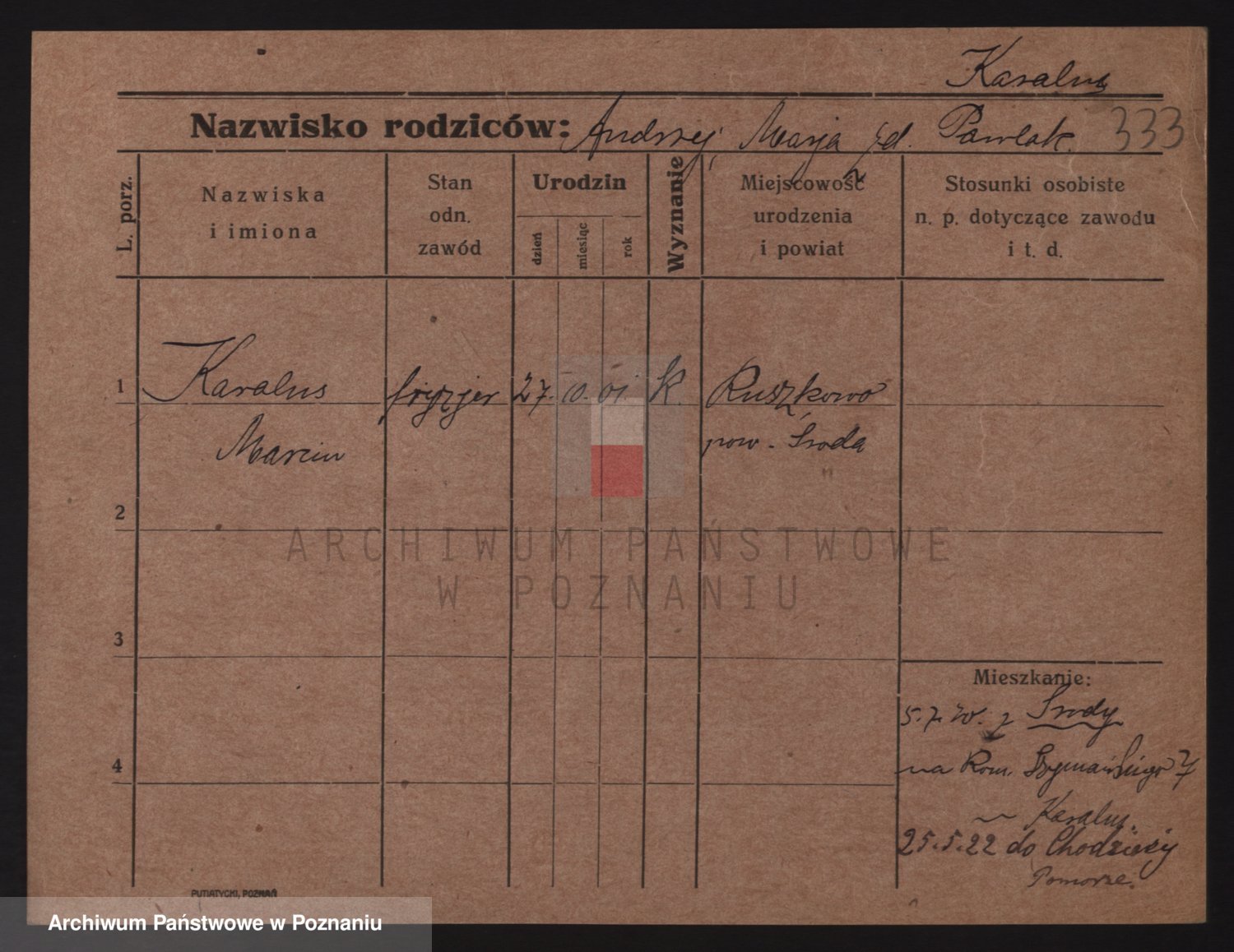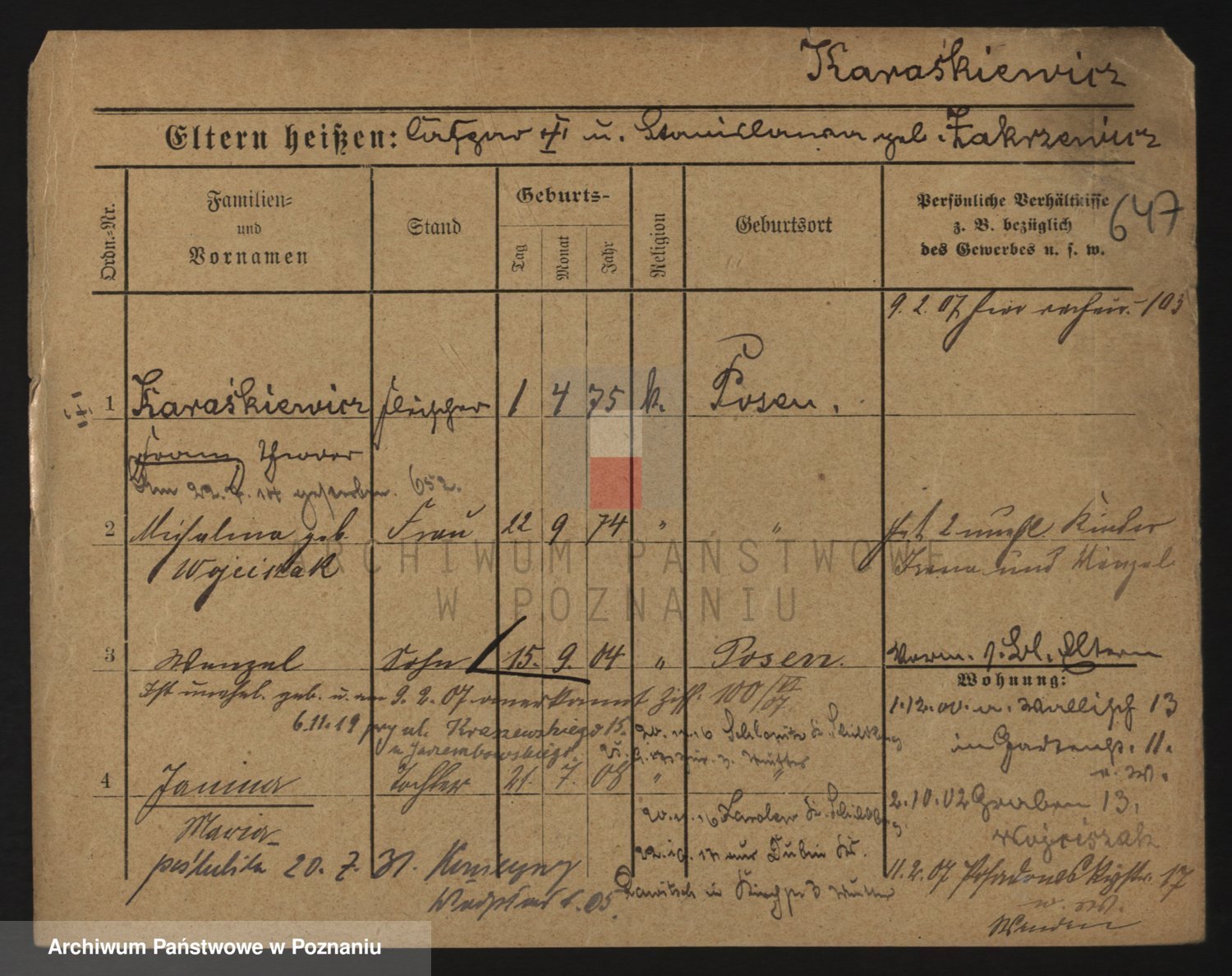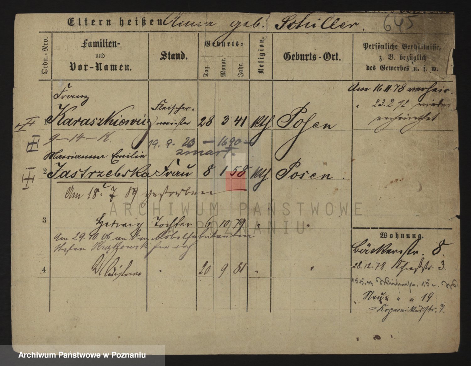 Podgląd karty osobowej dostępny jest po kliknięciu na nazwisko lub ikonkę karty. Można dokonywać powiększenia (ikony na górze) lub przechodzić między kolejnymi skanami (strzałki po bokach).