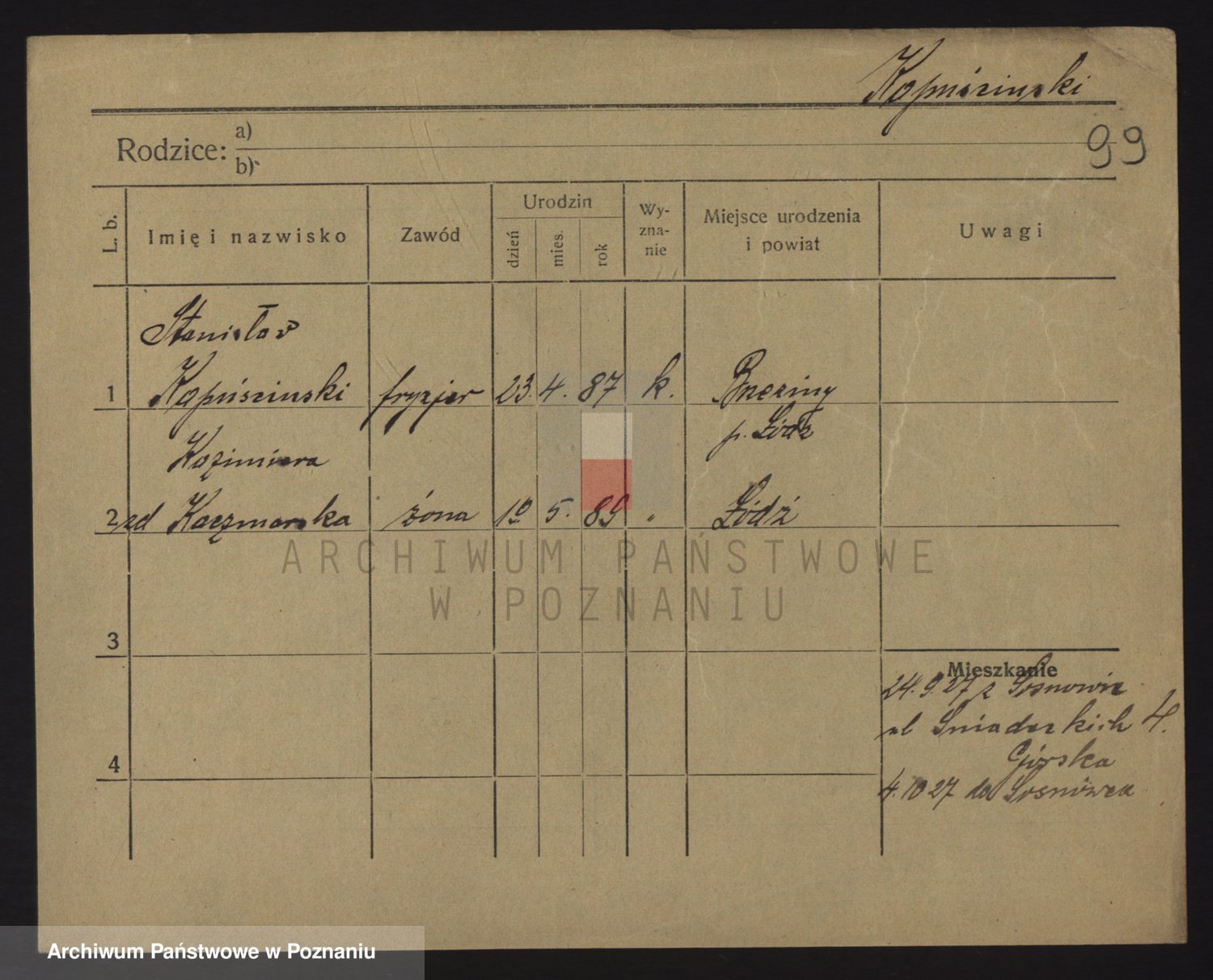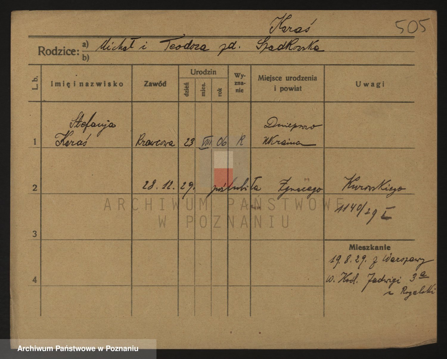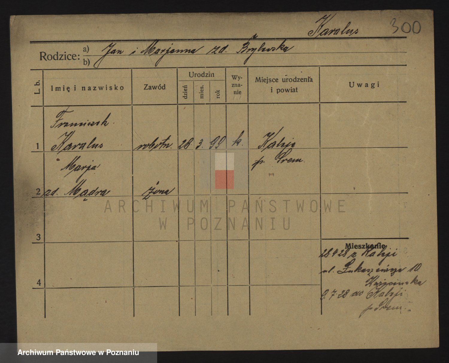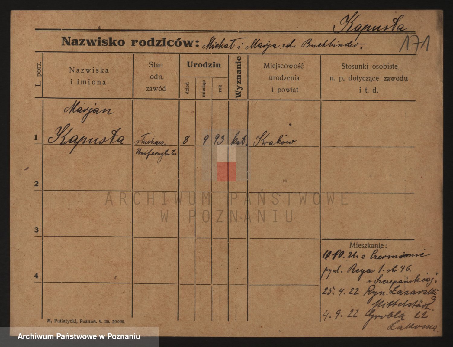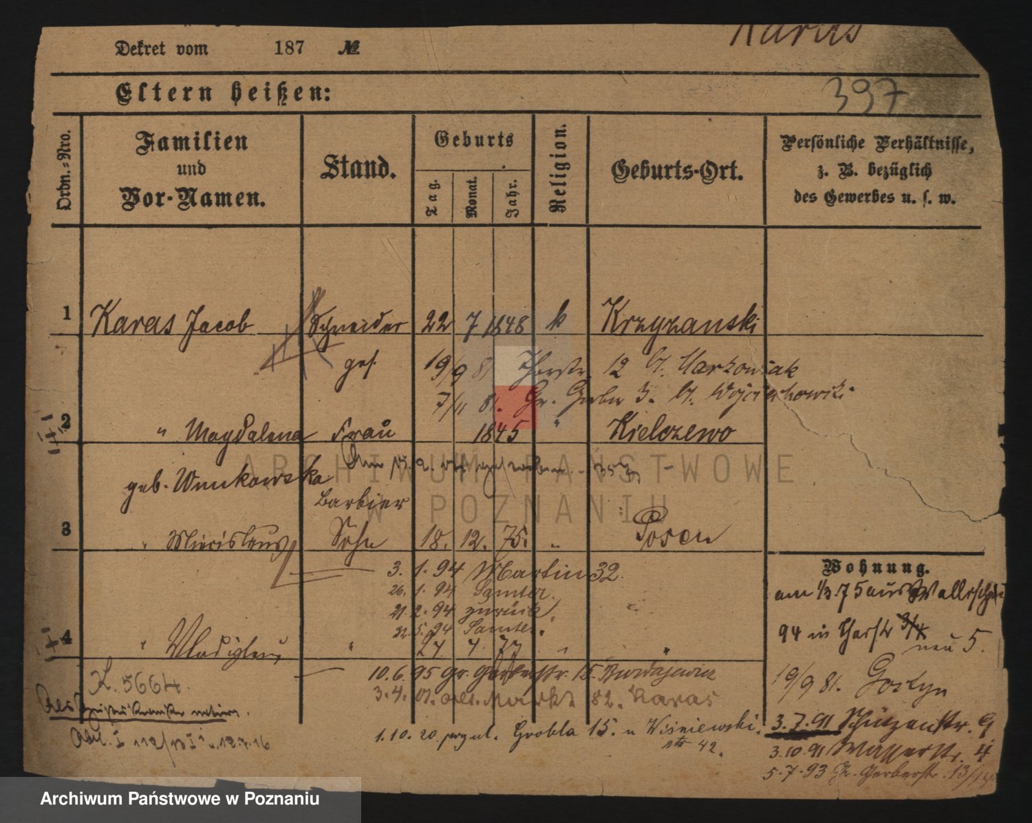 Podgląd karty osobowej dostępny jest po kliknięciu na nazwisko lub ikonkę karty. Można dokonywać powiększenia (ikony na górze) lub przechodzić między kolejnymi skanami (strzałki po bokach).