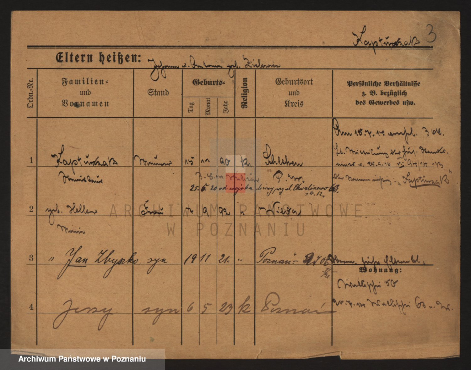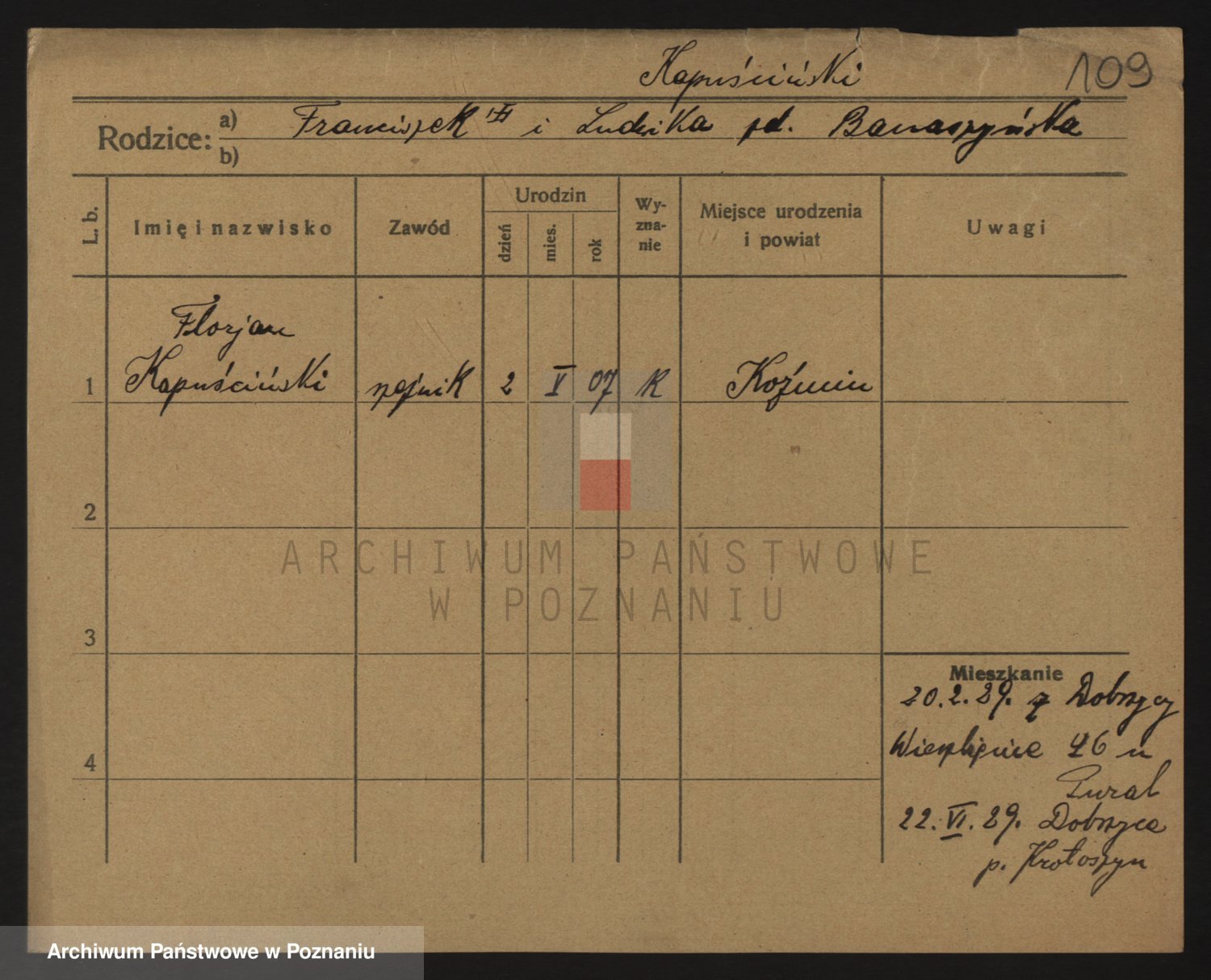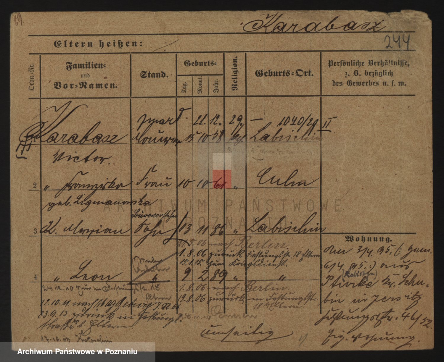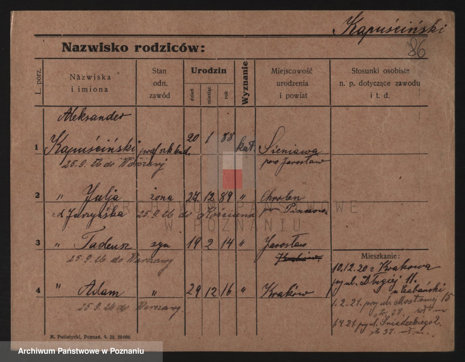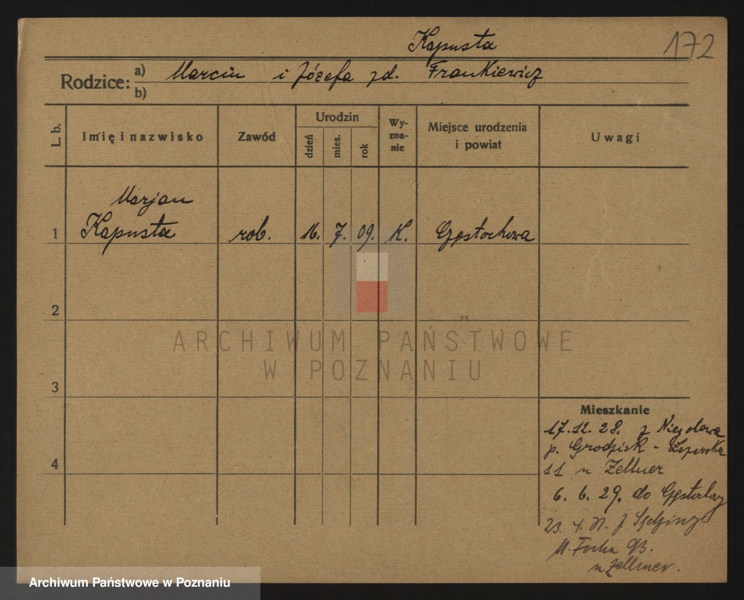 Podgląd karty osobowej dostępny jest po kliknięciu na nazwisko lub ikonkę karty. Można dokonywać powiększenia (ikony na górze) lub przechodzić między kolejnymi skanami (strzałki po bokach).