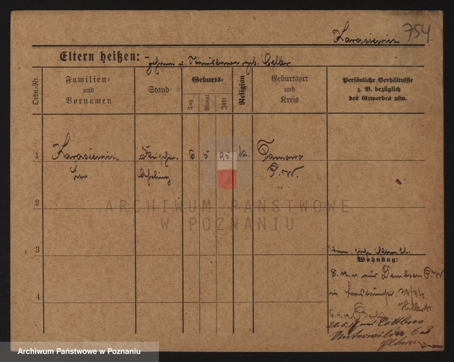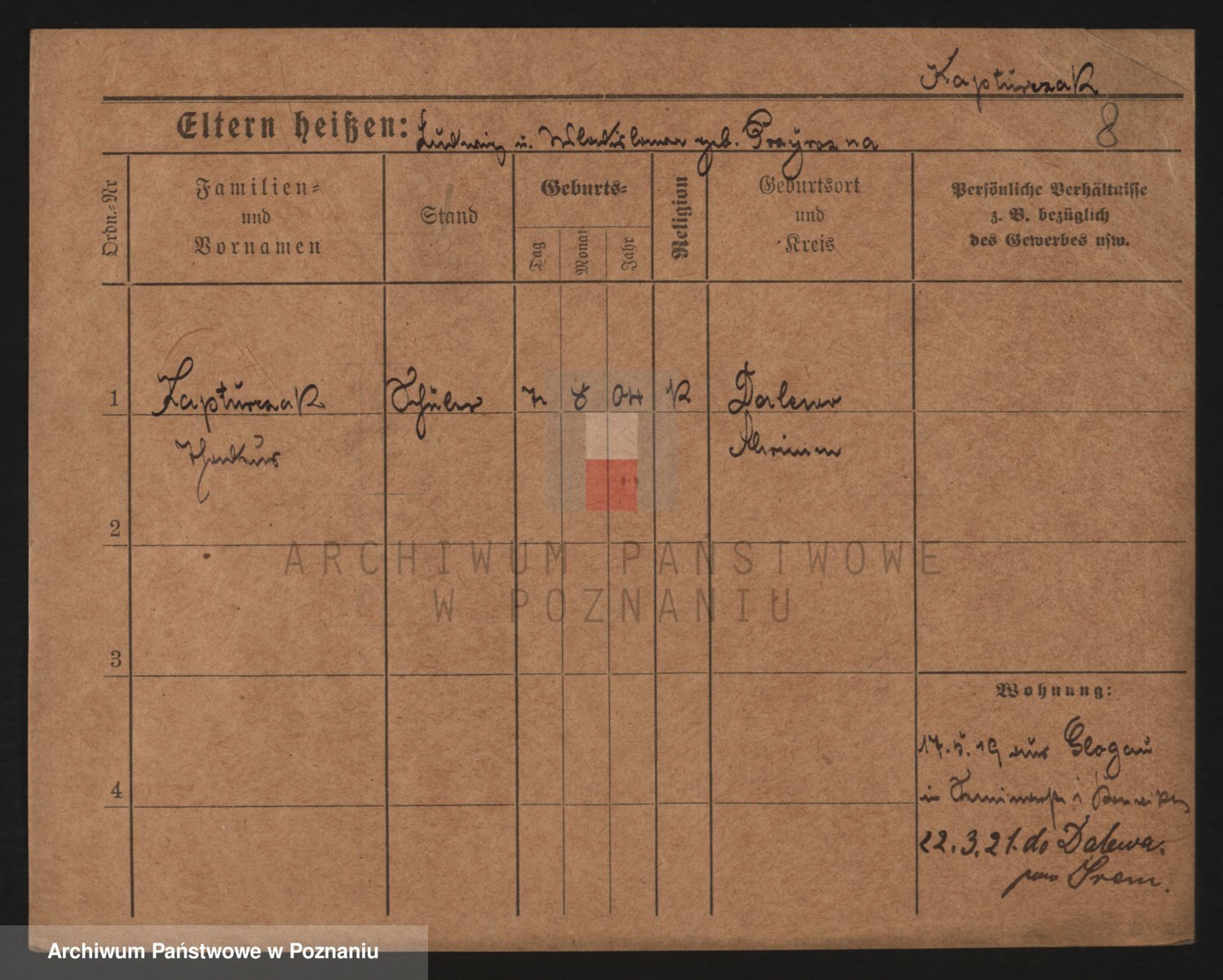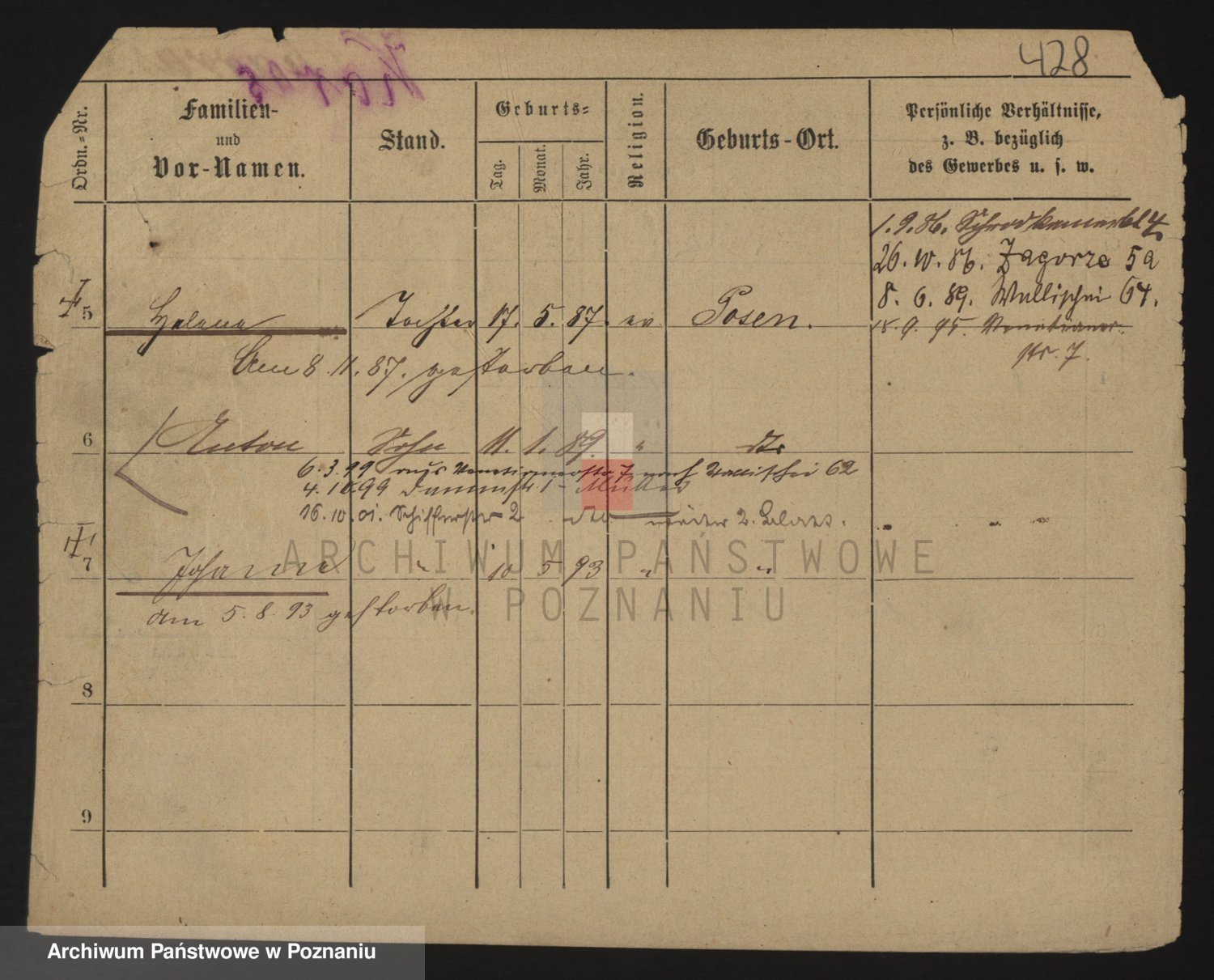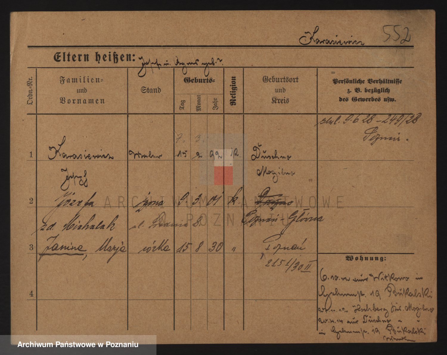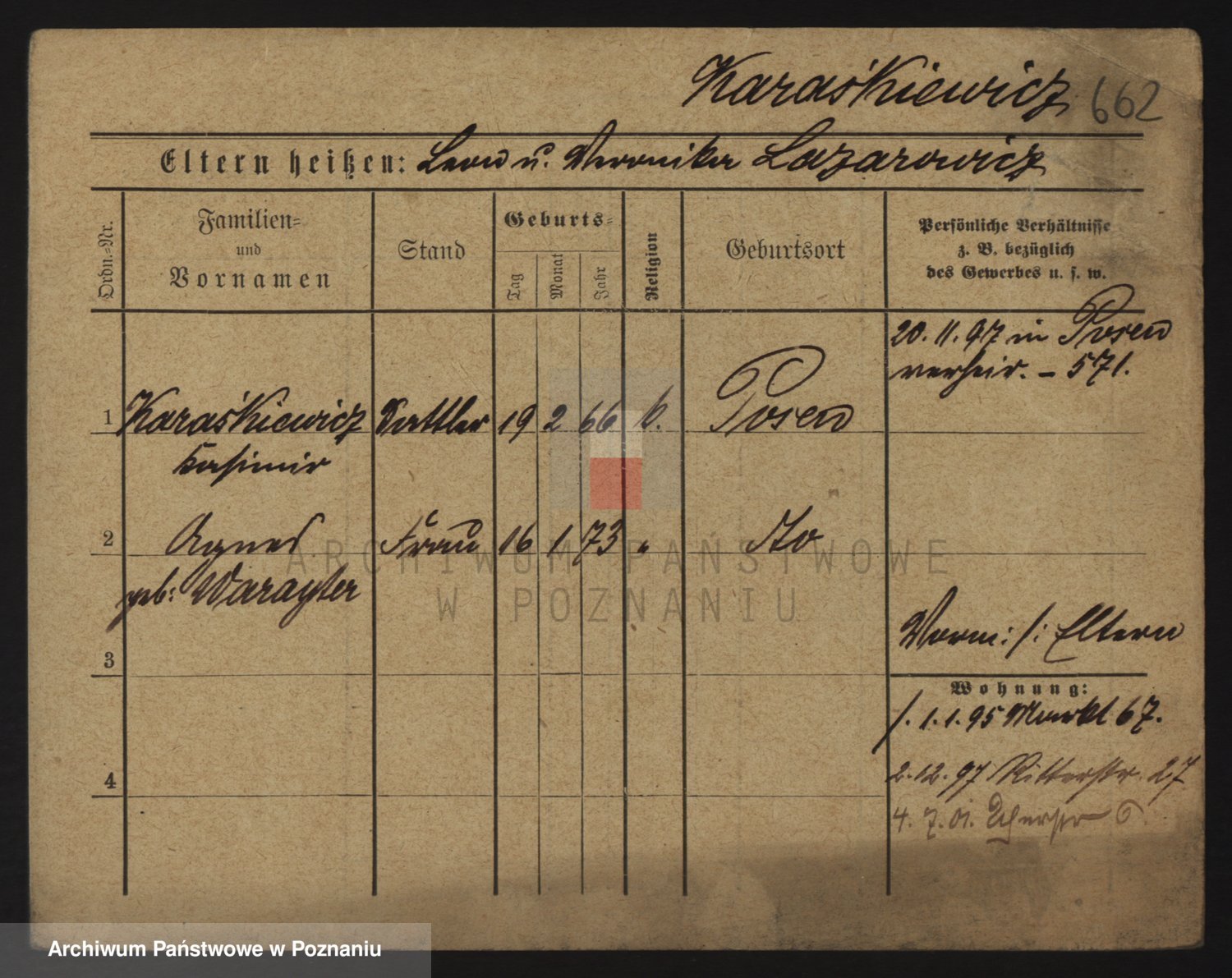 Podgląd karty osobowej dostępny jest po kliknięciu na nazwisko lub ikonkę karty. Można dokonywać powiększenia (ikony na górze) lub przechodzić między kolejnymi skanami (strzałki po bokach).