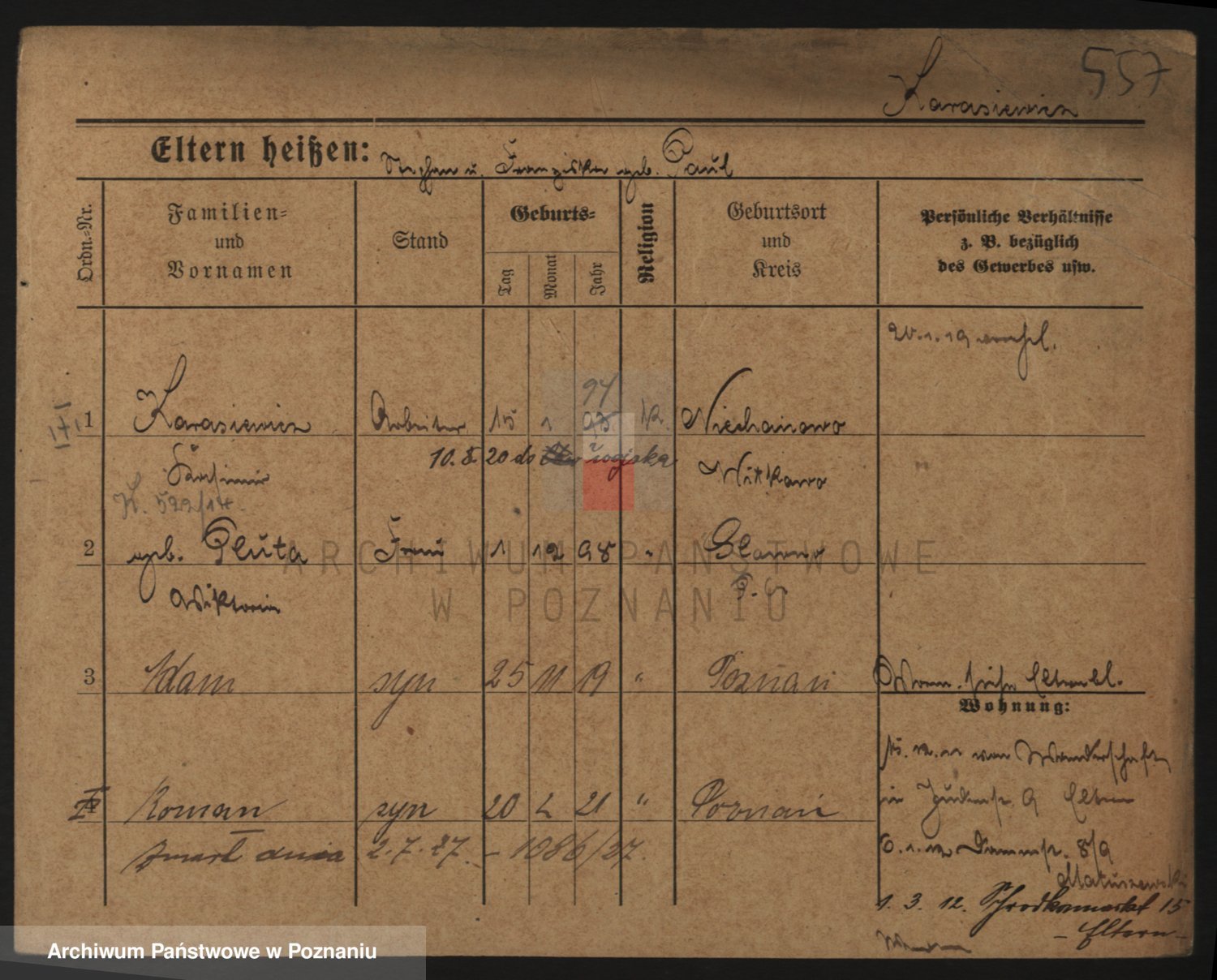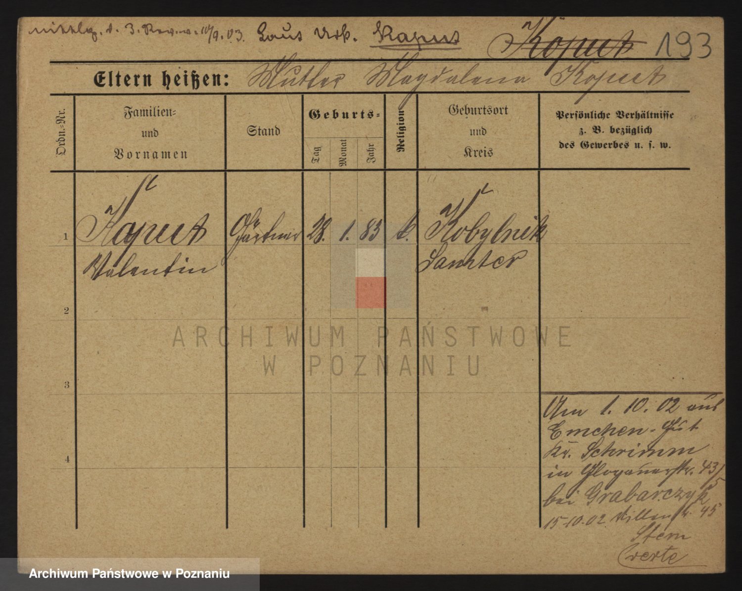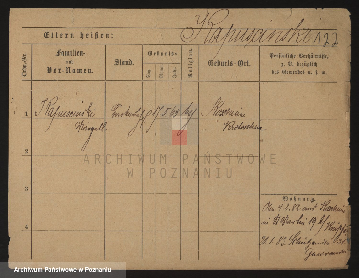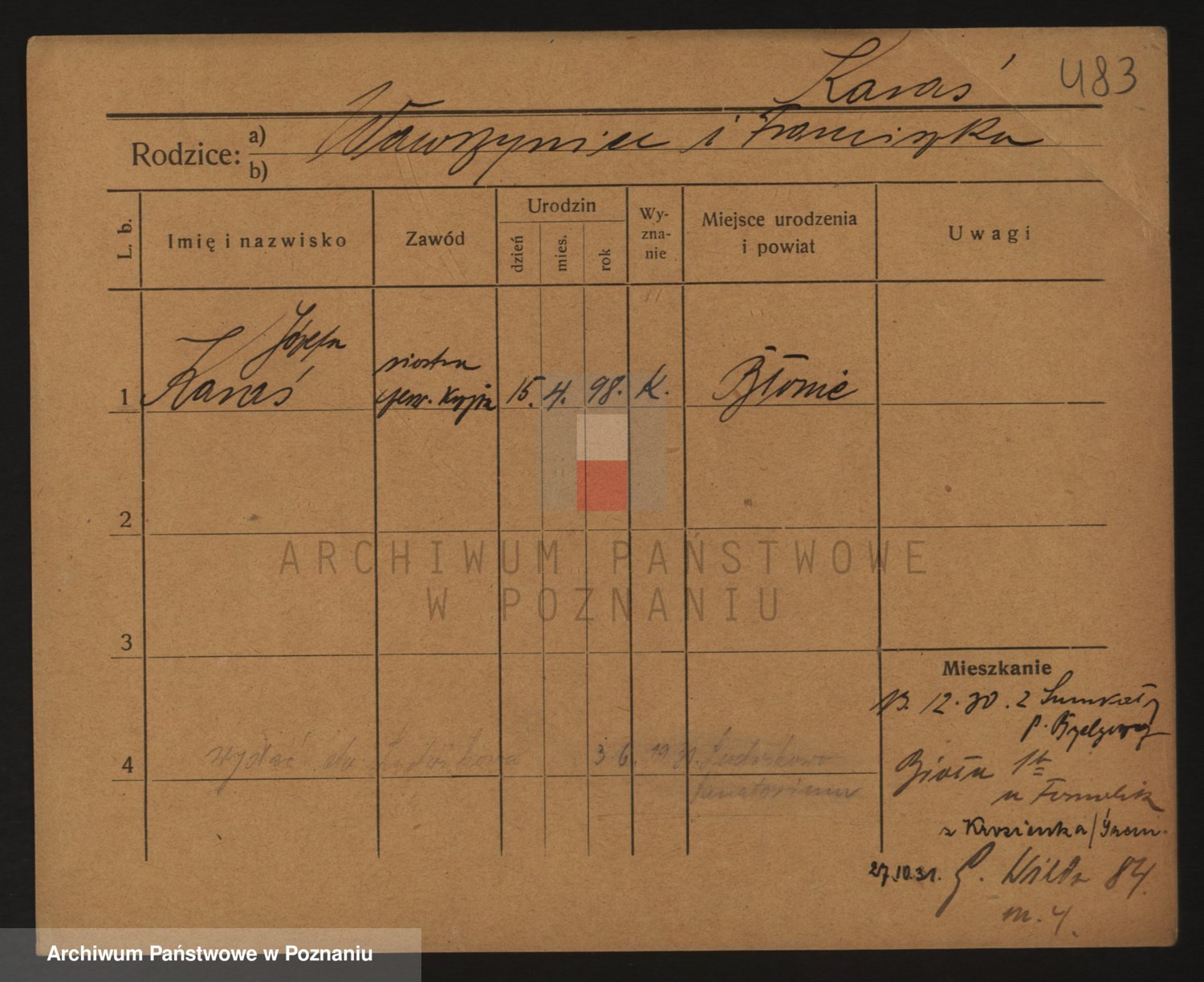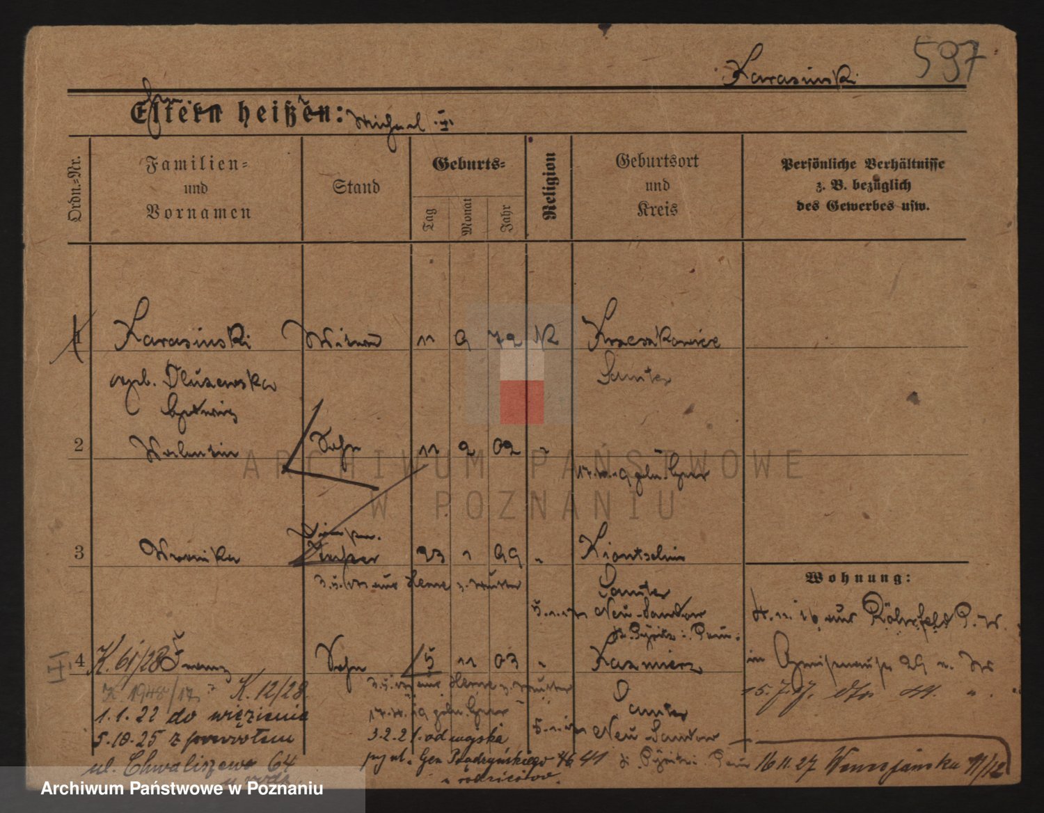 Podgląd karty osobowej dostępny jest po kliknięciu na nazwisko lub ikonkę karty. Można dokonywać powiększenia (ikony na górze) lub przechodzić między kolejnymi skanami (strzałki po bokach).