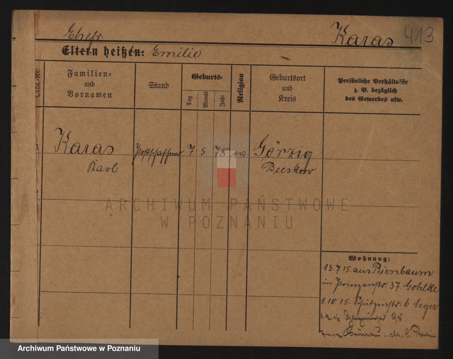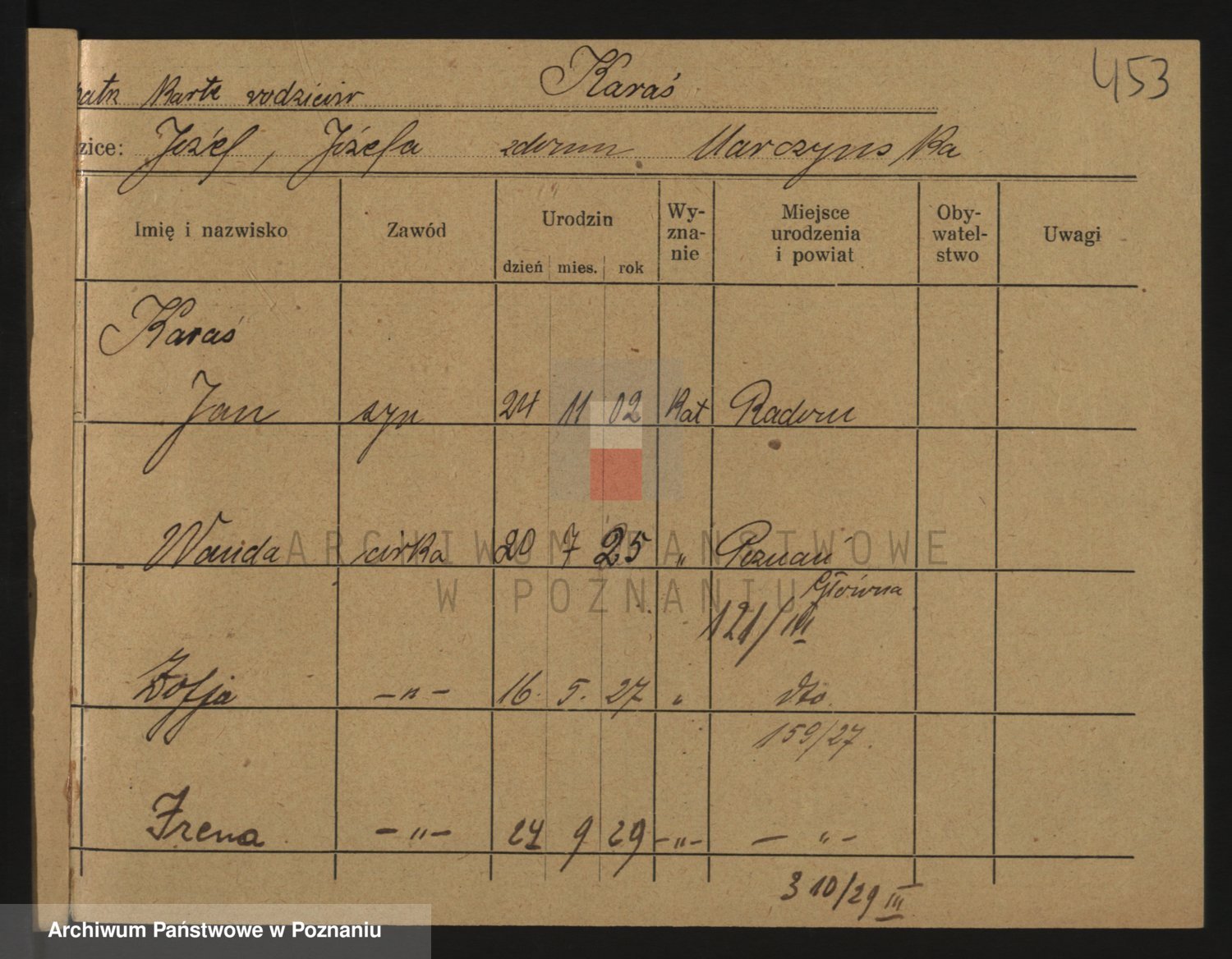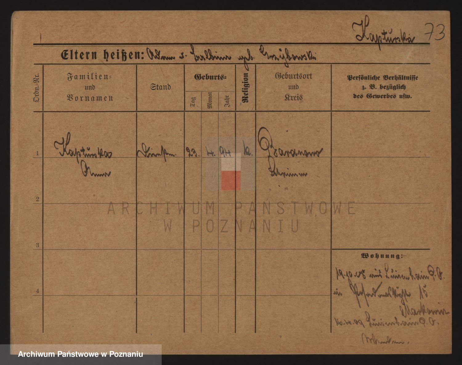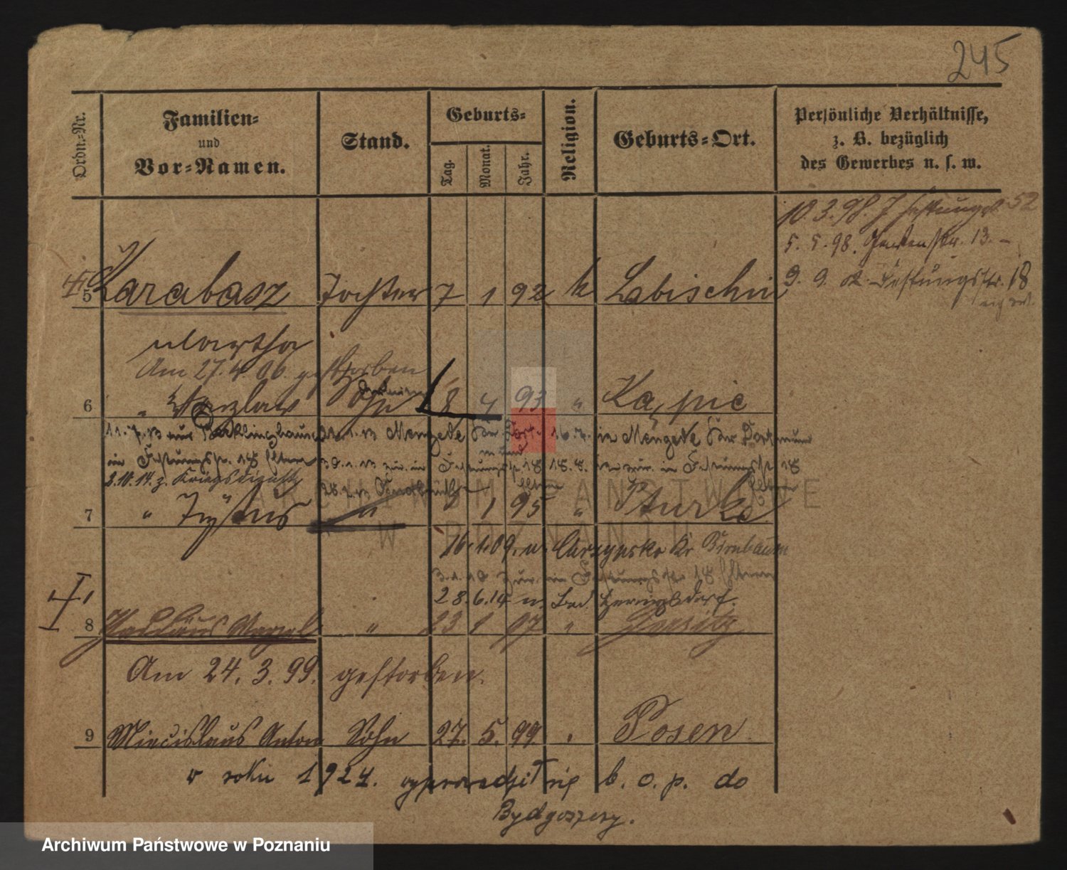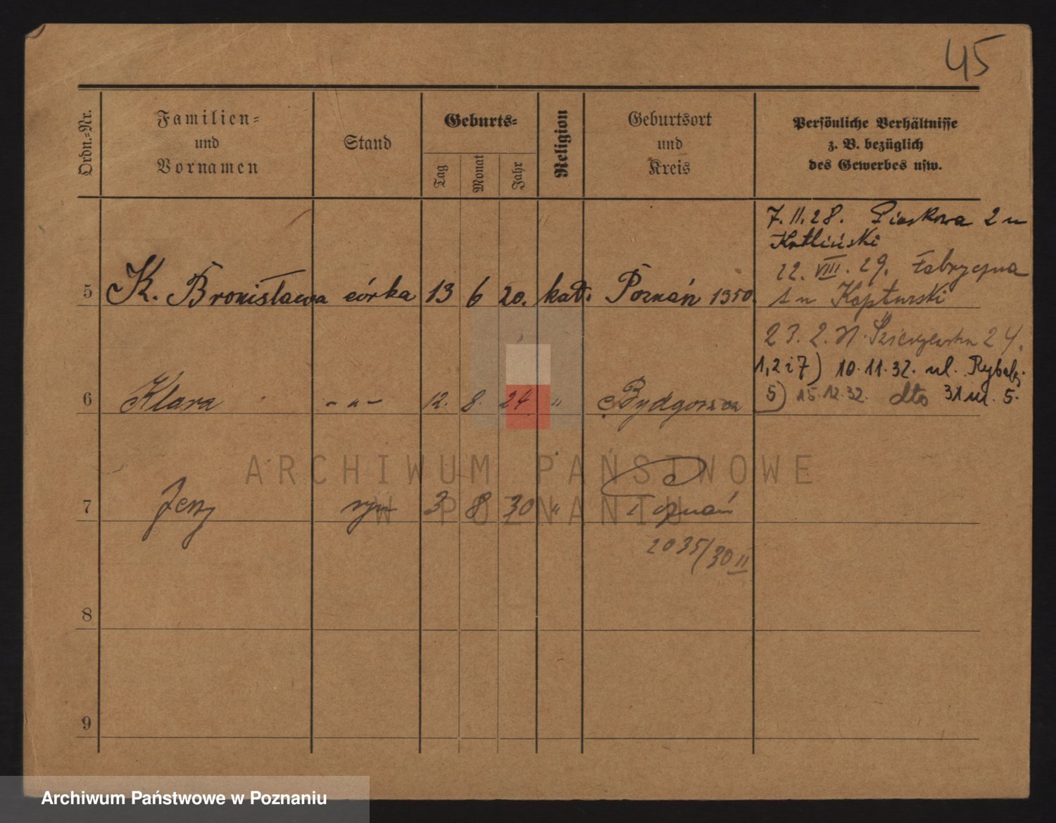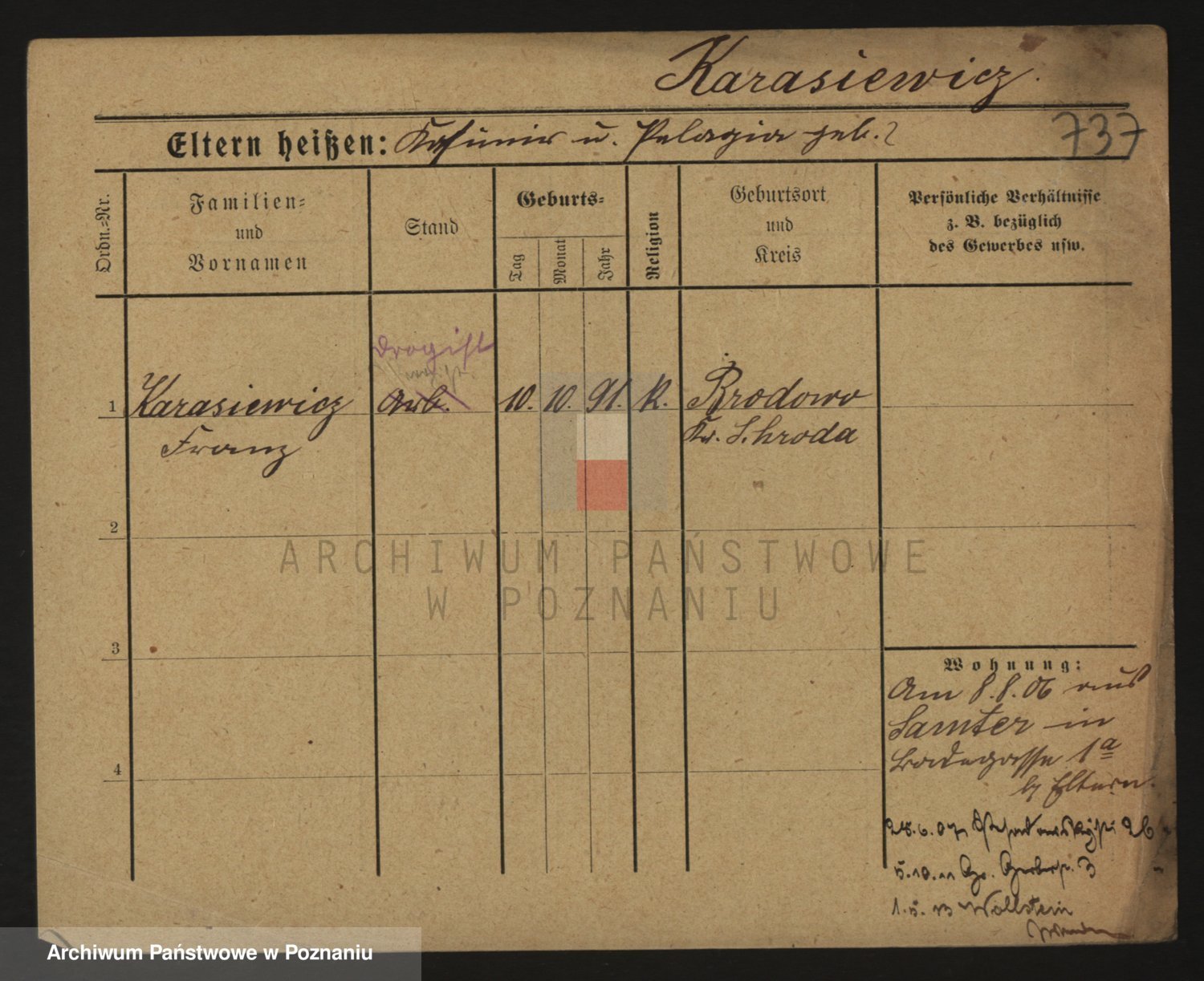 Podgląd karty osobowej dostępny jest po kliknięciu na nazwisko lub ikonkę karty. Można dokonywać powiększenia (ikony na górze) lub przechodzić między kolejnymi skanami (strzałki po bokach).