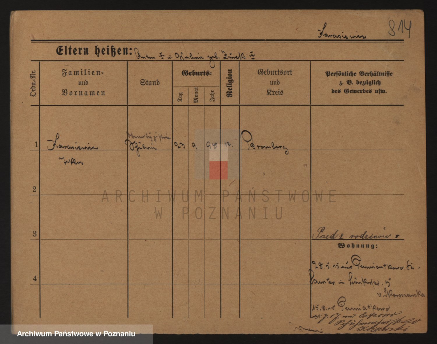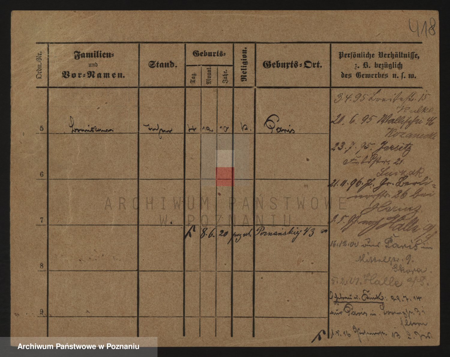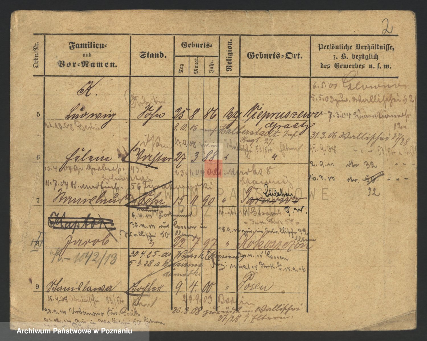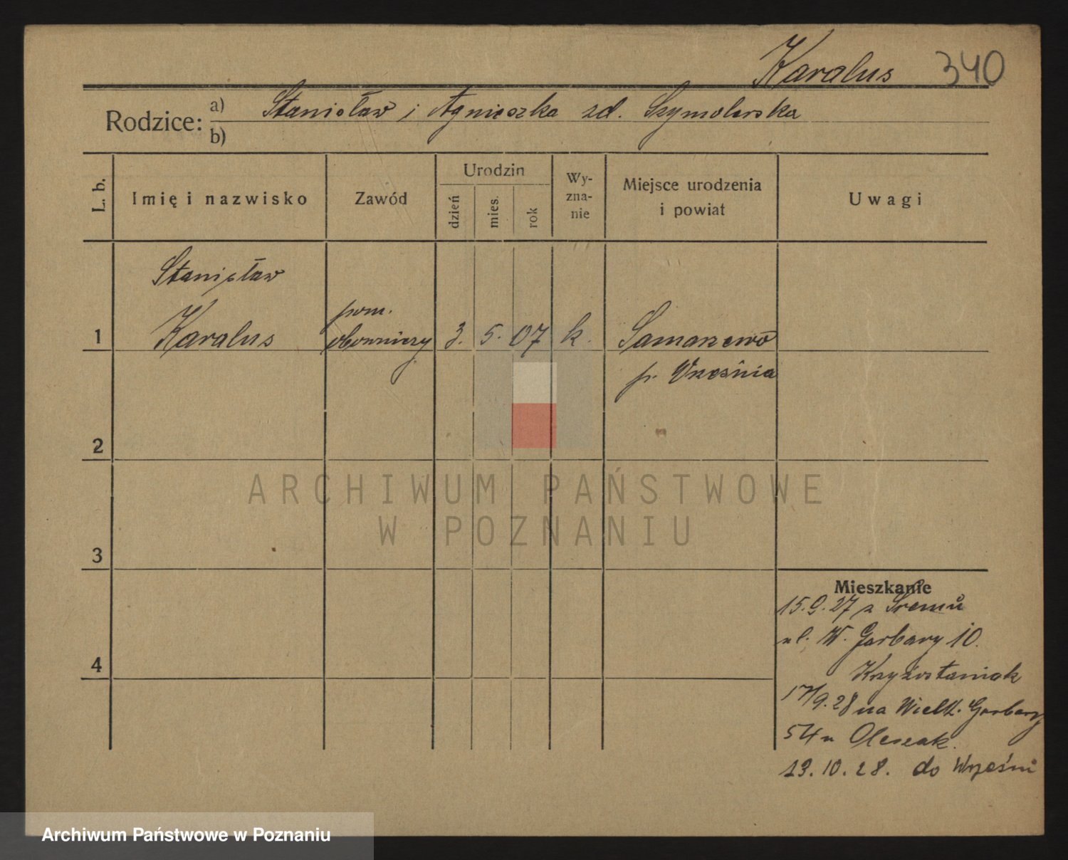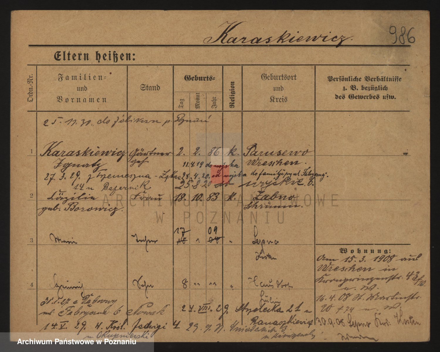 Podgląd karty osobowej dostępny jest po kliknięciu na nazwisko lub ikonkę karty. Można dokonywać powiększenia (ikony na górze) lub przechodzić między kolejnymi skanami (strzałki po bokach).