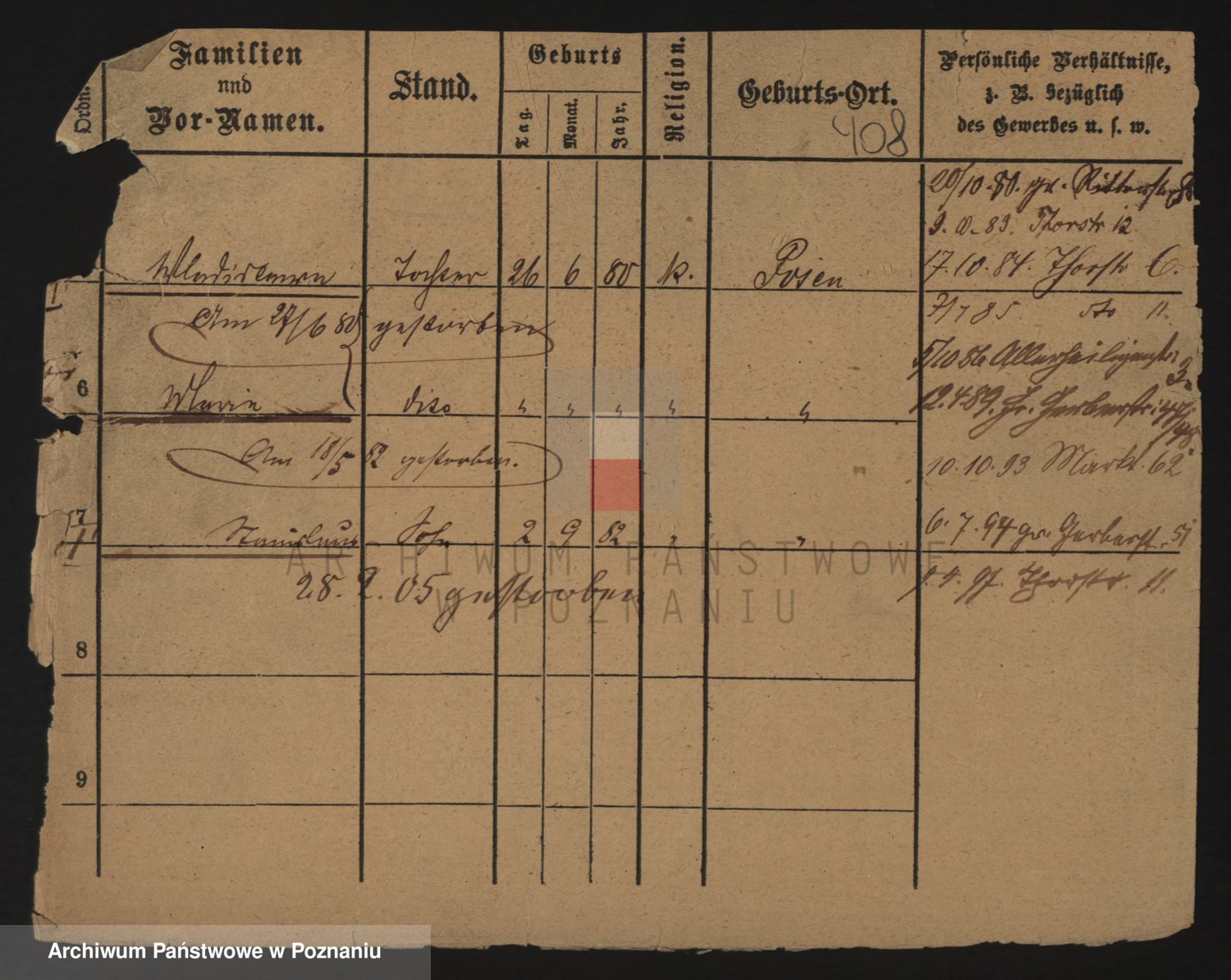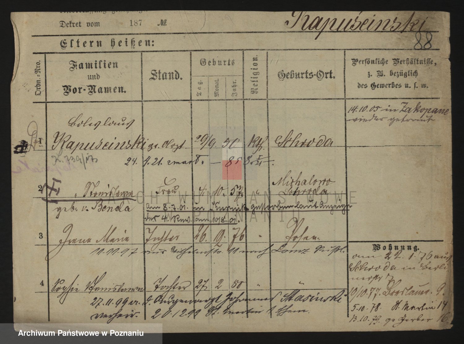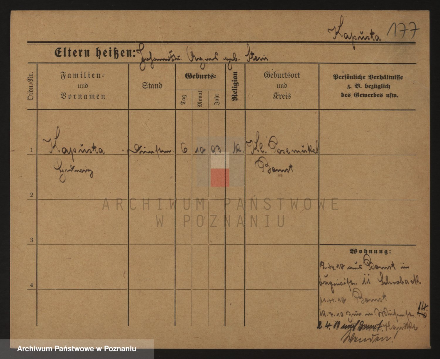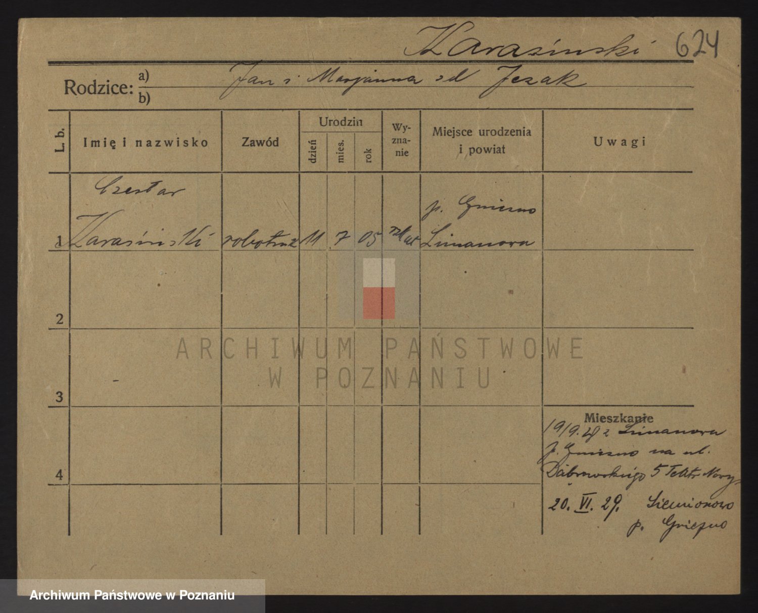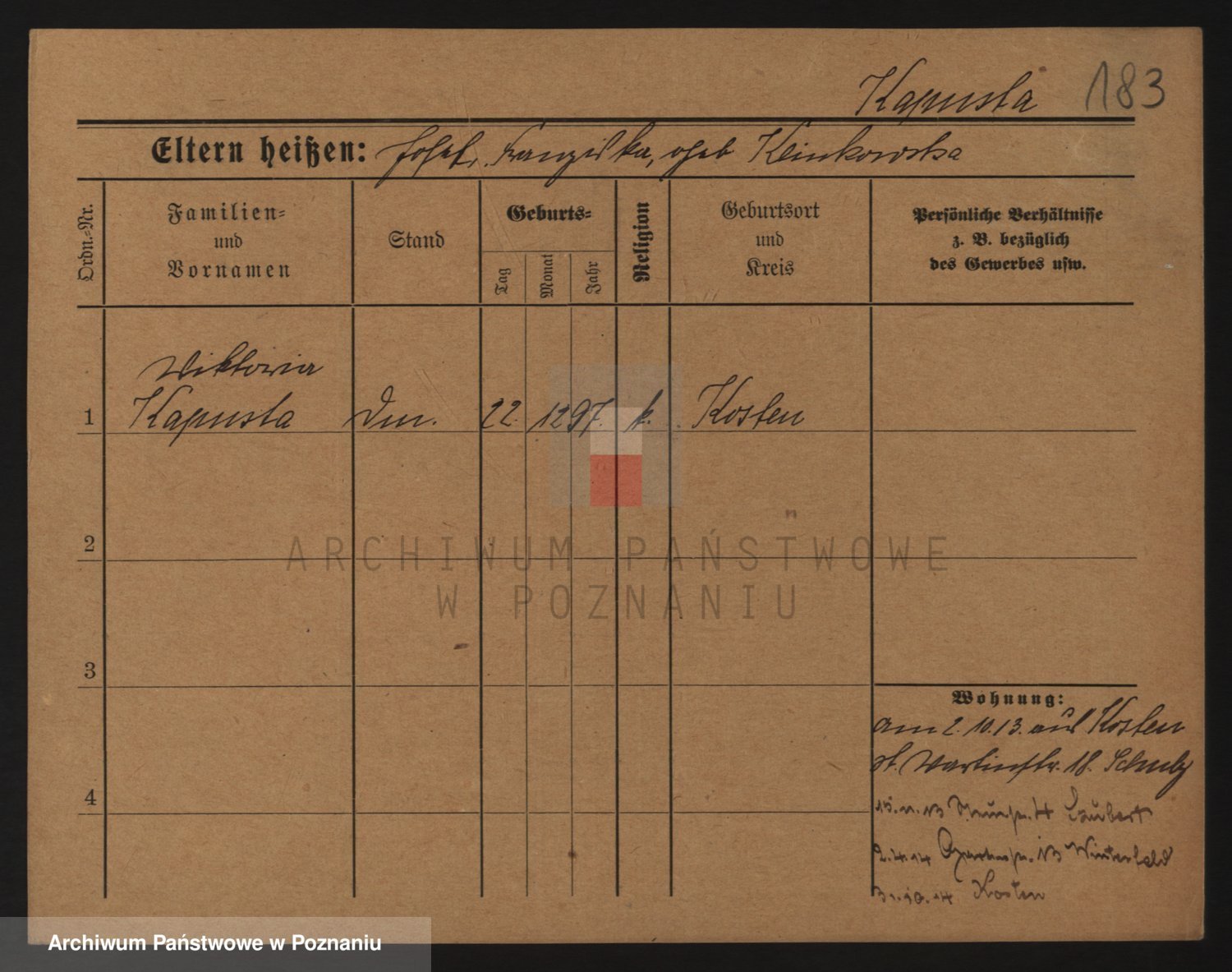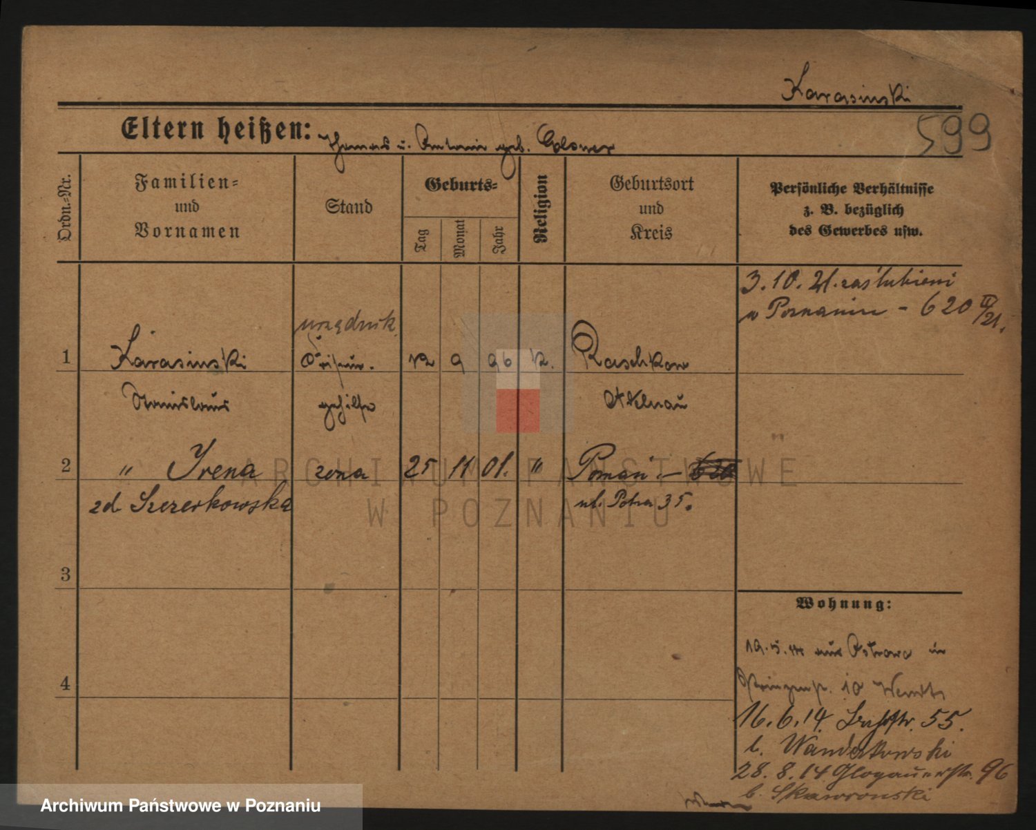 Podgląd karty osobowej dostępny jest po kliknięciu na nazwisko lub ikonkę karty. Można dokonywać powiększenia (ikony na górze) lub przechodzić między kolejnymi skanami (strzałki po bokach).