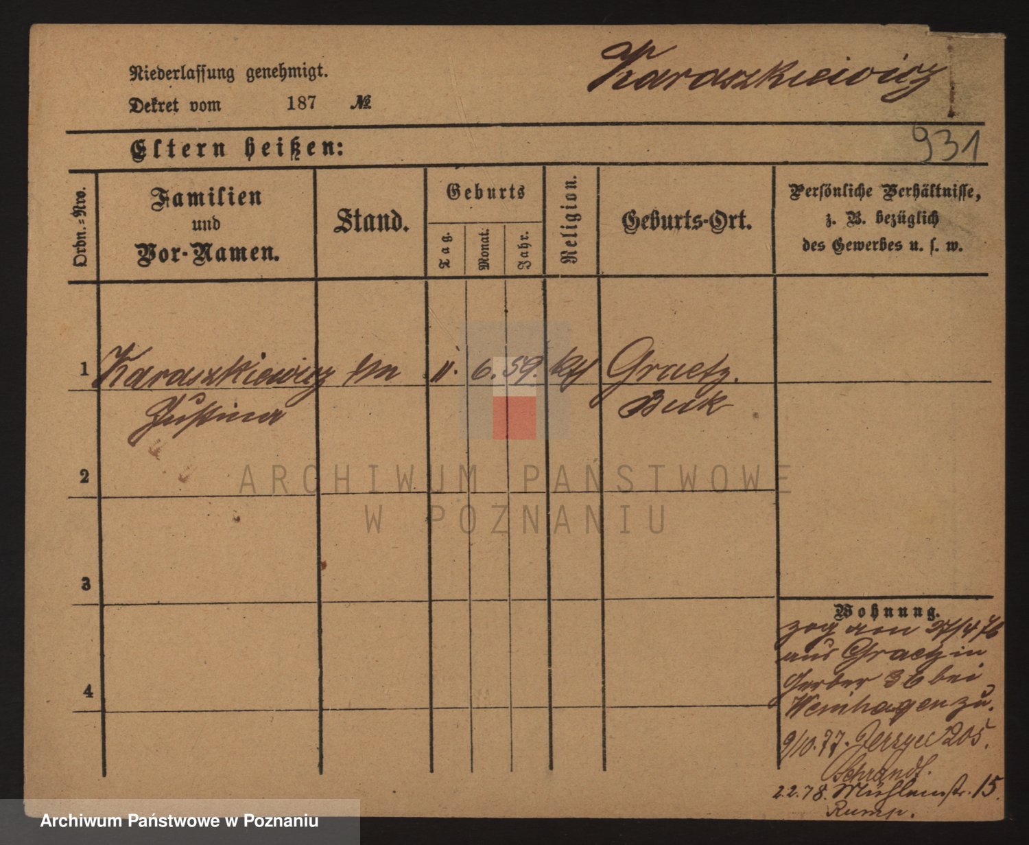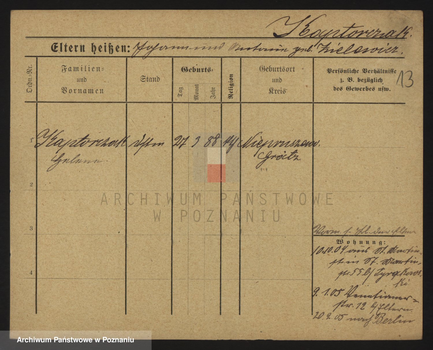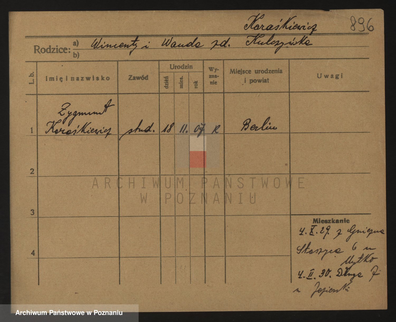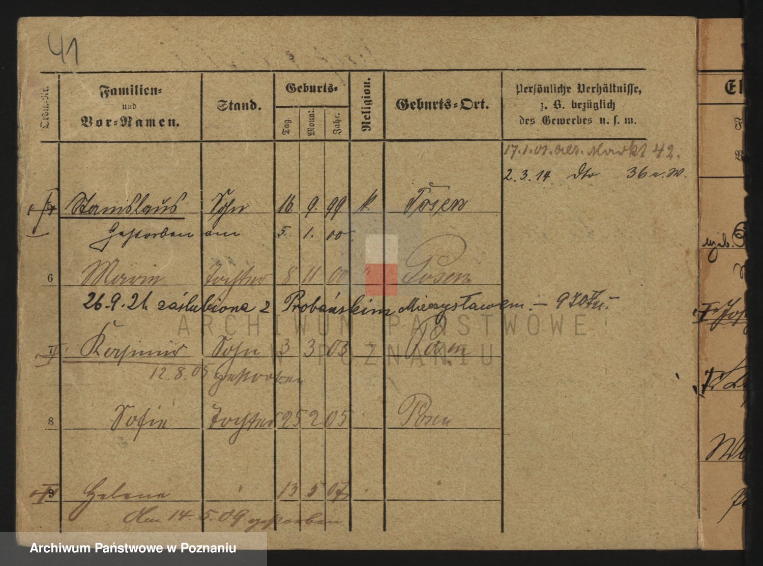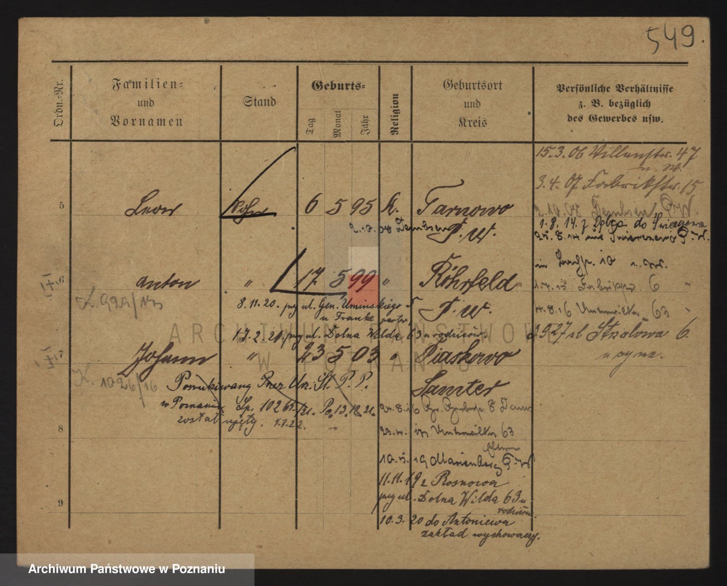 Podgląd karty osobowej dostępny jest po kliknięciu na nazwisko lub ikonkę karty. Można dokonywać powiększenia (ikony na górze) lub przechodzić między kolejnymi skanami (strzałki po bokach).